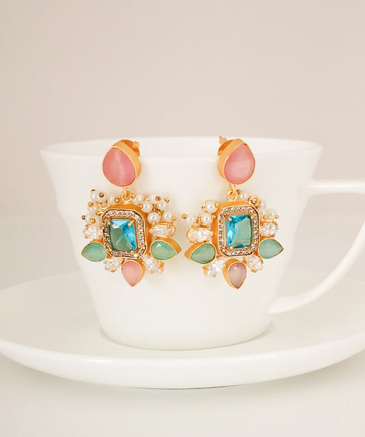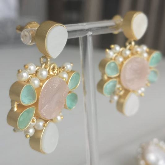 Classic Mimi Freshwater Pearl Earrings - Gold Plated - Natural Stones - Pink, Aqua and Pearls