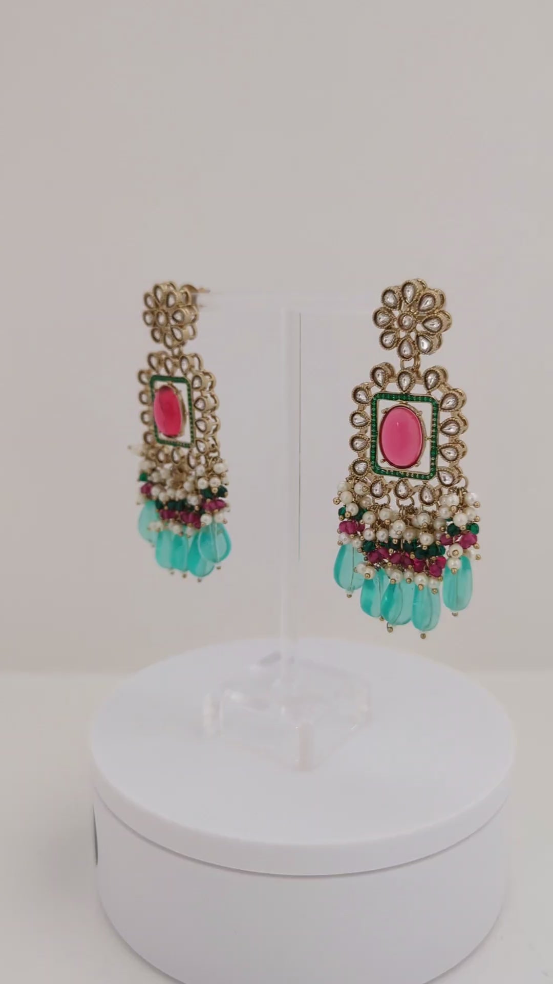 Accompanying the necklace are matching earrings and a maang tikka, each echoing the same regal design. The earrings and tikka are beautifully coordinated with magenta centerpiece stones, floral detailing, and cascading aqua blue beads that add a vibrant, refreshing contrast.