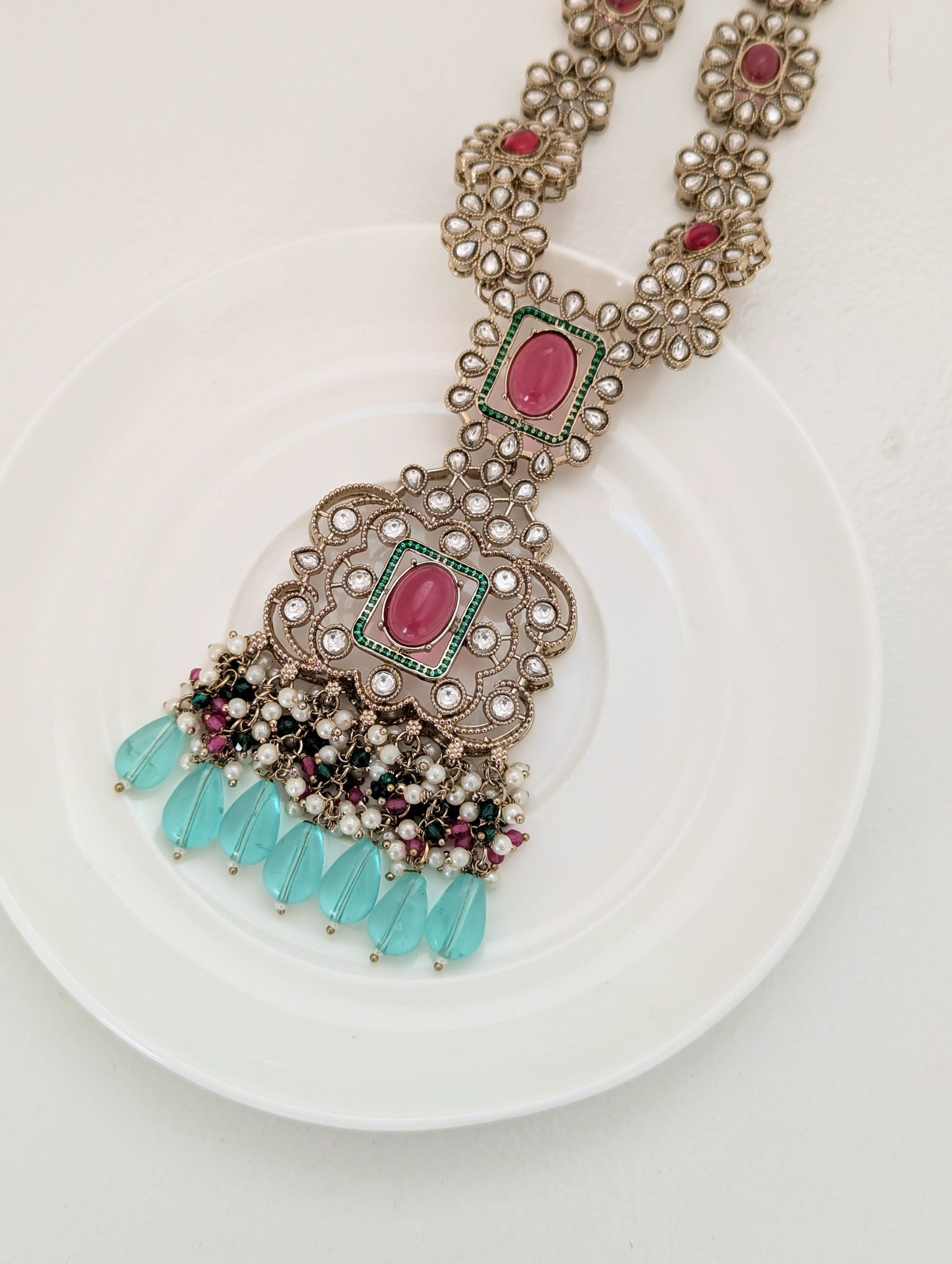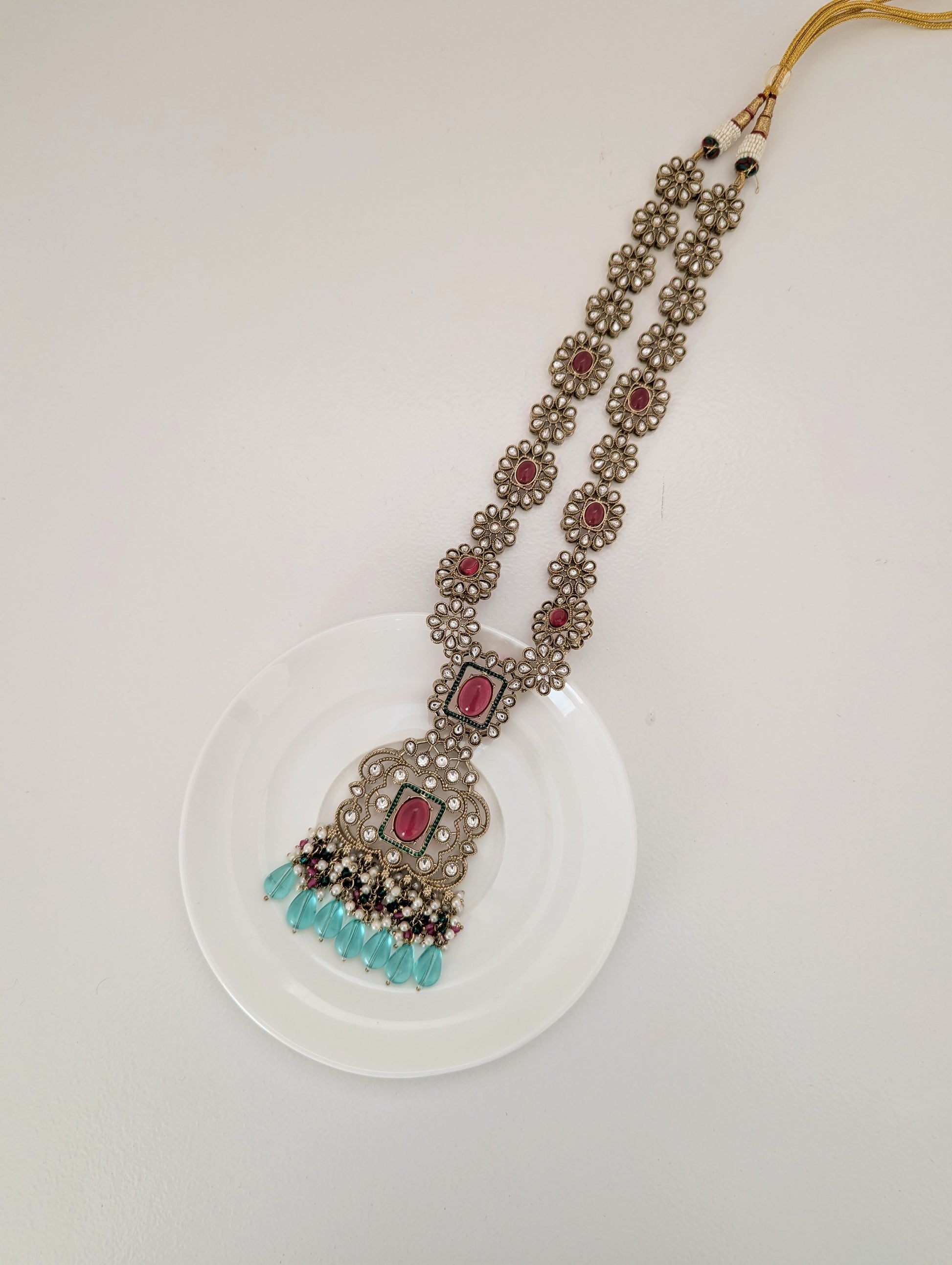 This exquisite jewelry set is a statement of timeless elegance and intricate craftsmanship. It features a long necklace with dual rows of floral motifs adorned with shimmering white stones and deep magenta centerpieces. The grand pendant, with its ornate design, showcases a bold magenta stone framed by a delicate arrangement of sparkling embellishments and finished with a fringe of aqua blue teardrop beads, pearls, and tiny accent stones.