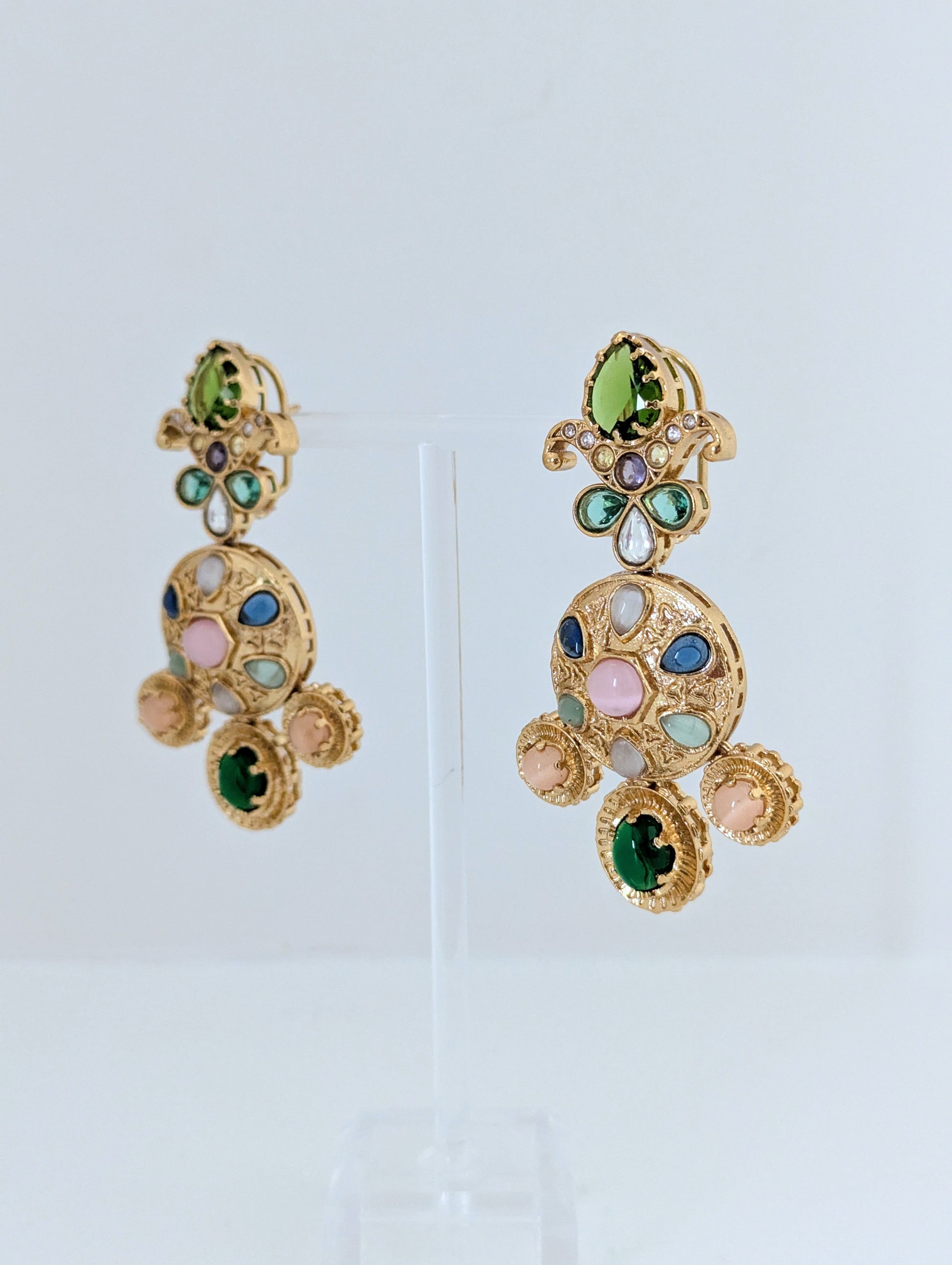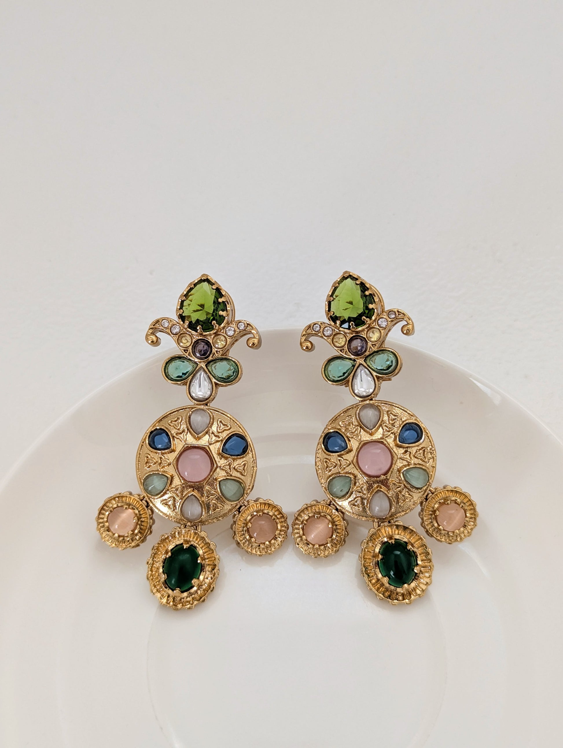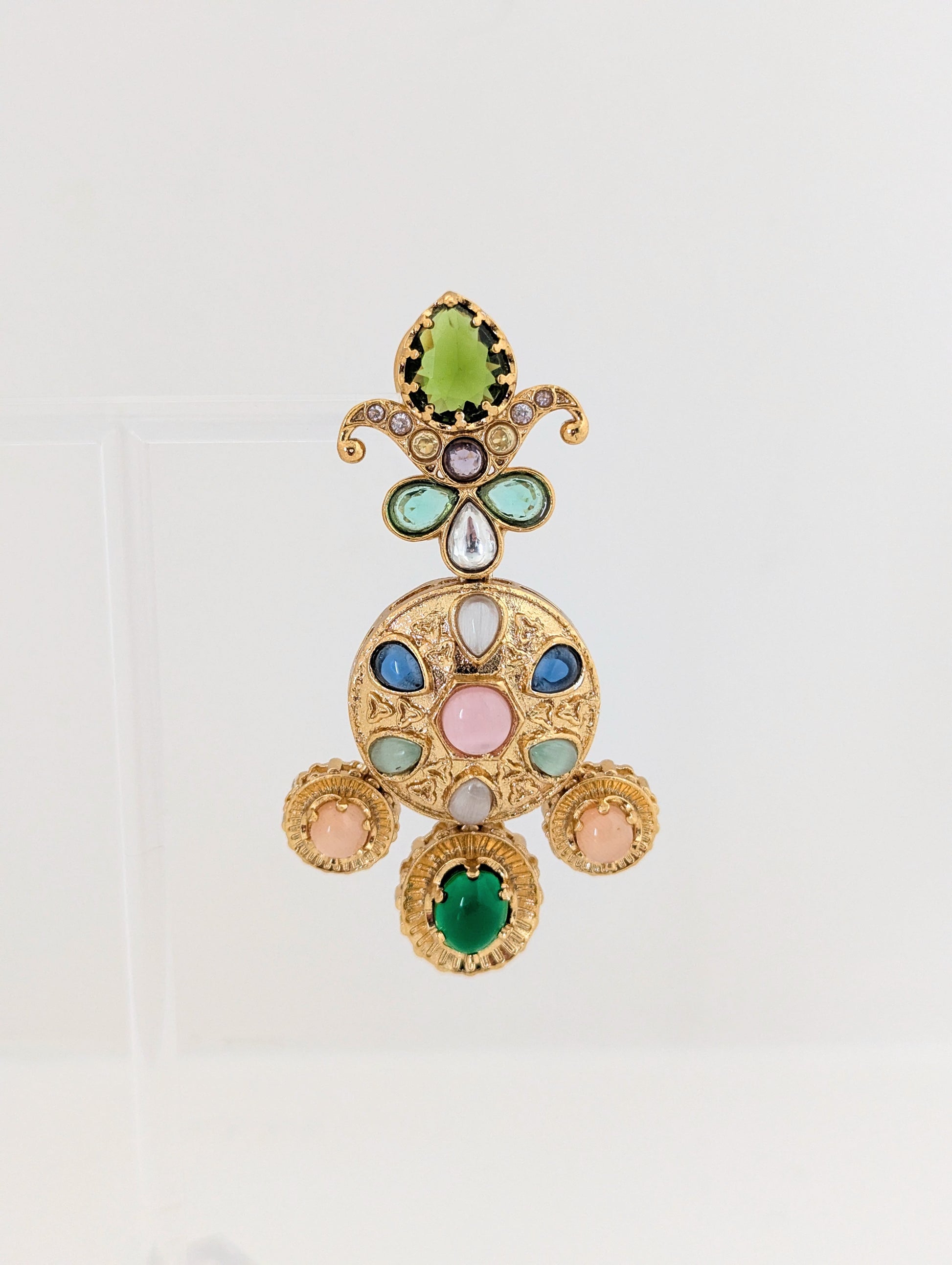 These ornate gold-tone earrings showcase a regal and vibrant design inspired by traditional Indian craftsmanship. Adorned with a mix of colorful stones, they feature an intricate floral motif at the top and a circular medallion at the center, accented with delicate triangular engravings. The lower edge is finished with three round dangling stones that enhance their statement appeal. Bold, festive, and elegant, these earrings are perfect for special occasions.