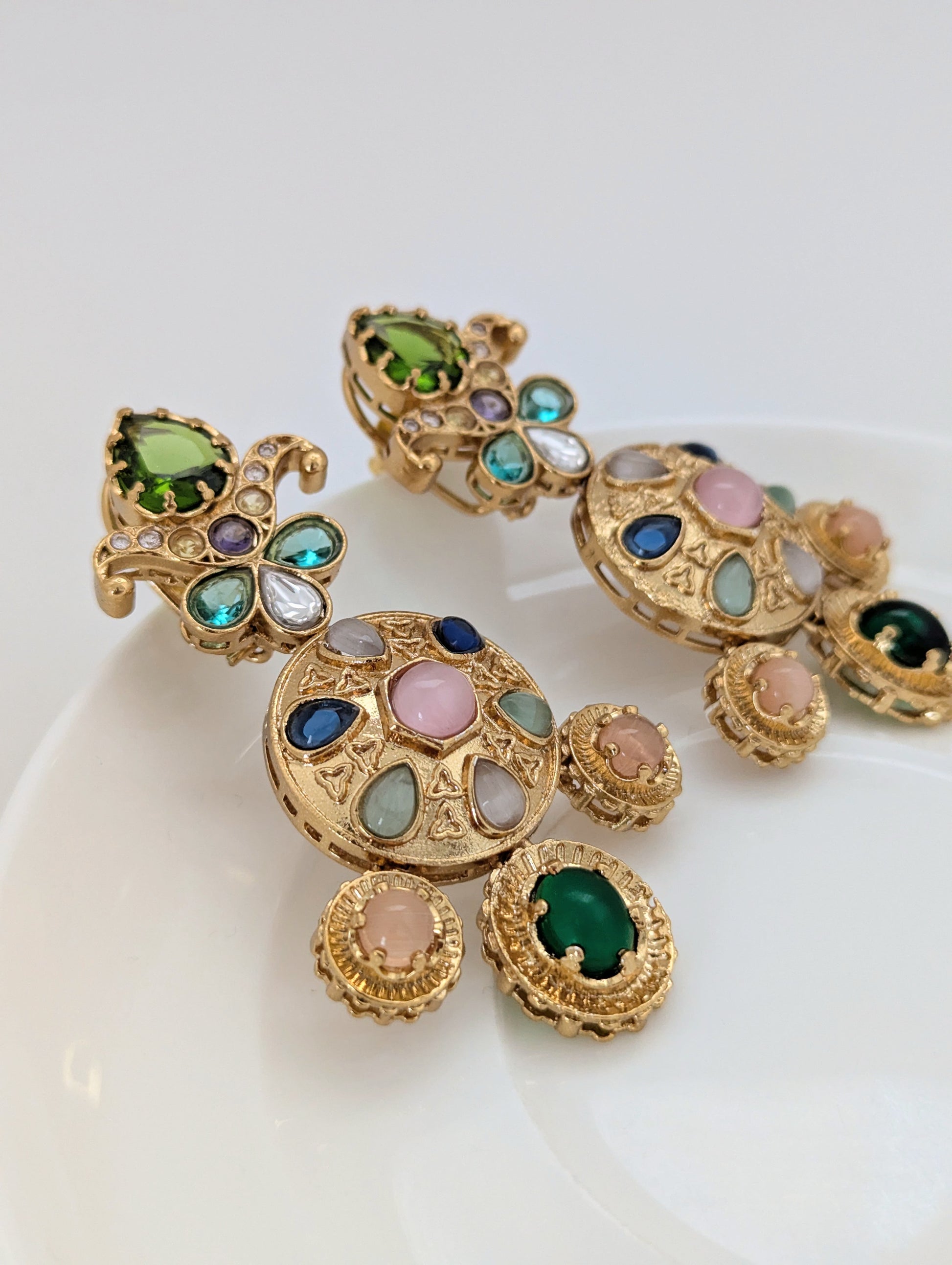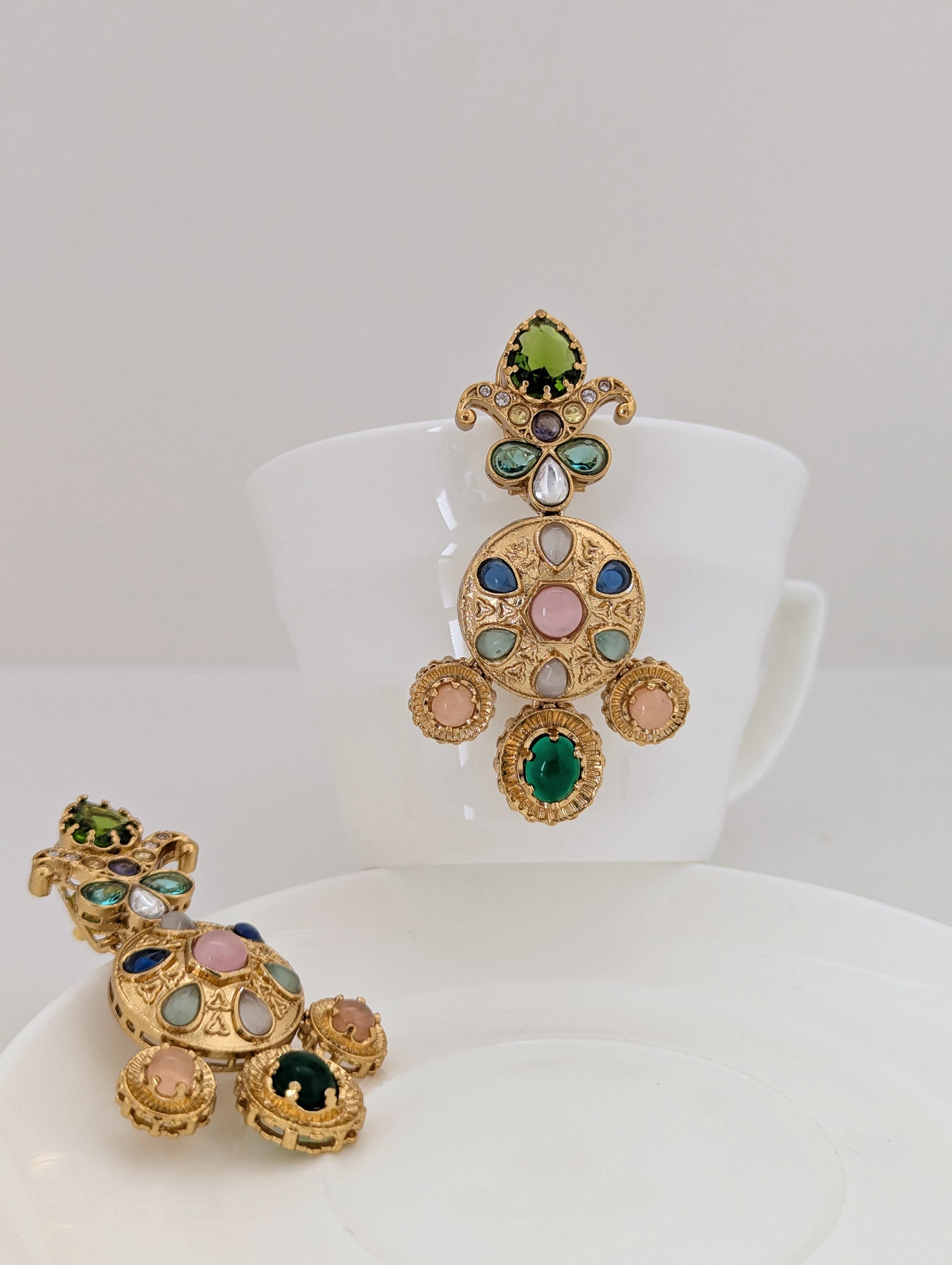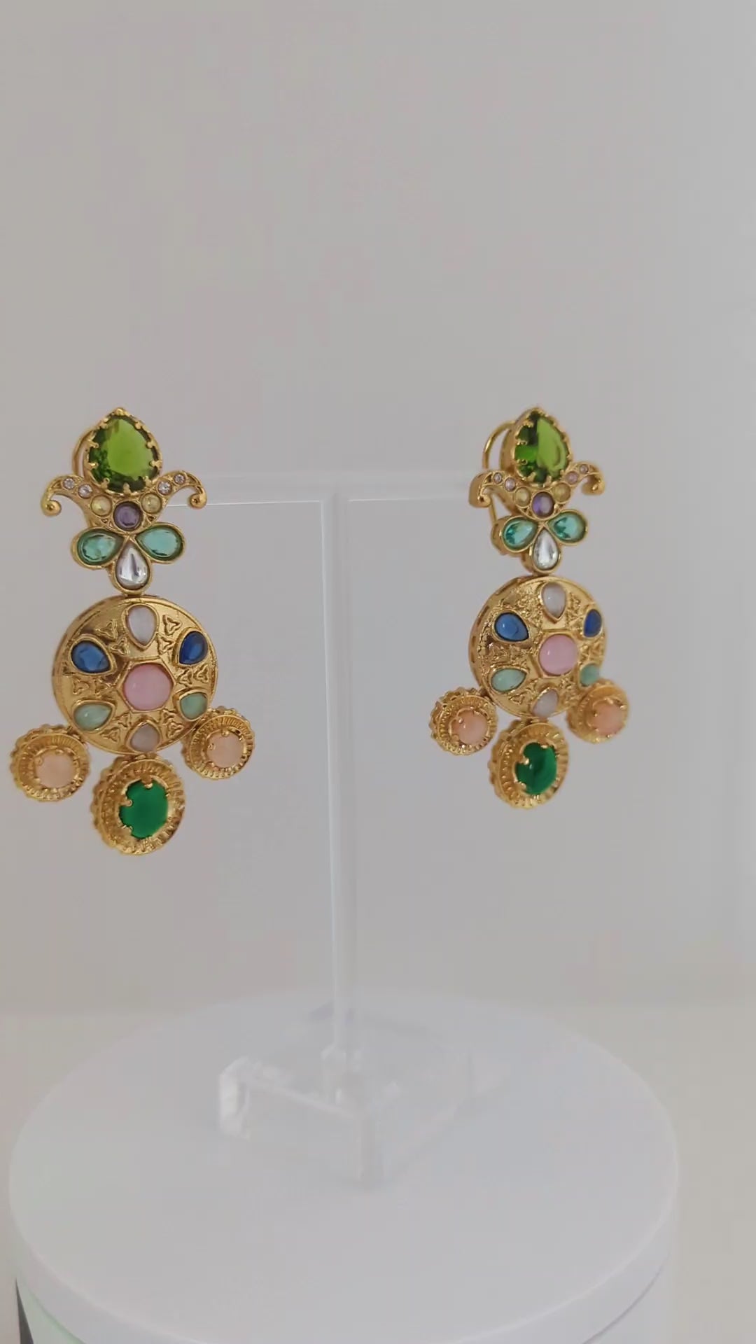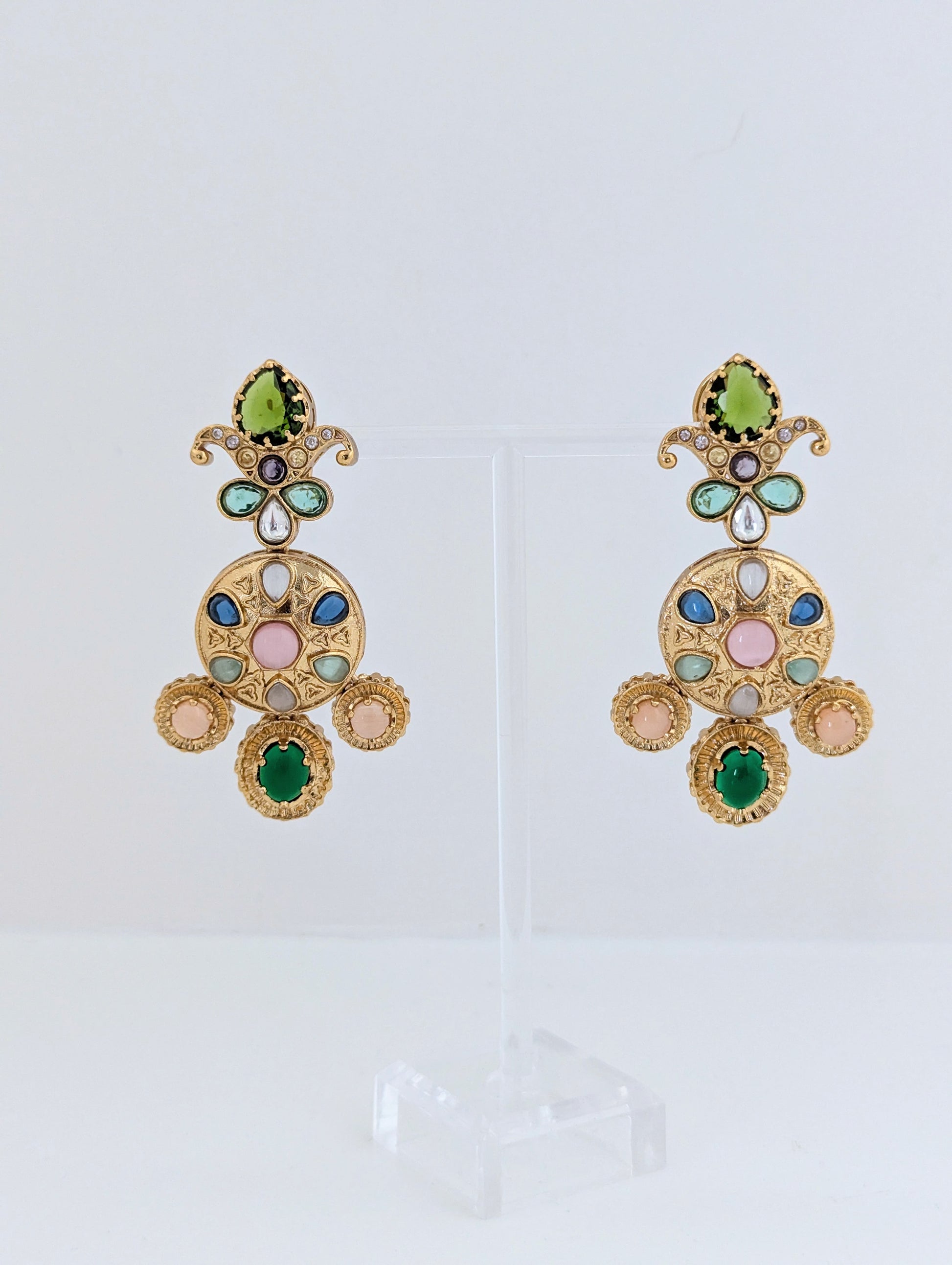 These ornate gold-tone earrings showcase a regal and vibrant design inspired by traditional Indian craftsmanship. Adorned with a mix of colorful stones, they feature an intricate floral motif at the top and a circular medallion at the center, accented with delicate triangular engravings. The lower edge is finished with three round dangling stones that enhance their statement appeal. Bold, festive, and elegant, these earrings are perfect for special occasions.
