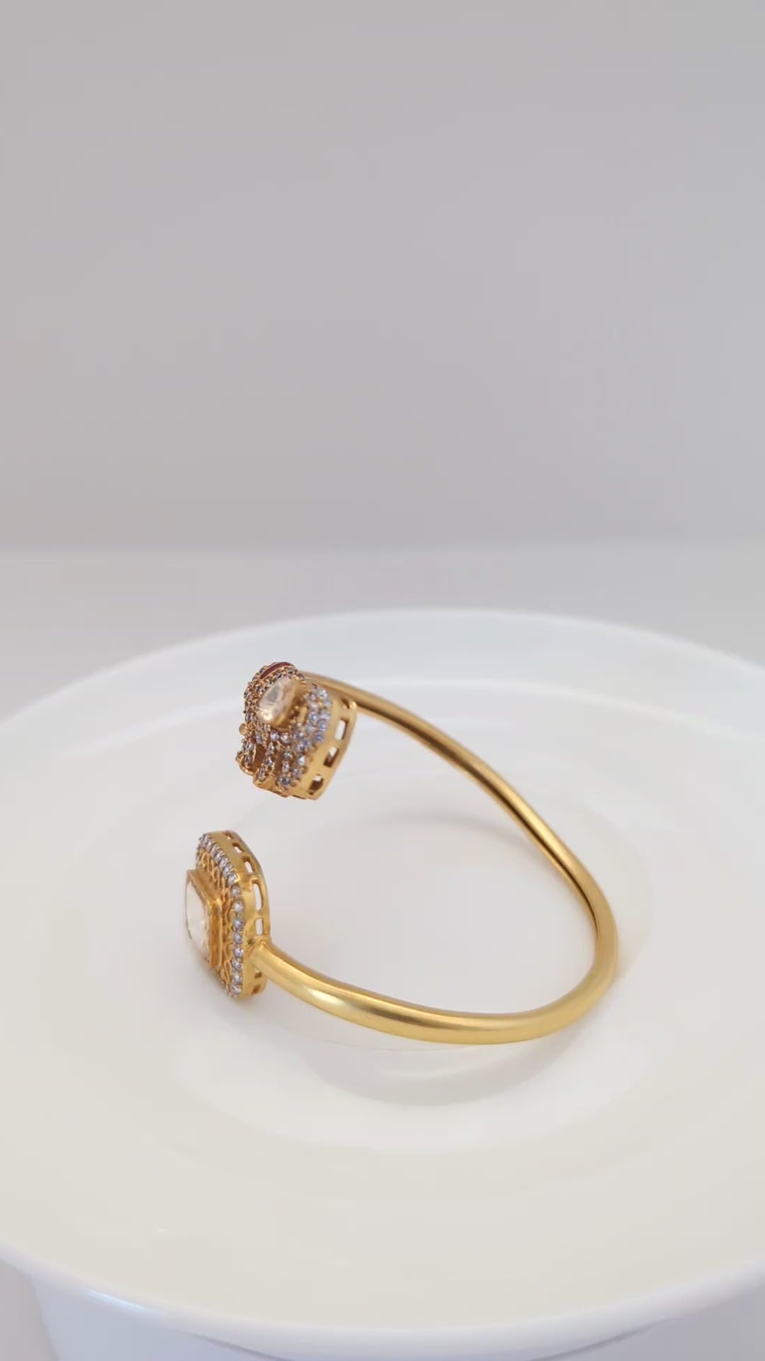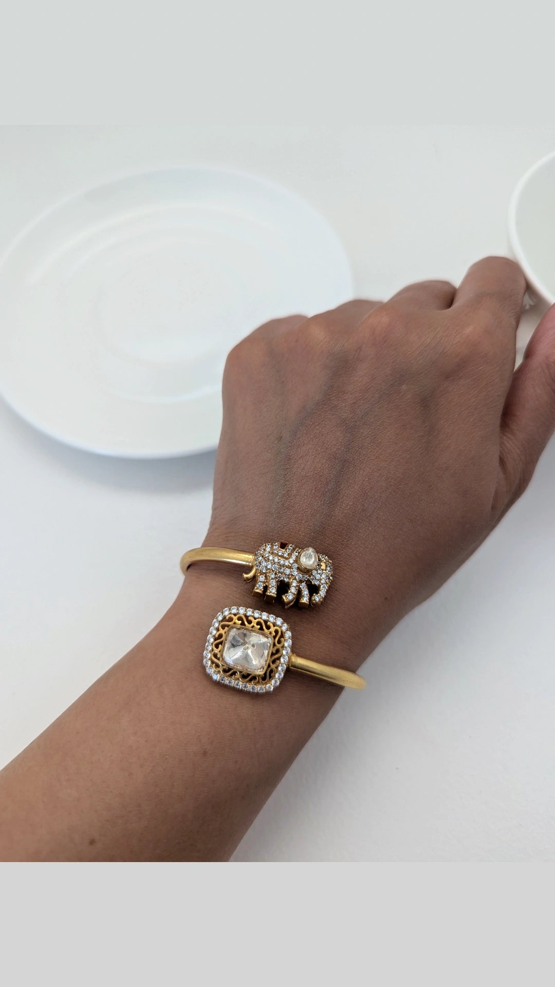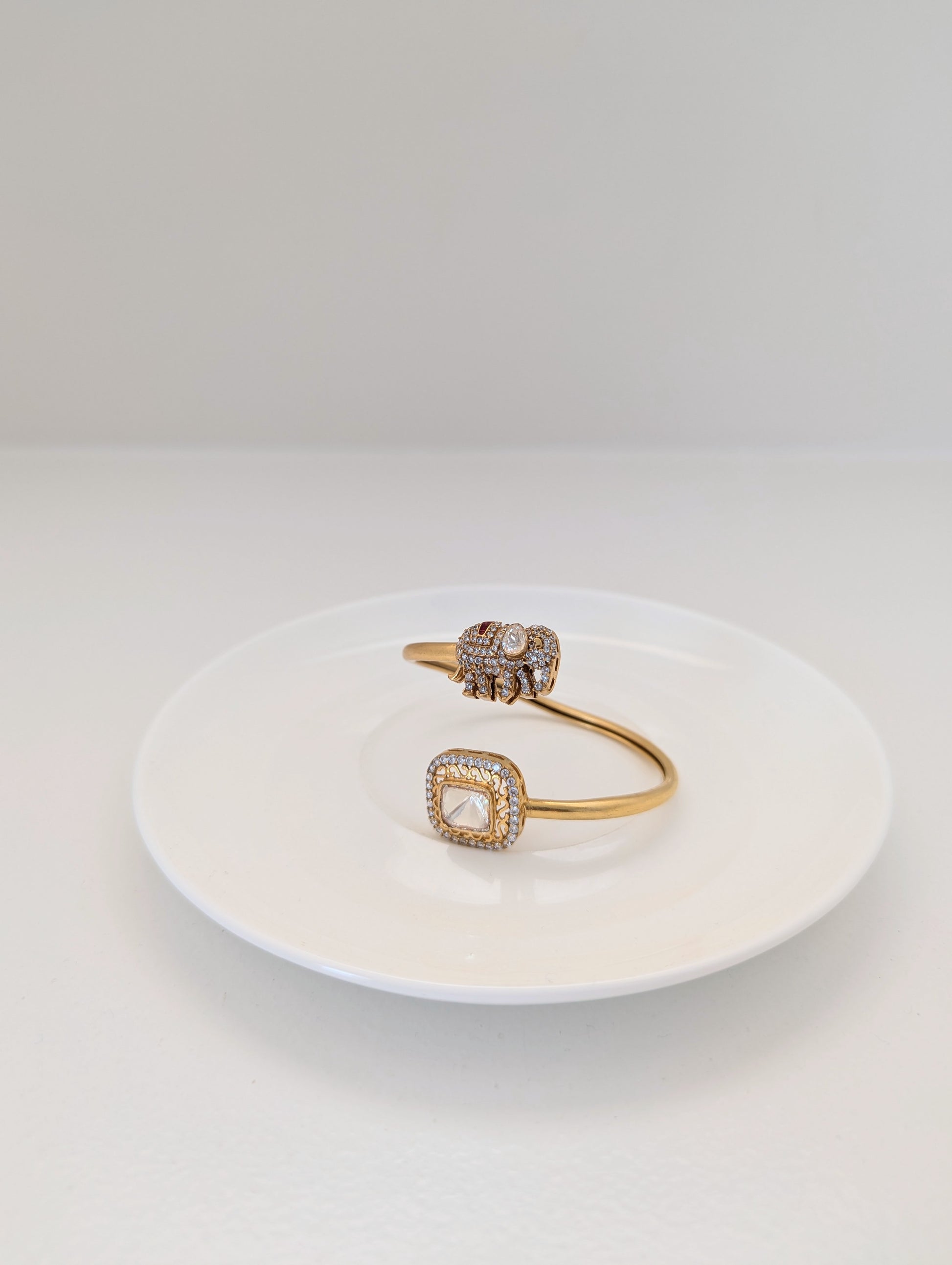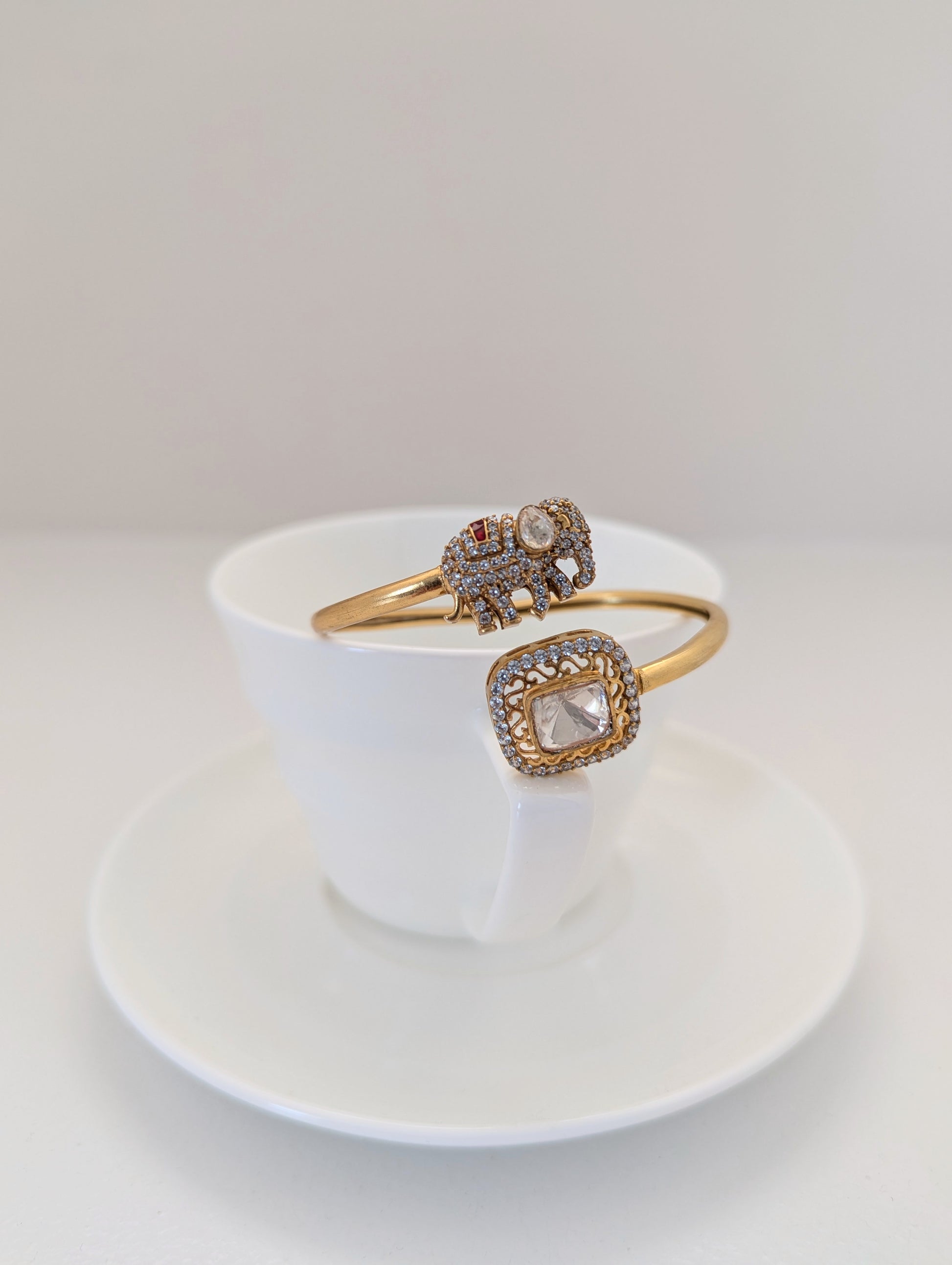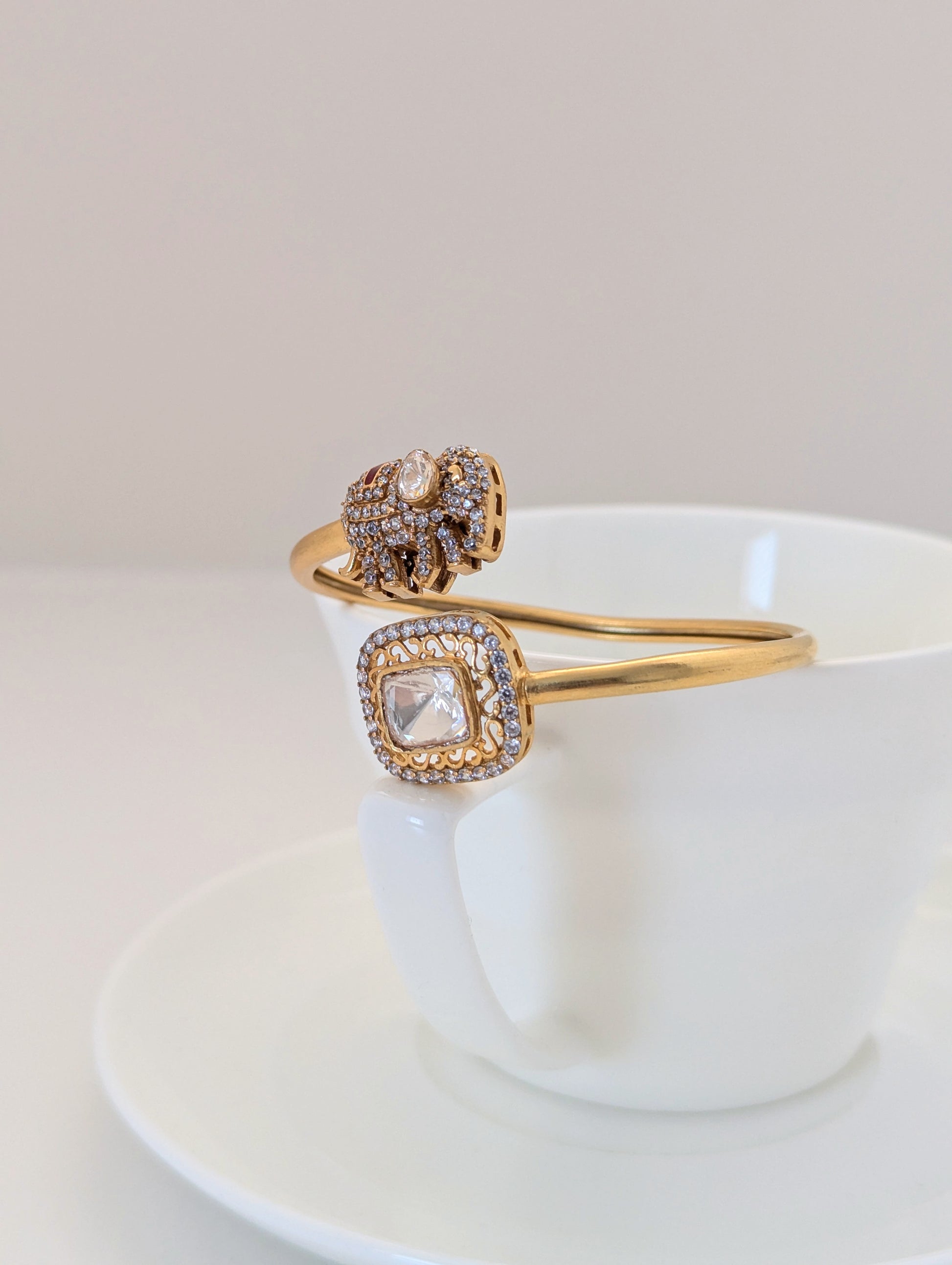 This elegant open-style bangle bracelet blends tradition with playful charm. One end features a finely detailed elephant motif, encrusted with shimmering stones, while the other end is adorned with a square-cut centerpiece framed by intricate gold filigree and delicate accents. Crafted in a warm gold tone, this piece is perfect for adding a touch of sophistication to both festive and everyday looks.
