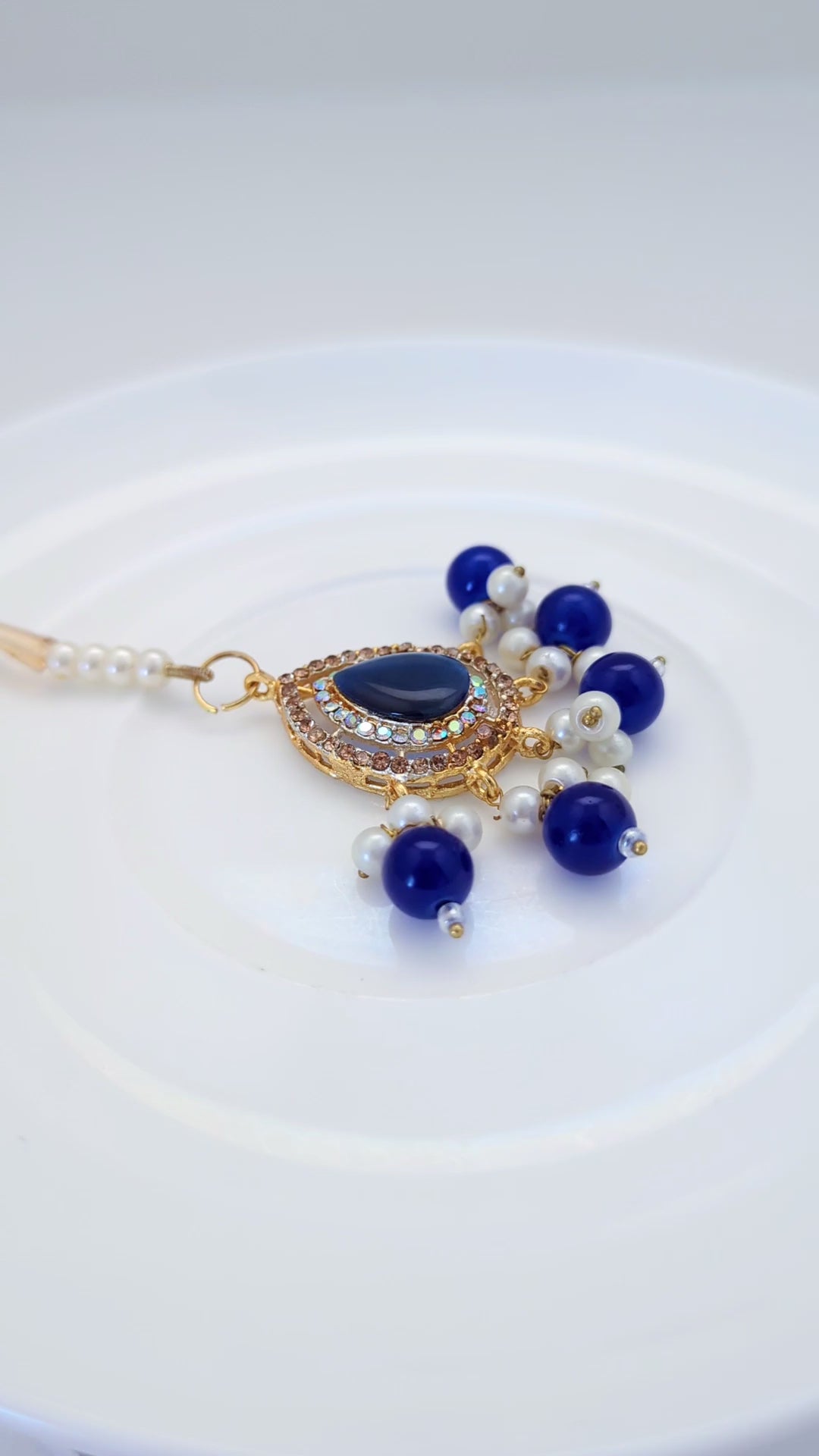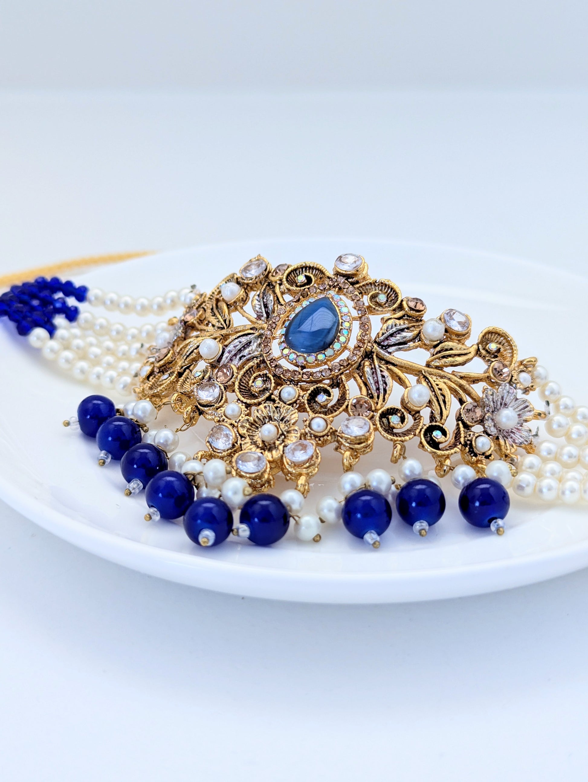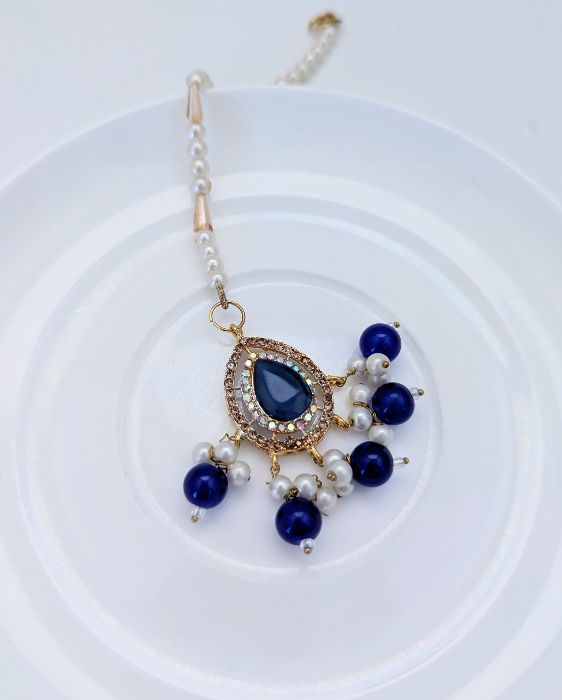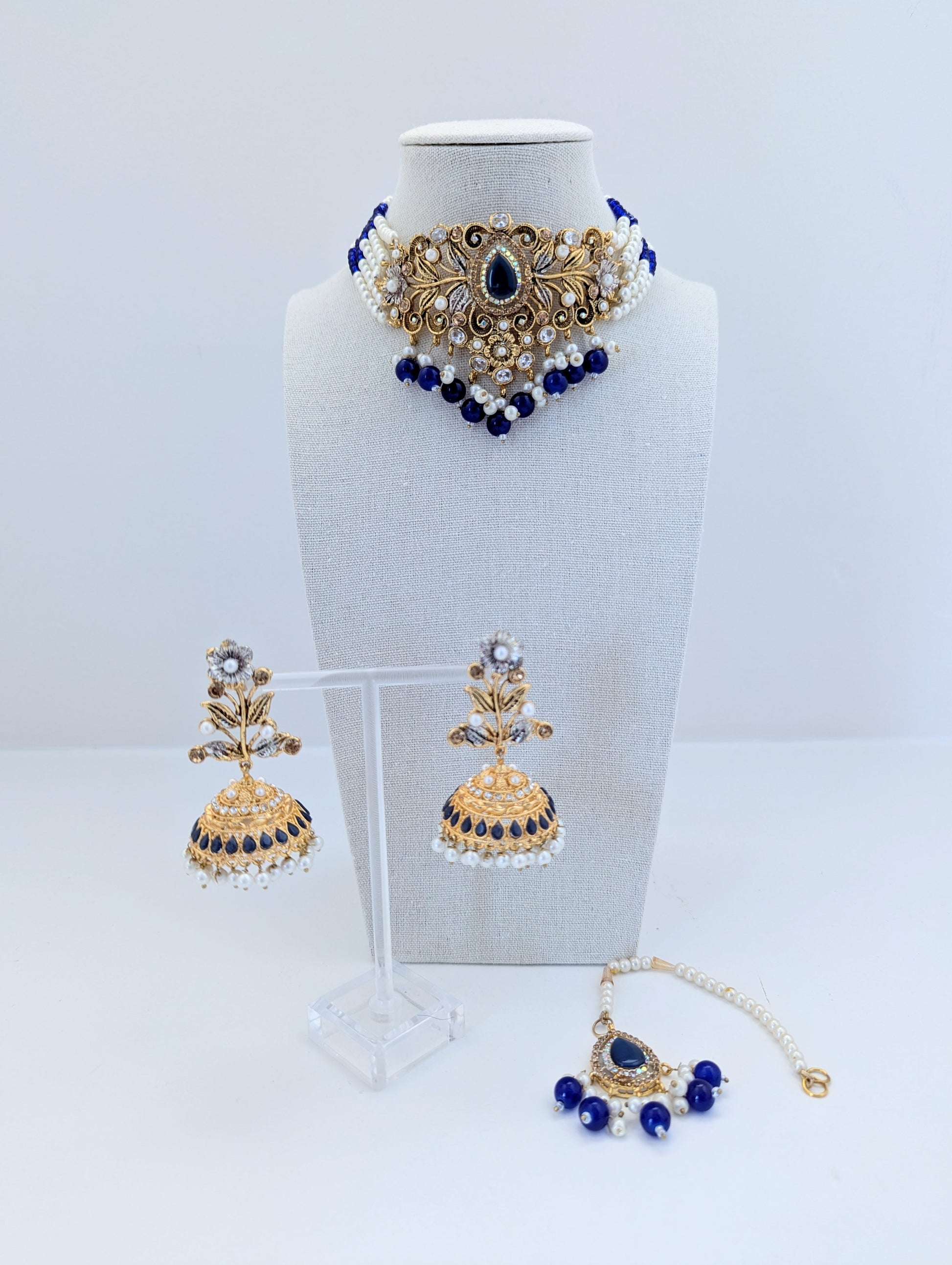 This elegant jewelry set features a royal combination of deep navy blue and lustrous white pearls. The choker necklace boasts intricate gold-toned floral filigree work accented with shimmering stones and a central blue teardrop motif, framed by clusters of pearls and navy beads. The matching maang tikka mirrors the necklace's central design, with a similar teardrop motif and dangling pearls. Completing the set, the ornate jhumka earrings feature delicate floral detailing, navy stone accents, and a classic bell-shaped drop adorned with pearls. A perfect blend of regal and traditional charm.