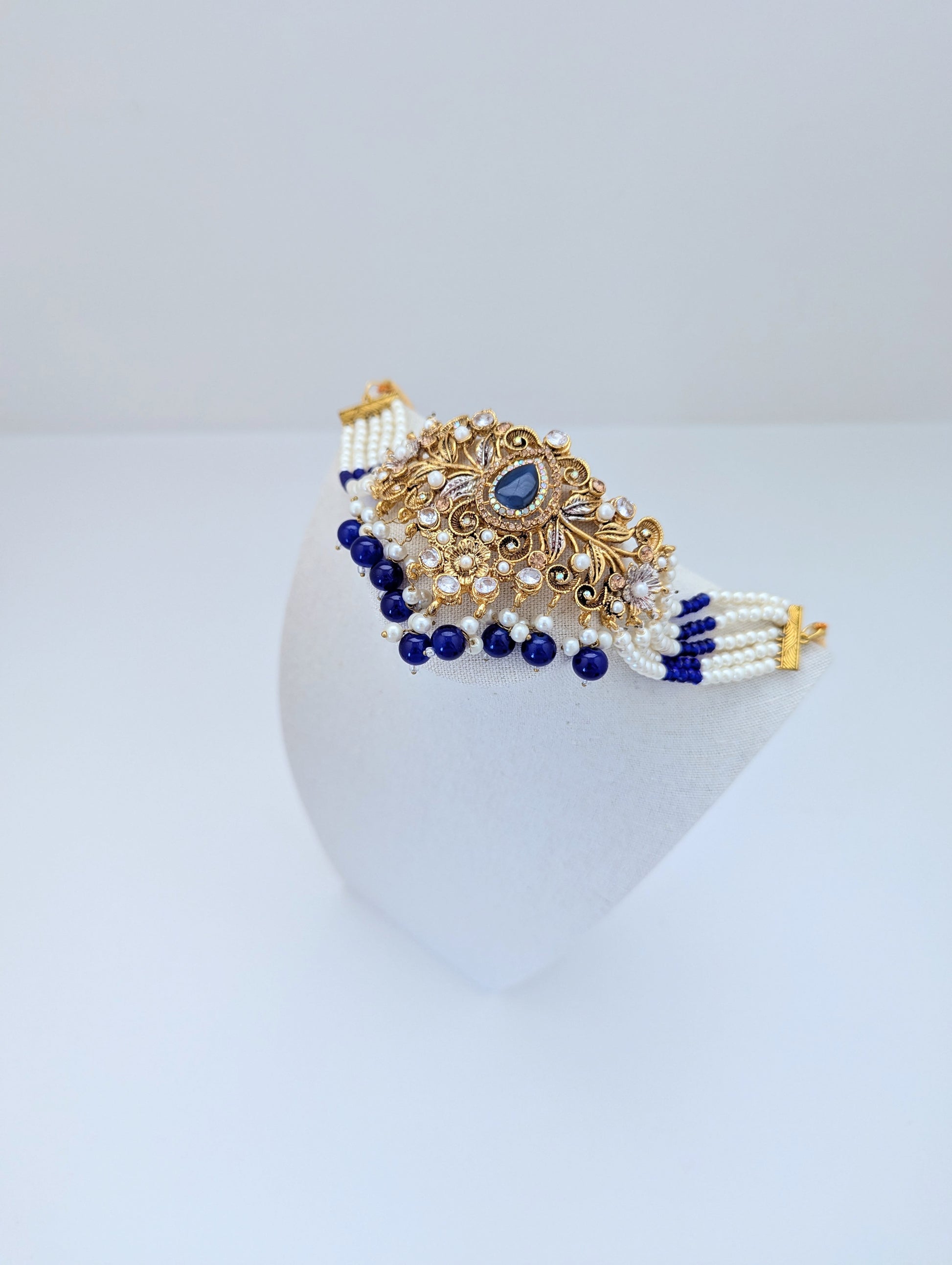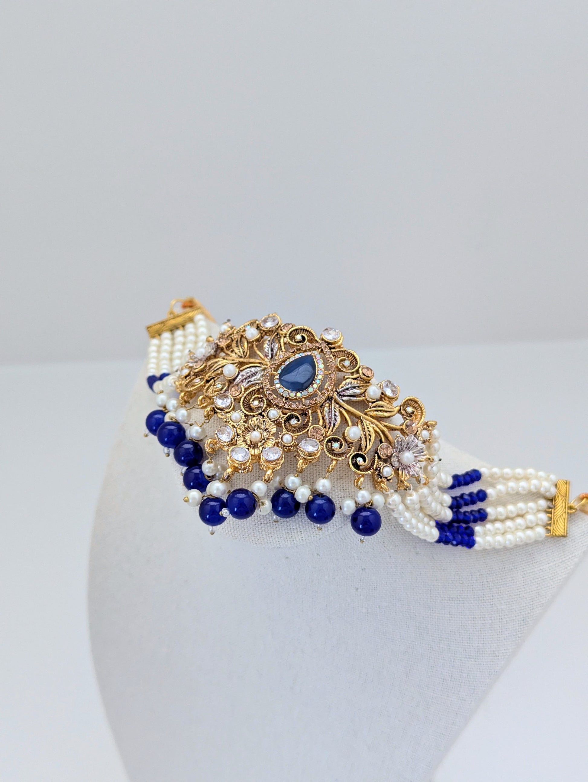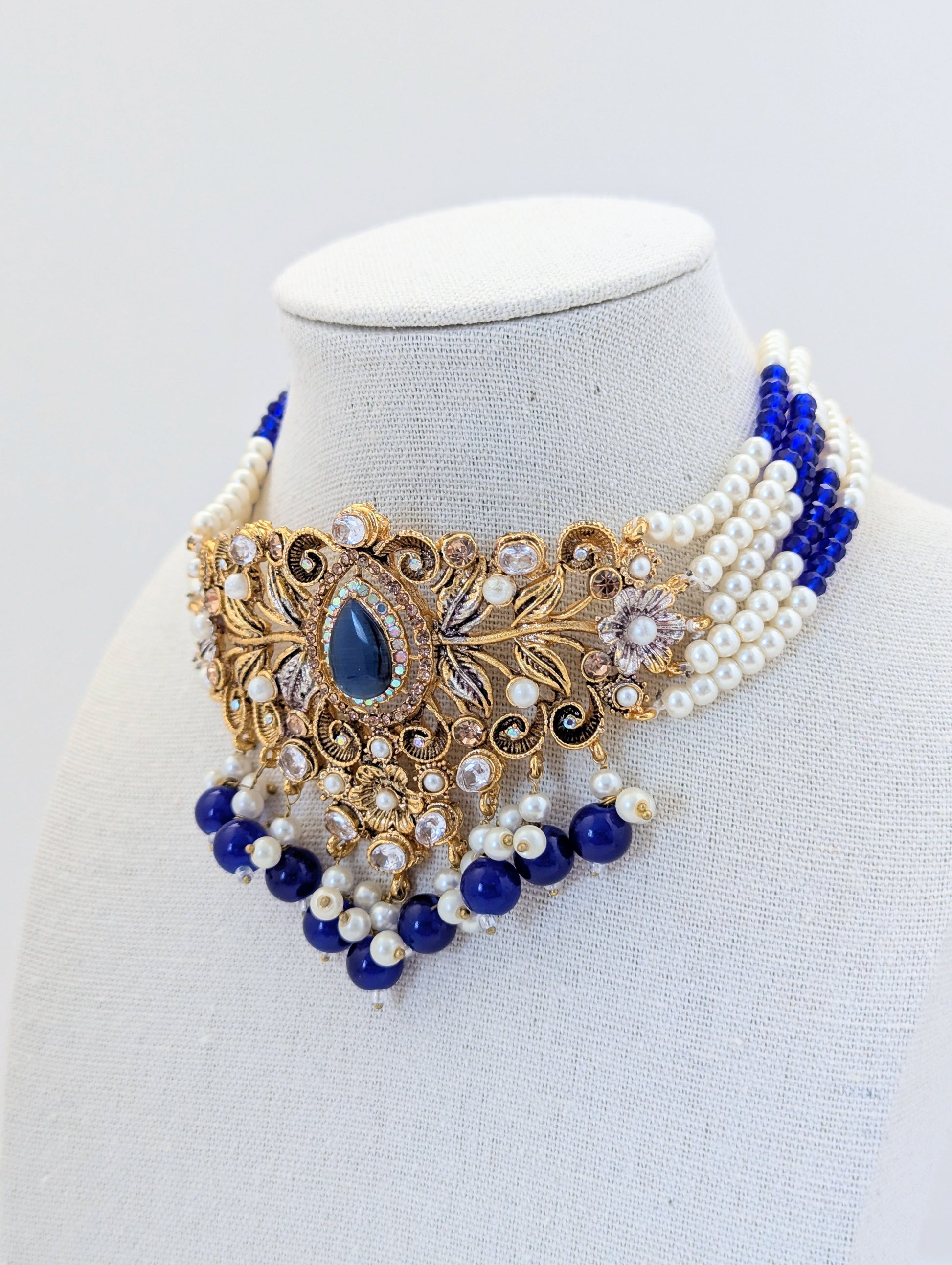 This elegant jewelry set features a royal combination of deep navy blue and lustrous white pearls. The choker necklace boasts intricate gold-toned floral filigree work accented with shimmering stones and a central blue teardrop motif, framed by clusters of pearls and navy beads. The matching maang tikka mirrors the necklace's central design, with a similar teardrop motif and dangling pearls. Completing the set, the ornate jhumka earrings feature delicate floral detailing, navy stone accents, and a classic bell-shaped drop adorned with pearls. A perfect blend of regal and traditional charm.