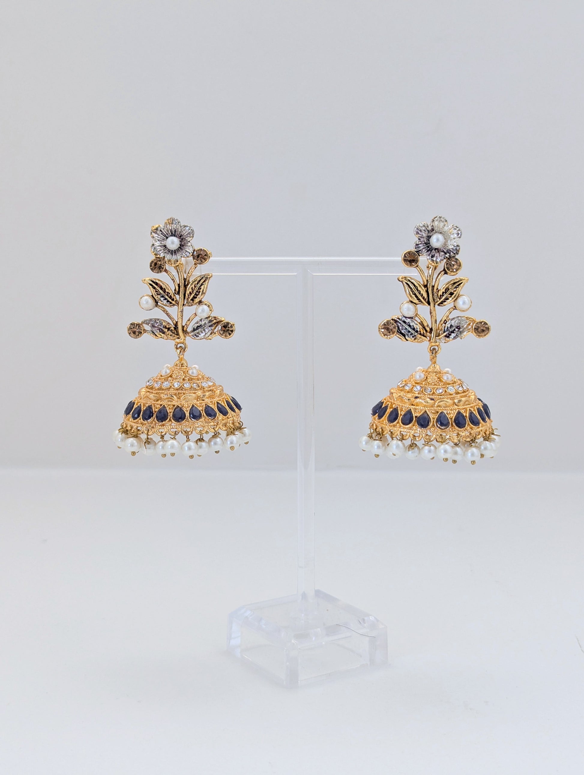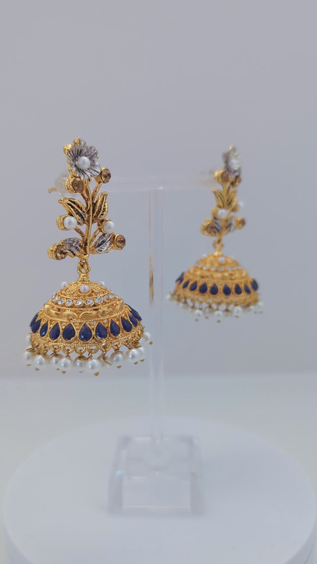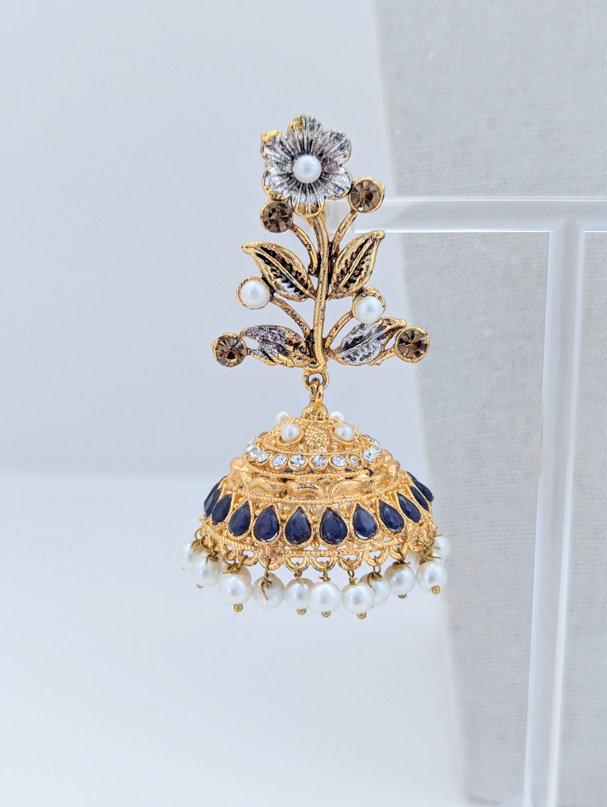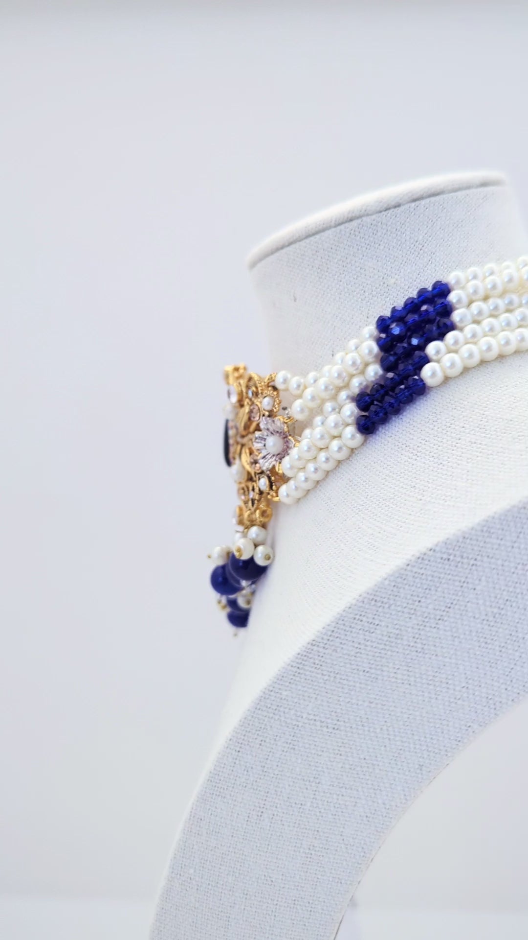 This elegant jewelry set features a royal combination of deep navy blue and lustrous white pearls. The choker necklace boasts intricate gold-toned floral filigree work accented with shimmering stones and a central blue teardrop motif, framed by clusters of pearls and navy beads. The matching maang tikka mirrors the necklace's central design, with a similar teardrop motif and dangling pearls. Completing the set, the ornate jhumka earrings feature delicate floral detailing, navy stone accents, and a classic bell-shaped drop adorned with pearls. A perfect blend of regal and traditional charm.