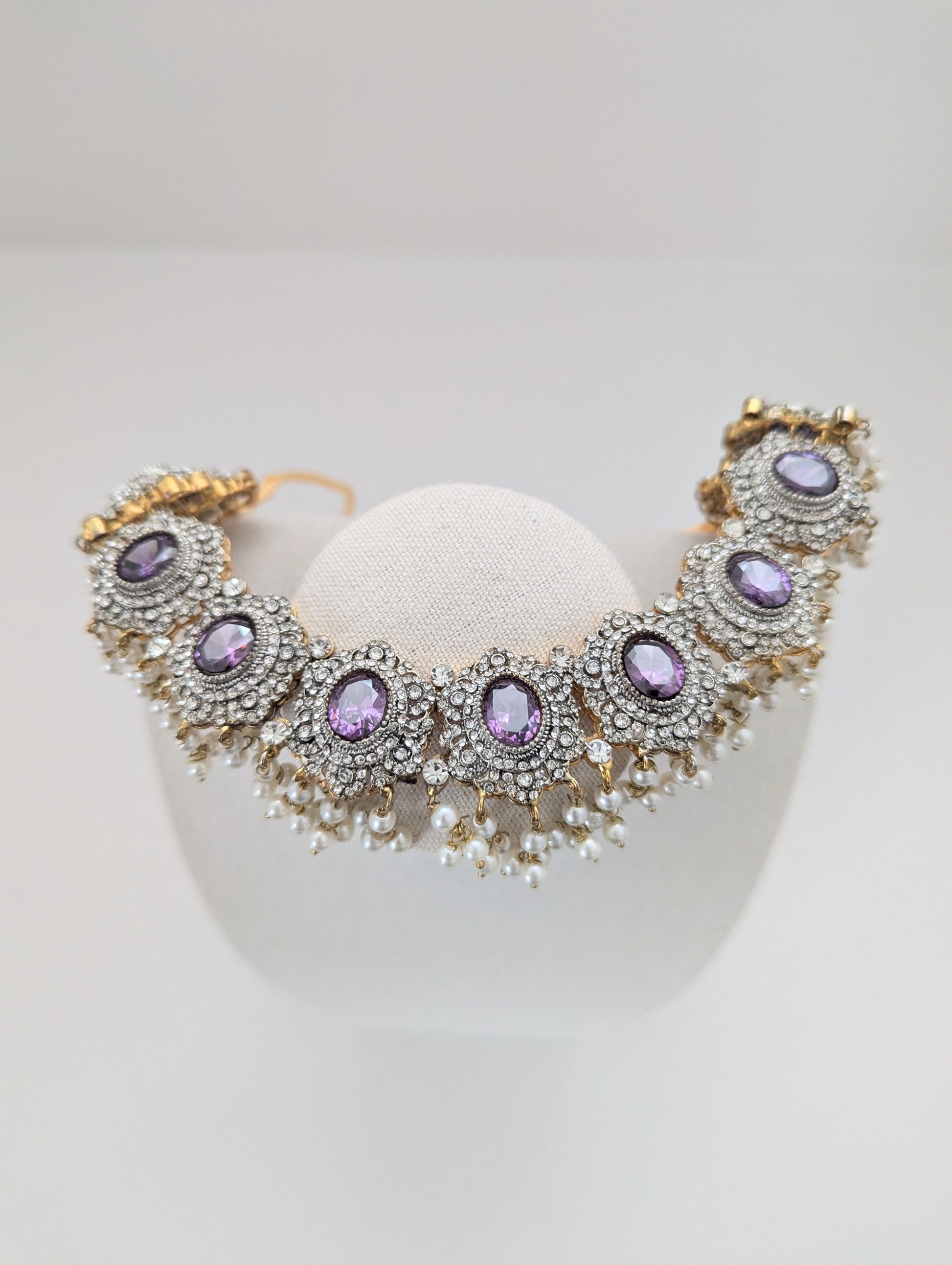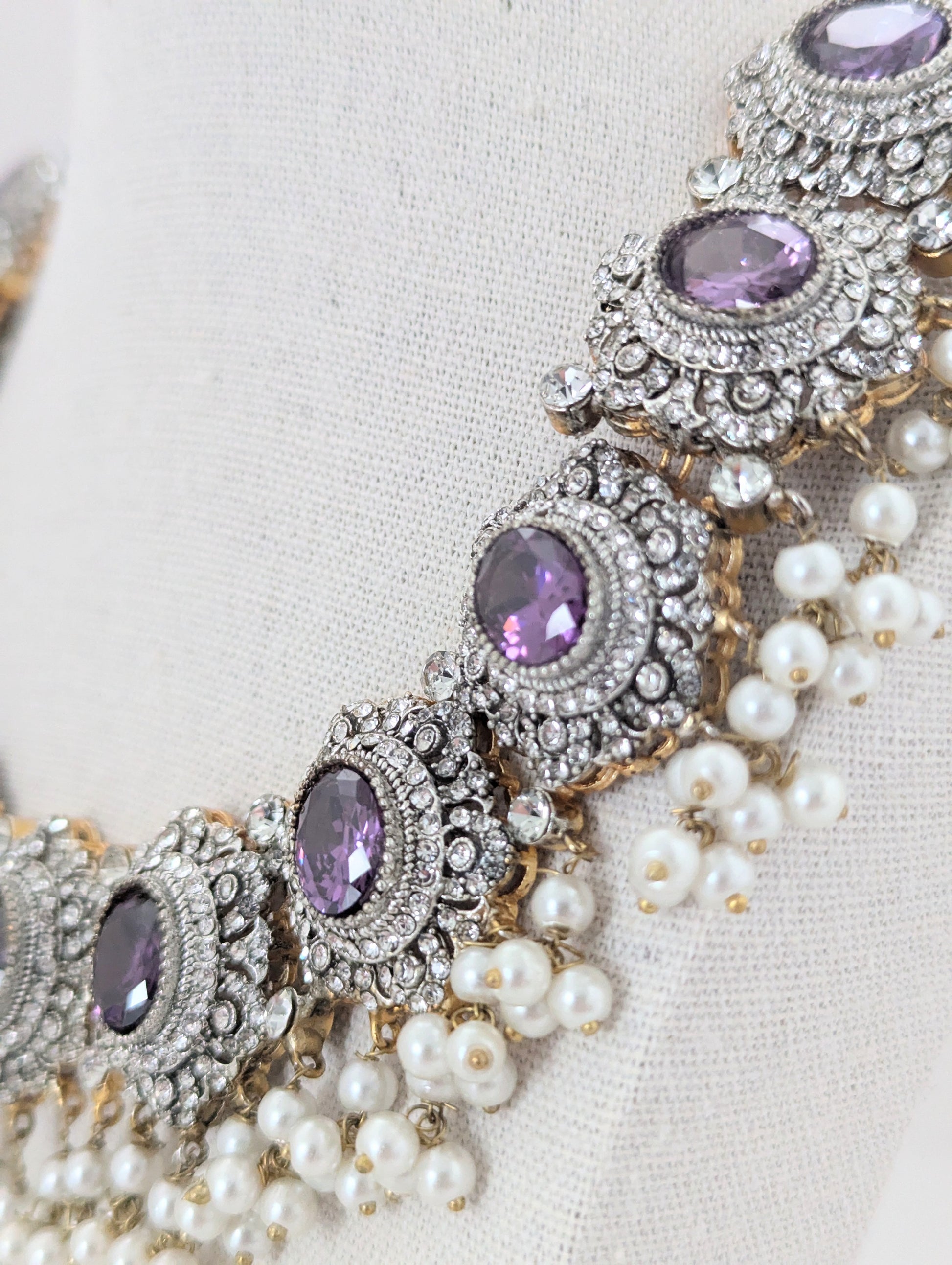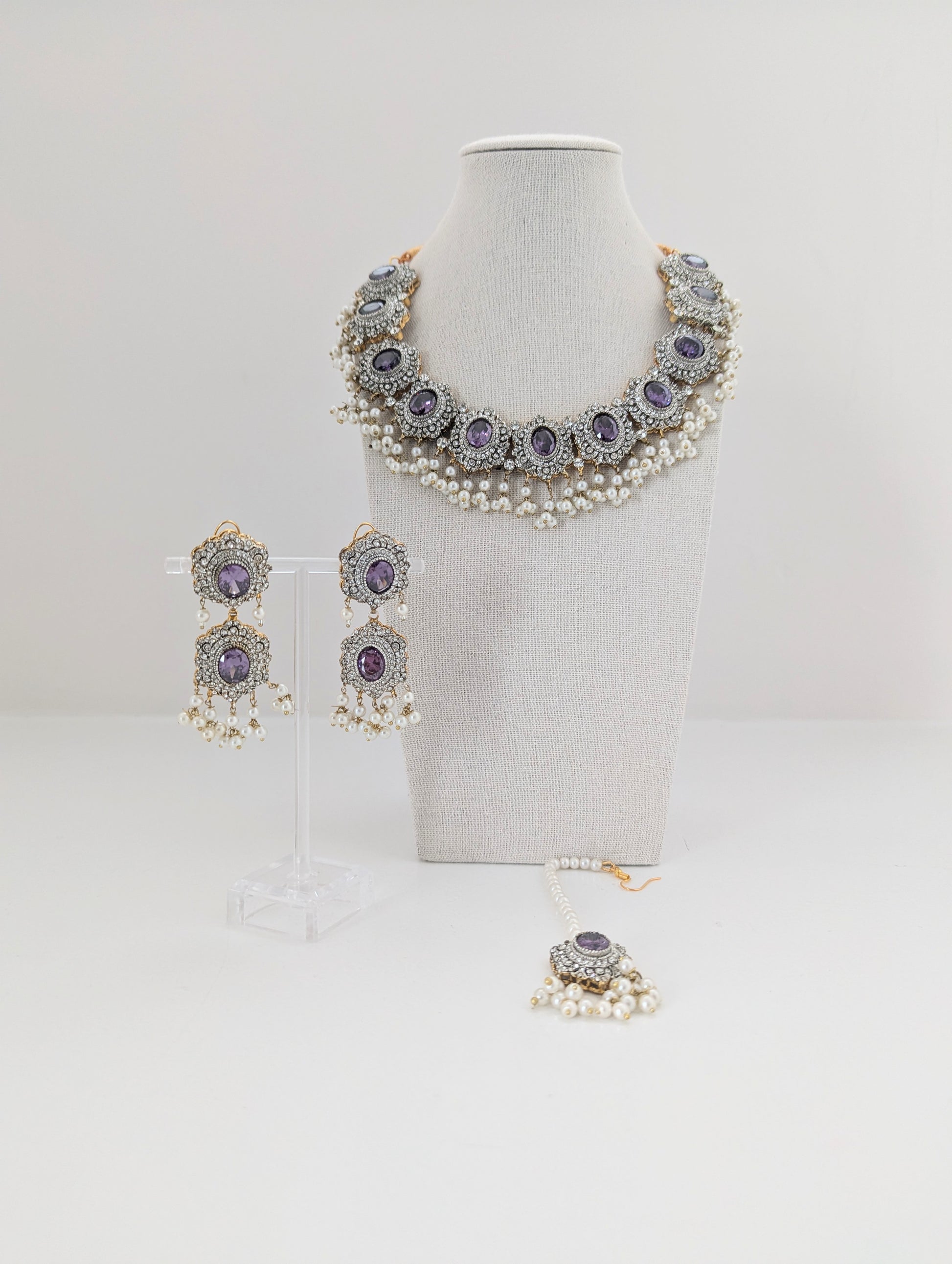 This exquisite jewelry set features a stunning necklace, a pair of matching earrings, and a complementary maang tikka. The pieces are adorned with intricate silver-toned detailing, accented by deep purple stones at the center of each motif. Surrounding the gemstones are sparkling white stones and elegant pearl drops, giving the set a regal and timeless look. Ideal for weddings, festive occasions, or formal events, this set blends traditional charm with modern elegance.