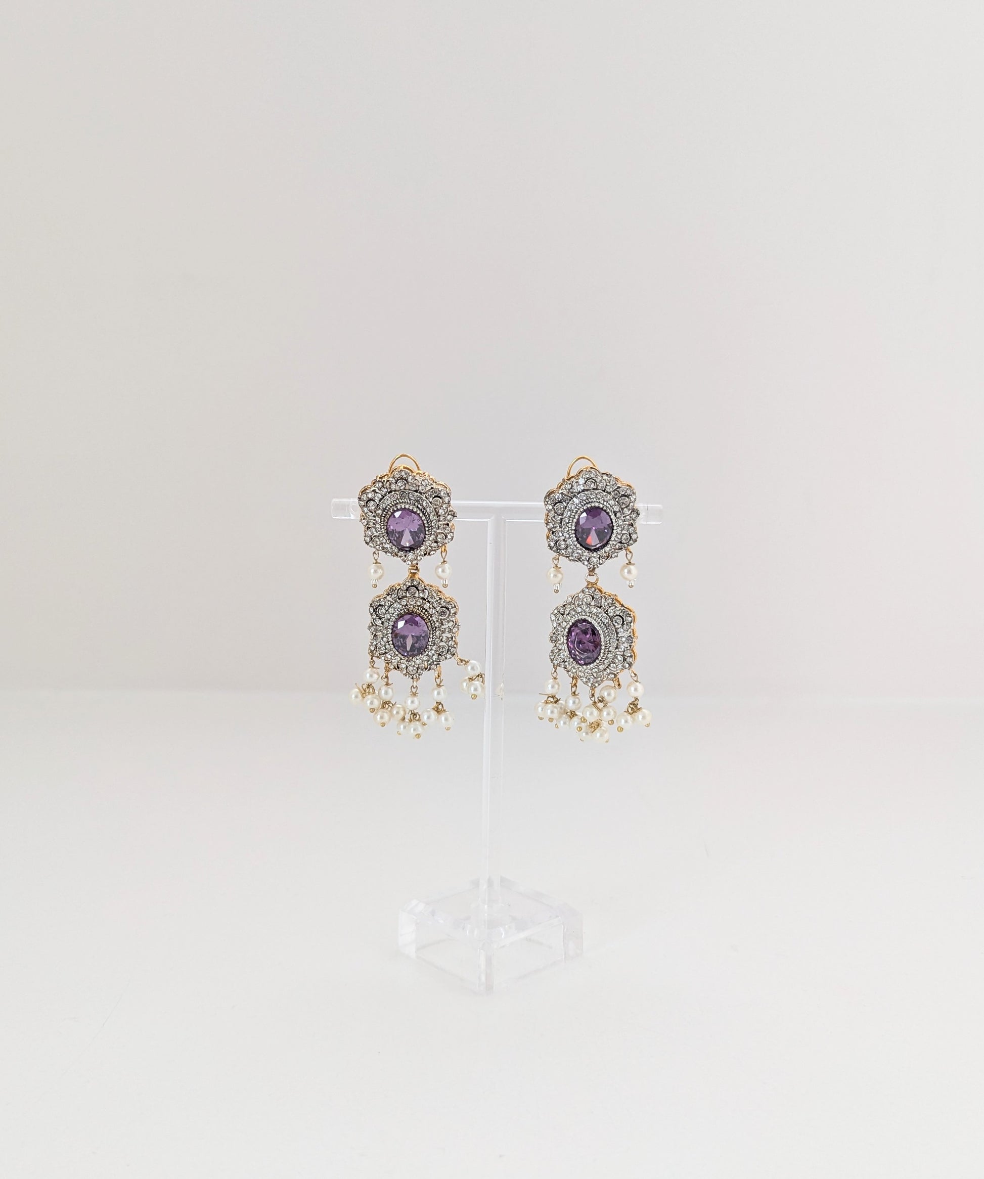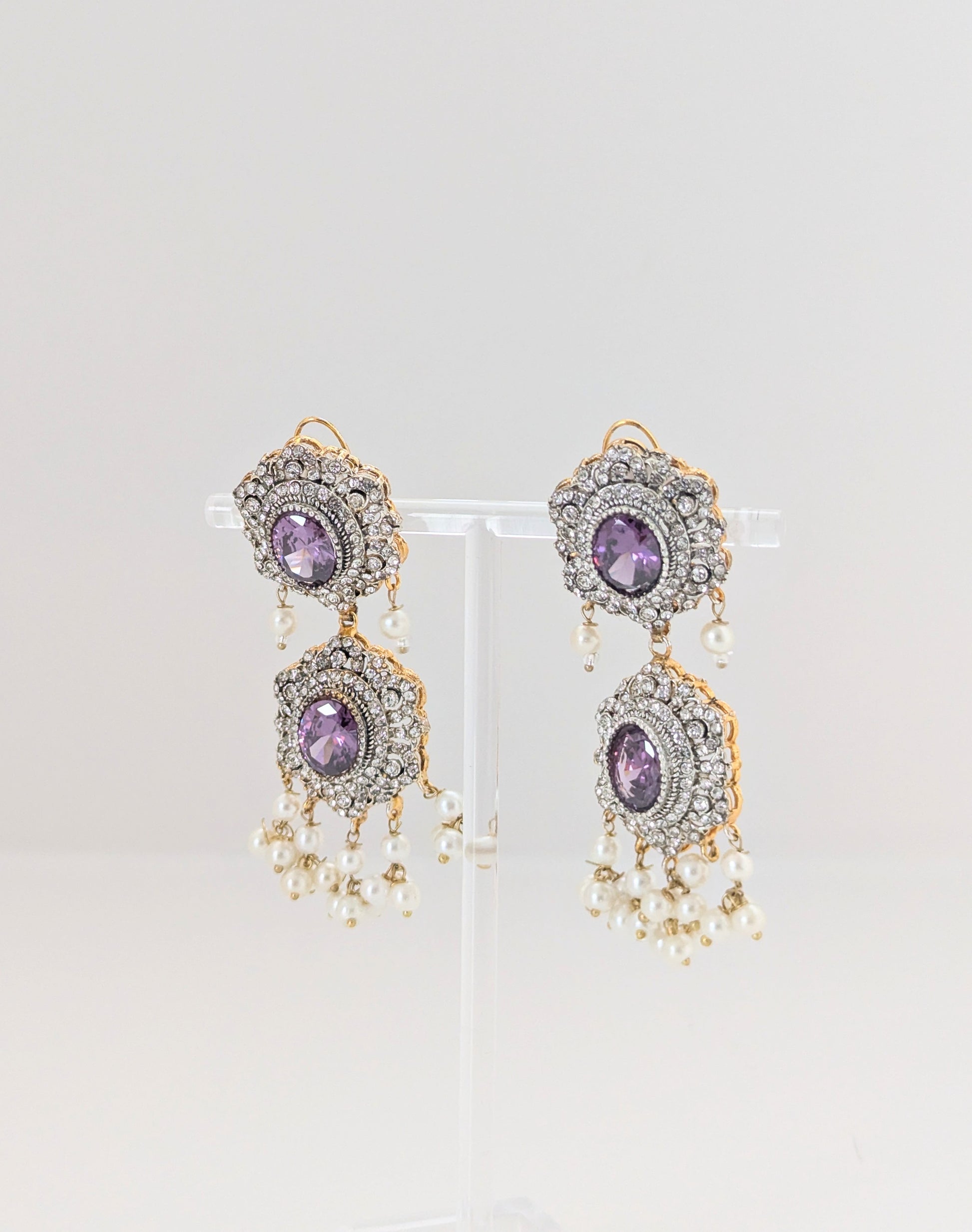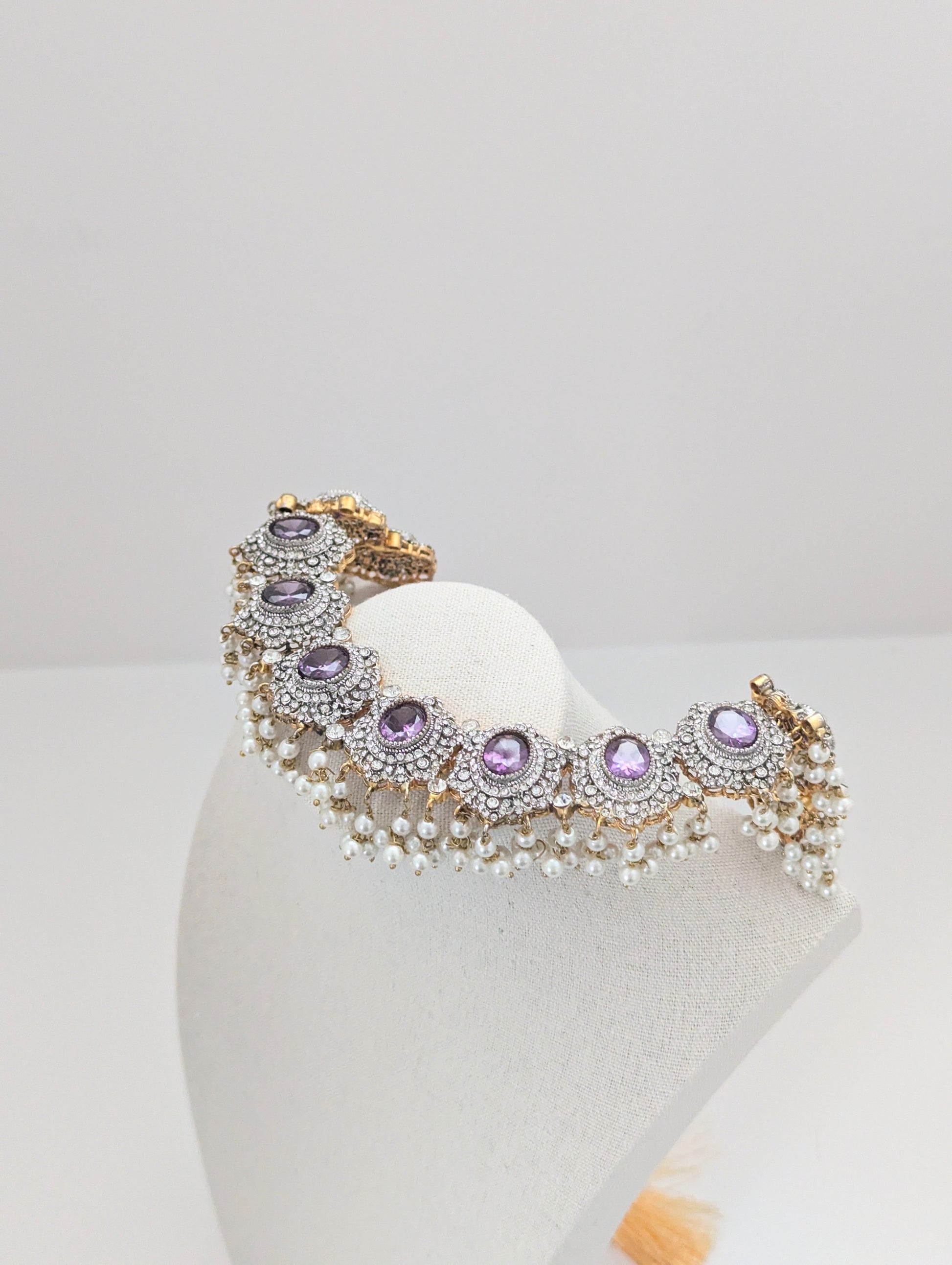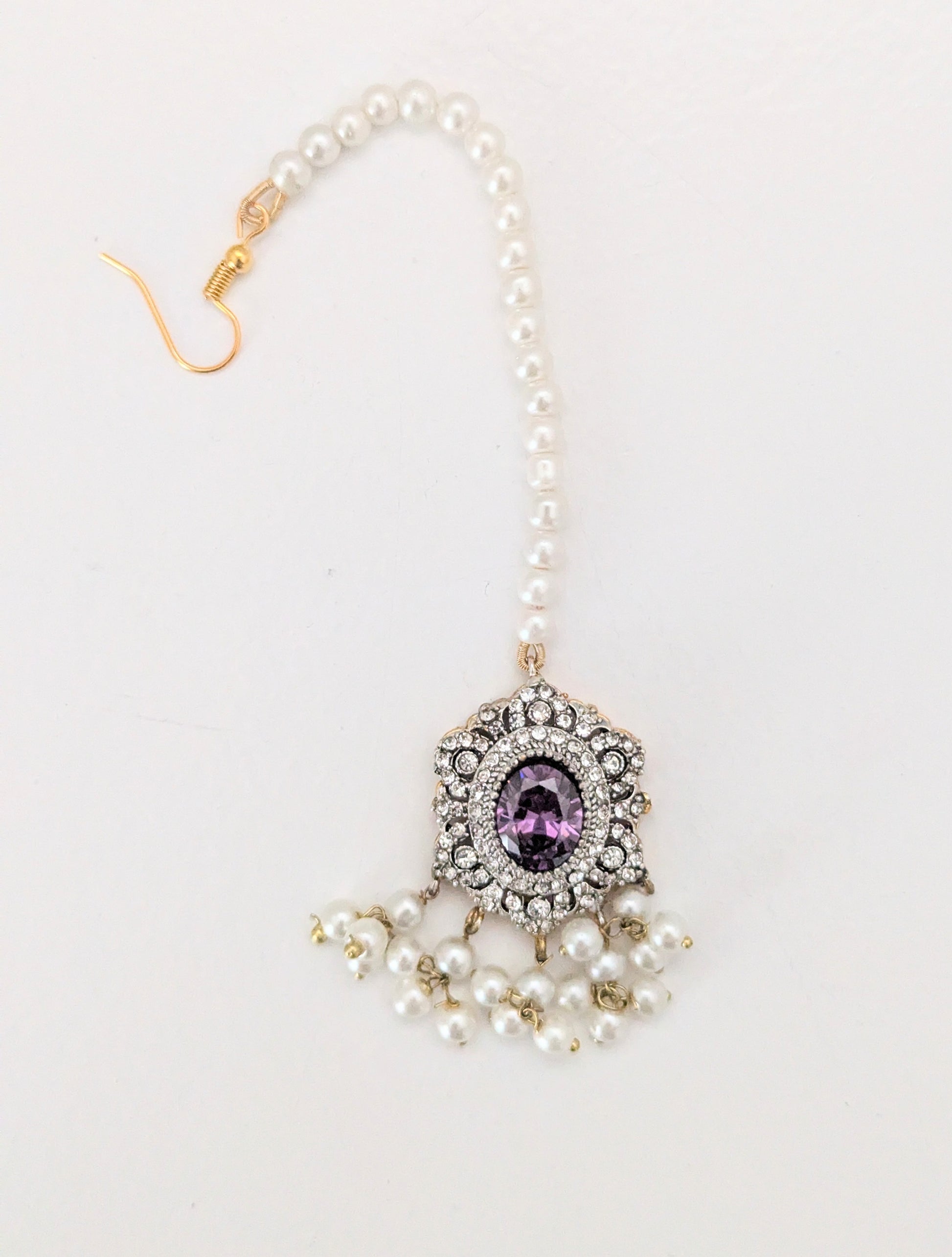 This exquisite jewelry set features a stunning necklace, a pair of matching earrings, and a complementary maang tikka. The pieces are adorned with intricate silver-toned detailing, accented by deep purple stones at the center of each motif. Surrounding the gemstones are sparkling white stones and elegant pearl drops, giving the set a regal and timeless look. Ideal for weddings, festive occasions, or formal events, this set blends traditional charm with modern elegance.