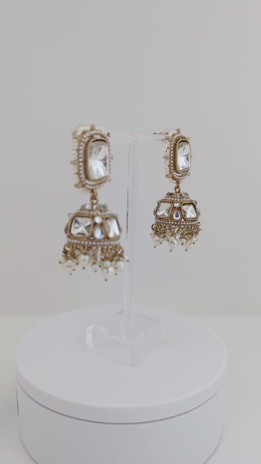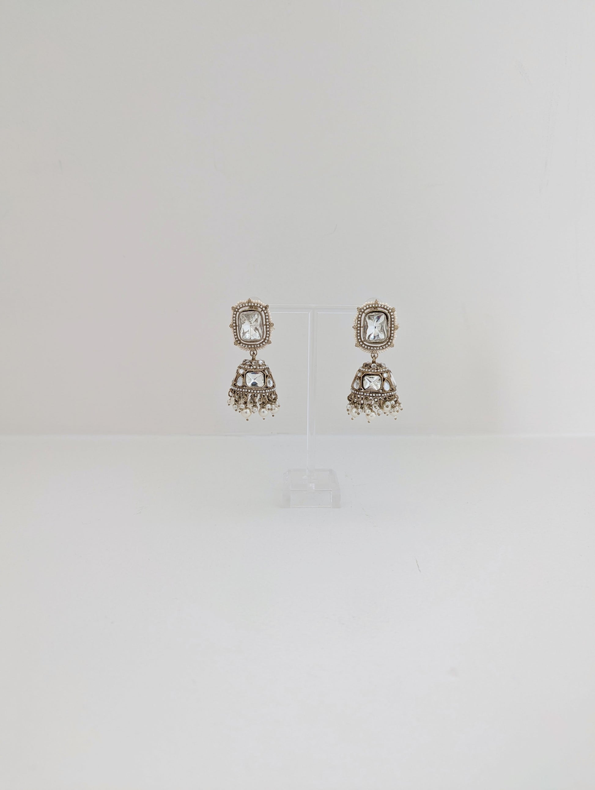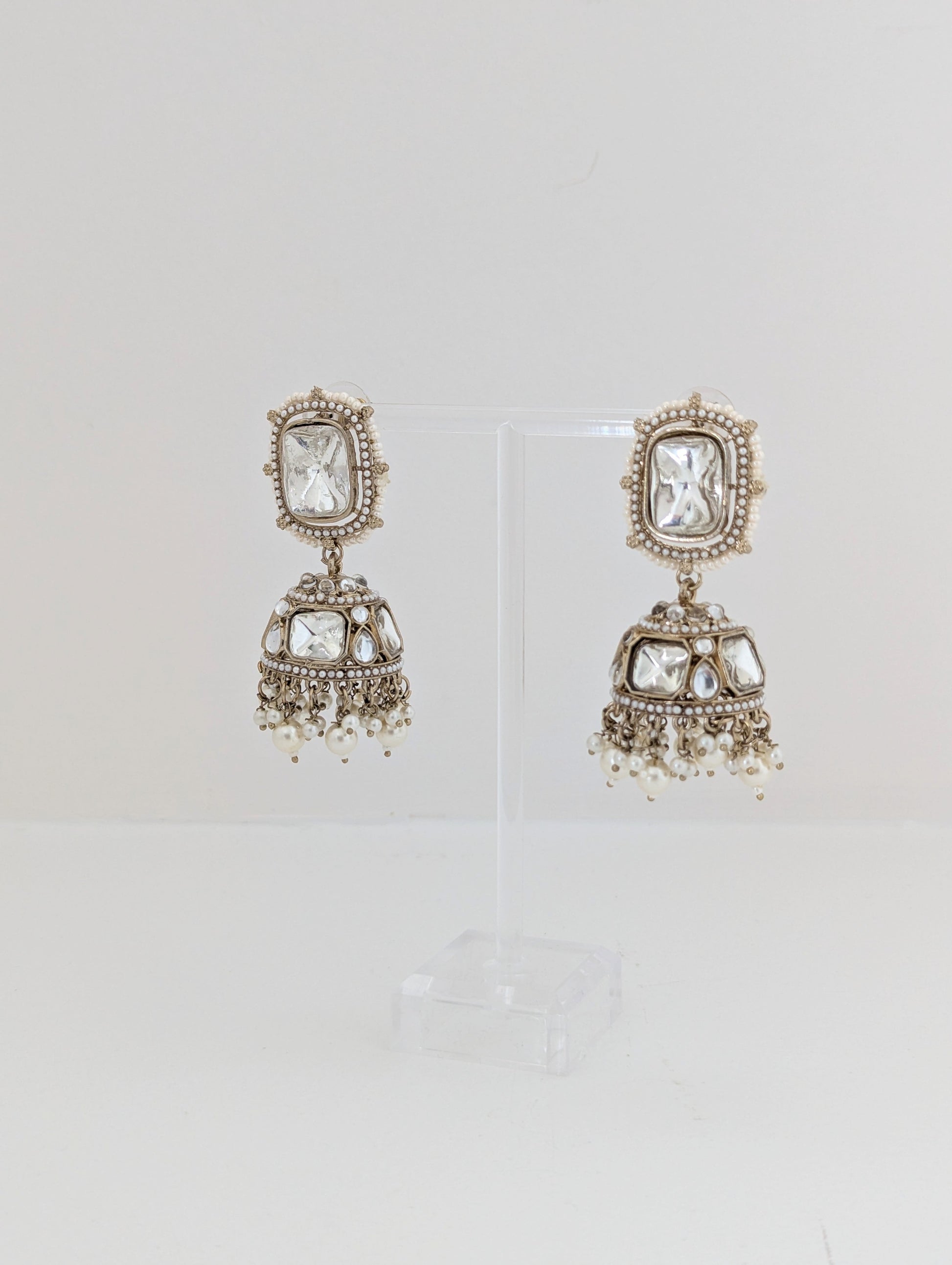 These elegant earrings feature a classic jhumka silhouette with a regal blend of white stones and delicate pearl accents. The top portion showcases rectangular, mirror-like stones framed with fine beadwork, while the dome-shaped jhumka below is adorned with similar stones and intricate metallic detailing. Dangling pearl clusters add graceful movement and a timeless charm, making these earrings perfect for traditional and festive occasions