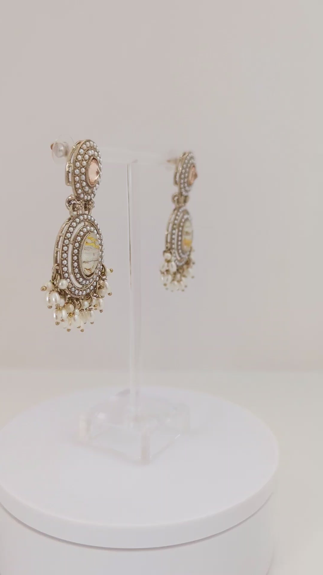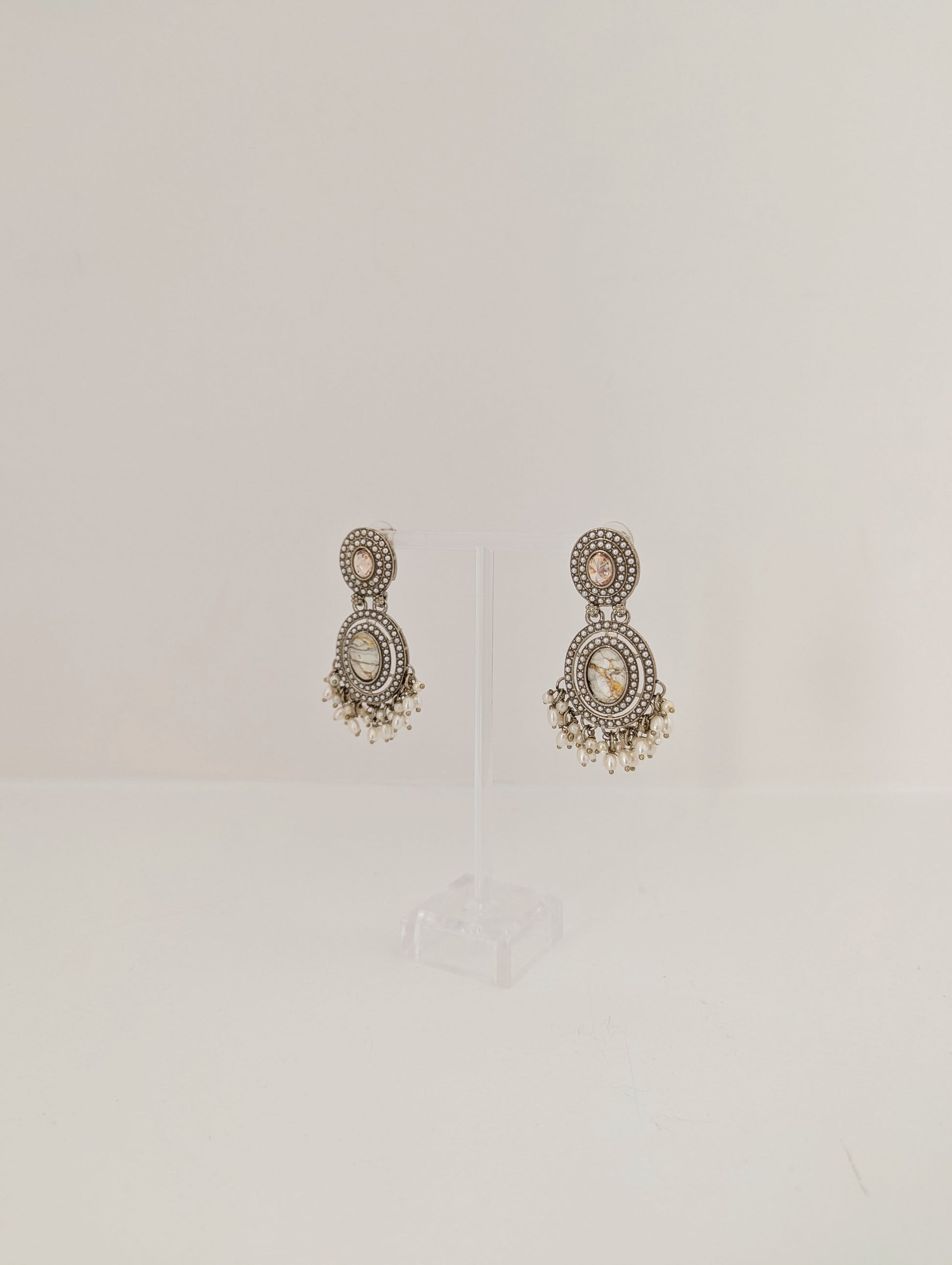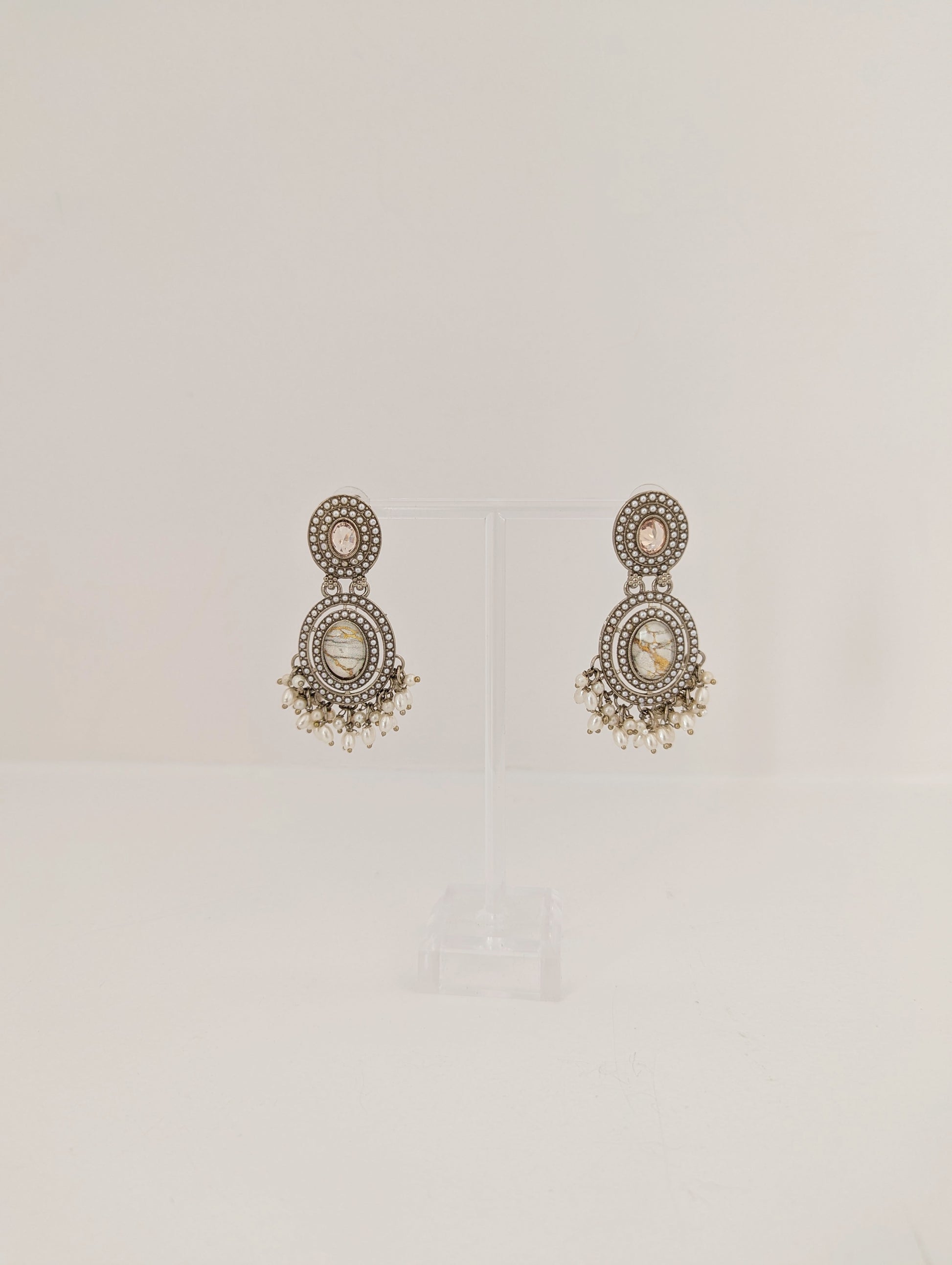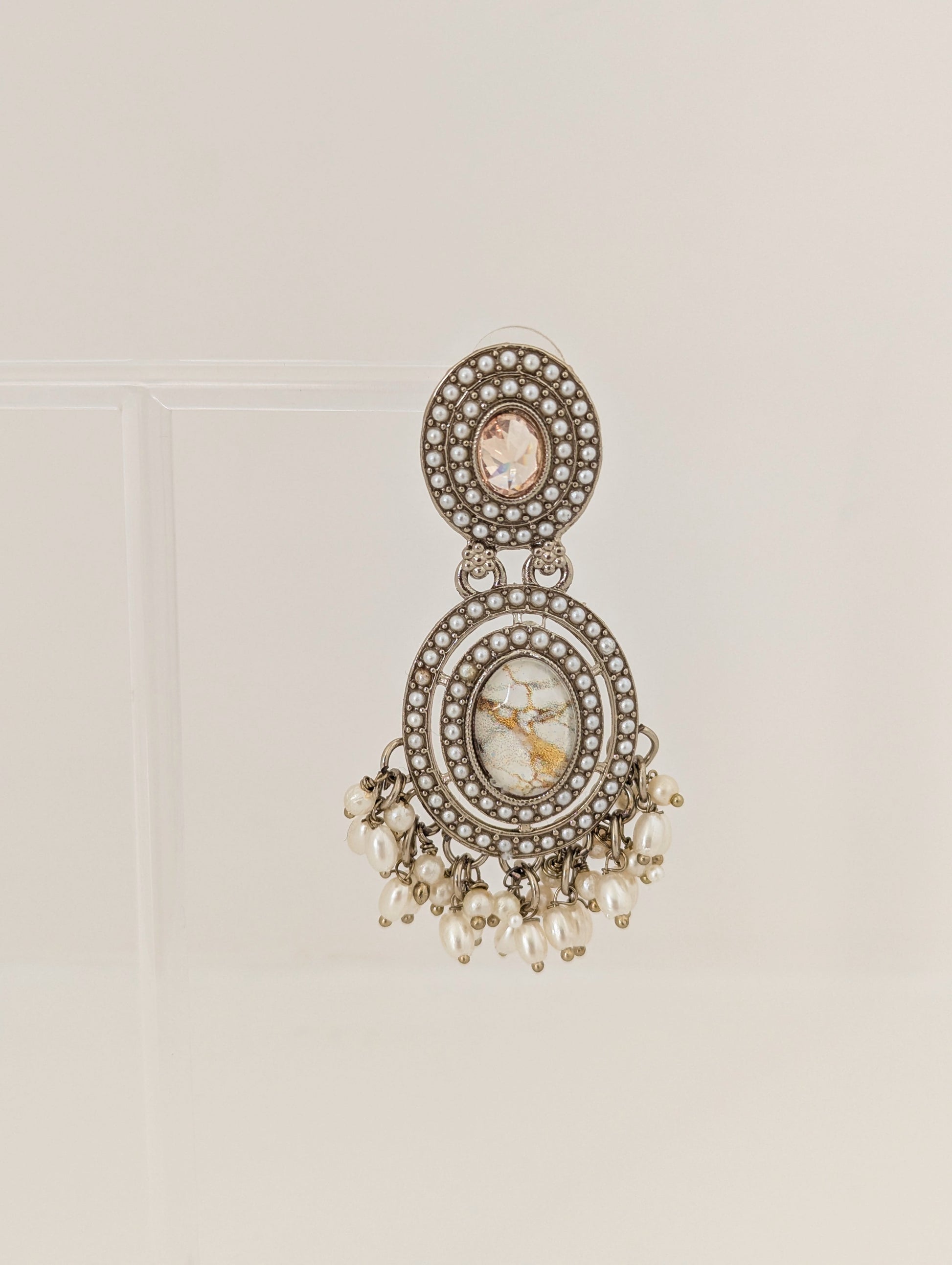 These elegant earrings feature a vintage-inspired design with intricate detailing. The top section showcases a soft champagne-toned stone surrounded by concentric rows of delicate pearls. The centerpiece highlights a marbled oval stone framed by ornate metalwork and tiny pearls, adding a touch of old-world charm. Dangling clusters of off-white pearls enhance the overall grace and movement of the piece, making these earrings a refined choice for traditional or fusion ensembles.