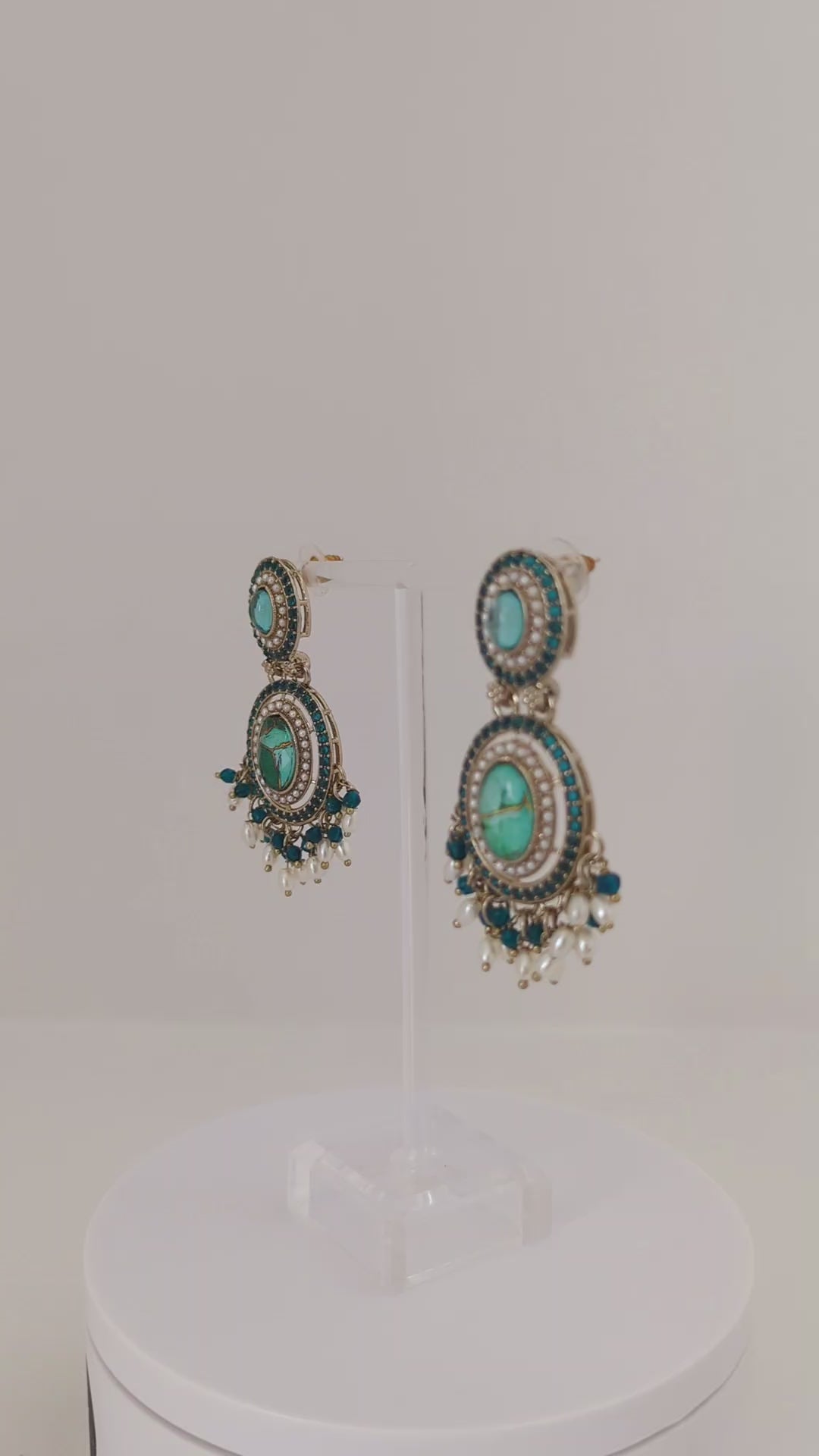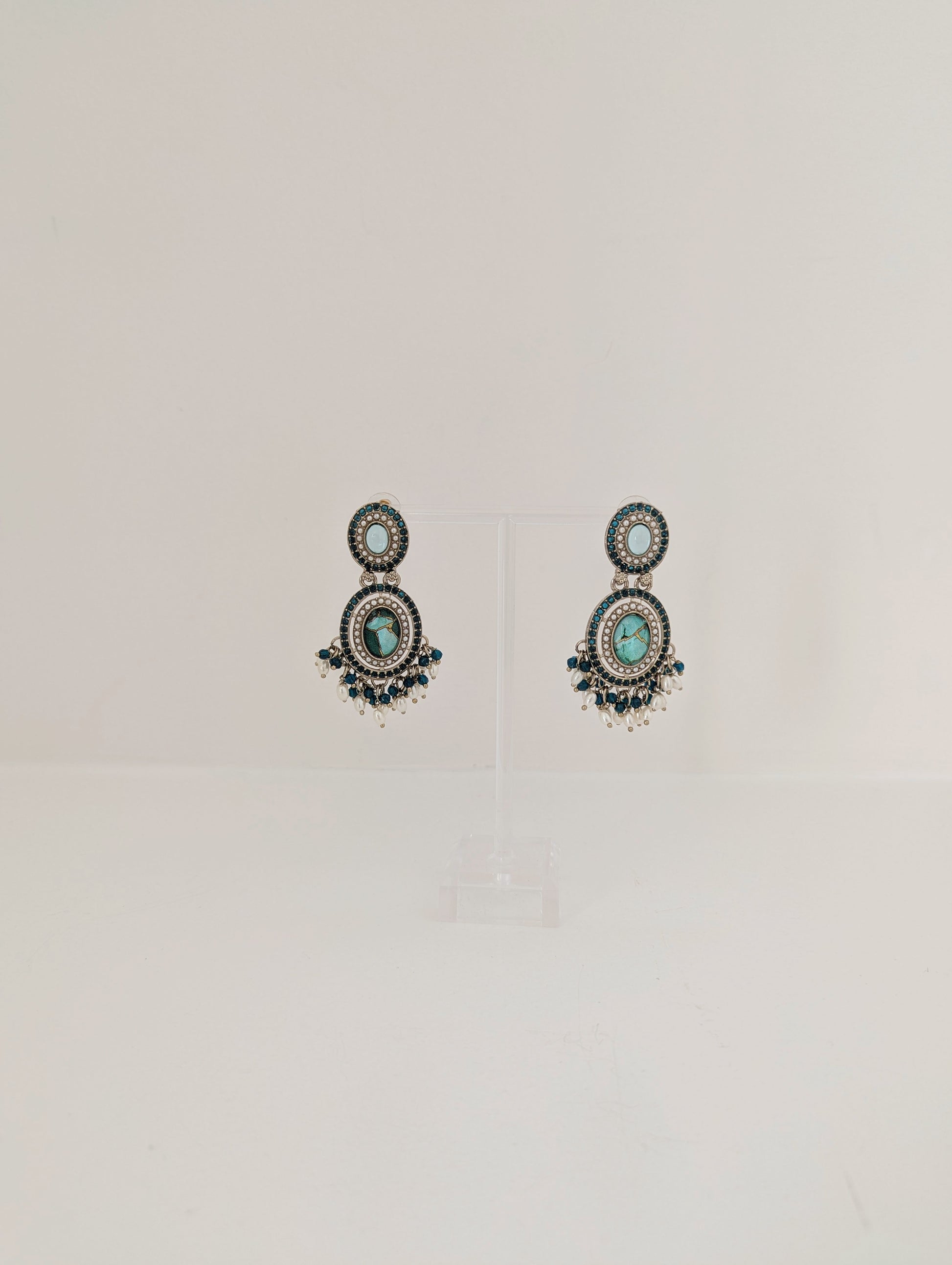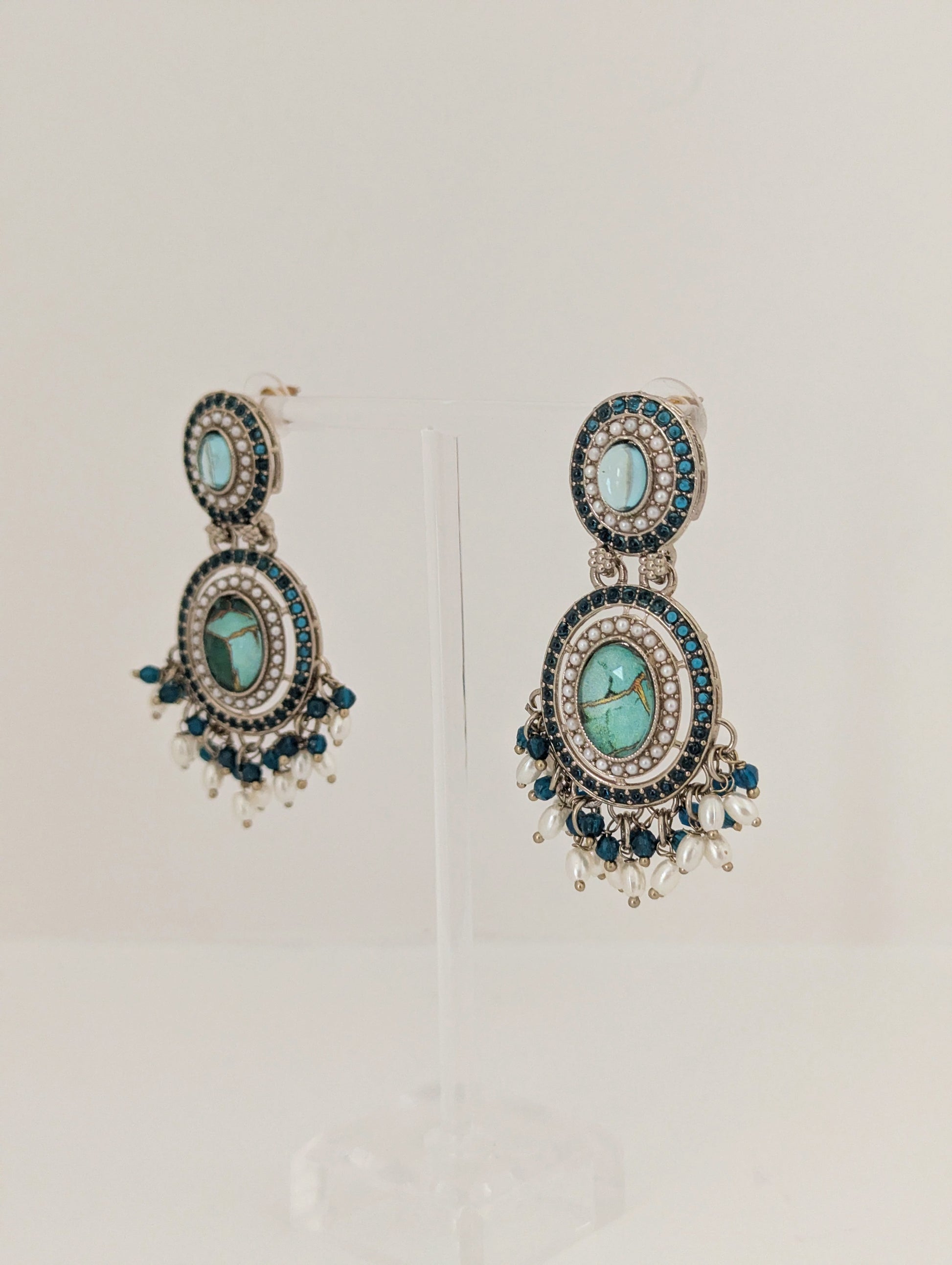 These elegant chandelier earrings feature intricate silver-toned frames adorned with concentric rings of pearls and deep blue crystals. At the center of each piece lies a striking green marbled stone, adding a touch of earthy sophistication. Dangling clusters of white pearls and blue beads complete the design, creating a graceful and timeless statement accessory.