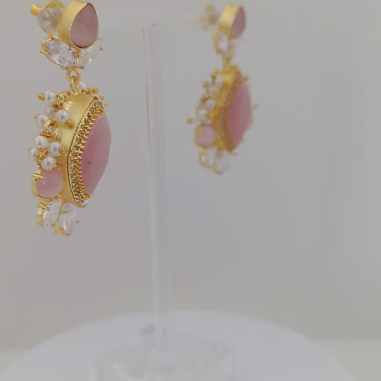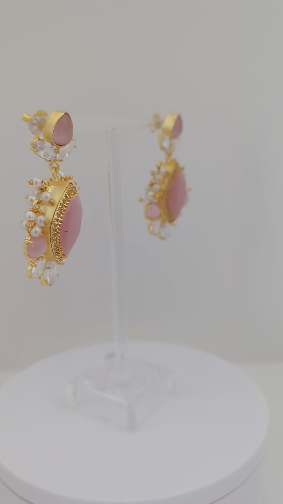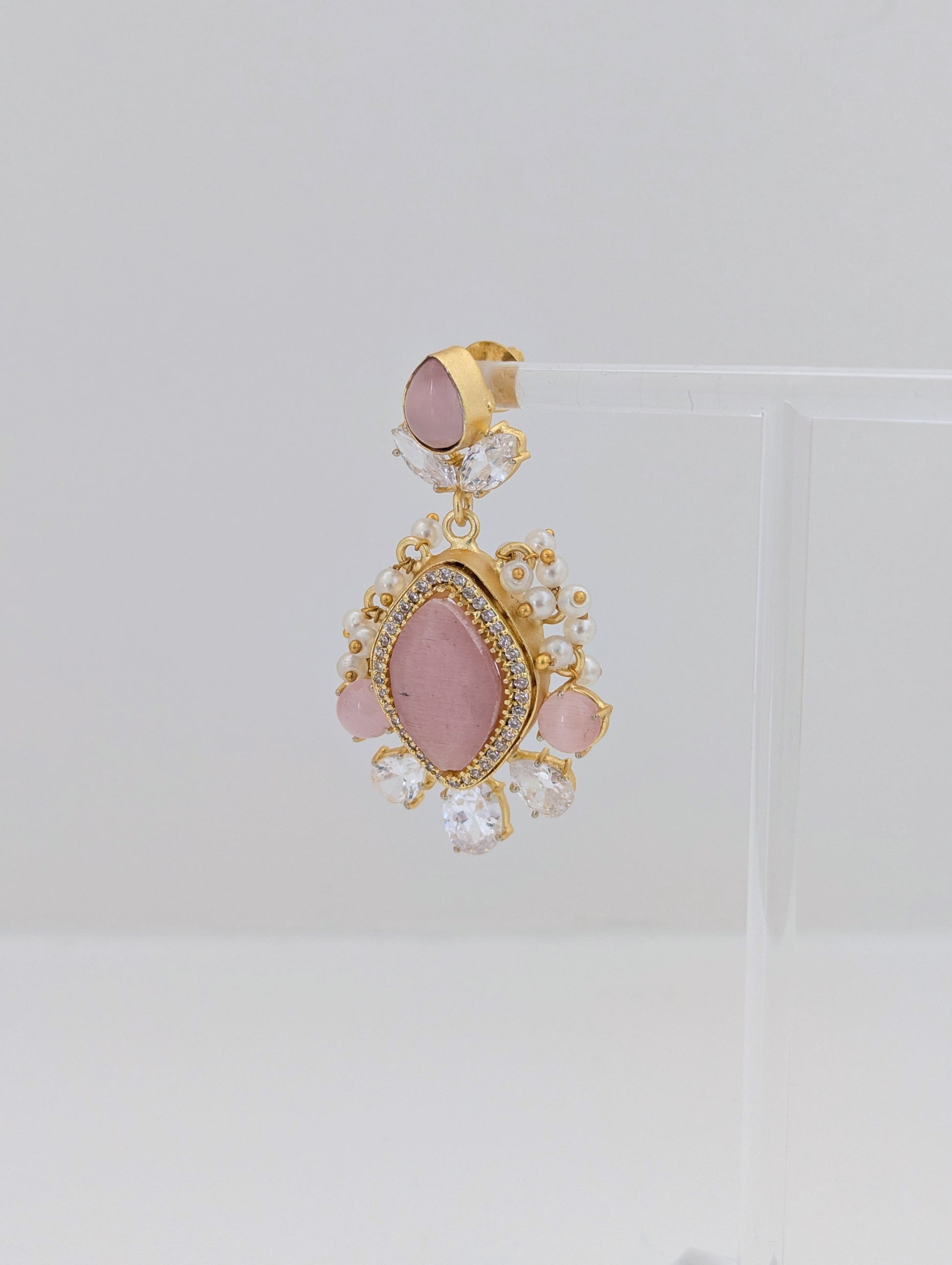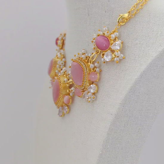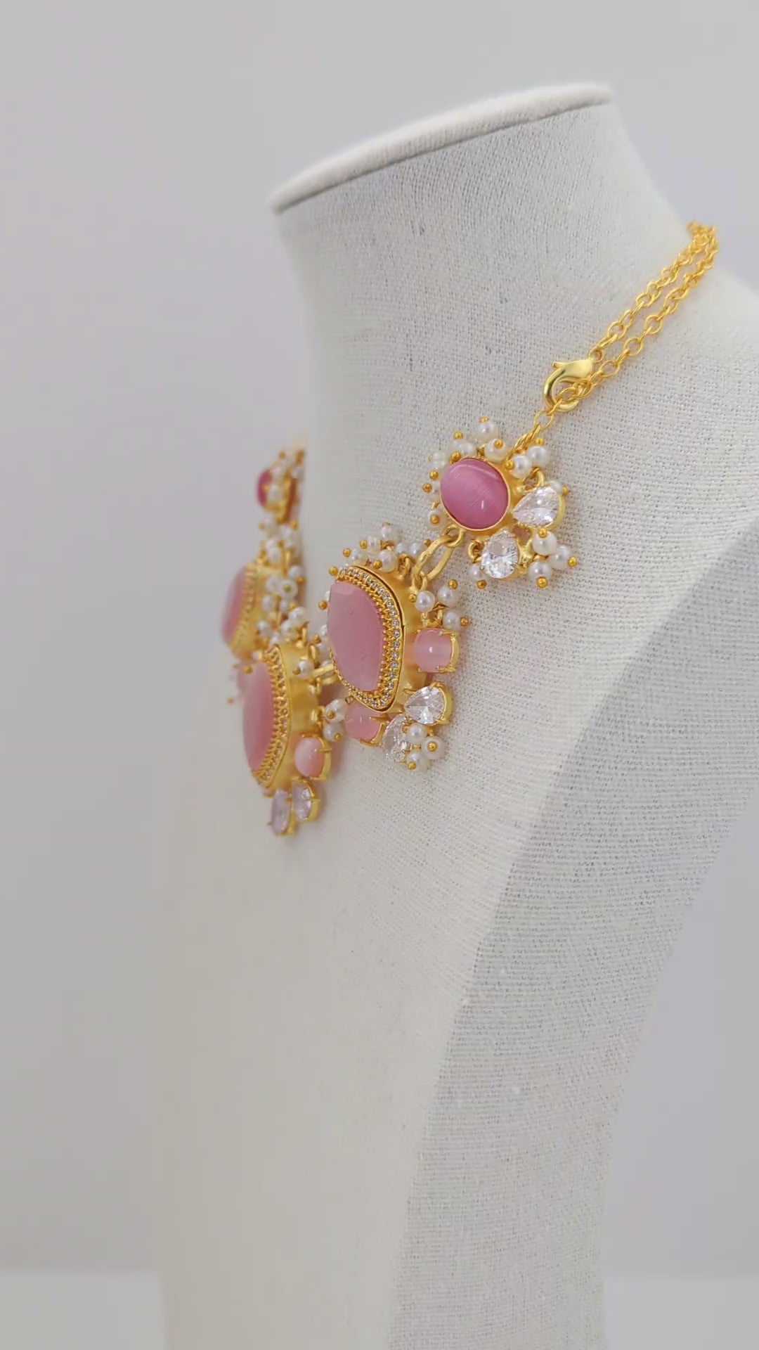 This elegant jewelry set features a statement necklace, matching earrings, and a delicate bracelet. Designed with soft rose-toned stones framed in gold, each piece is accentuated by clusters of pearls and sparkling crystals. The combination of refined pink hues and lustrous detailing creates a timeless, feminine charm — perfect for festive occasions or elegant soirées.