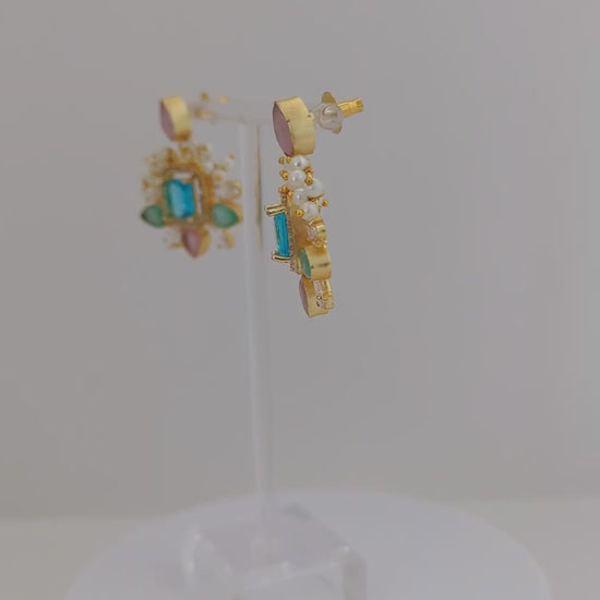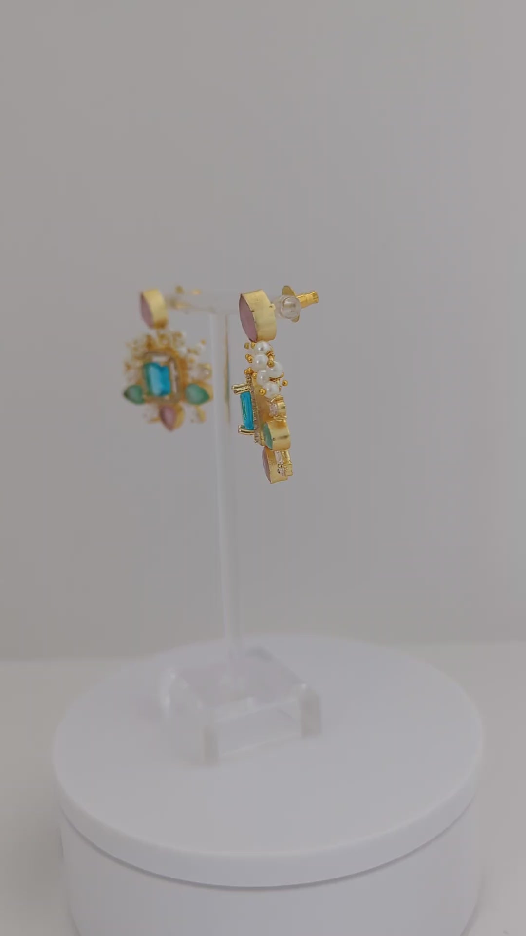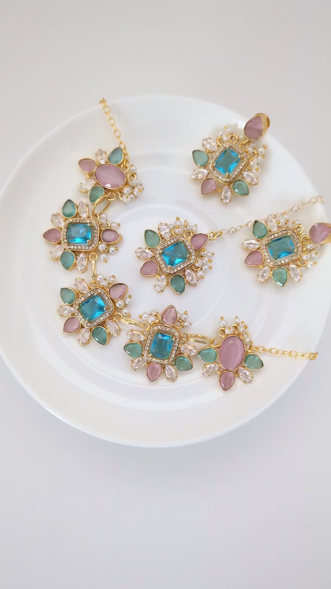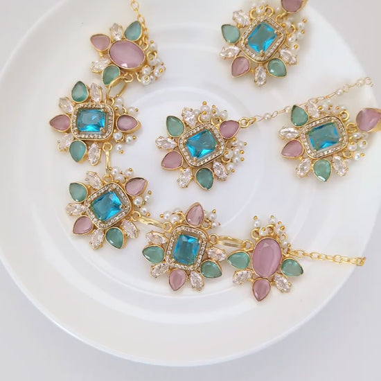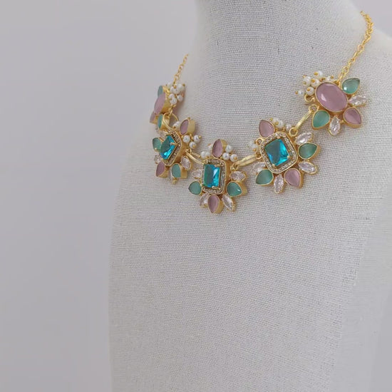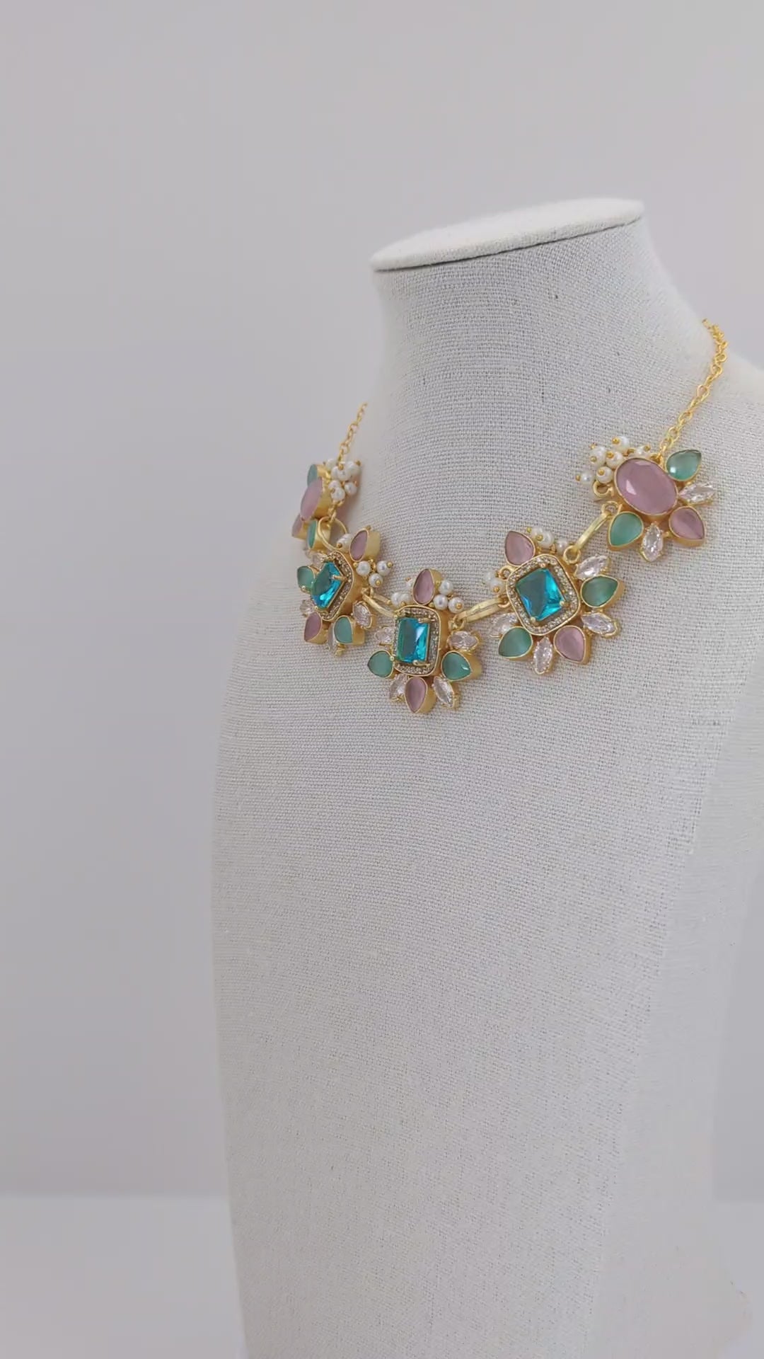 This exquisite jewelry set features a stunning combination of aqua blue, blush pink, and sea-green stones framed in gold. The necklace showcases a harmonious floral design with radiant blue centerpieces surrounded by teardrop and marquise-shaped stones, accented with delicate pearls for a touch of grace. Paired with matching earrings, this set beautifully balances vibrant hues and elegant craftsmanship — perfect for festive occasions or refined celebrations.