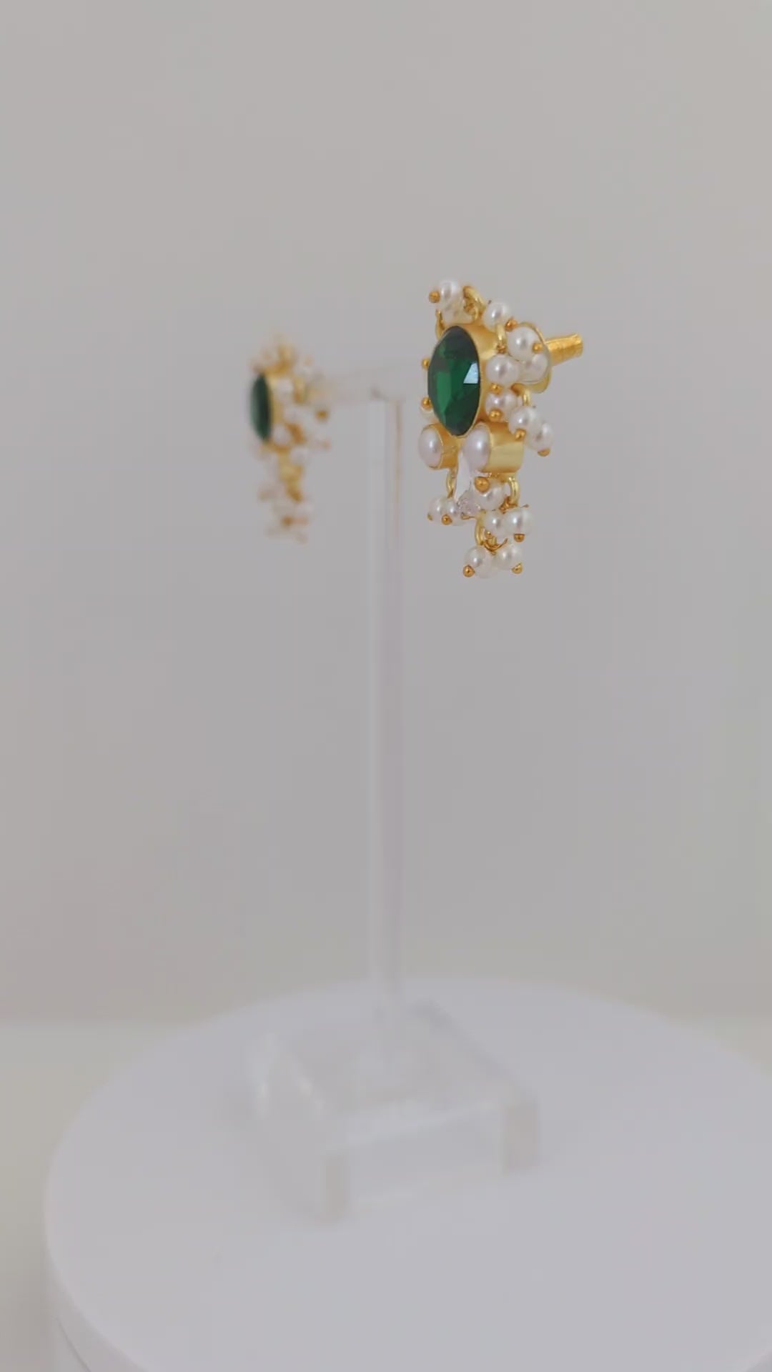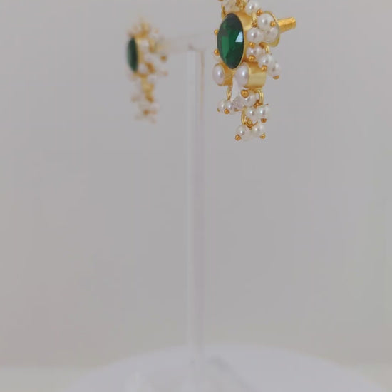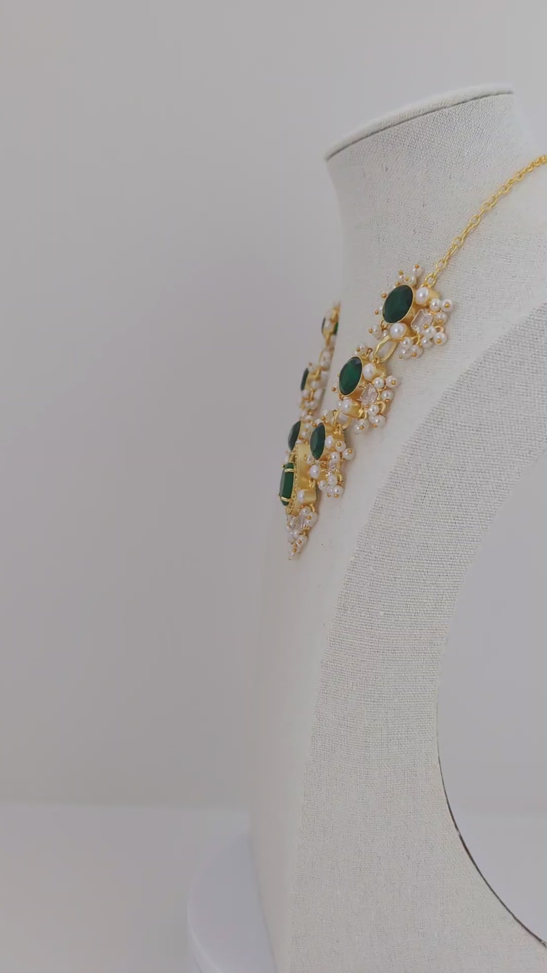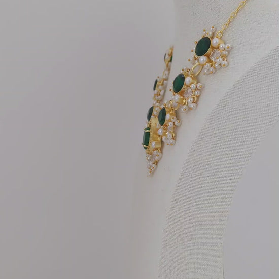 This elegant jewelry set exudes regal sophistication with its deep emerald-green stones surrounded by lustrous freshwater pearls and sparkling white accents. The intricate gold framework enhances the richness of the design, while the pearls add a timeless, graceful charm. Perfect for evening occasions or festive celebrations, this set captures the essence of refined luxury and classic beauty.