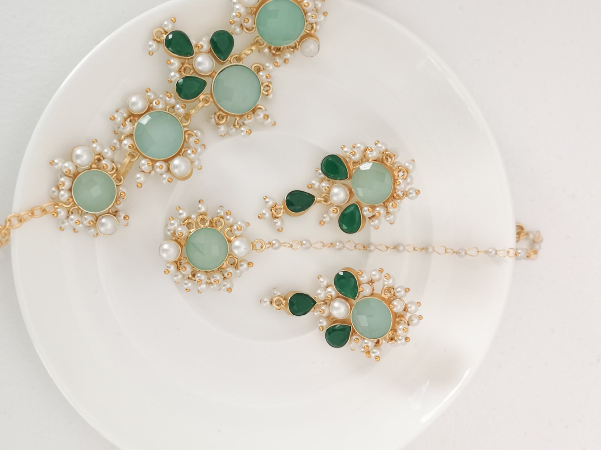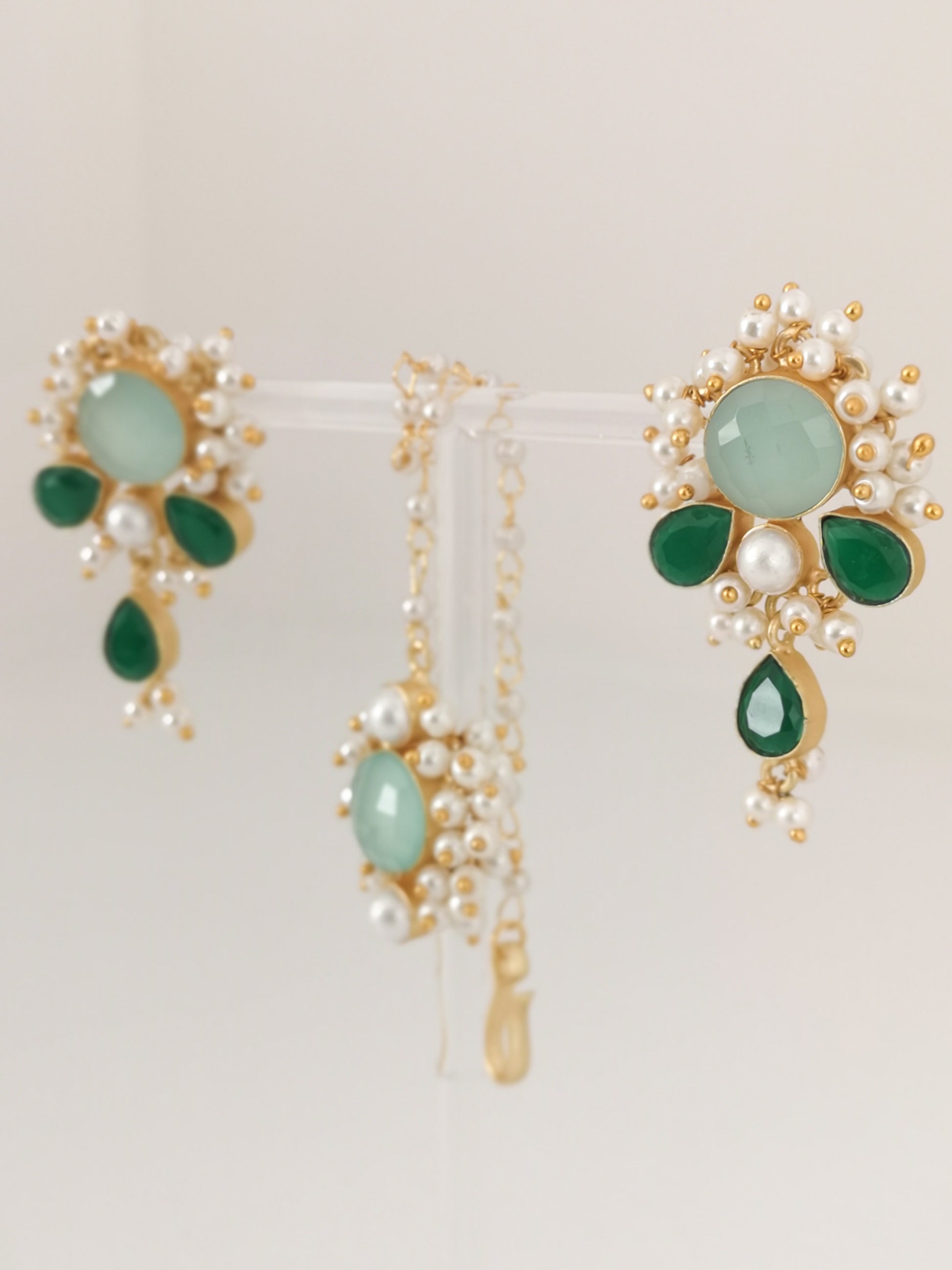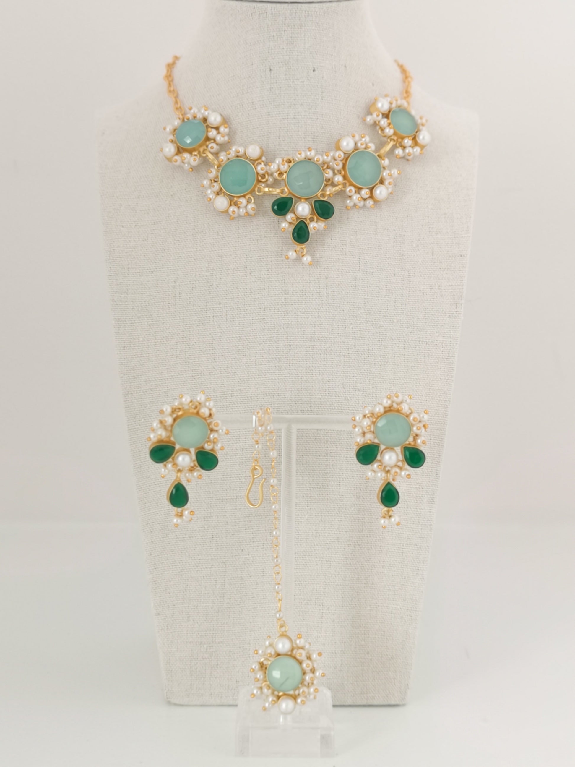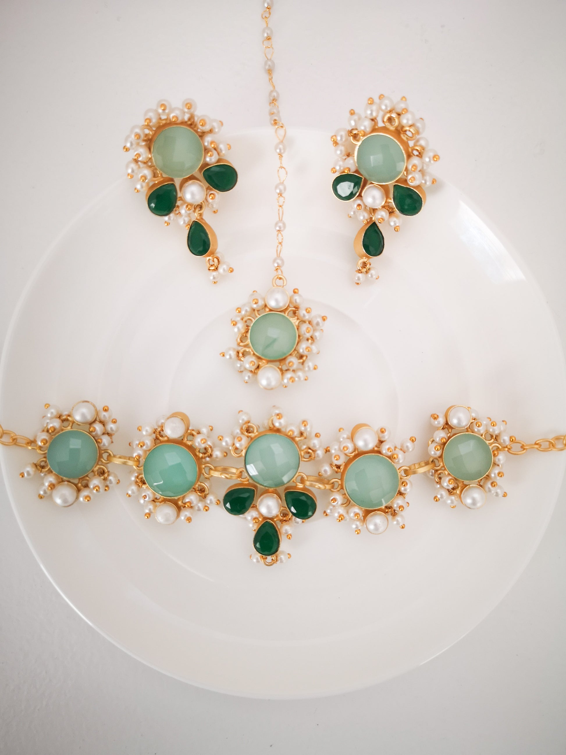 Classic Mimi Freshwater Pearl Collection - Chalcedony, Crystals, Pearls, Gold Plated - Light and dark Green