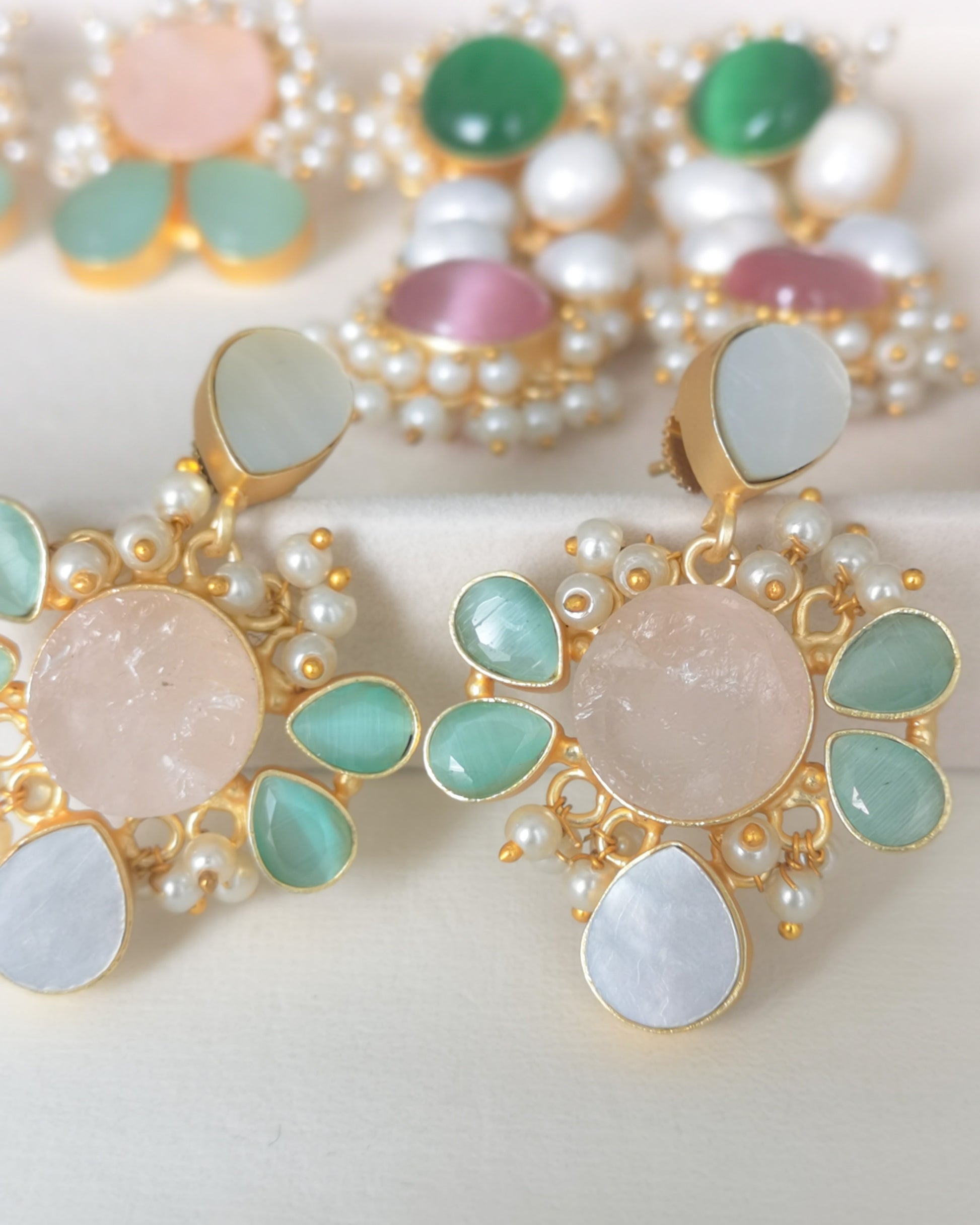 Classic Mimi Freshwater Pearl Earrings - Gold Plated - Natural Stones - Pink, Aqua and Pearls
