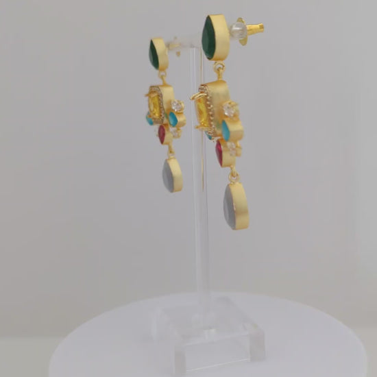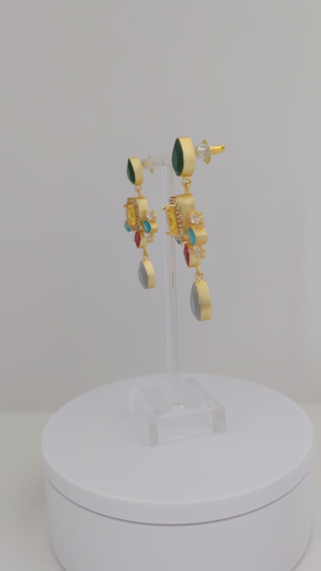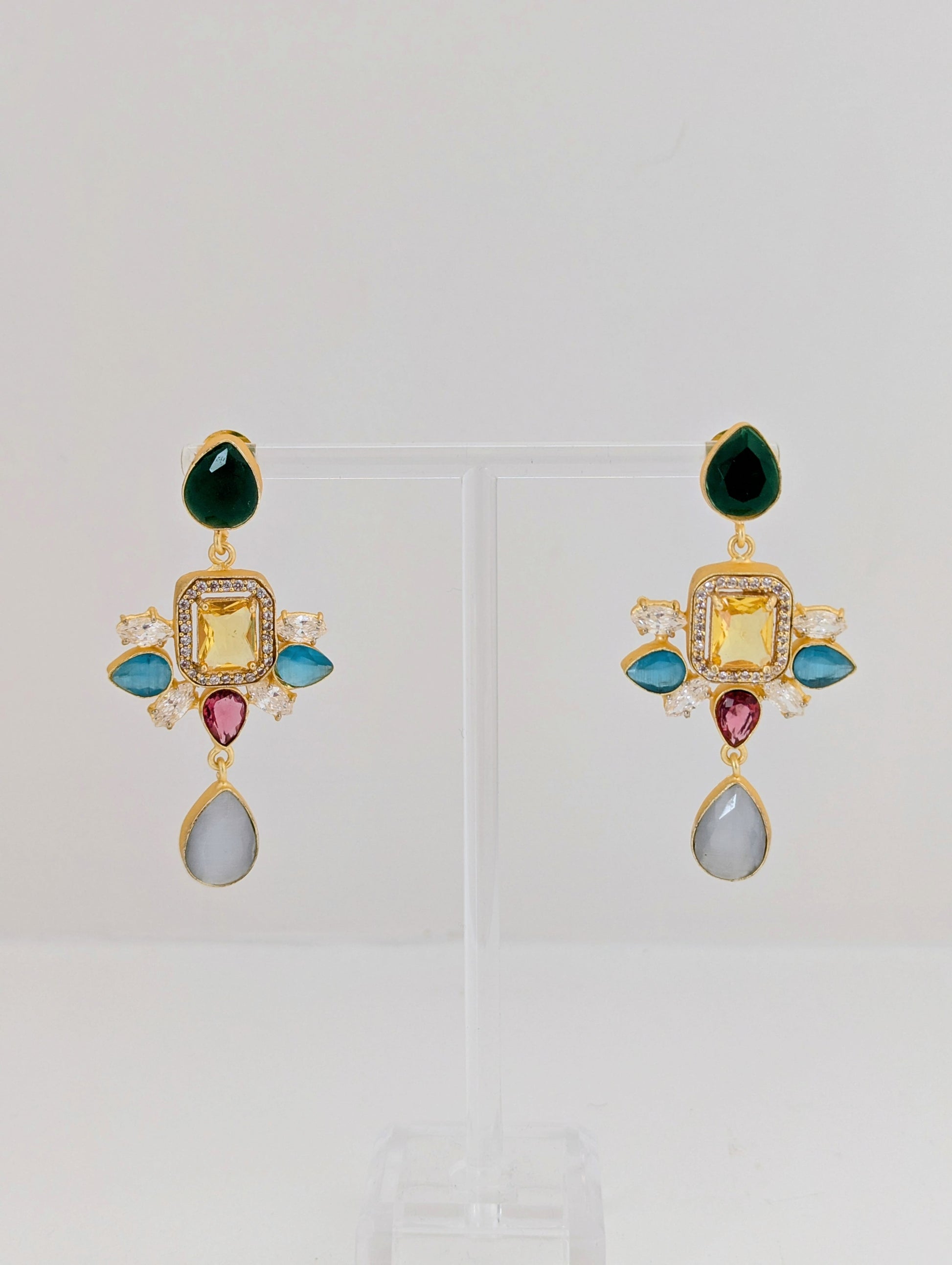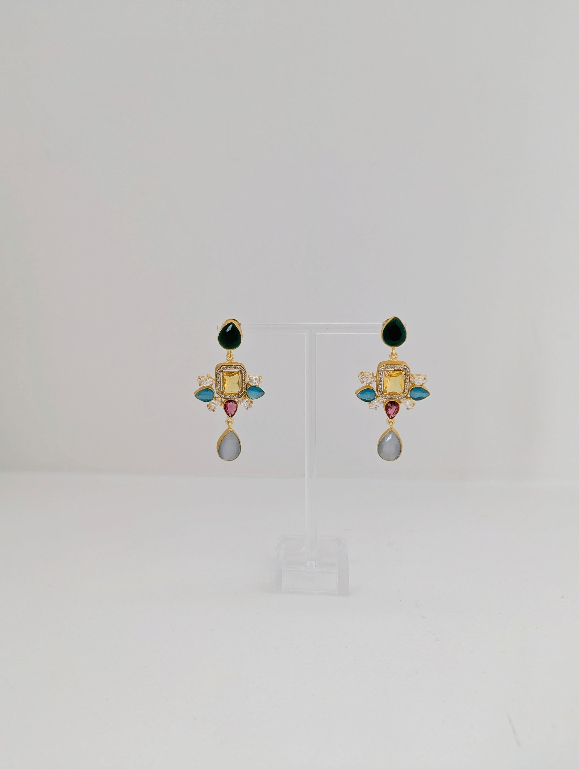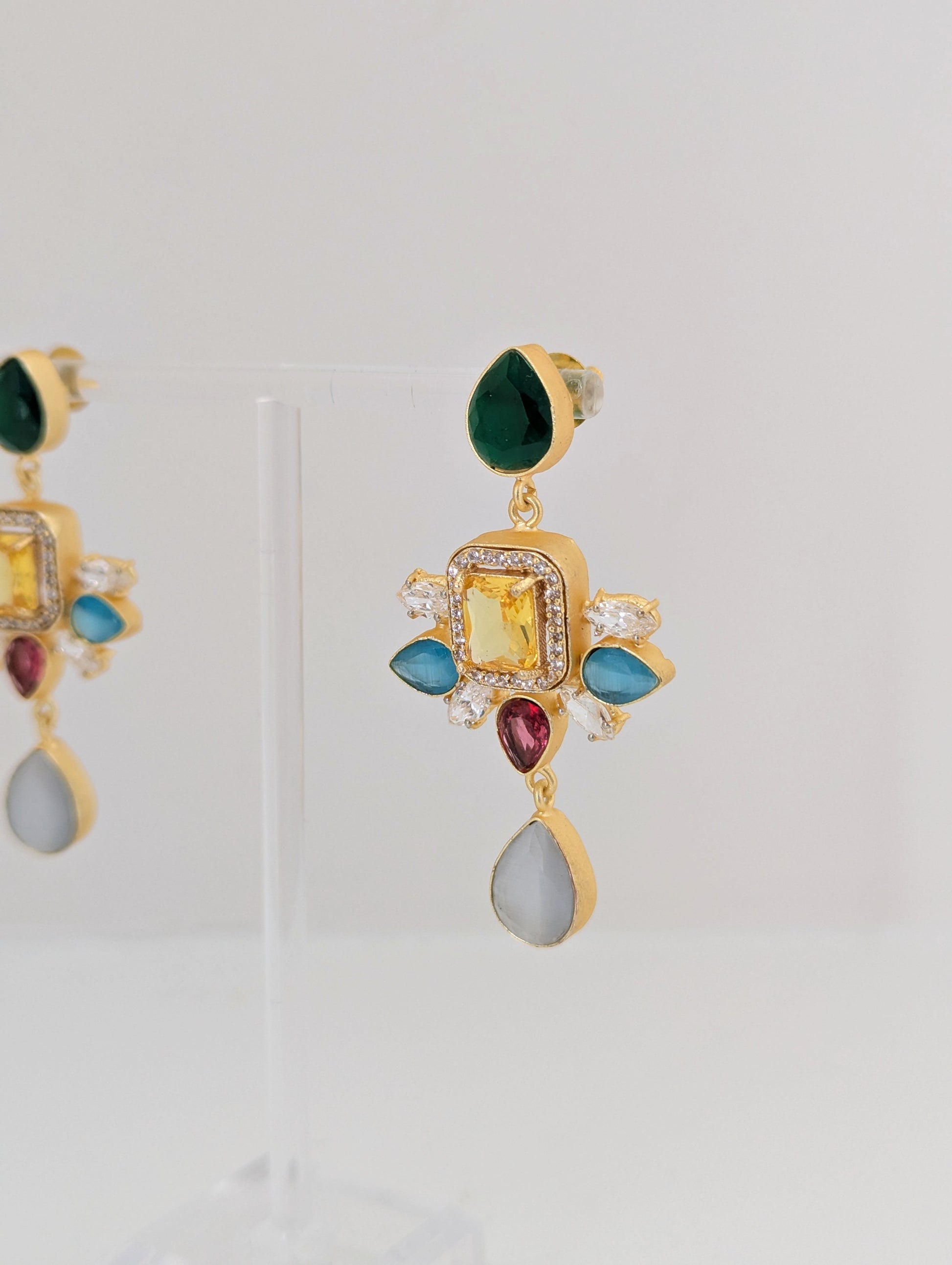 These vibrant statement earrings showcase a stunning mix of rich jewel tones and elegant sparkle. A deep green teardrop stud anchors the design, leading to a radiant yellow centerpiece framed by shimmering crystals. Accents of turquoise marquise stones and a ruby-red teardrop add bold contrast, while a soft, frosted grey drop gently sways below for a refined finishing touch. Set in warm gold, these earrings blend color and sophistication for a look that’s striking and timeless.