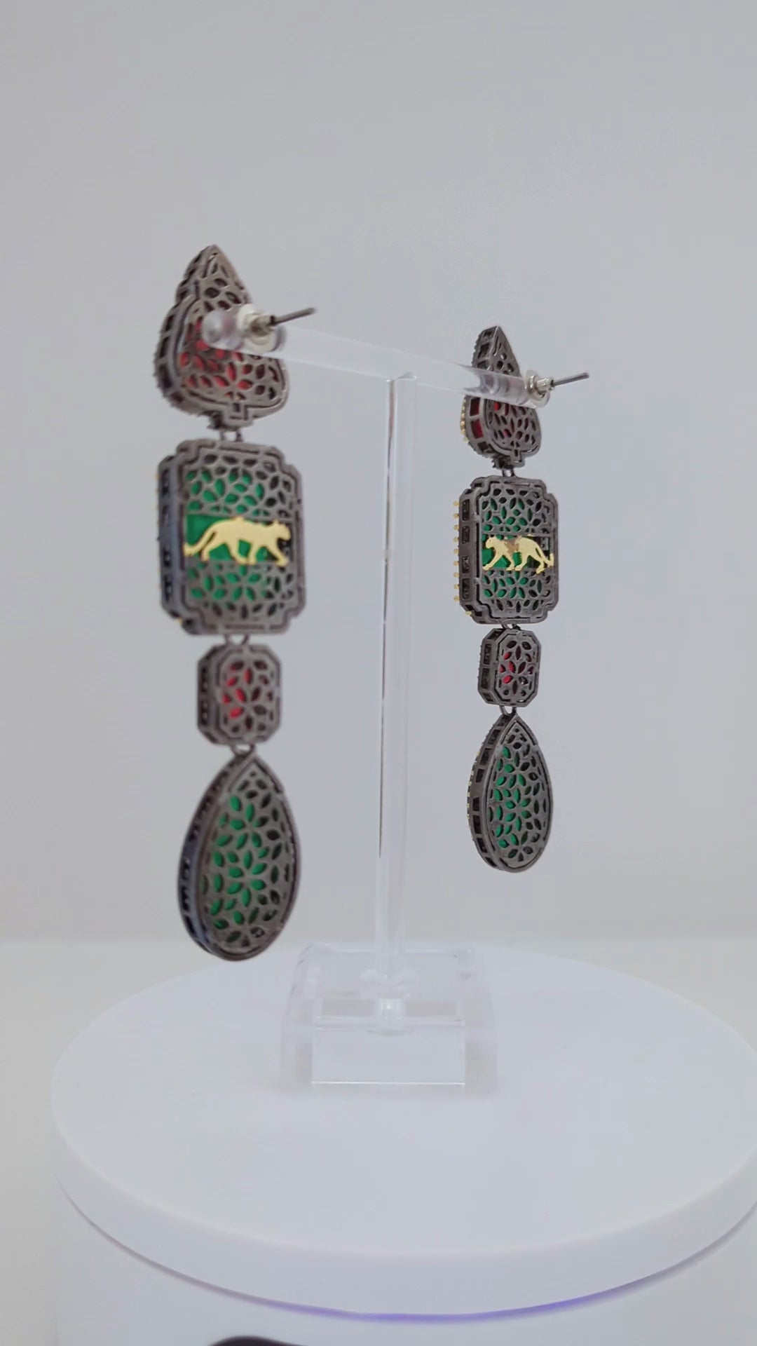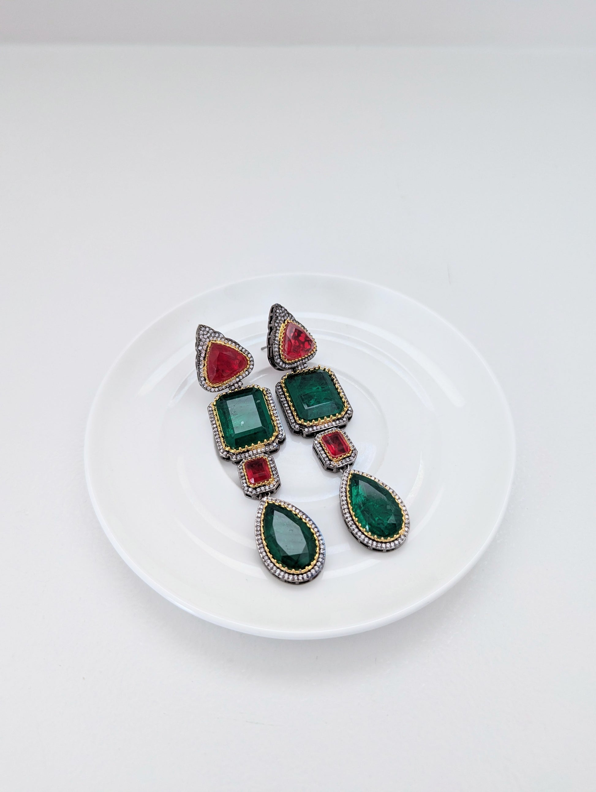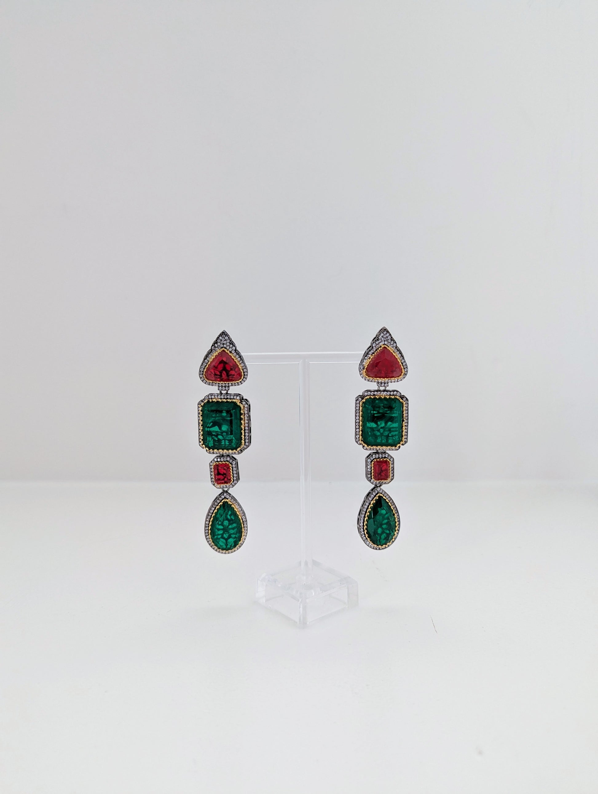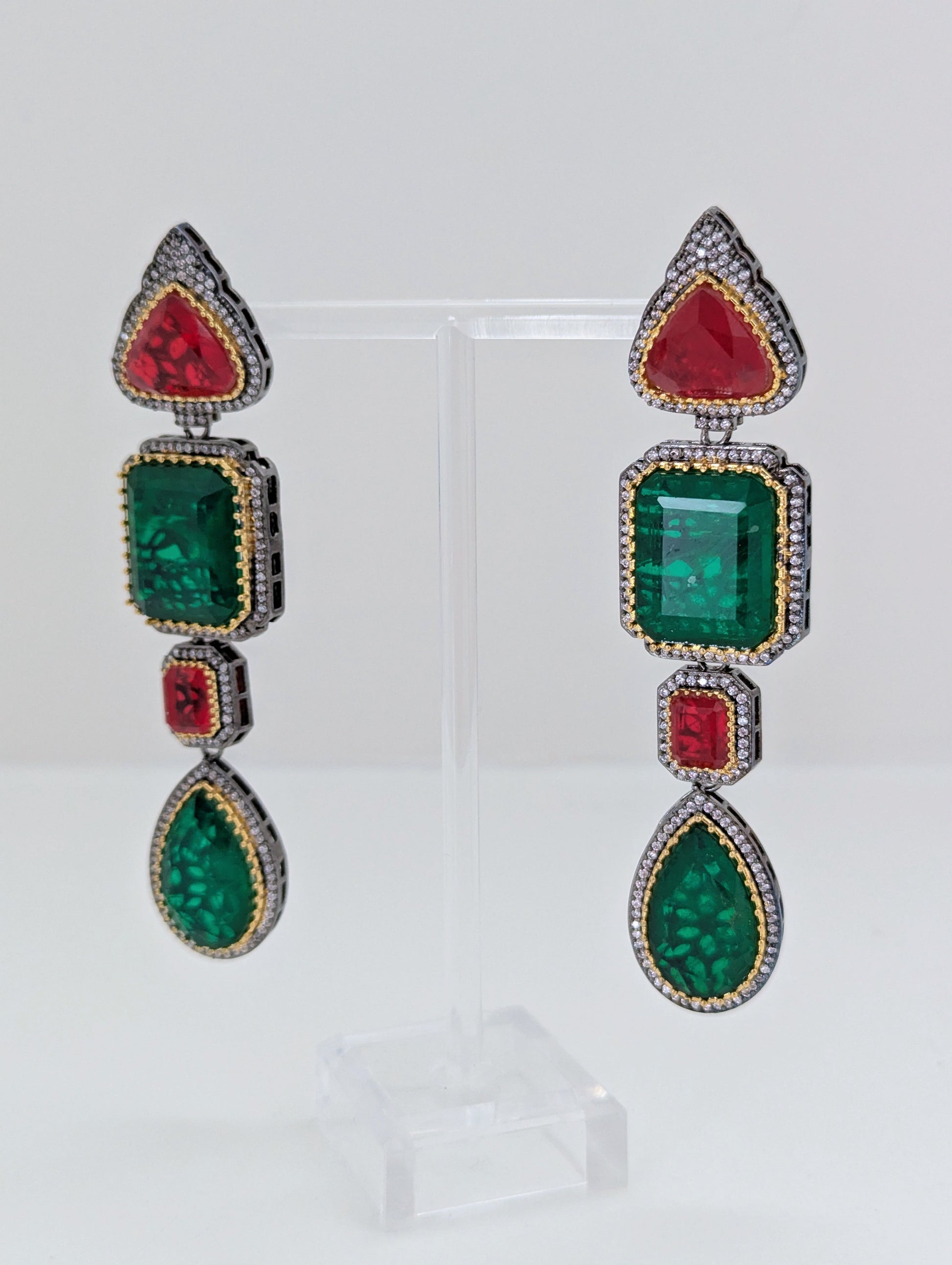 These striking stone earrings feature a luxurious combination of deep green and rich red stones in varied cuts—pear, square, and rectangular. Each stone is intricately bordered with gold accents and shimmering pavé-set crystals, adding a regal charm. The tiered drop design creates an elegant elongation, making them a perfect statement piece for formal or festive occasions.