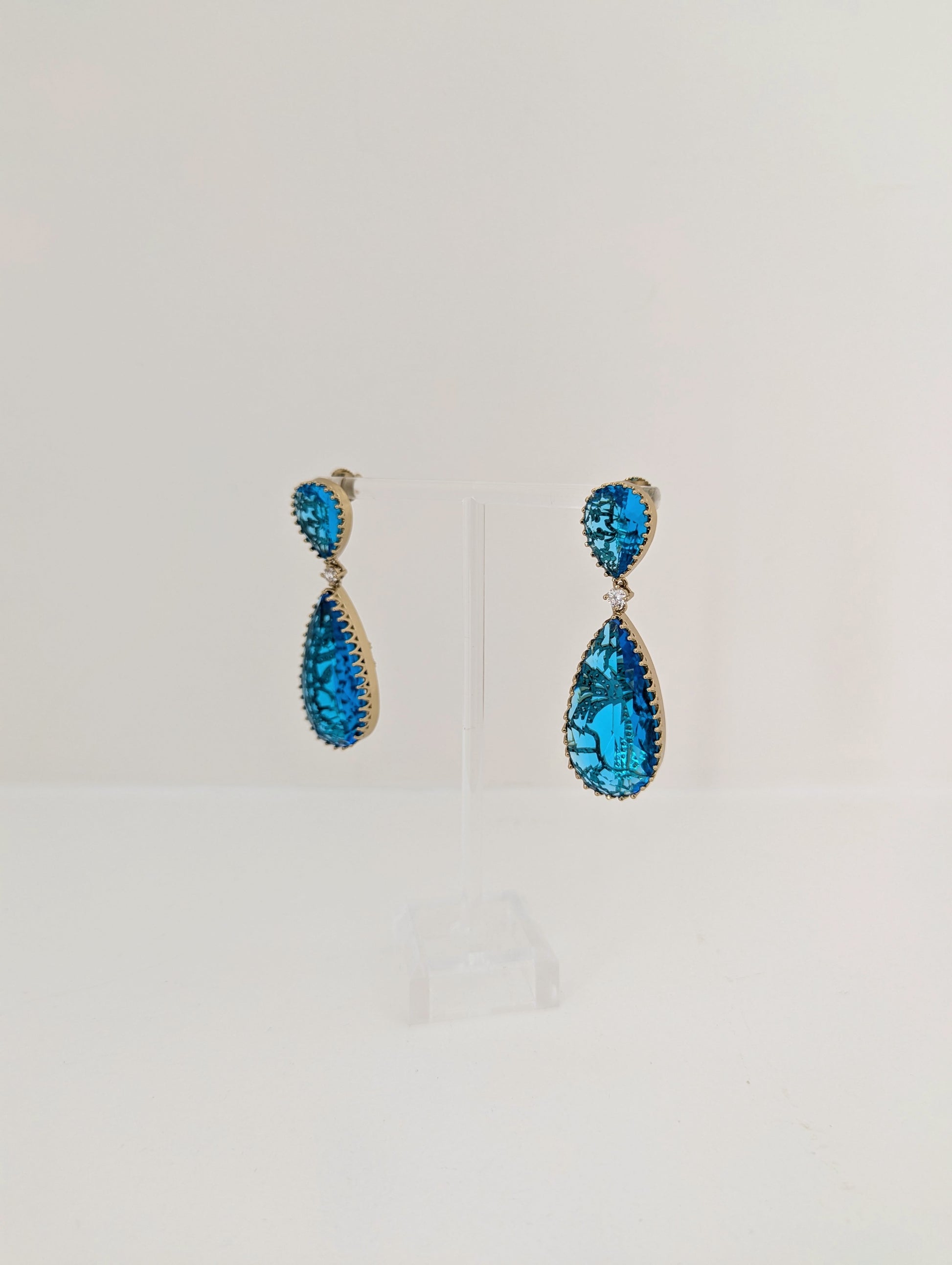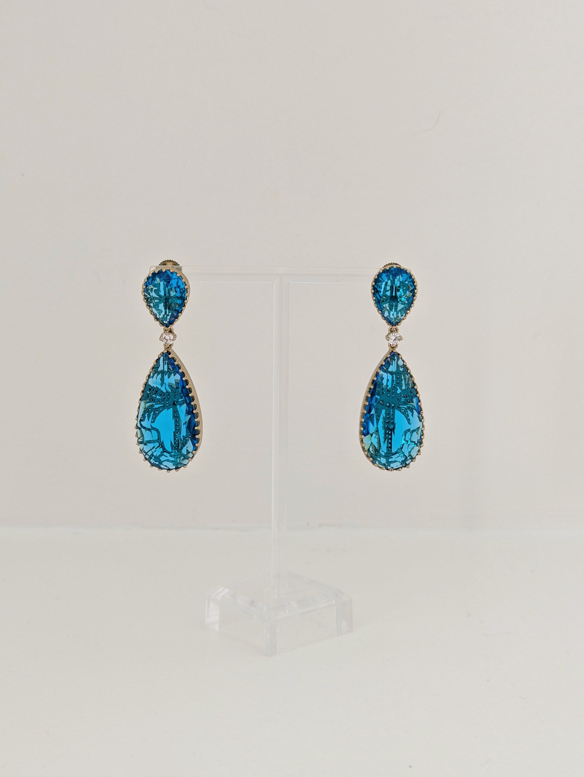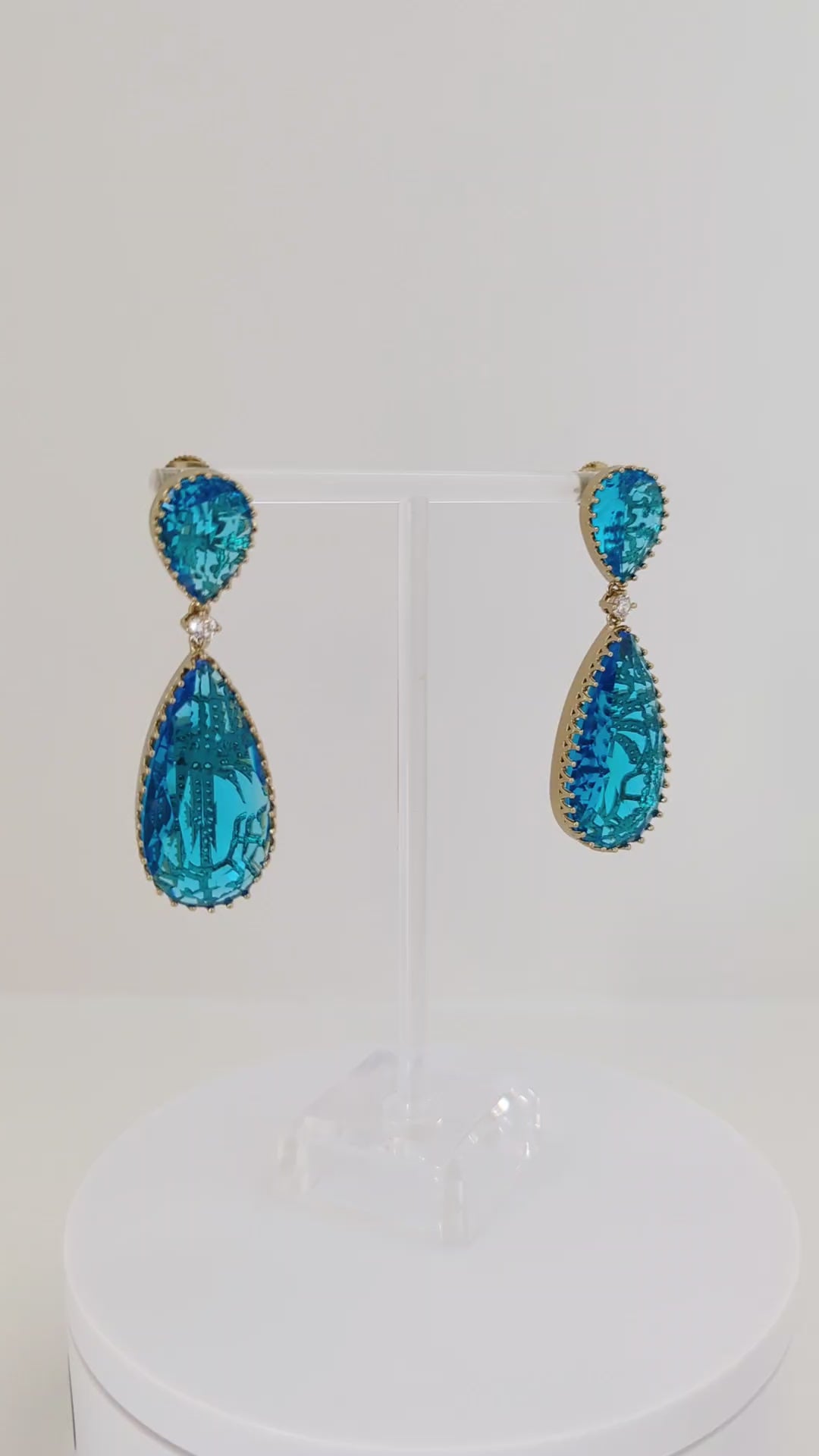 These exquisite drop earrings feature a captivating aqua colour, cut in elegant teardrop shapes. The top stones are intricately faceted and bordered with delicate gold detailing, while the larger Aqua teardrop crystals below showcase ornate gold inlay work that adds depth and texture. A single clear stone links the two drops, adding a touch of brilliance and refinement. These earrings beautifully balance bold color with delicate craftsmanship, making them a statement piece for elegant occasions.