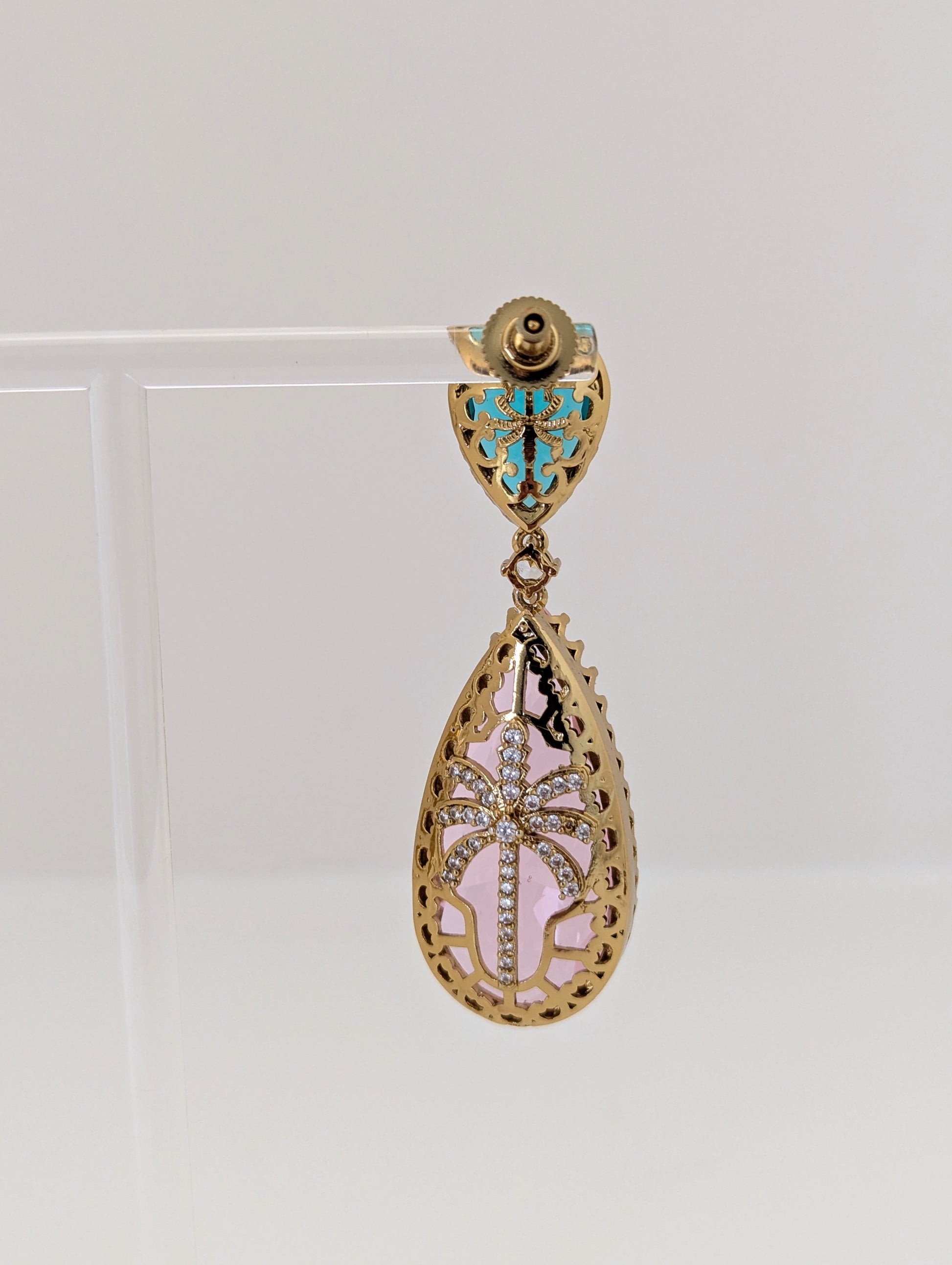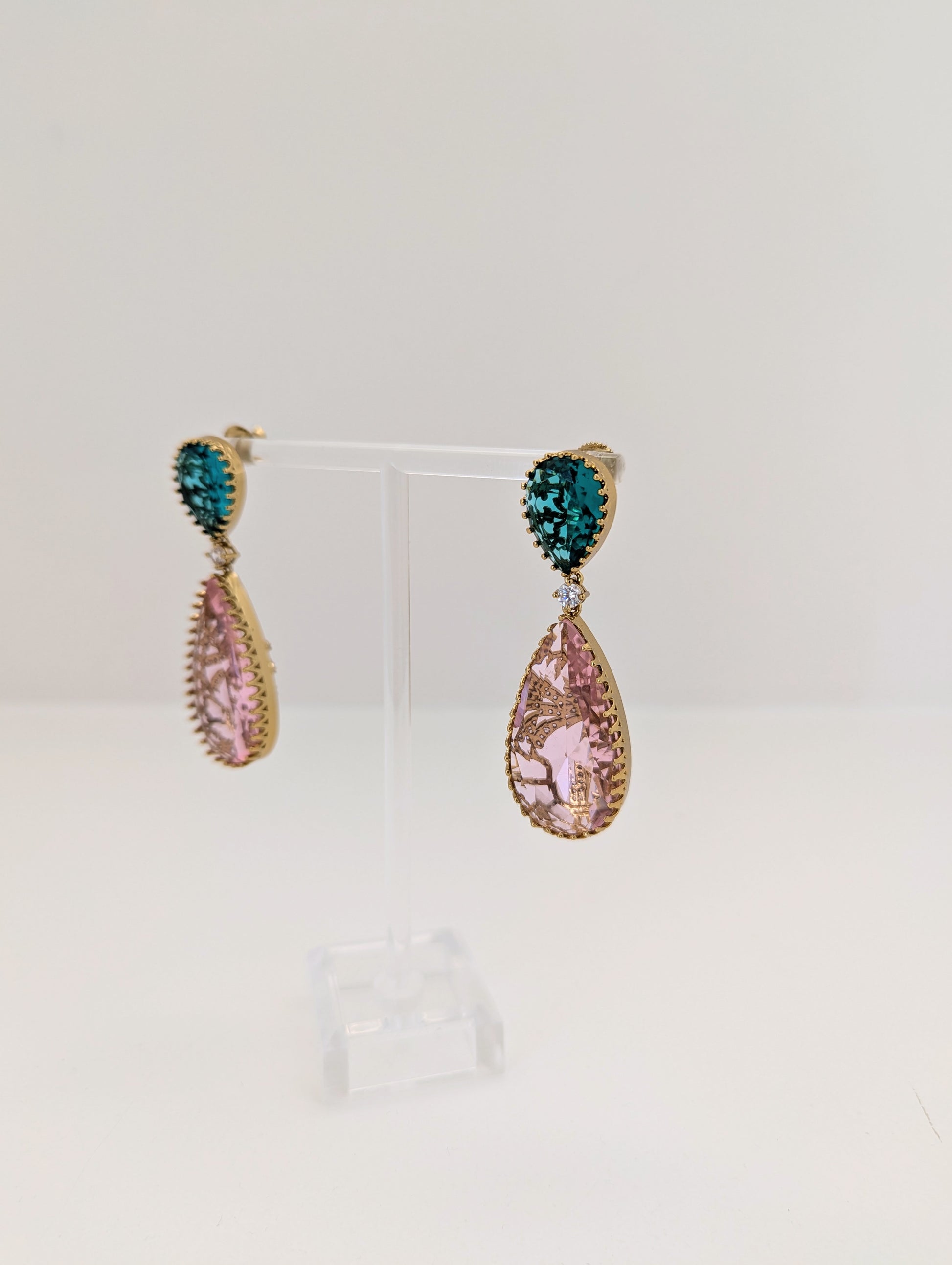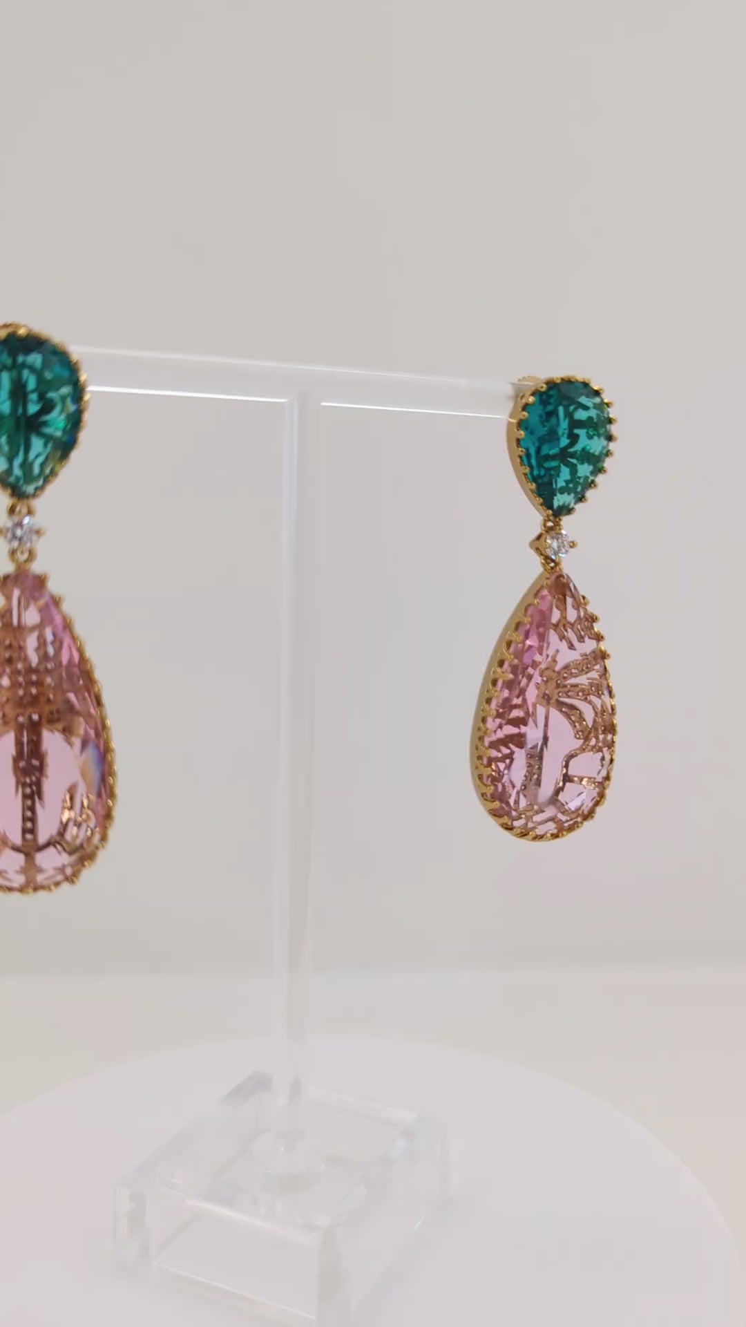 These exquisite drop earrings feature a captivating combination of deep emerald green and soft blush pink stones, both cut in elegant teardrop shapes. The top emerald green stones are intricately faceted and bordered with delicate gold detailing, while the larger pink teardrop crystals below showcase ornate gold inlay work that adds depth and texture. A single clear stone links the two drops, adding a touch of brilliance and refinement. These earrings beautifully balance bold color with delicate craftsmanship, making them a statement piece for elegant occasions.