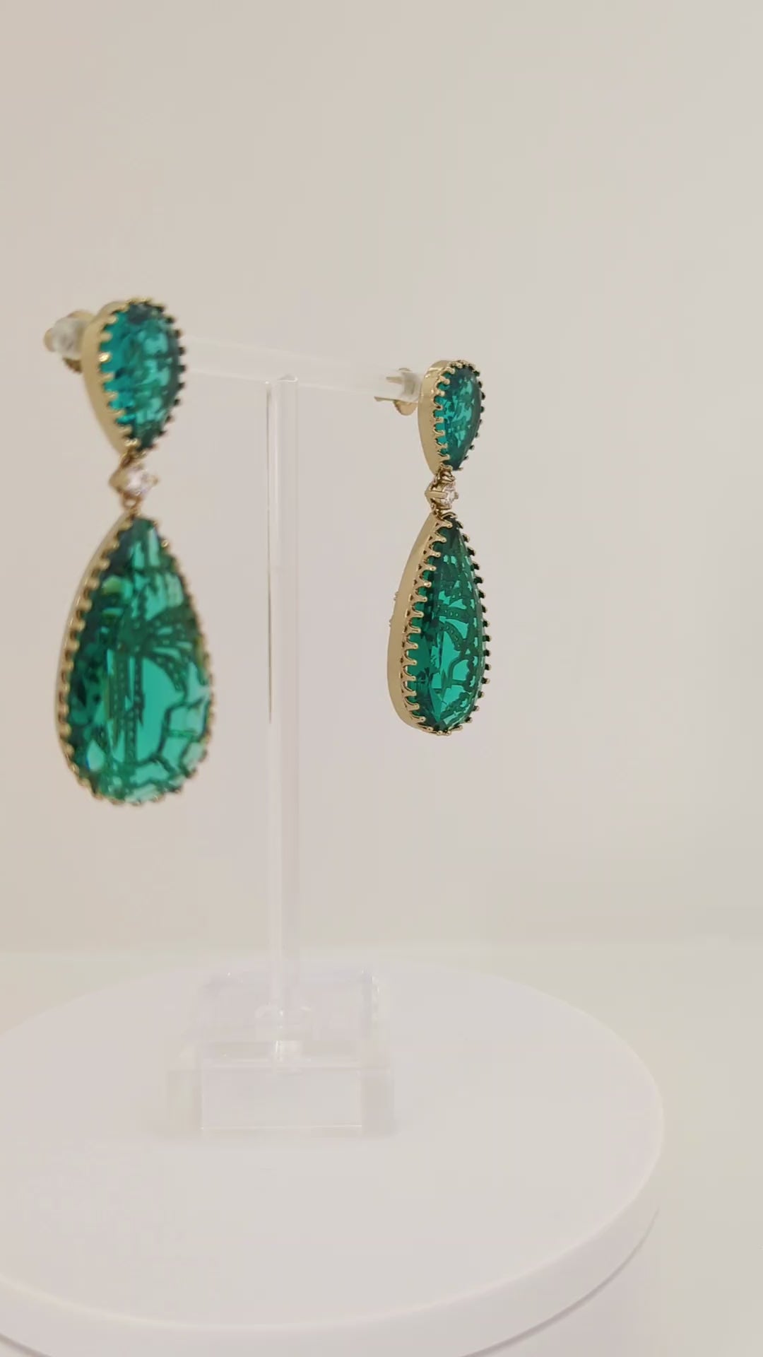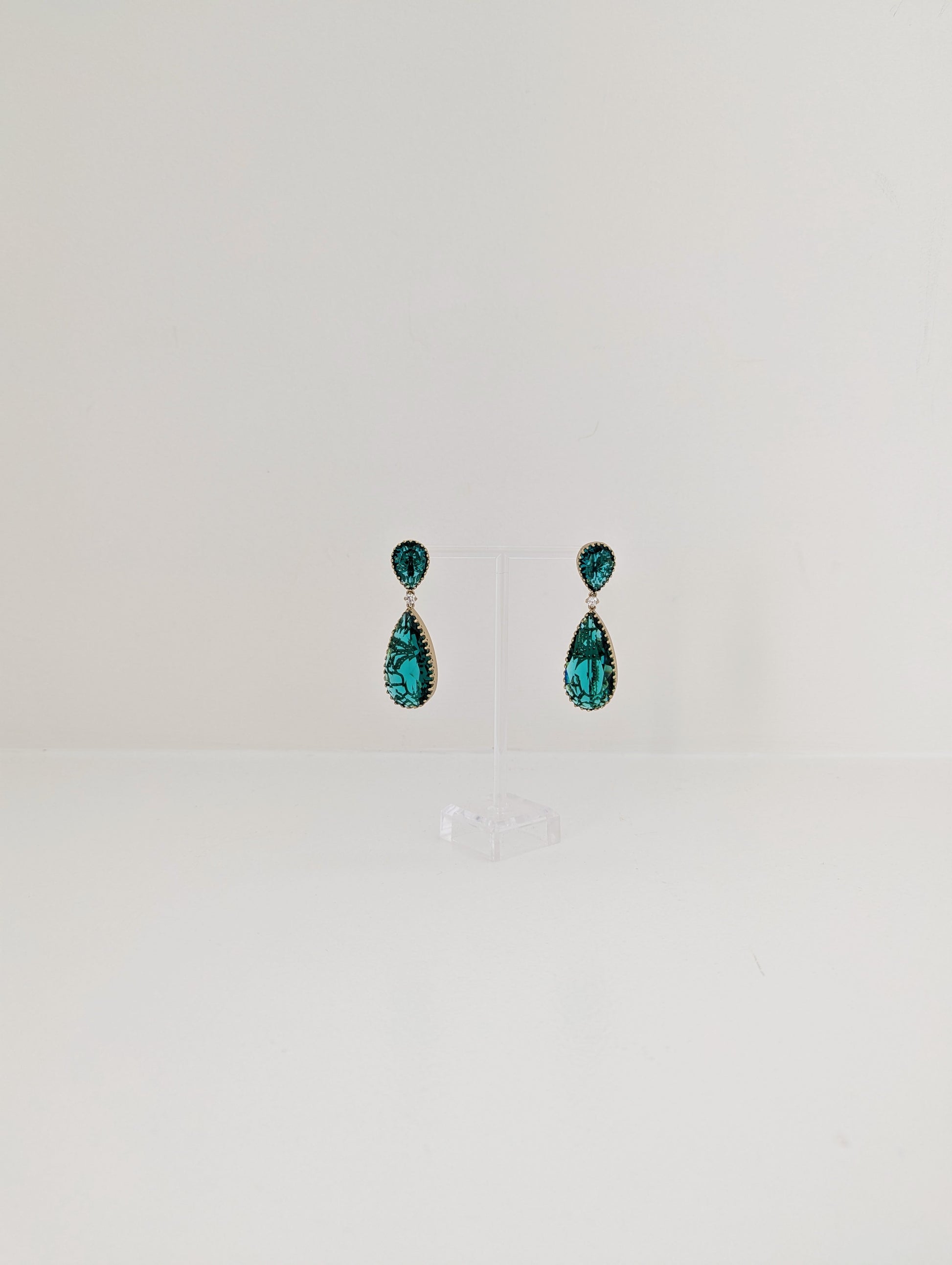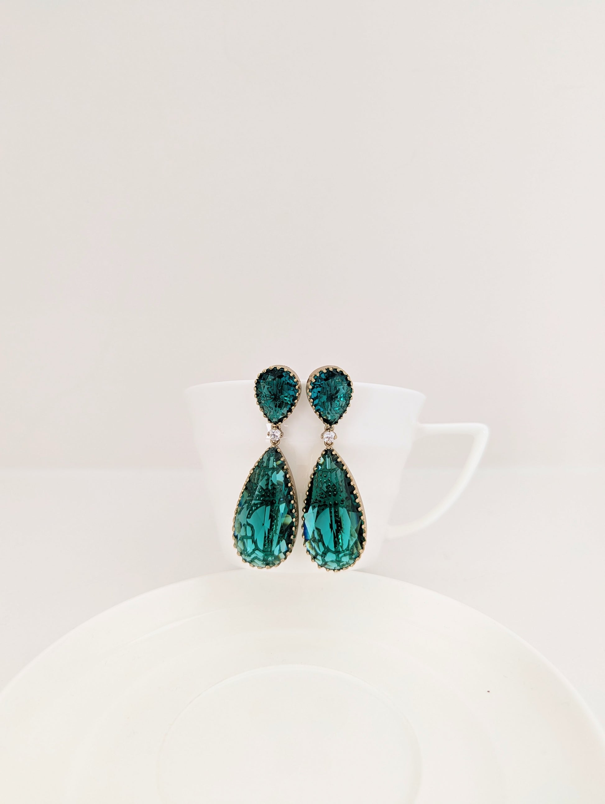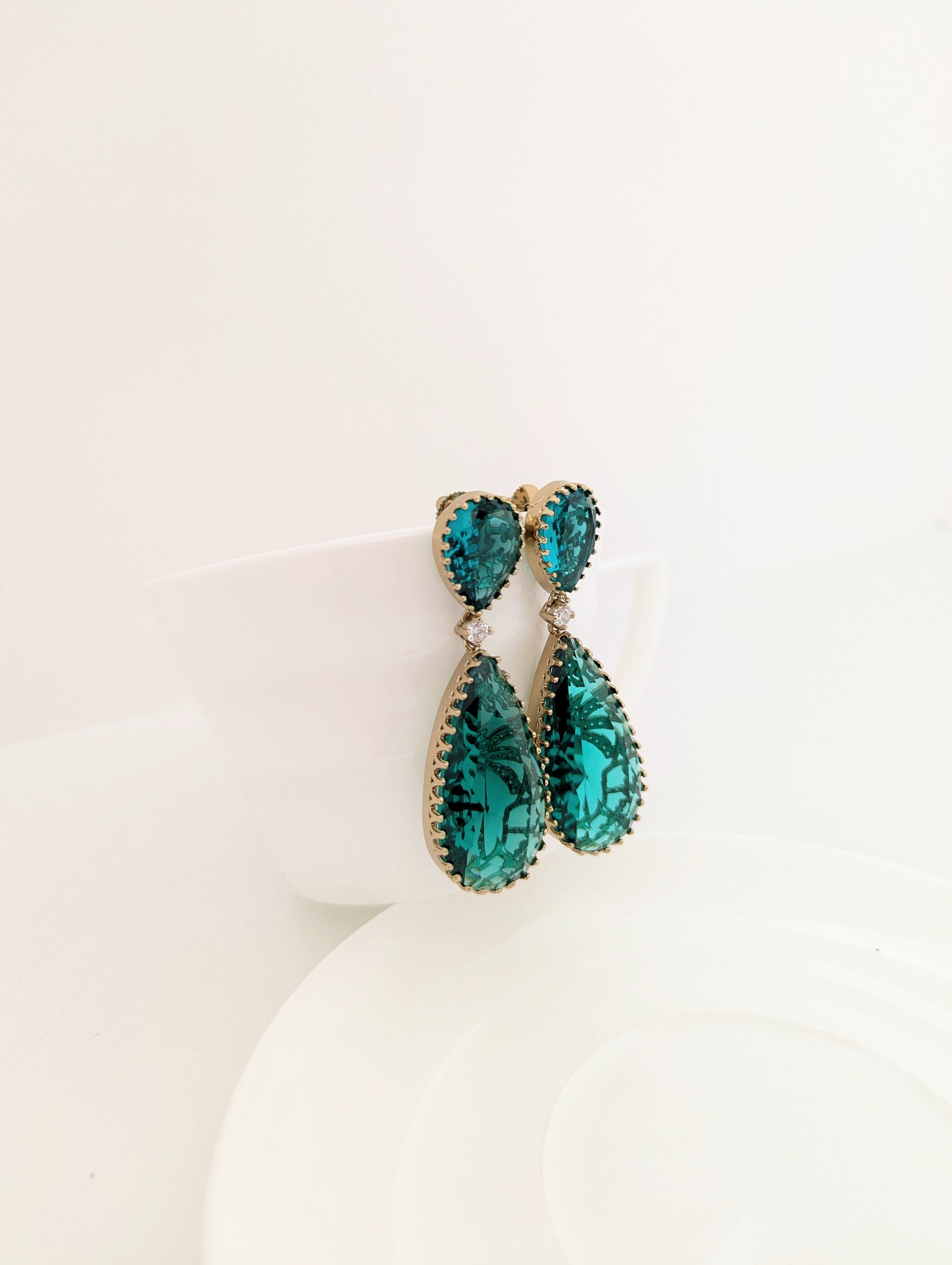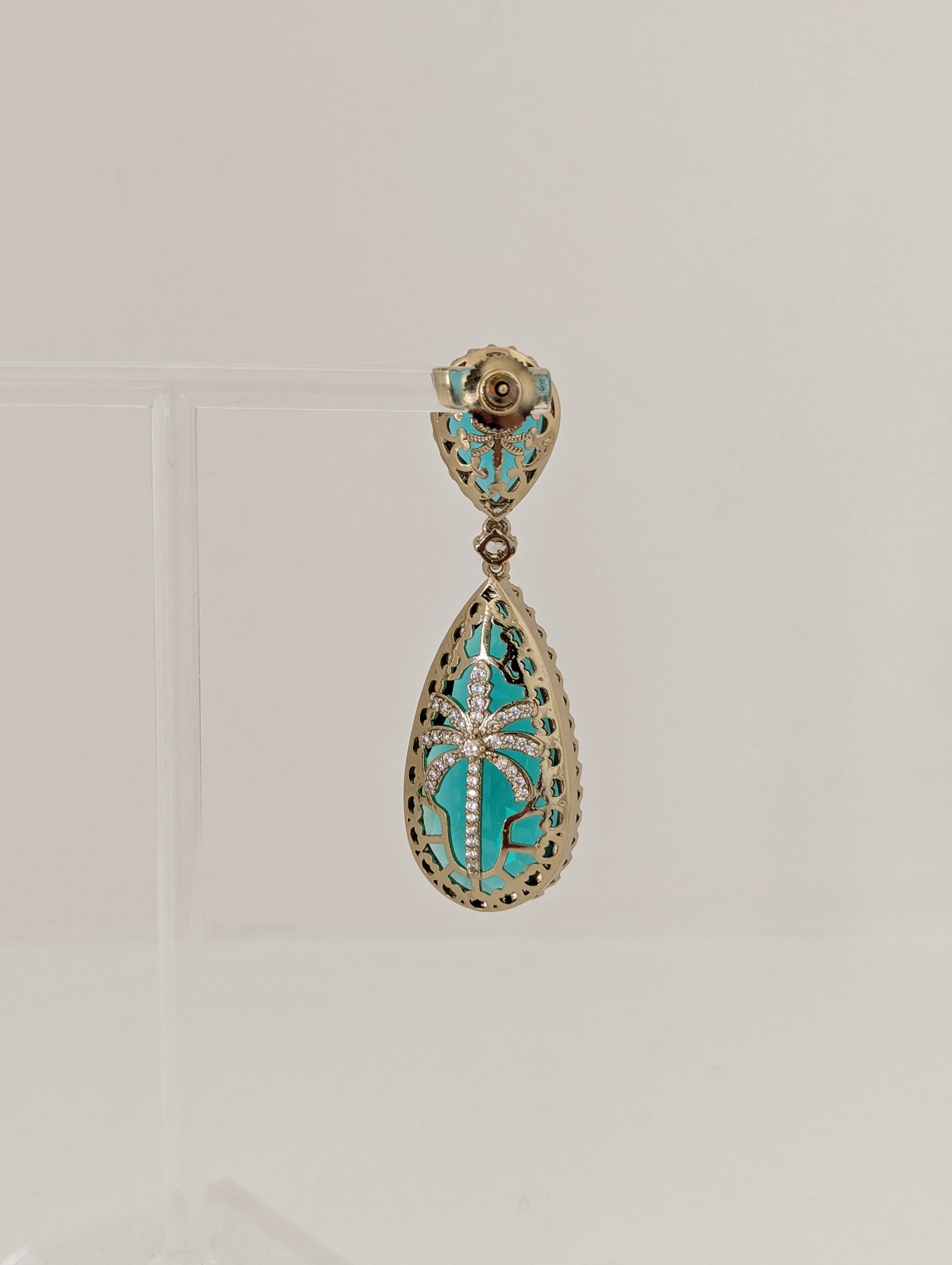 These exquisite drop earrings feature a captivating Turquoise /Sea Green colour, cut in elegant teardrop shapes. The top stones are intricately faceted and bordered with delicate gold detailing, while the larger Turquoise/Sea Green teardrop crystals below showcase ornate gold inlay work that adds depth and texture. A single clear stone links the two drops, adding a touch of brilliance and refinement. These earrings beautifully balance bold color with delicate craftsmanship, making them a statement piece for elegant occasions.