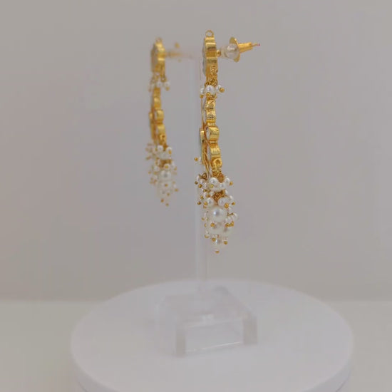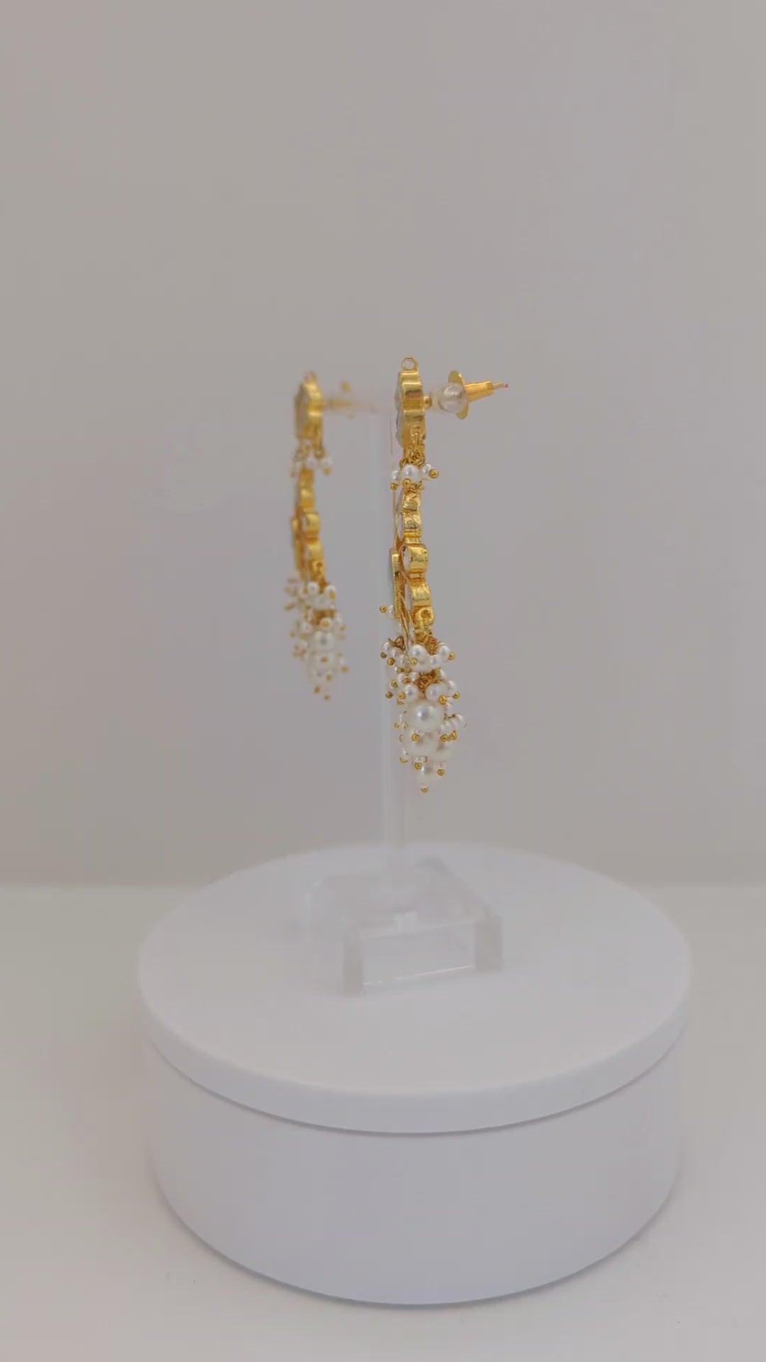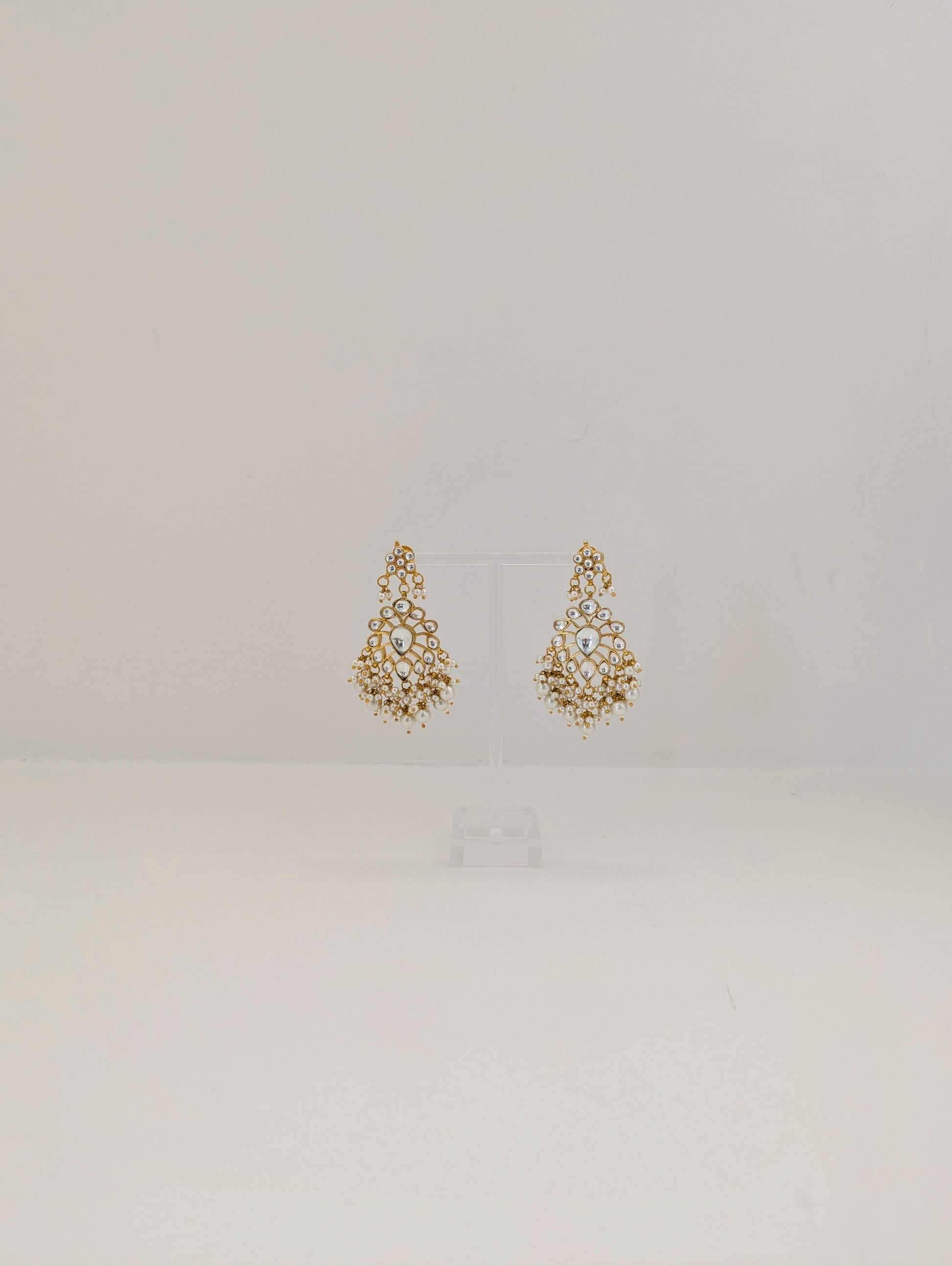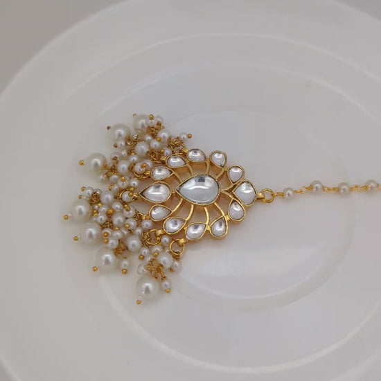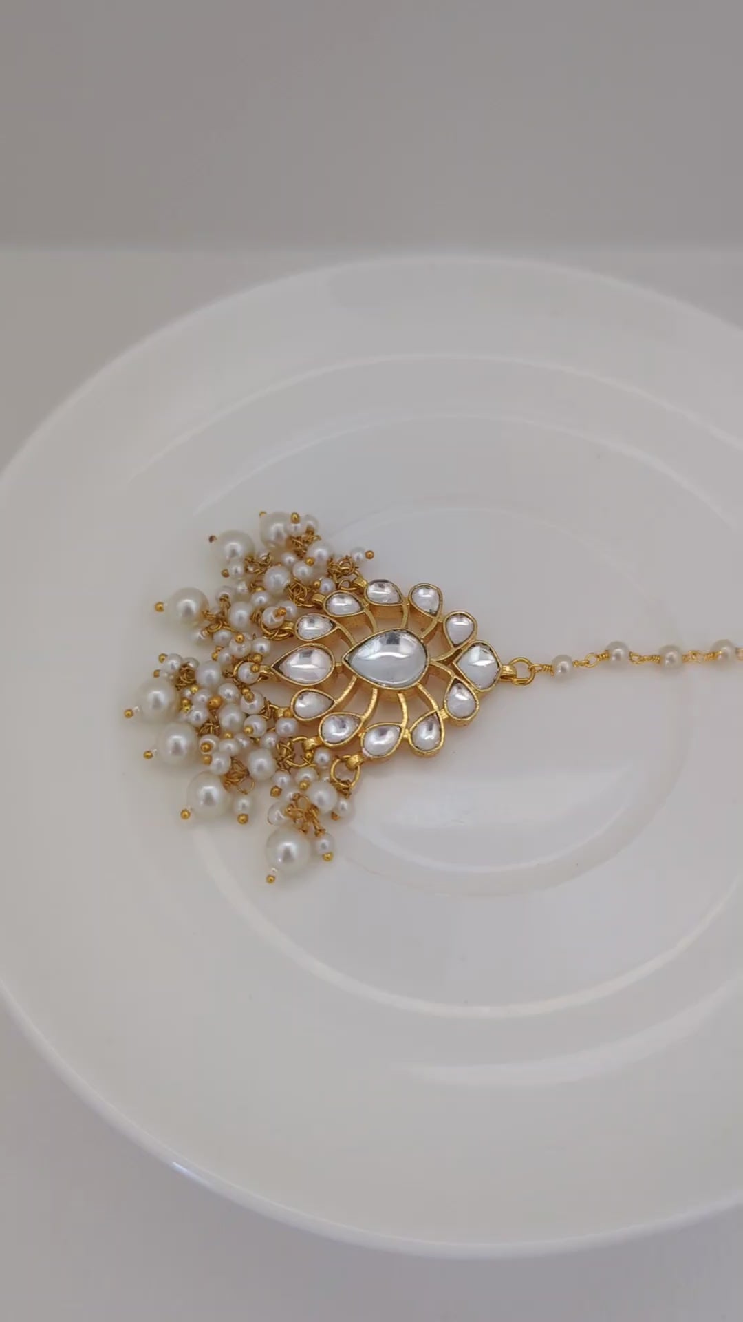 This set includes a pair of ornate gold-toned chandbali earrings paired with a matching maang teeka. Adorned with delicate kundan stones and surrounded by clusters of luminous white pearls, the set radiates traditional elegance. The intricate craftsmanship and regal detailing make it an ideal choice for weddings, festive occasions, or cultural celebrations.