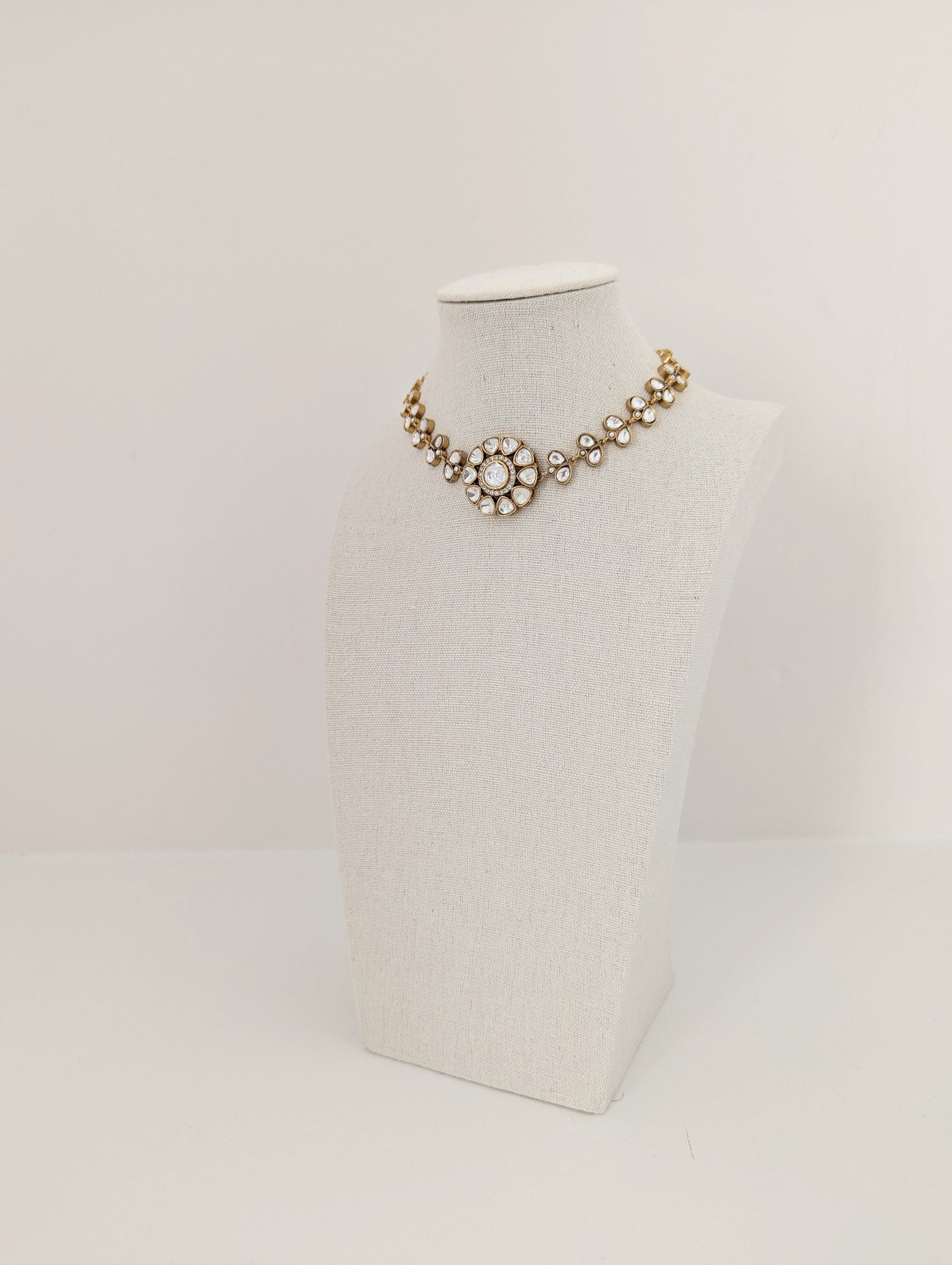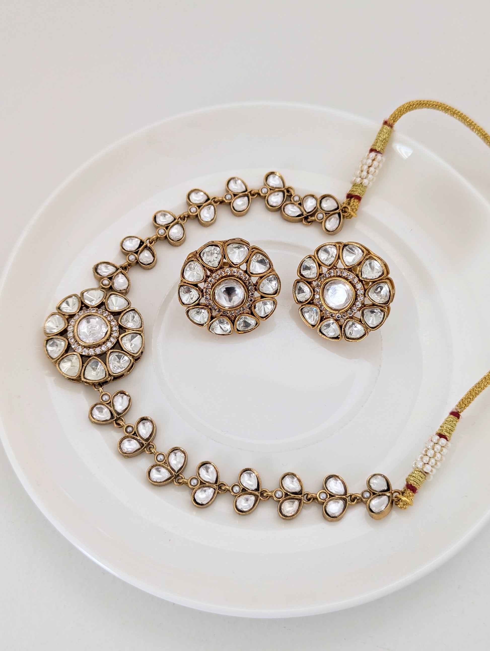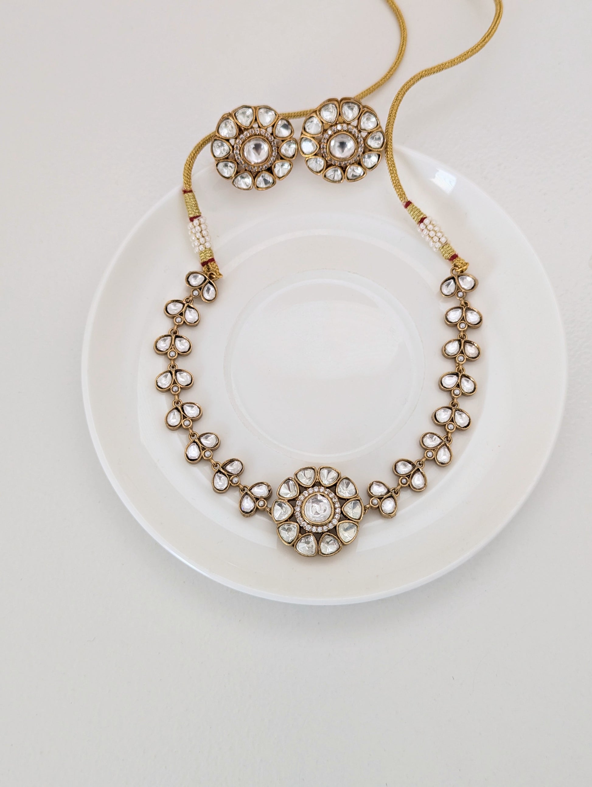 This graceful jewelry set includes a matching necklace and stud earrings, both showcasing a timeless floral motif. Each piece features a soothing clear central stone encircled by clear, teardrop-shaped crystals set in a gold-toned base. The refined symmetry and delicate sparkle make this set perfect for weddings, festive occasions, or adding a touch of elegance to any ensemble.