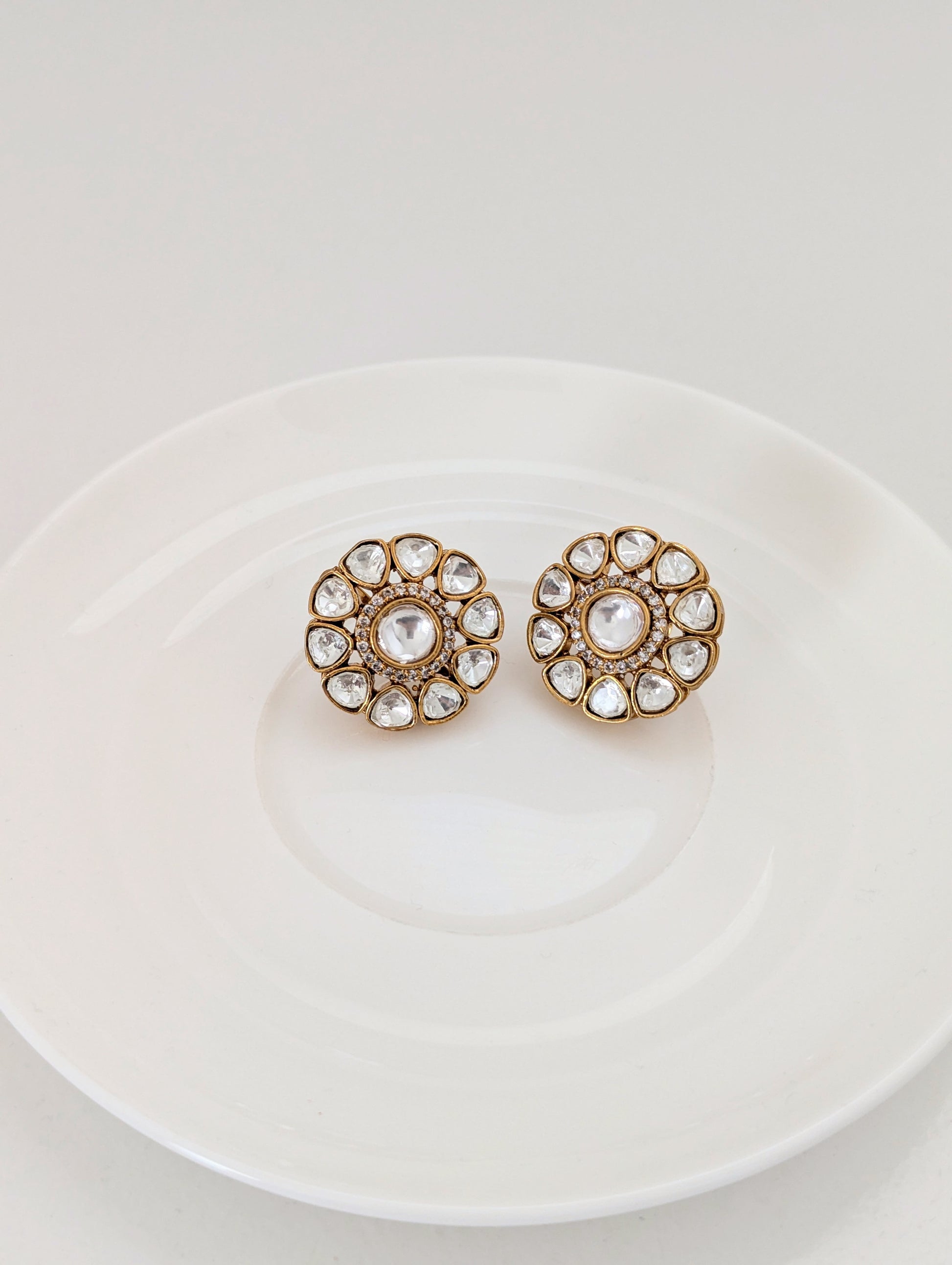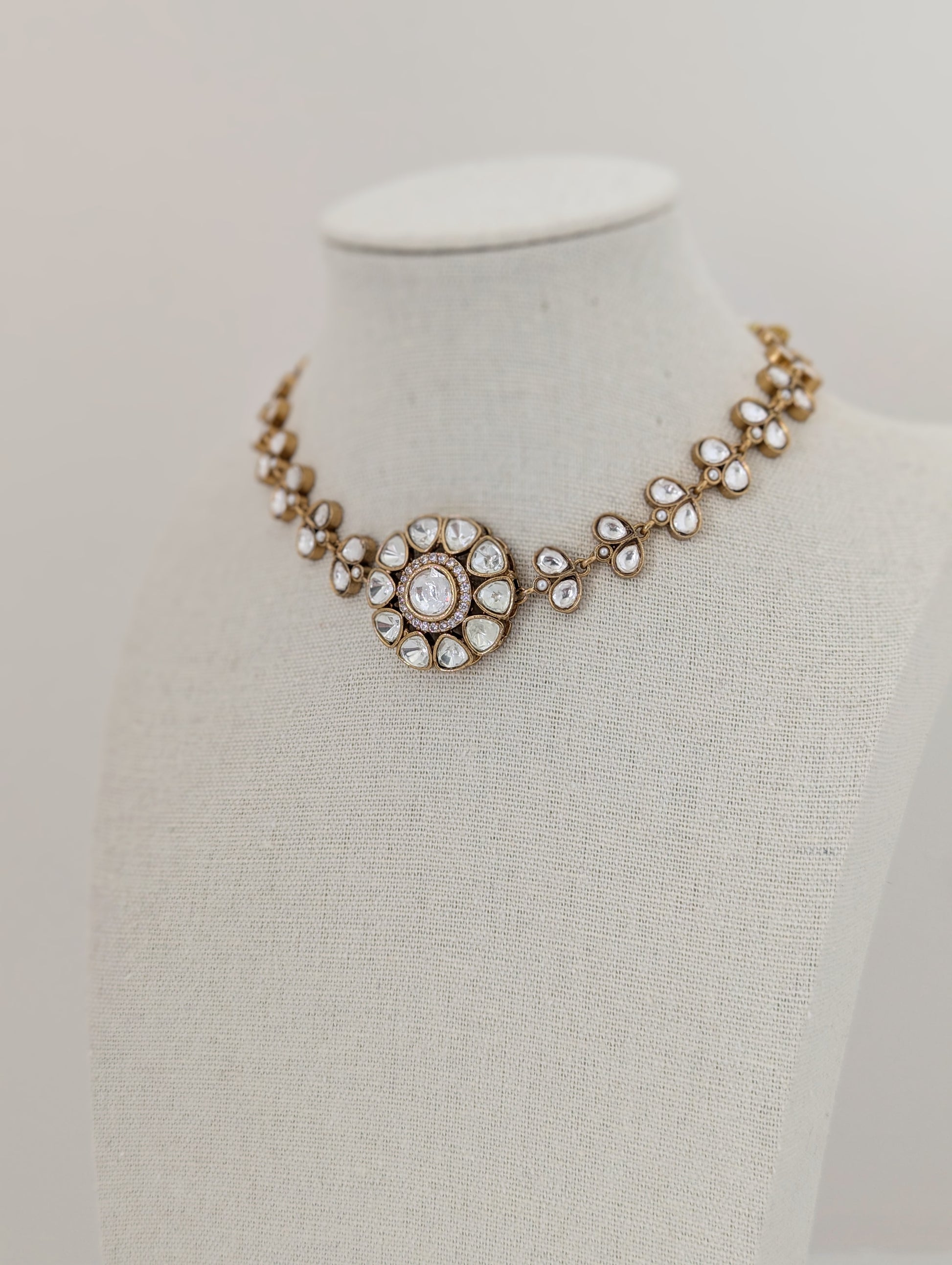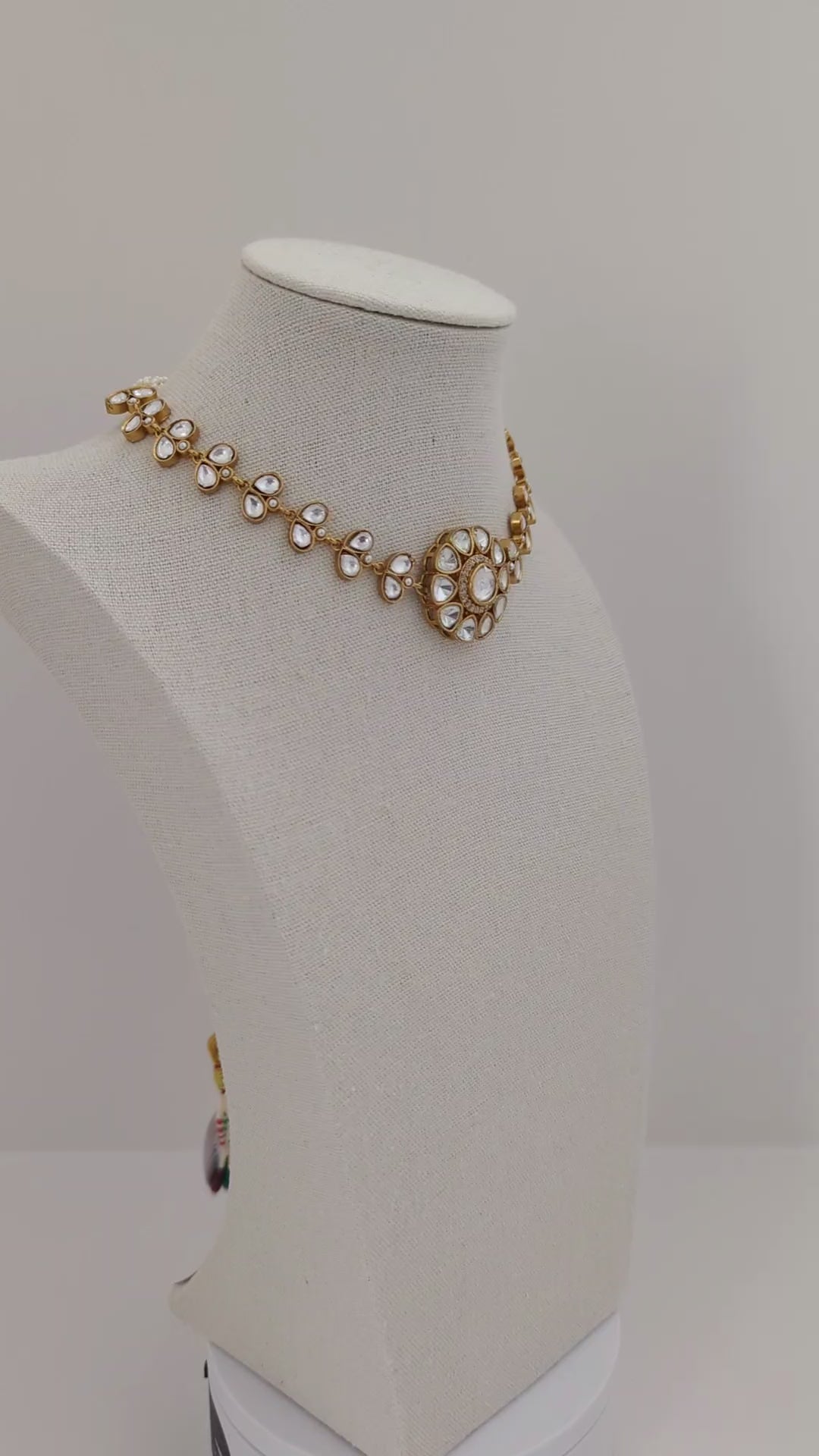 This graceful jewelry set includes a matching necklace and stud earrings, both showcasing a timeless floral motif. Each piece features a soothing clear central stone encircled by clear, teardrop-shaped crystals set in a gold-toned base. The refined symmetry and delicate sparkle make this set perfect for weddings, festive occasions, or adding a touch of elegance to any ensemble.