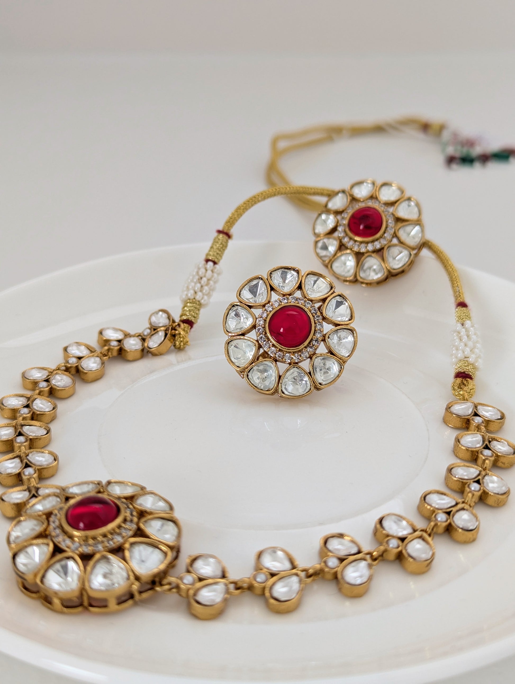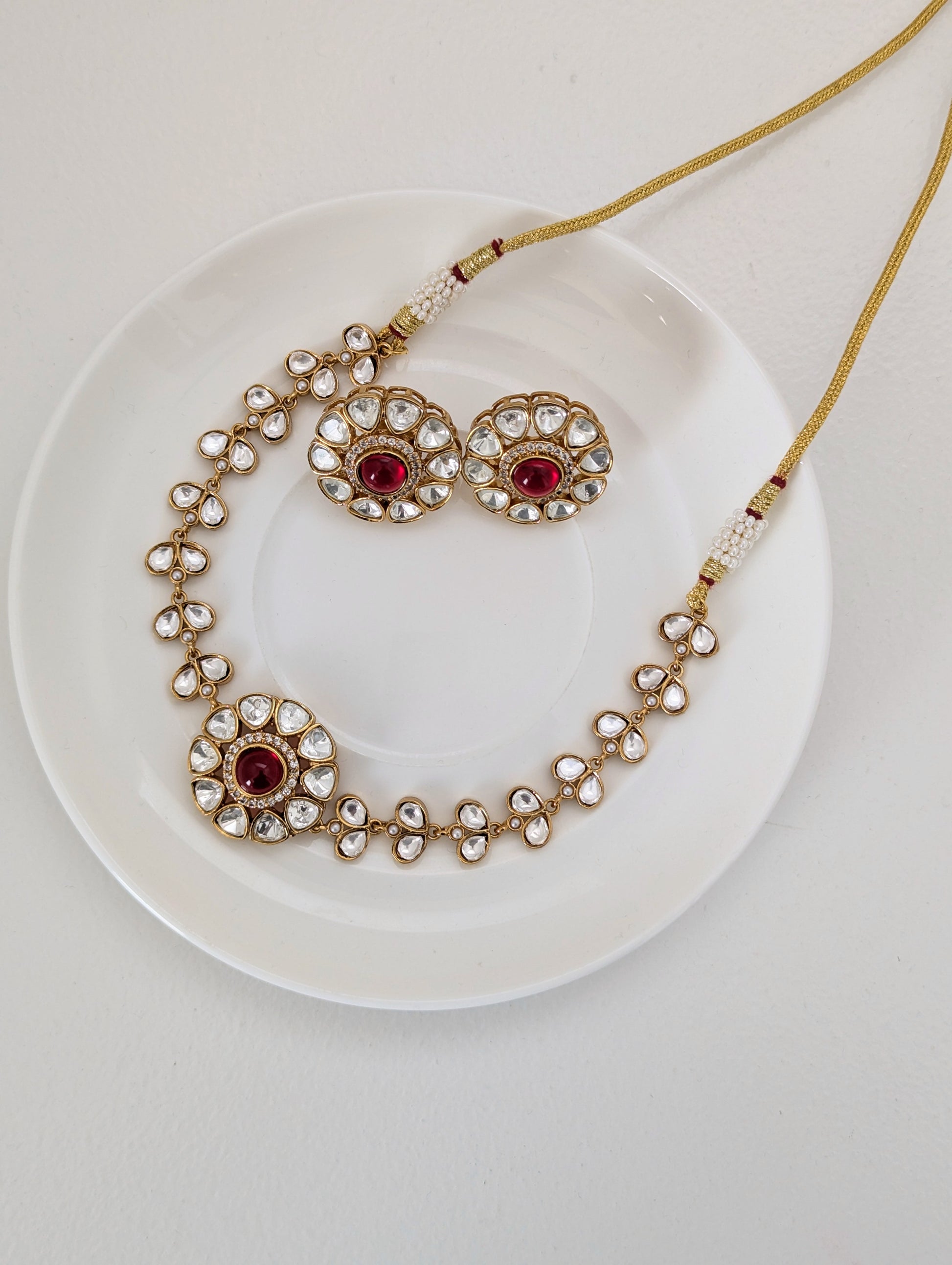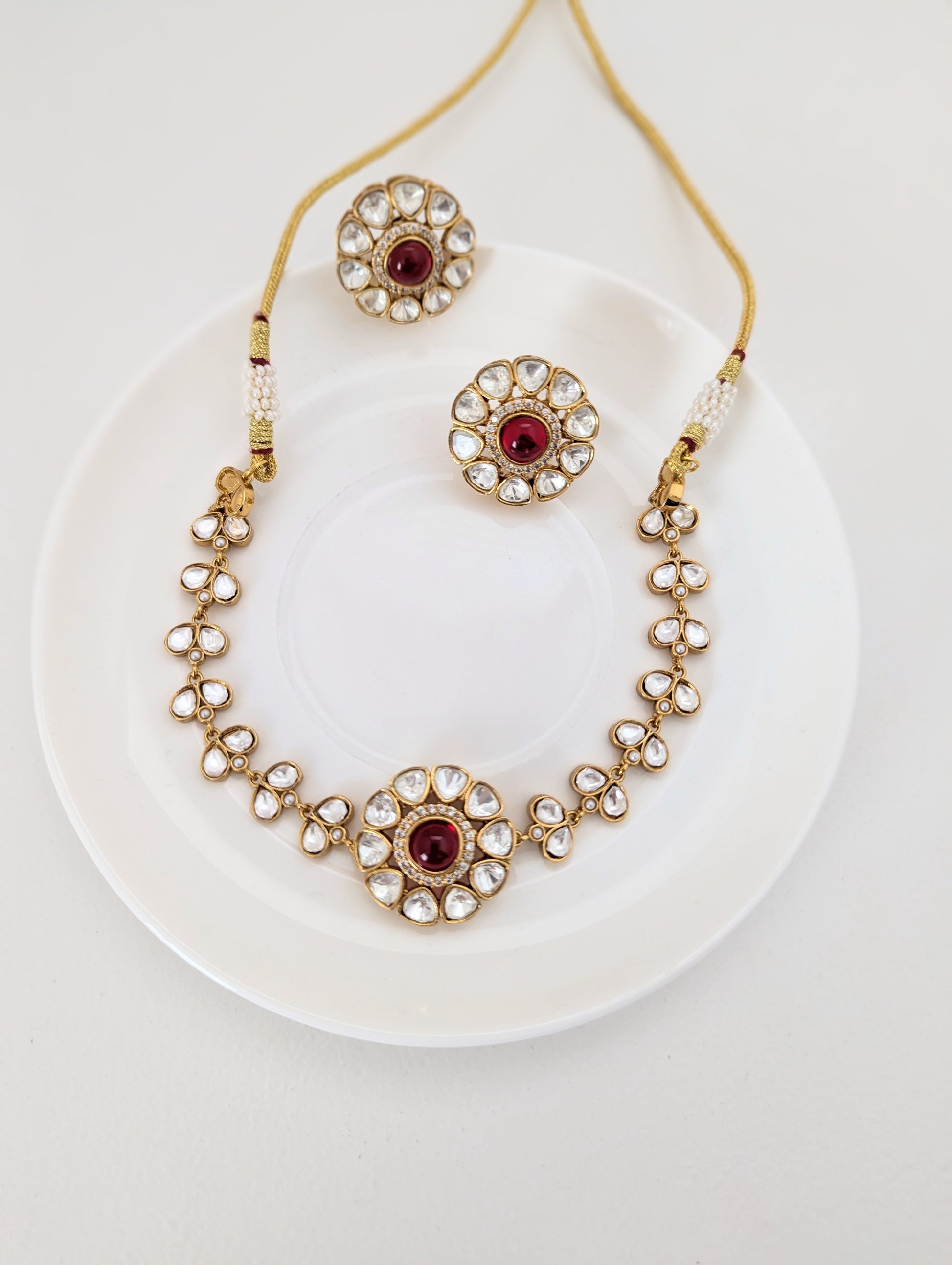 This graceful jewelry set includes a matching necklace and stud earrings, both showcasing a timeless floral motif. Each piece features a soothing red central stone encircled by clear, teardrop-shaped crystals set in a gold-toned base. The refined symmetry and delicate sparkle make this set perfect for weddings, festive occasions, or adding a touch of elegance to any ensemble.
