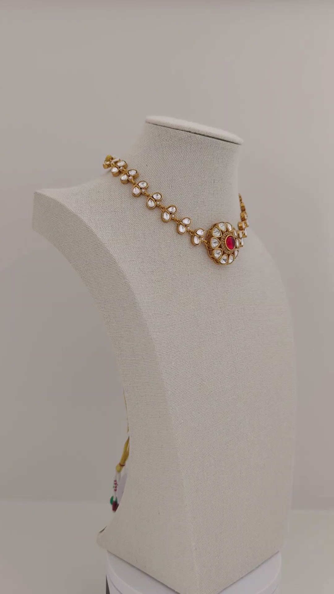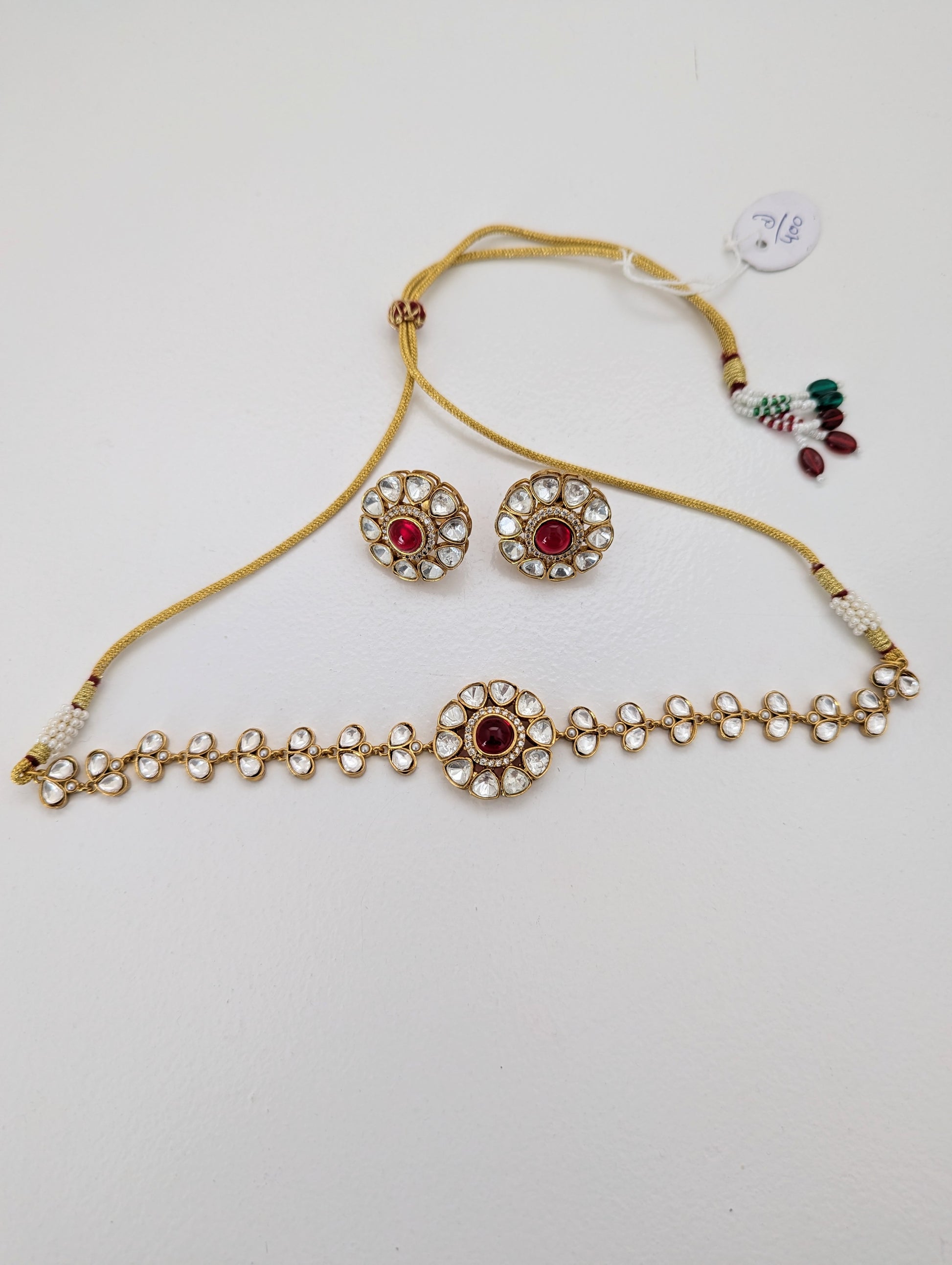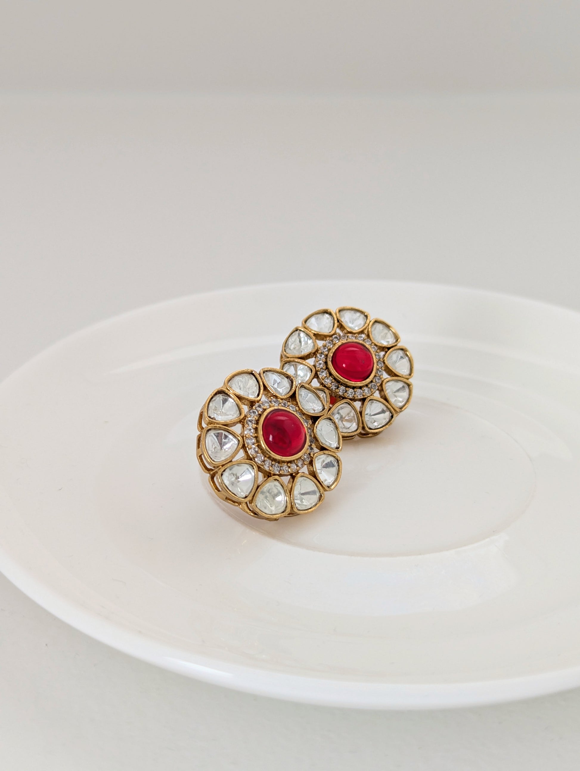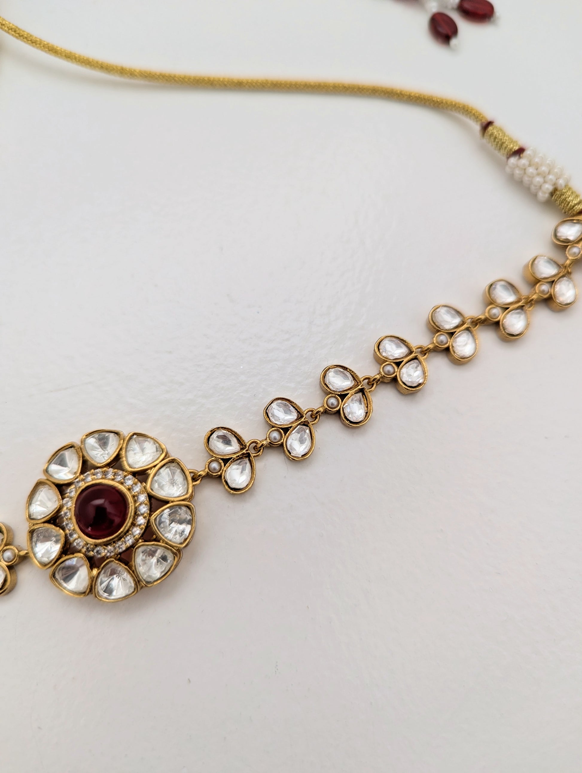 This graceful jewelry set includes a matching necklace and stud earrings, both showcasing a timeless floral motif. Each piece features a soothing red central stone encircled by clear, teardrop-shaped crystals set in a gold-toned base. The refined symmetry and delicate sparkle make this set perfect for weddings, festive occasions, or adding a touch of elegance to any ensemble.