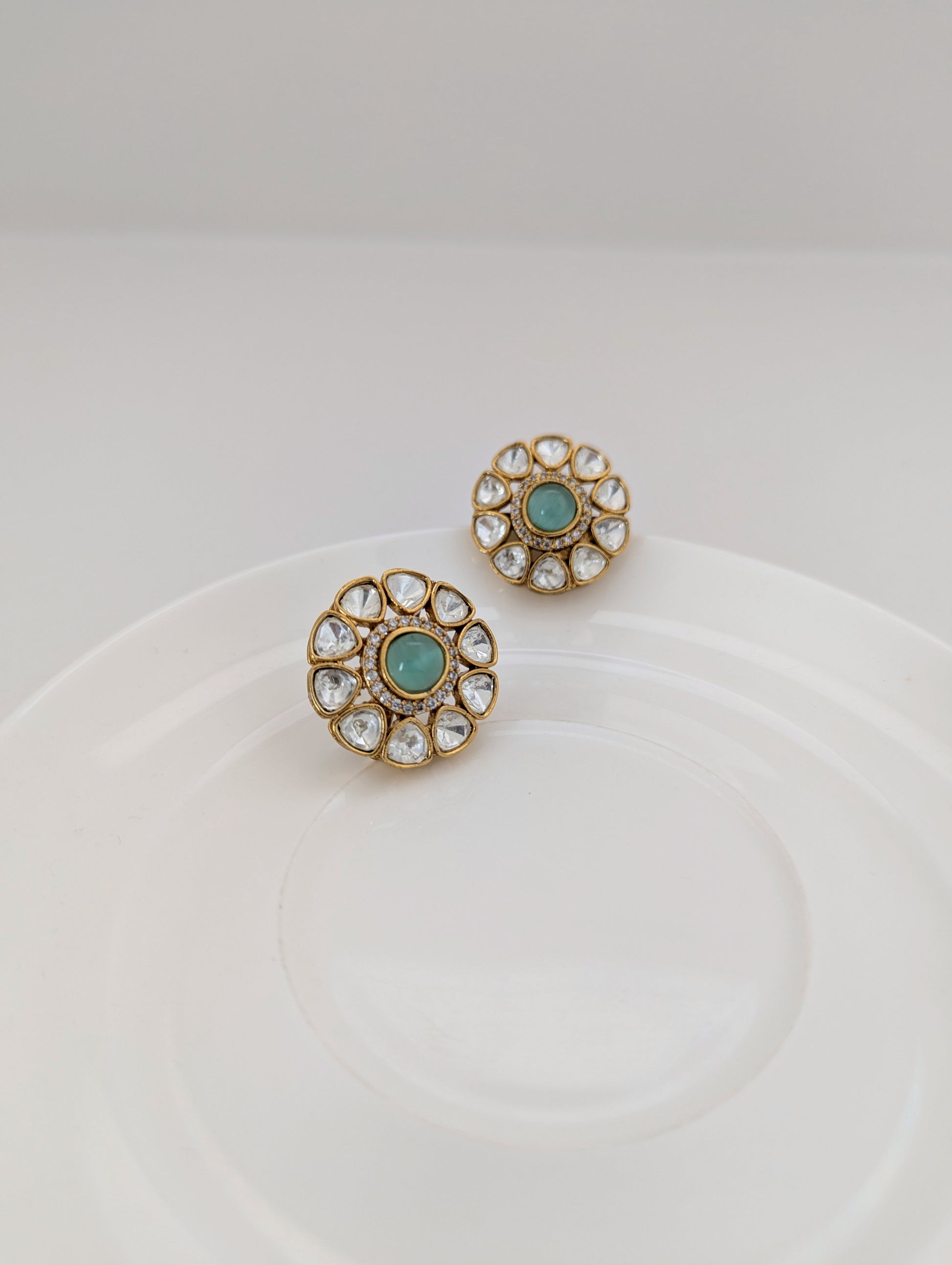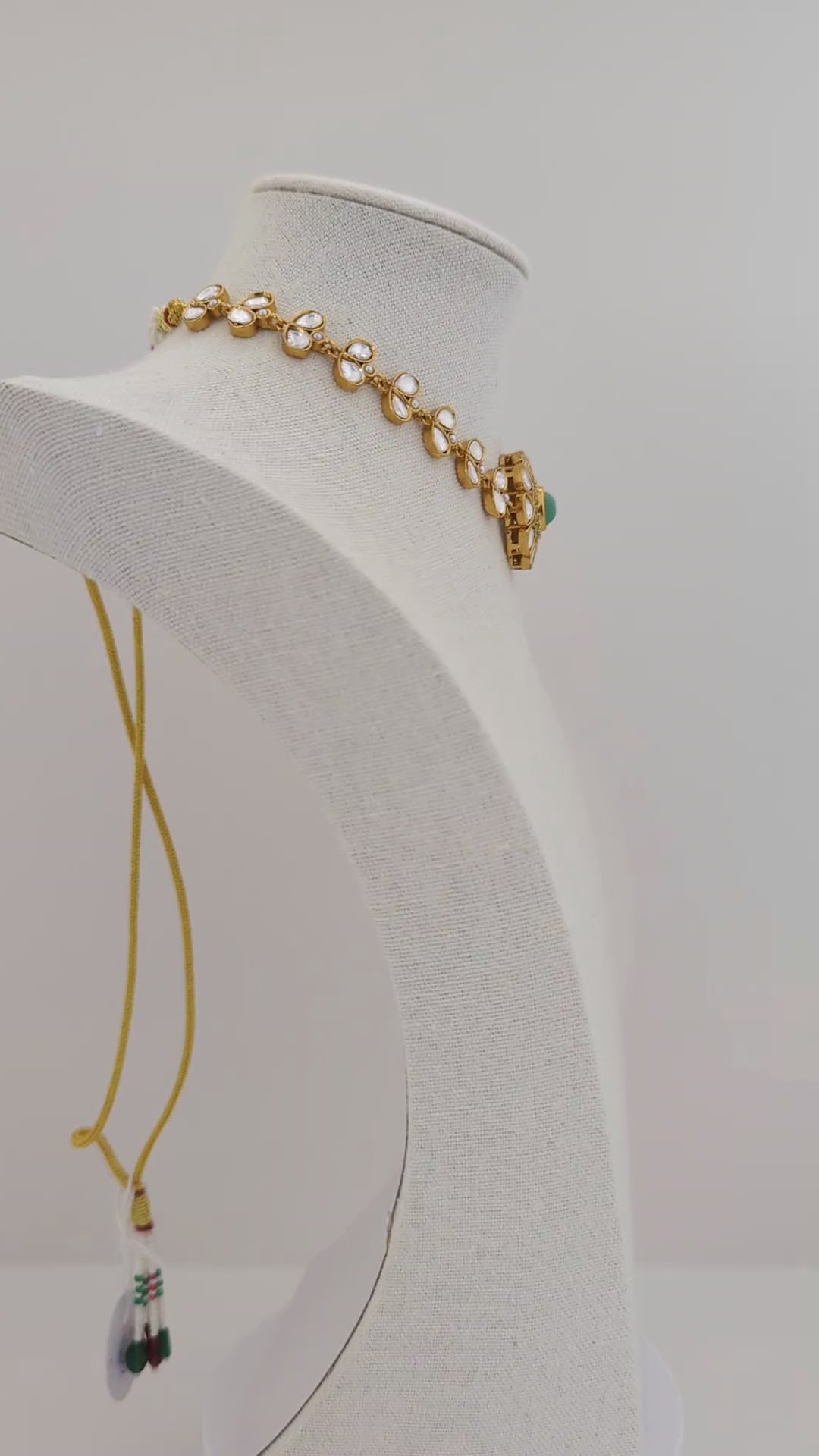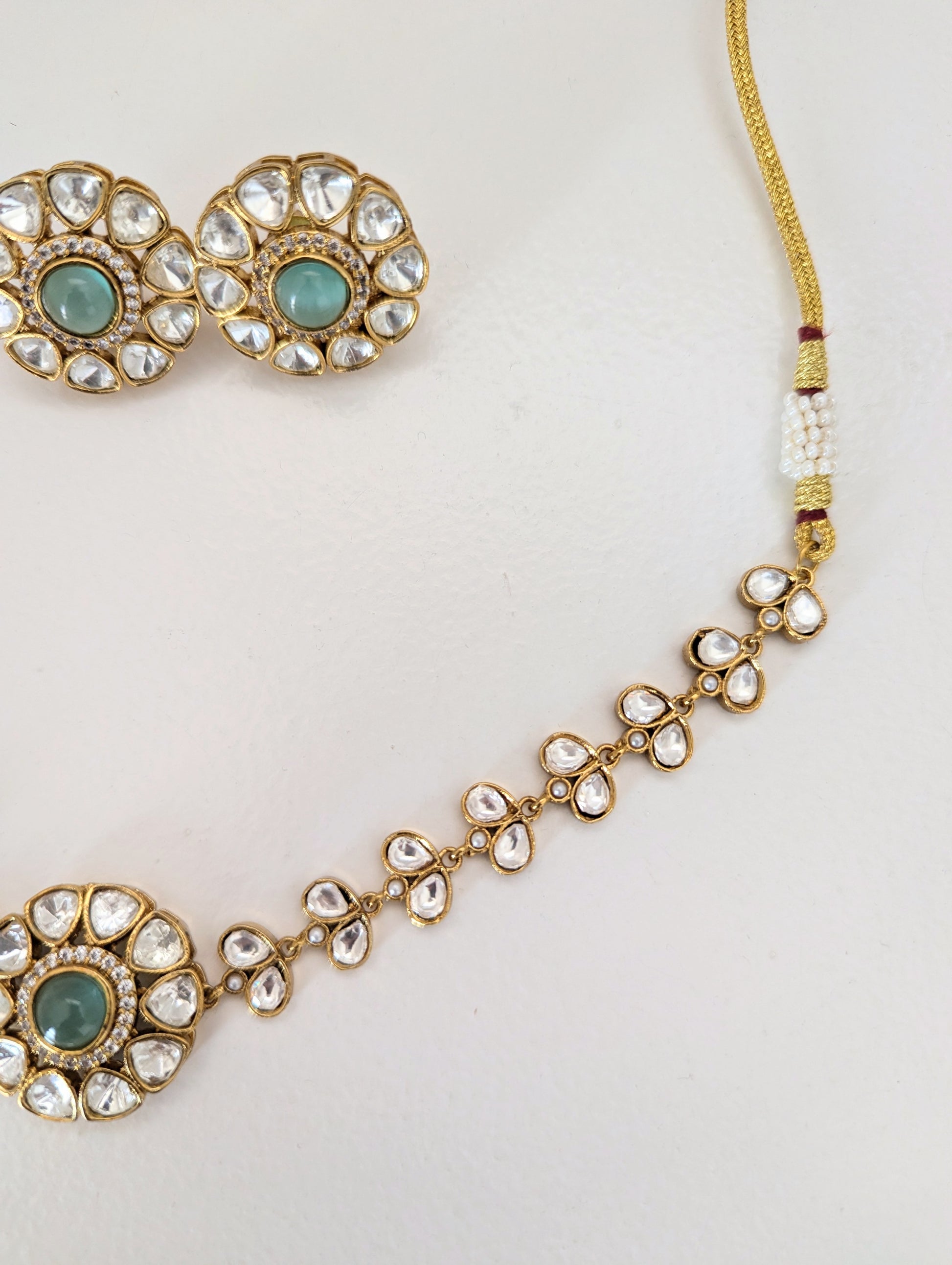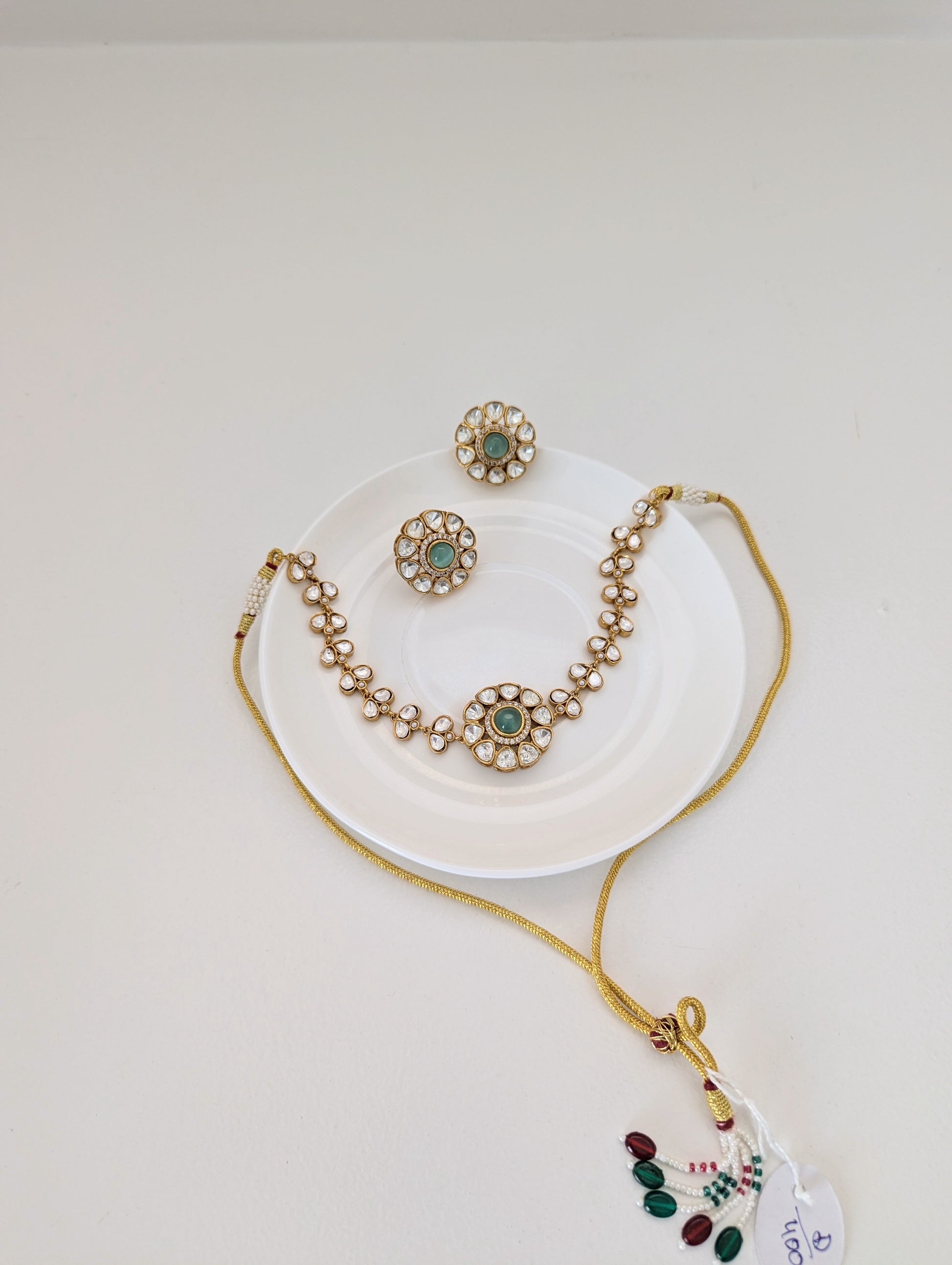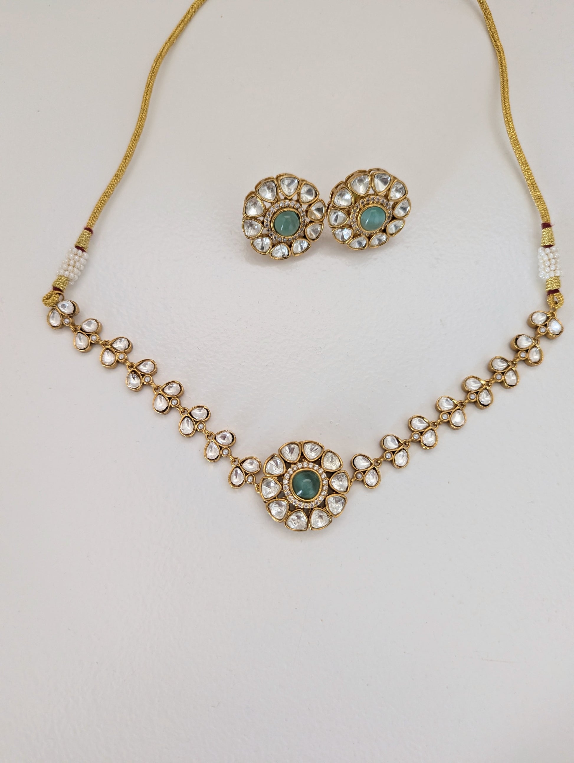 This graceful jewelry set includes a matching necklace and stud earrings, both showcasing a timeless floral motif. Each piece features a soothing green central stone encircled by clear, teardrop-shaped crystals set in a gold-toned base. The refined symmetry and delicate sparkle make this set perfect for weddings, festive occasions, or adding a touch of elegance to any ensemble.