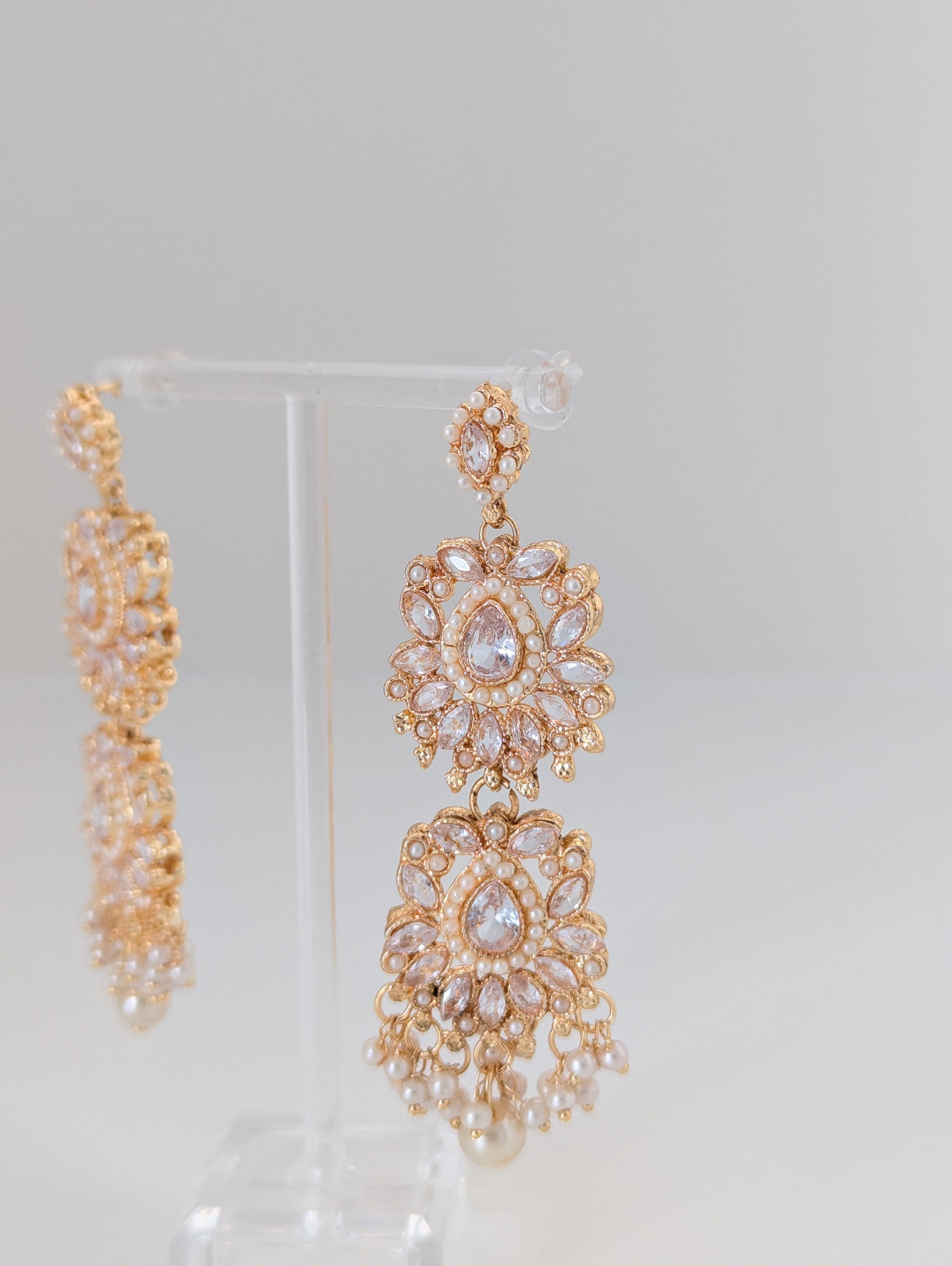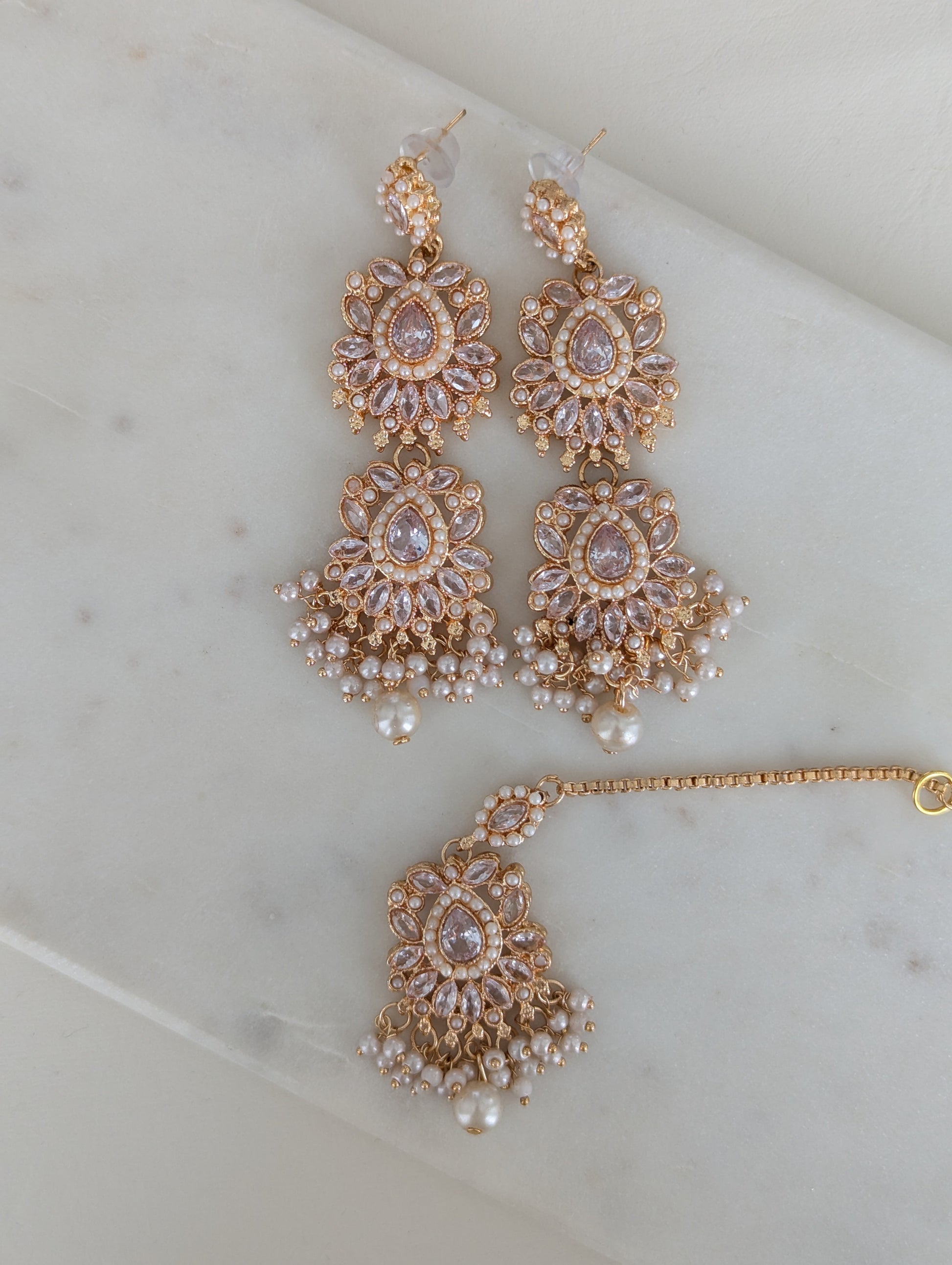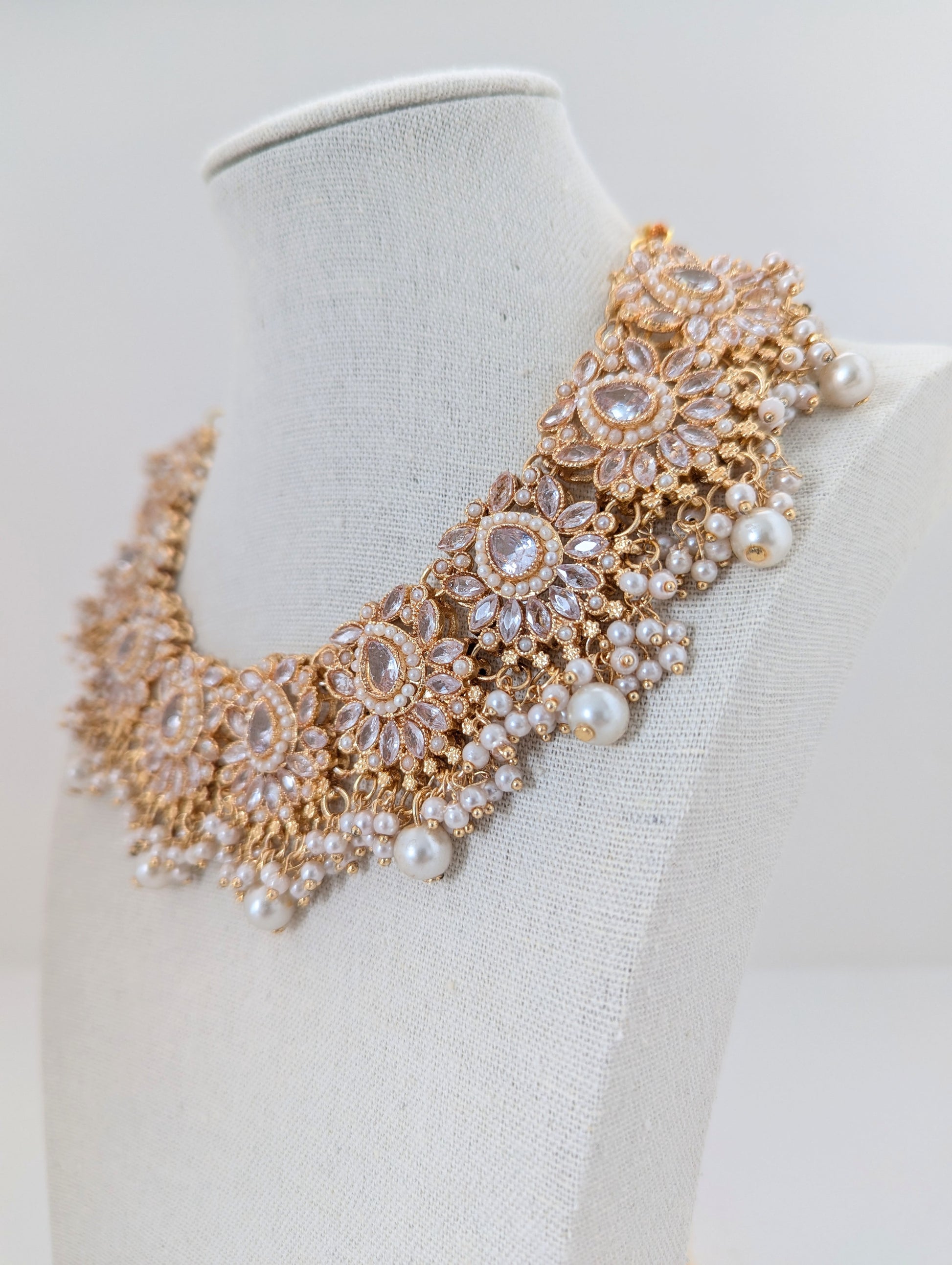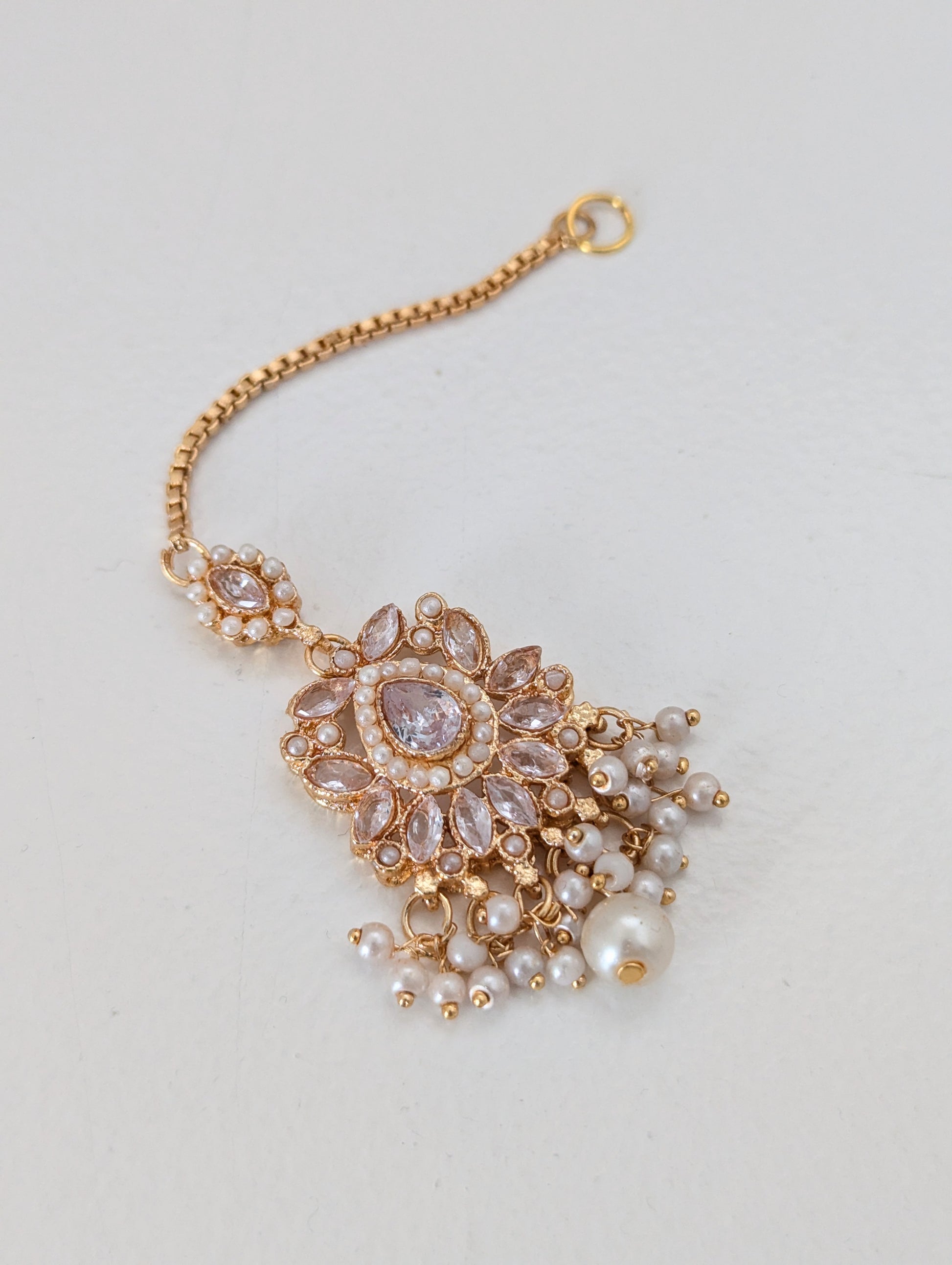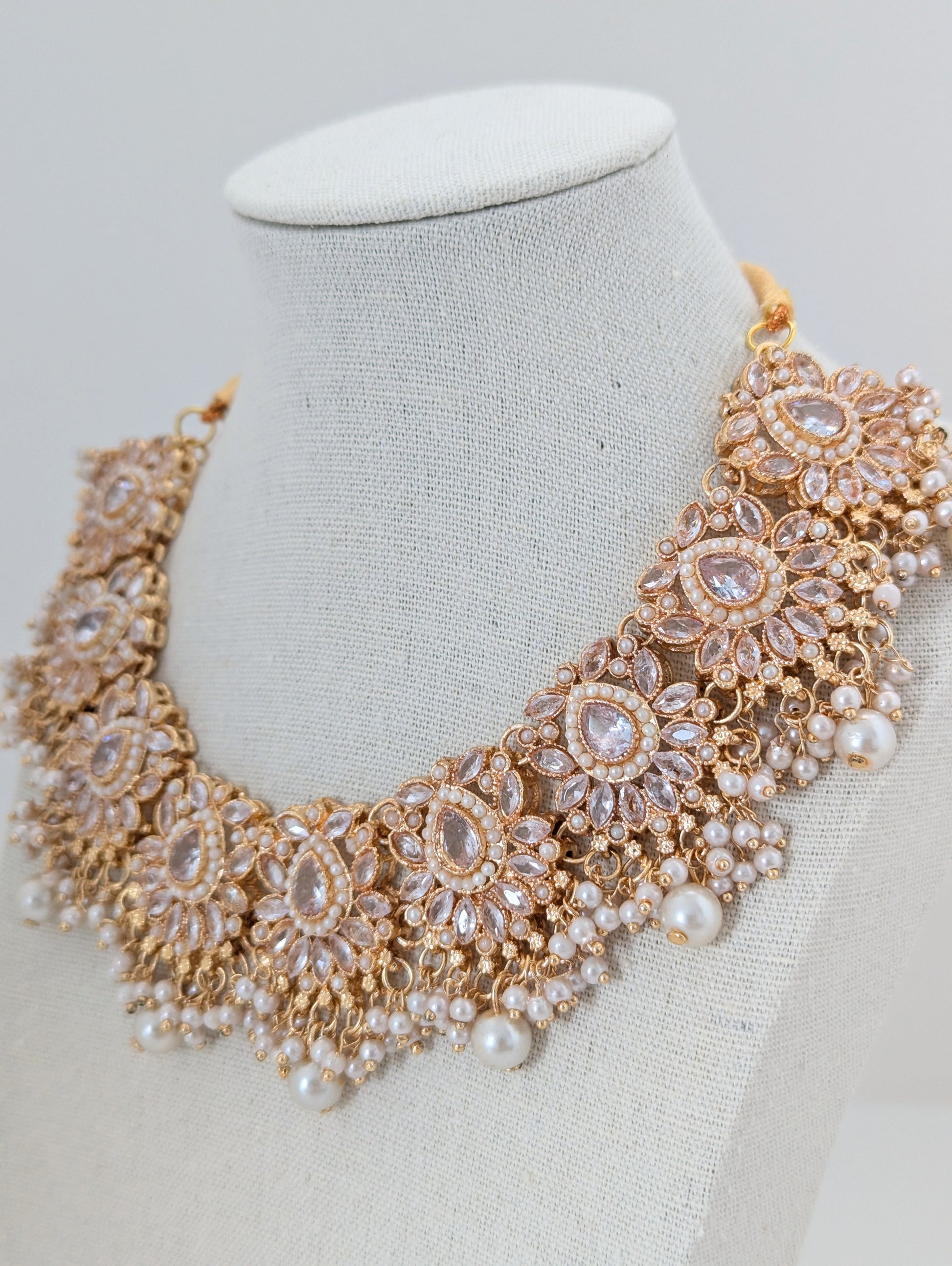 This luxurious jewelry set features a necklace, earrings, and a maang tikka, all crafted in a radiant gold tone. Each piece showcases intricate floral designs with sparkling crystal-like stones arranged in teardrop and marquise shapes, accentuated by delicate pearls. The intricate patterns are complemented by cascading pearl drops, adding a touch of opulence. Perfect for bridal wear or festive occasions, this set exudes timeless beauty and sophistication.
