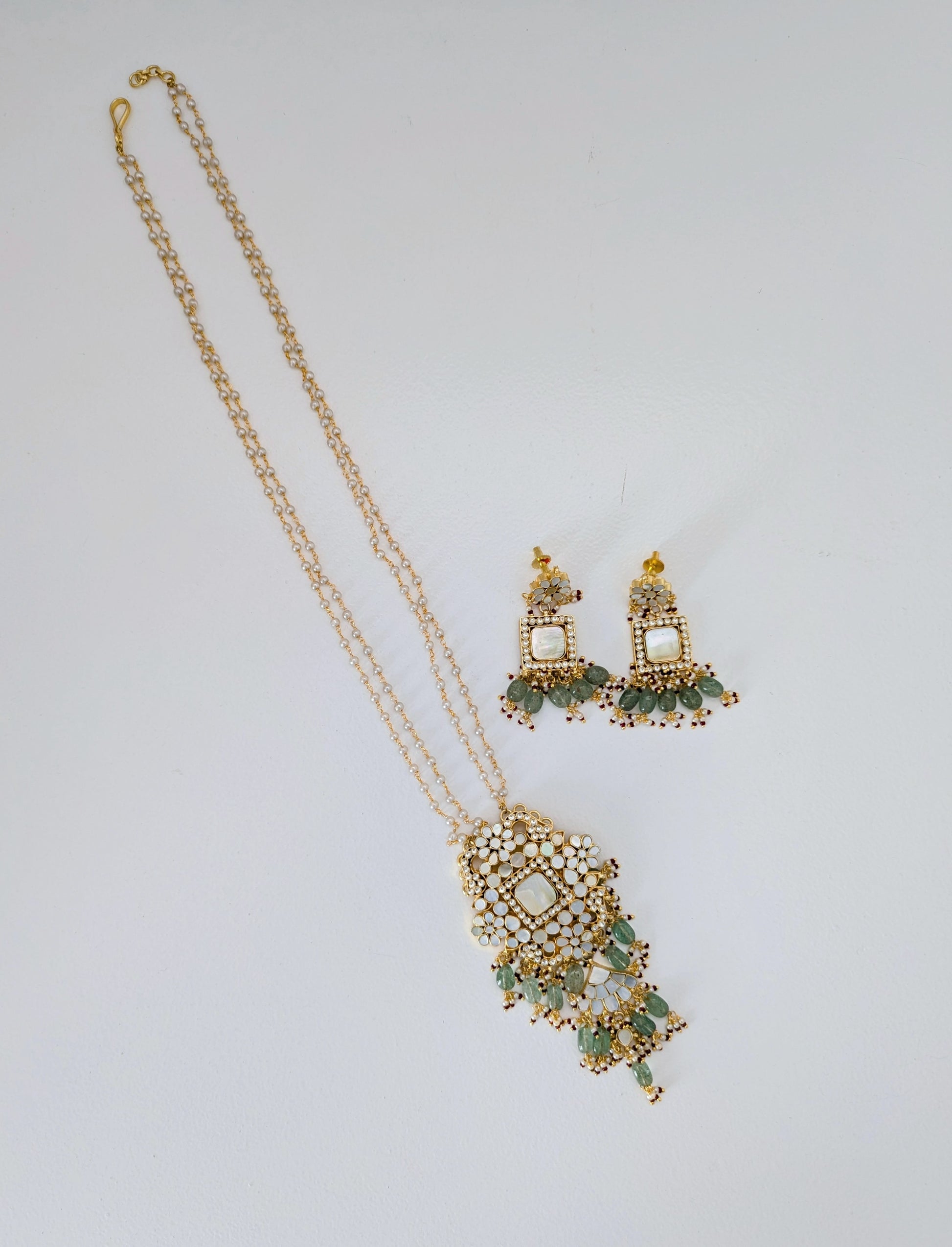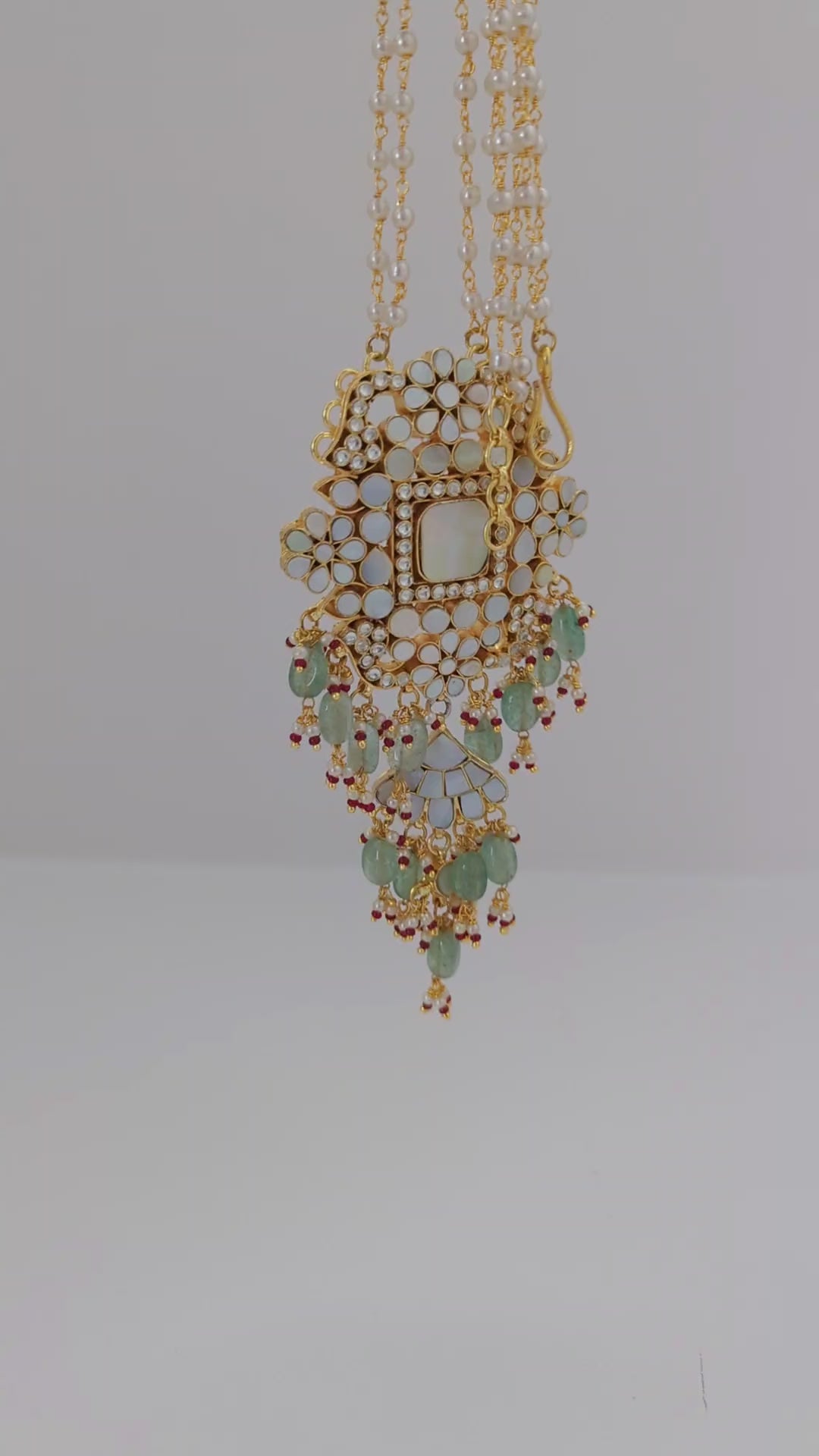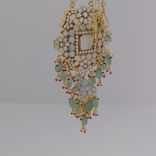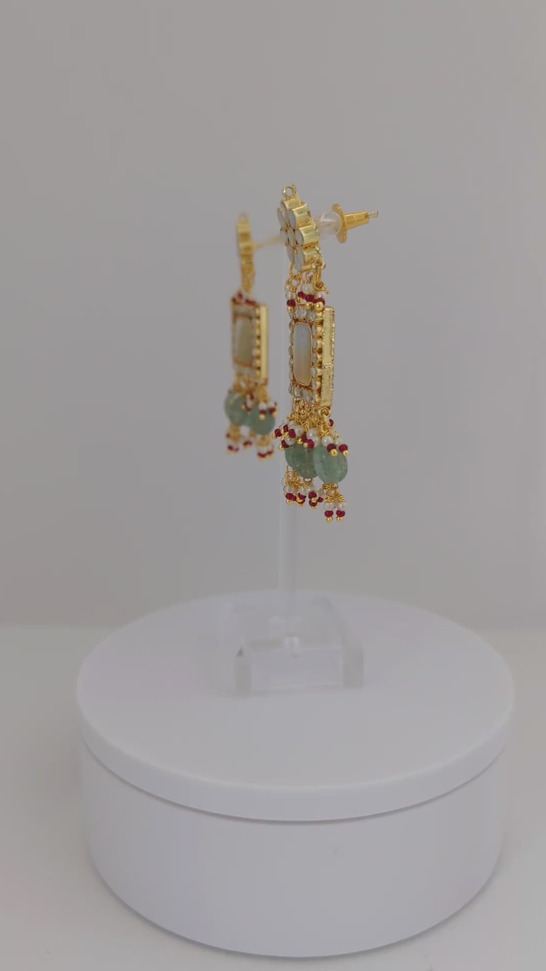 Mother of Pearl Earrings set in copper in mother of Pearl stones with silver foil in 18k gold plating with semi-precious stones and natural gemstones. High quality Kundan used which shine like polki diamond. Earrings.
