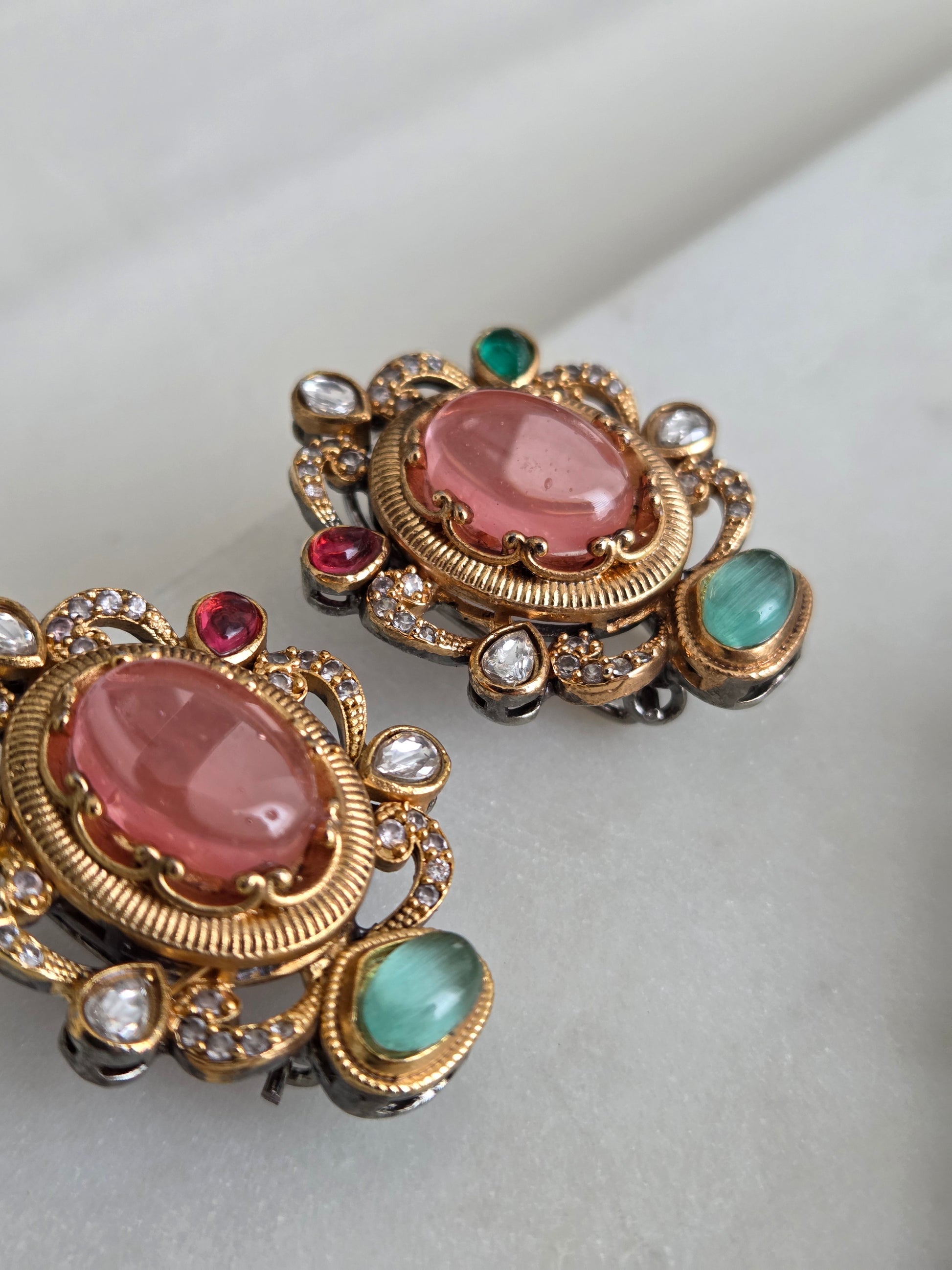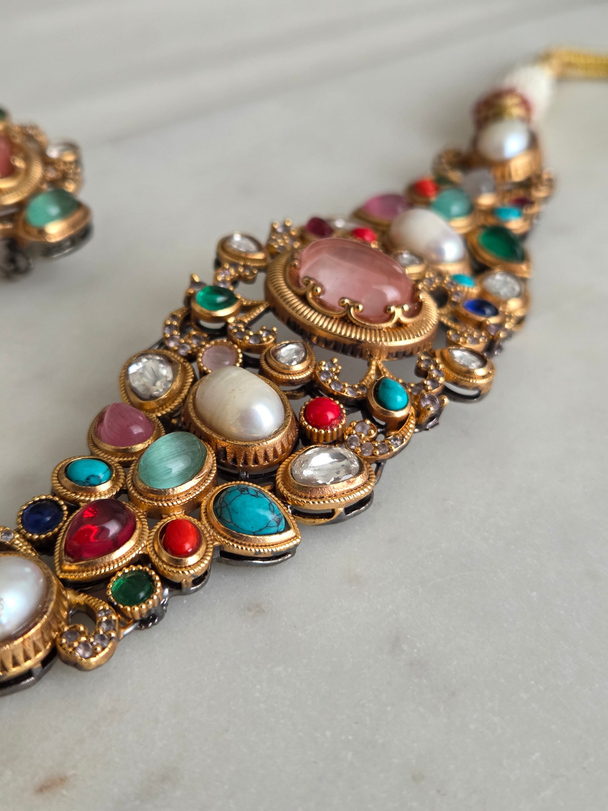 A stunning new jewelry set featuring a statement choker and matching earrings, crafted in antique gold finish. The design showcases an elegant arrangement of multicolored gemstones — including pink, green, red, blue, and white stones — intricately bordered with delicate crystal accents. The centerpiece highlights a soft rose-hued oval stone, exuding timeless grace and vibrant charm. Perfect for traditional and festive occasions.