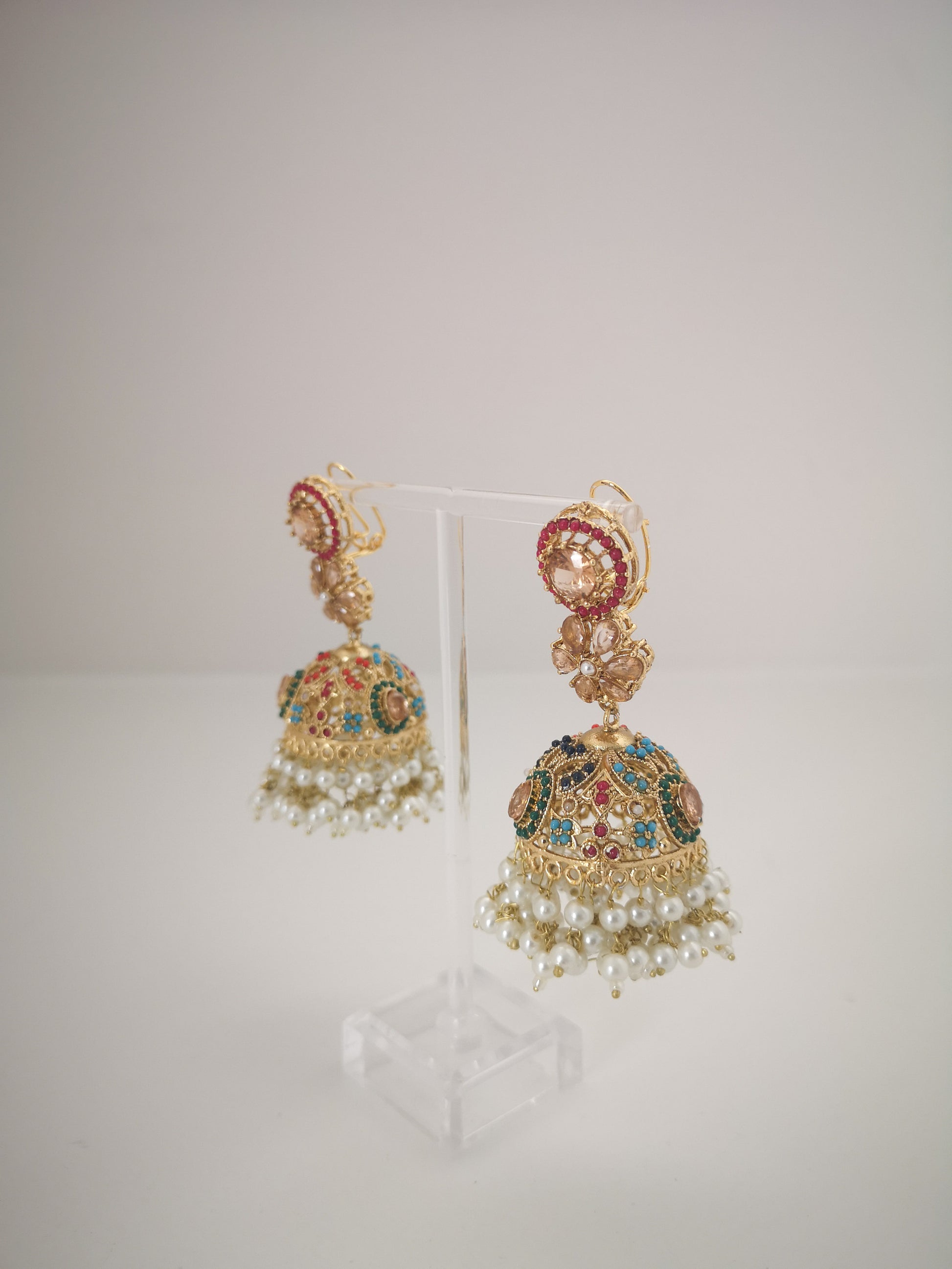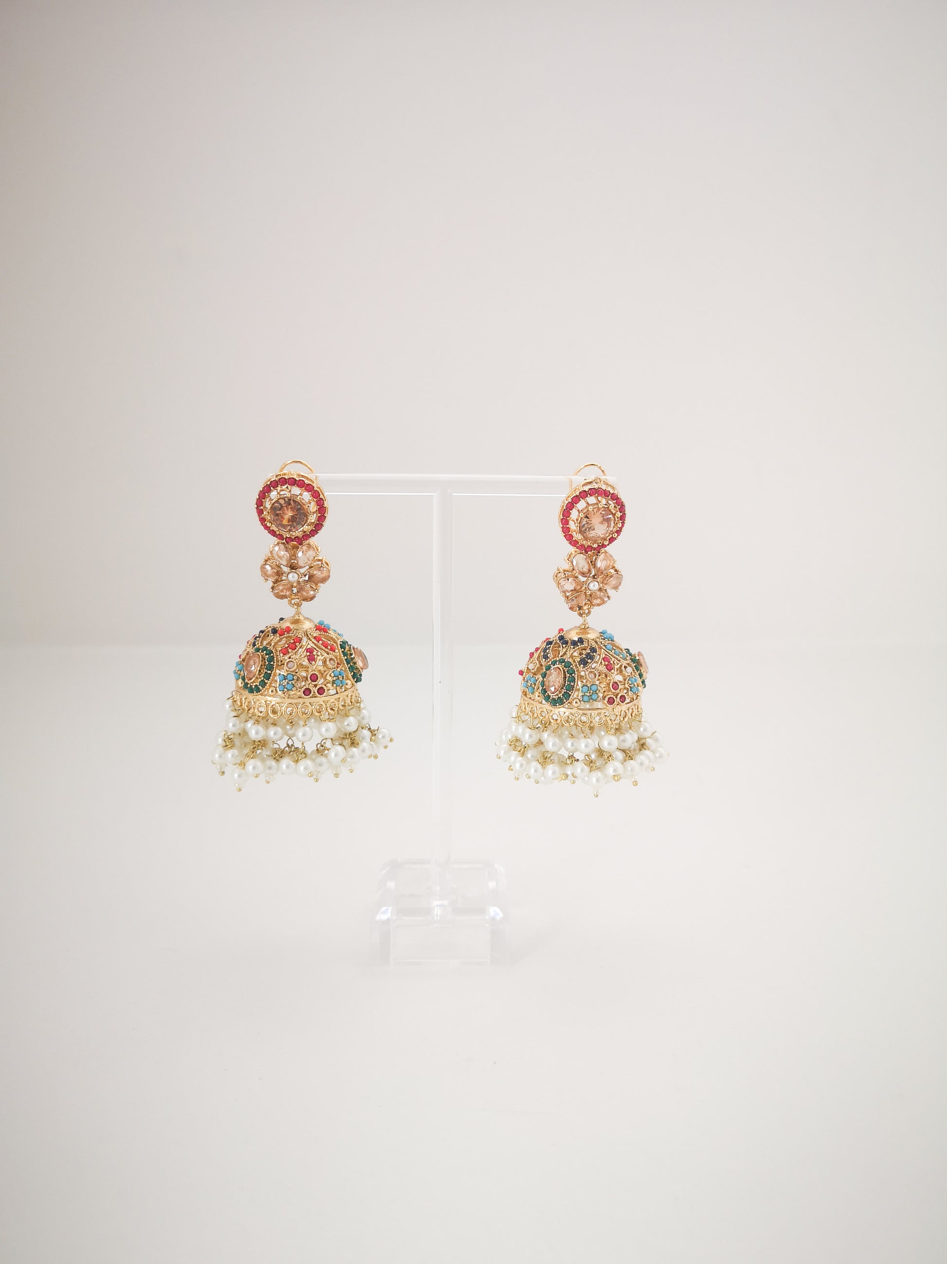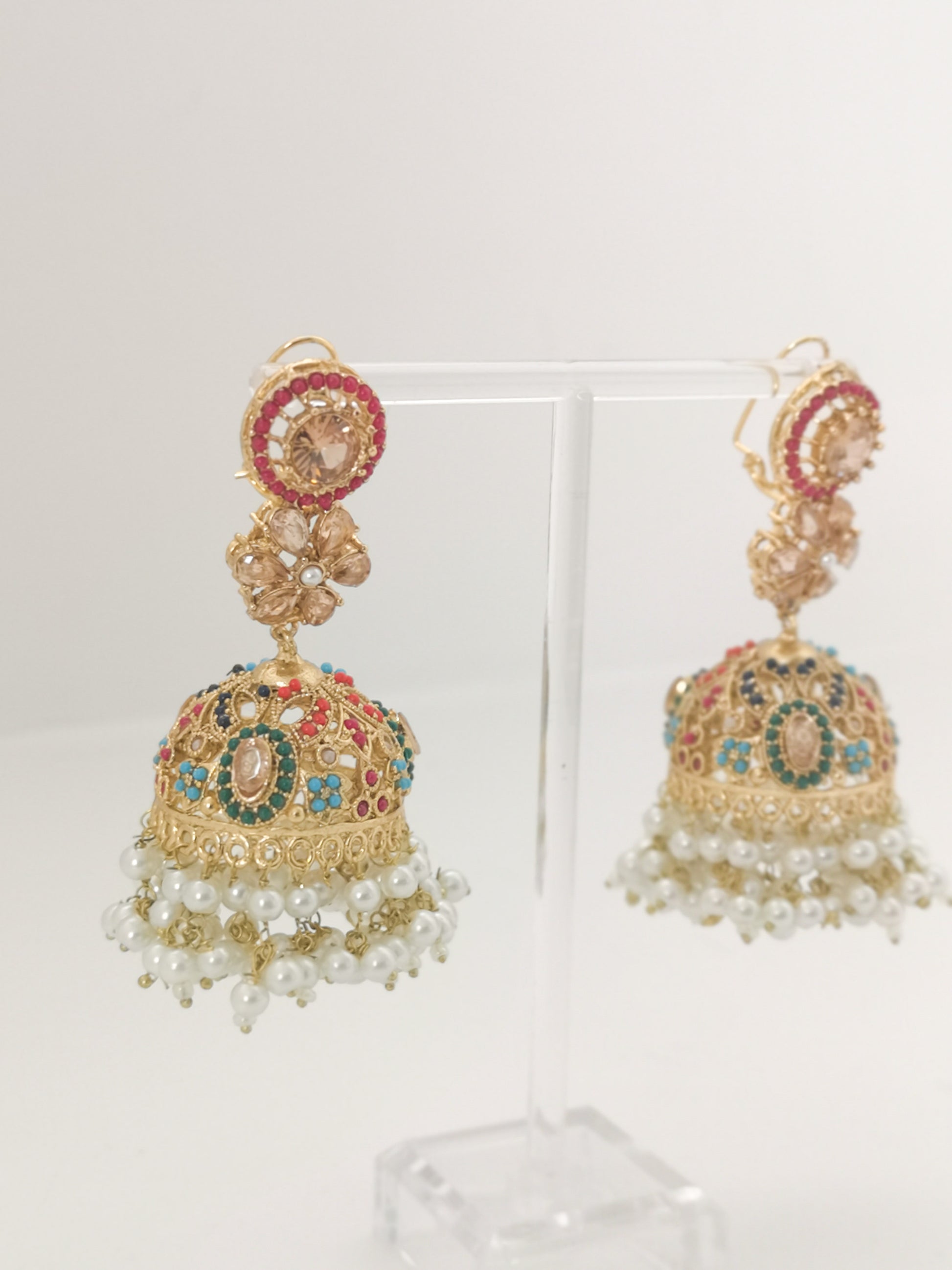 These intricate jhumke earrings Combine vibrant stones, floral motifs, and pearl danglers bringing a timeless charm to any look.