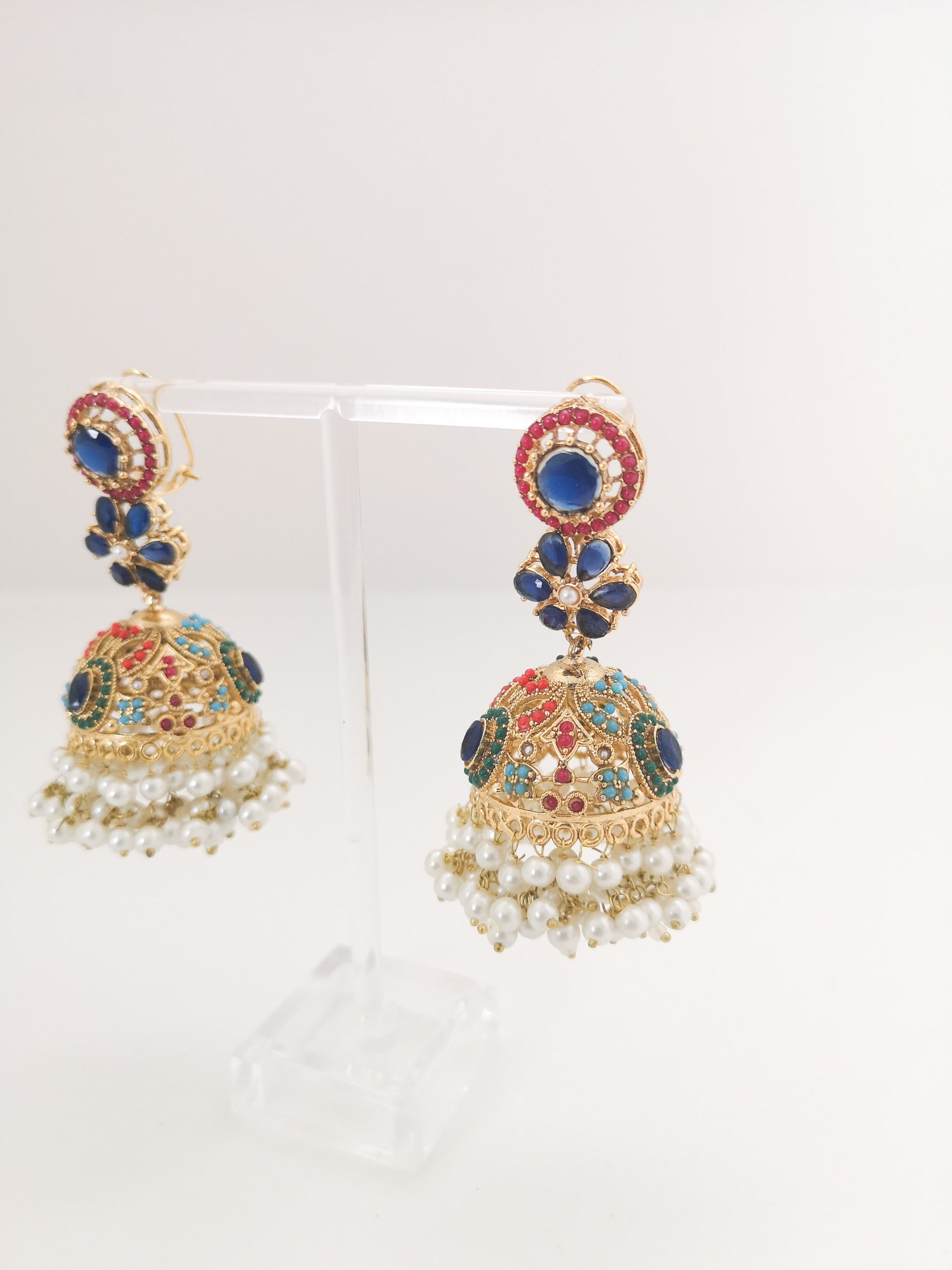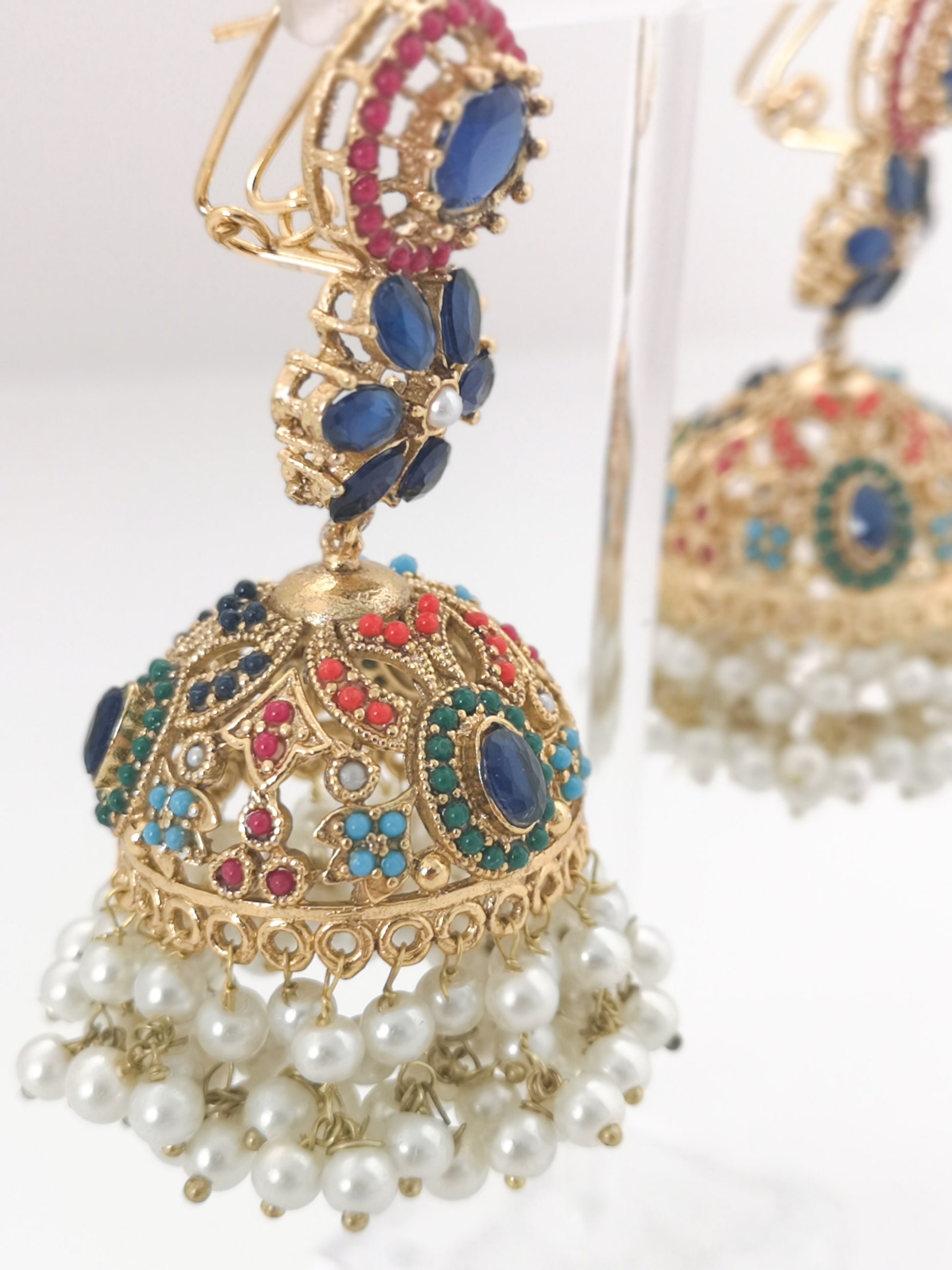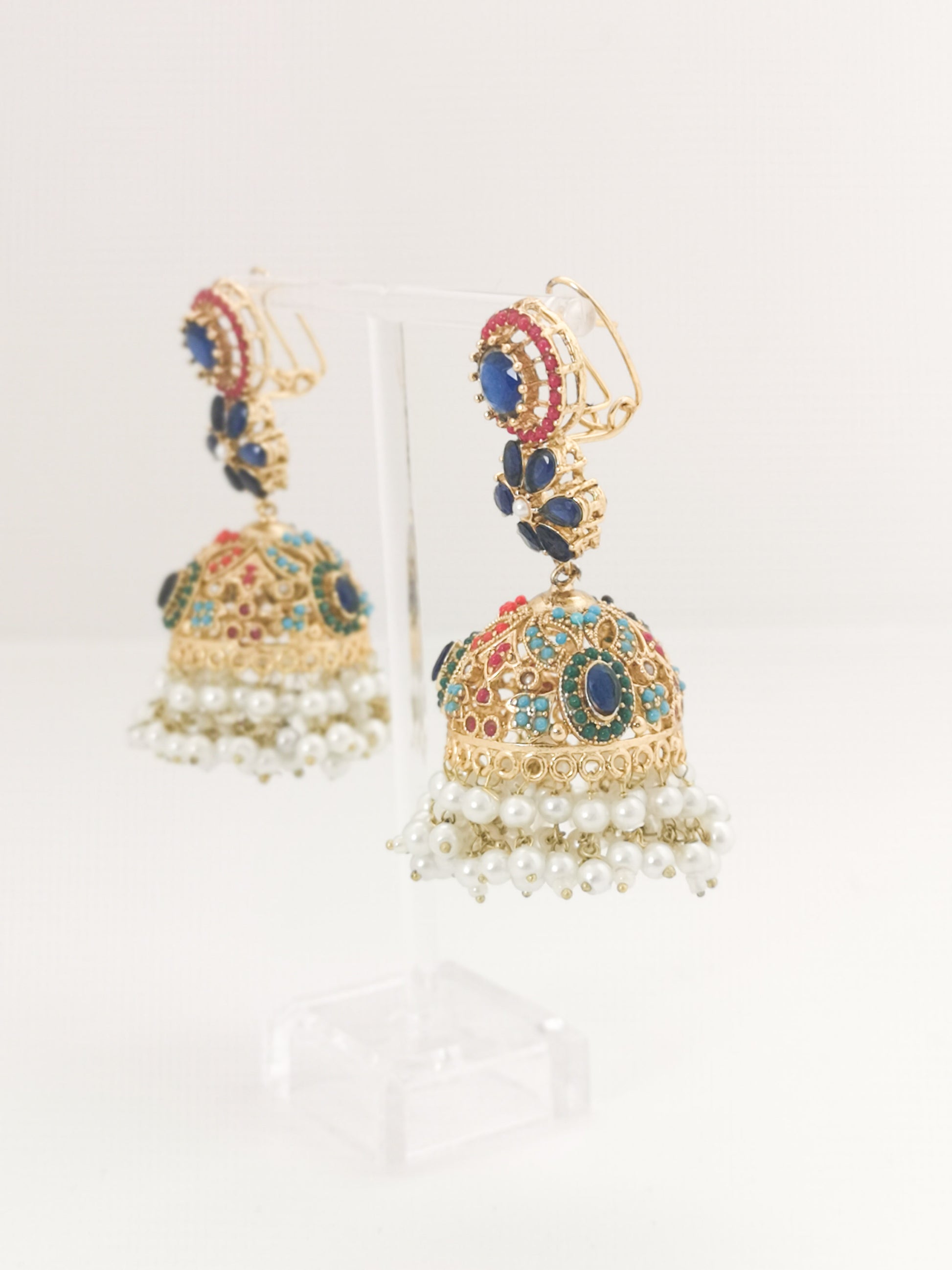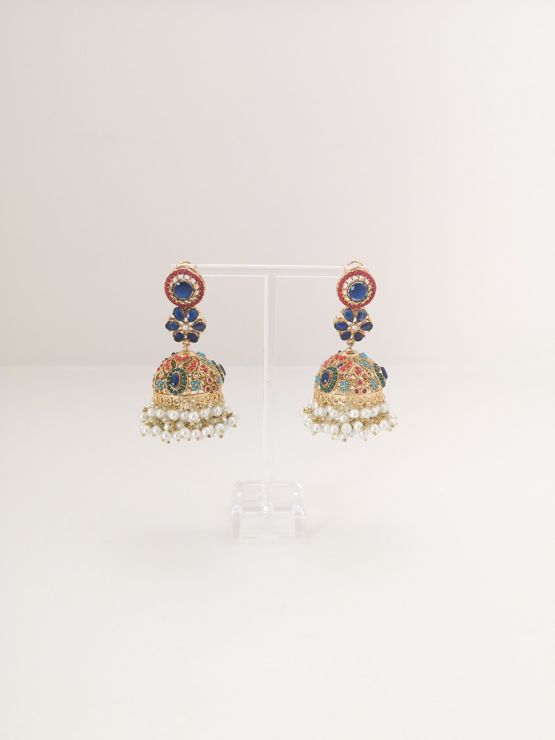 These intricate jhumke earrings Combine vibrant stones, floral motifs, and pearl danglers bringing a timeless charm to any look.