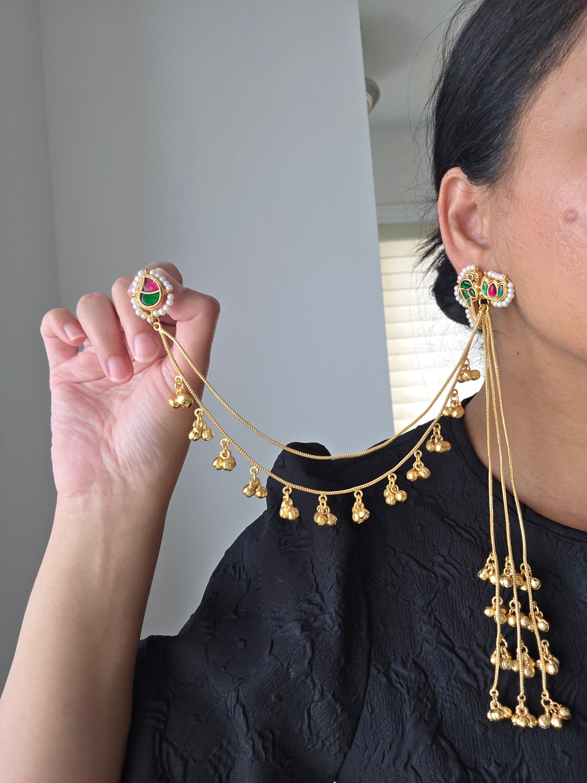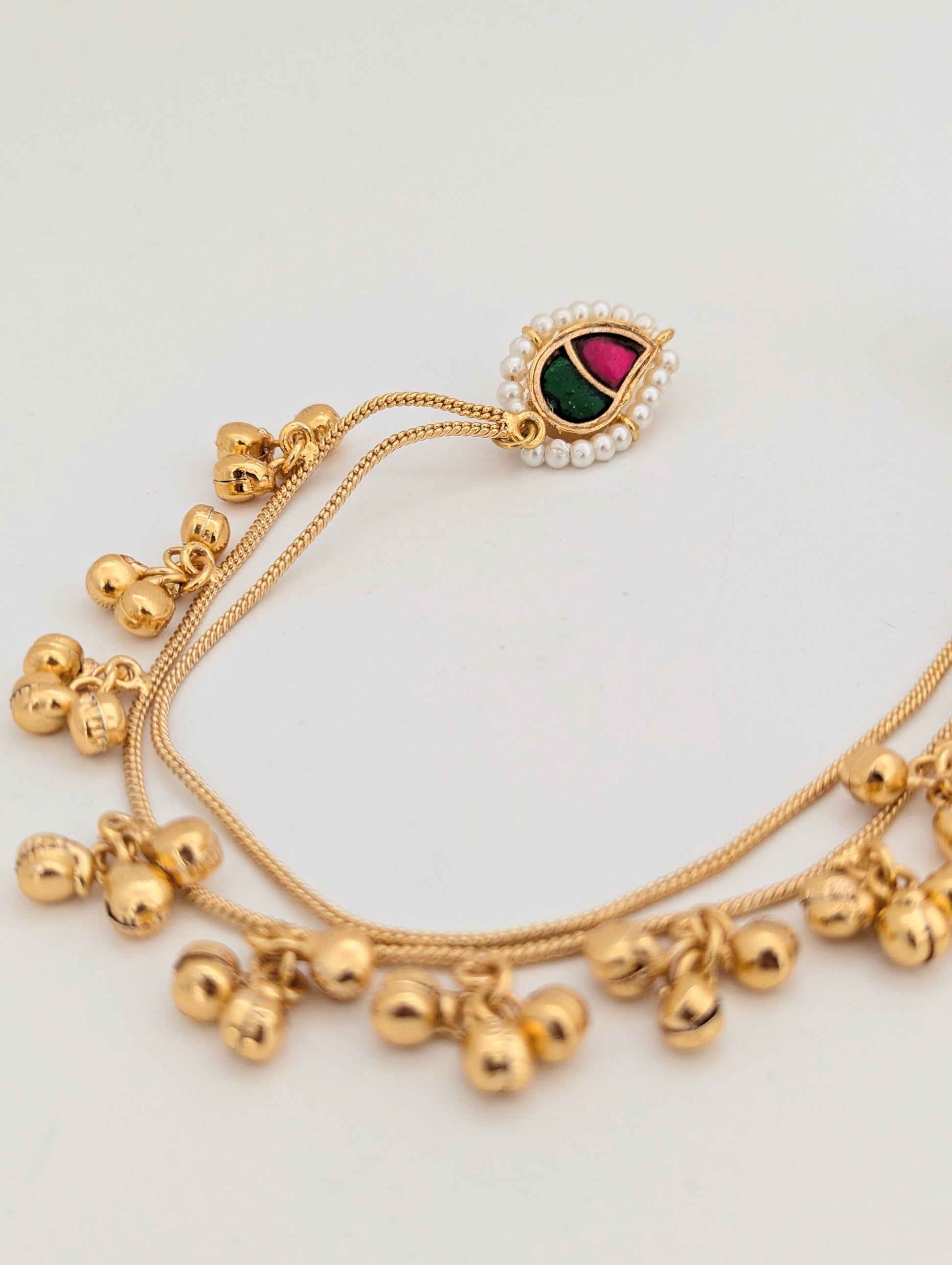 These traditional ear chains (also known as kanchain or ear-to-hair chains) feature an intricate design adorned with enamel work in deep green and magenta tones, accented by pearl edging. The central motif showcases a stylized floral form embellished with delicate cluster bells (ghungroos) hanging from fine gold-toned chains. The upper portions have teardrop-shaped elements that anchor the piece near the hair, creating a graceful drape along the ear. Perfect for elevating ethnic wear, these ear chains exude a timeless, antique charm.