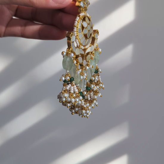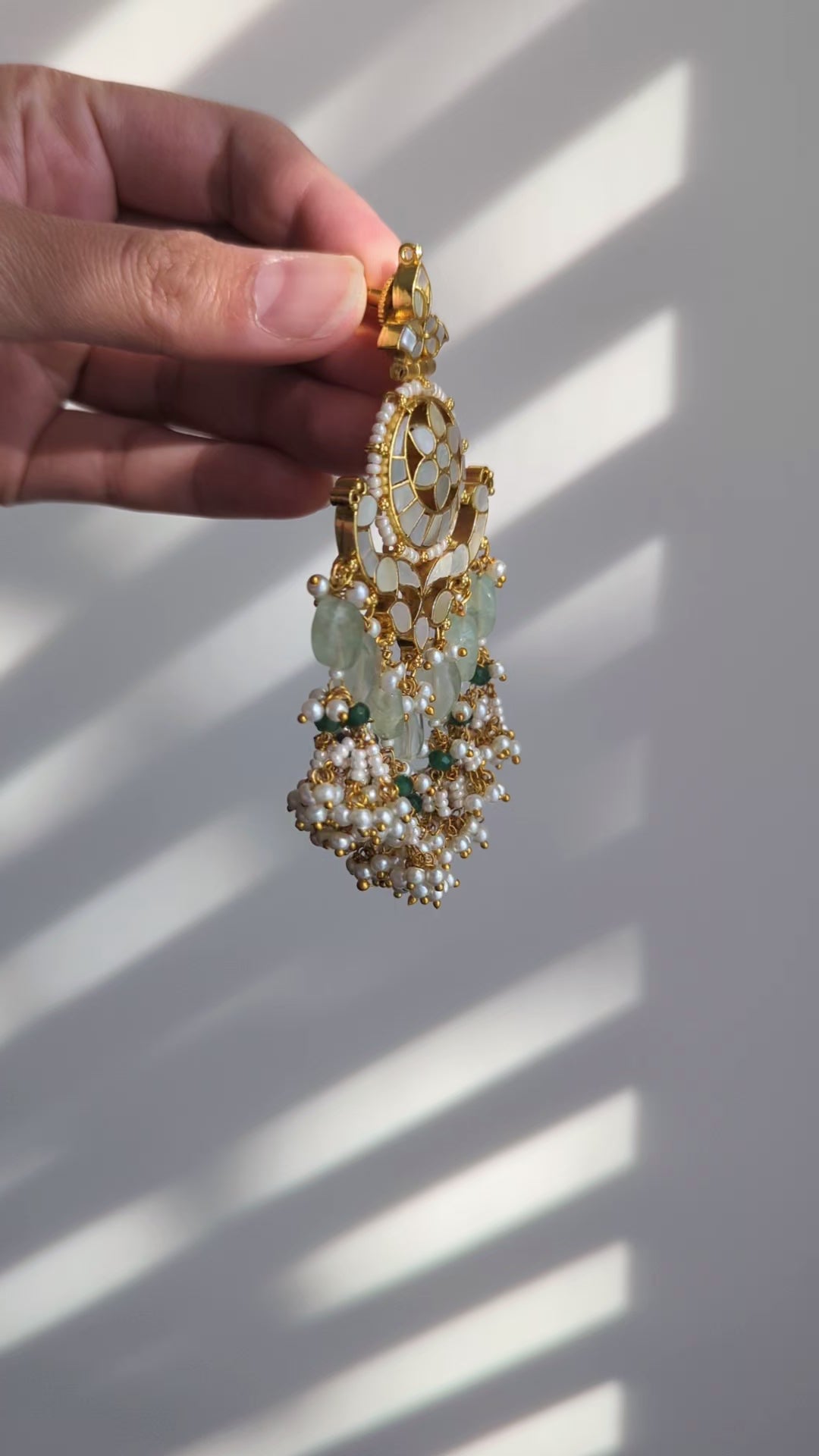These statement earrings feature an intricate floral-inspired design with a gold framework, accented by delicate white enamel work. The chandelier-style drops are adorned with soft green beads and clusters of tiny pearls interspersed with dark green stones, creating a rich and elegant contrast. Finished with cascading pearl bunches, these earrings exude a regal charm, making them perfect for festive and traditional occasions.