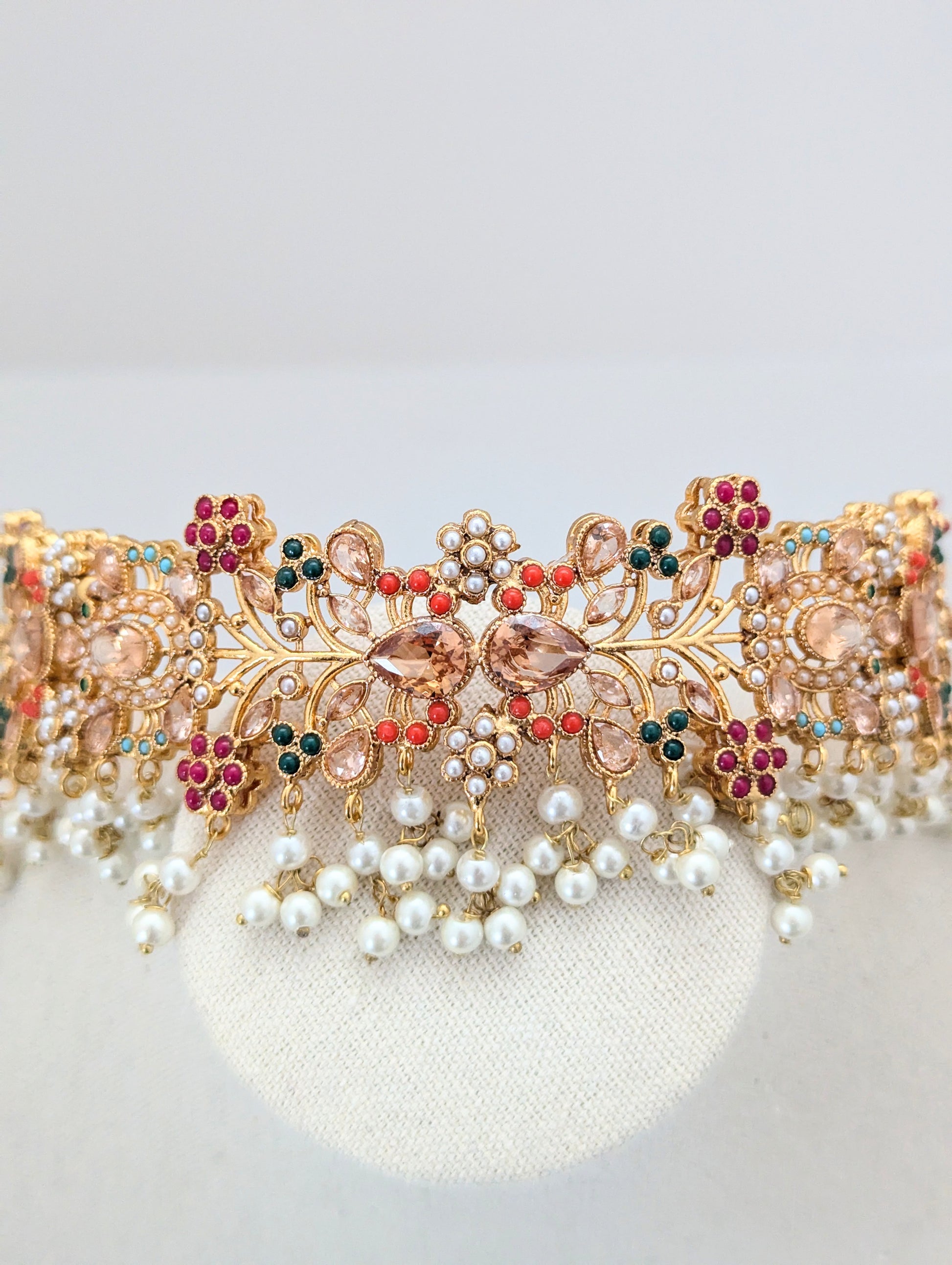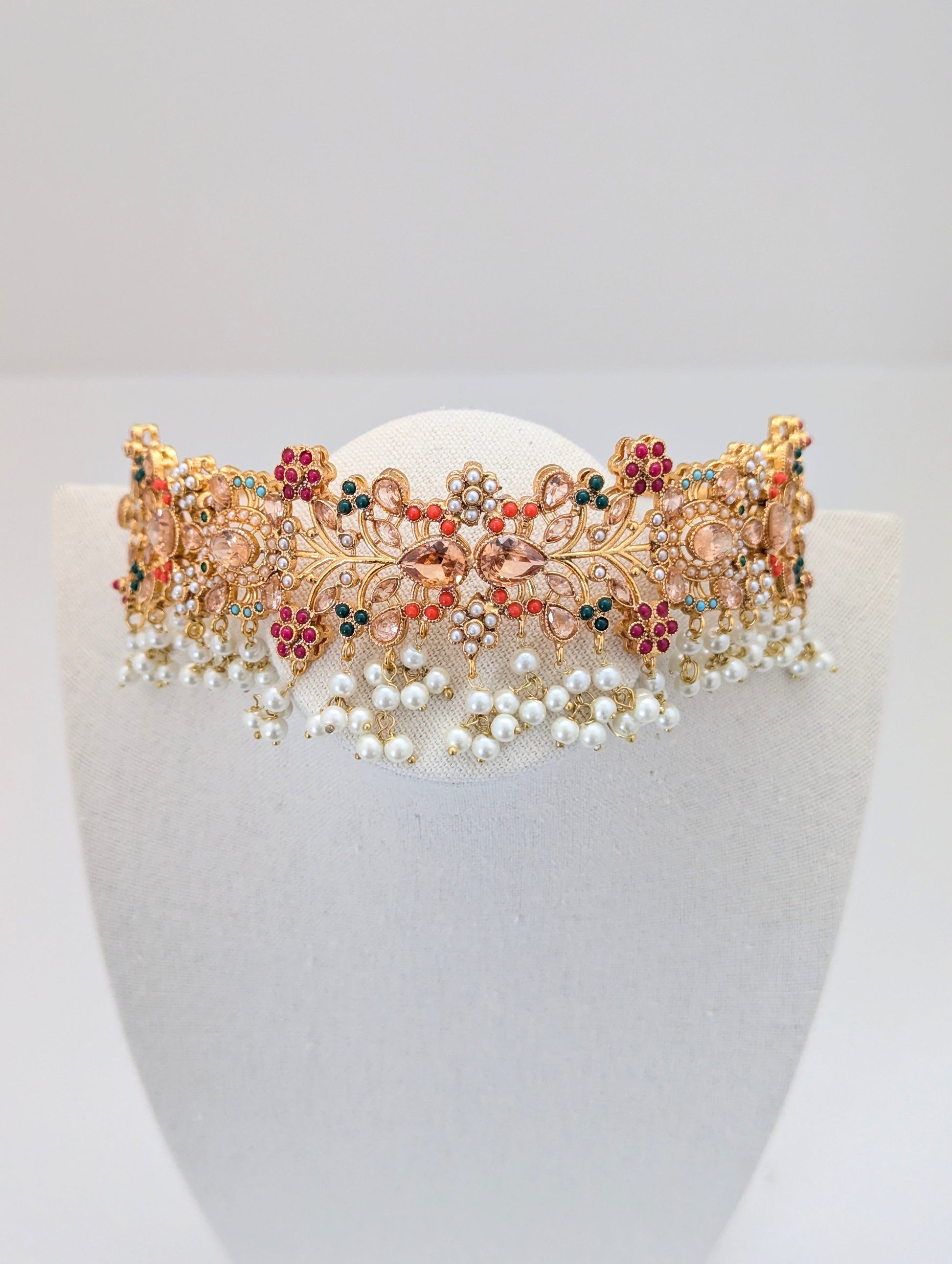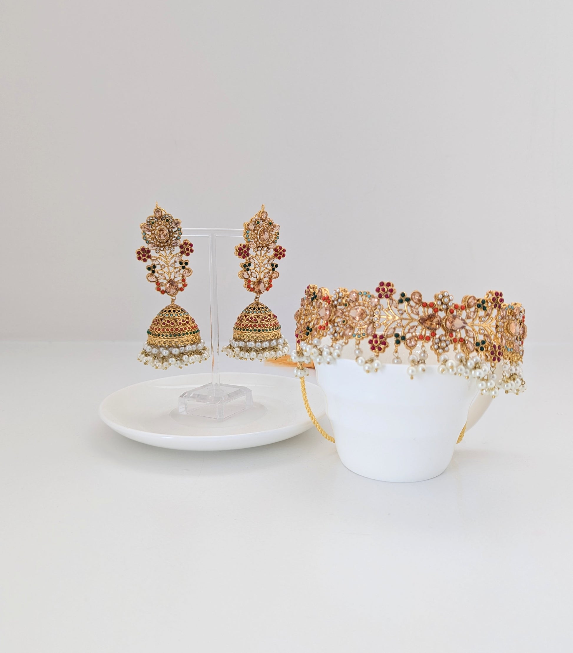 This jewelry set features a vibrant and intricate design with floral motifs, colorful stones in red, green, and white, and delicate pearl embellishments. Crafted with a golden finish, it exudes traditional elegance, making it ideal for festive occasions and celebrations.