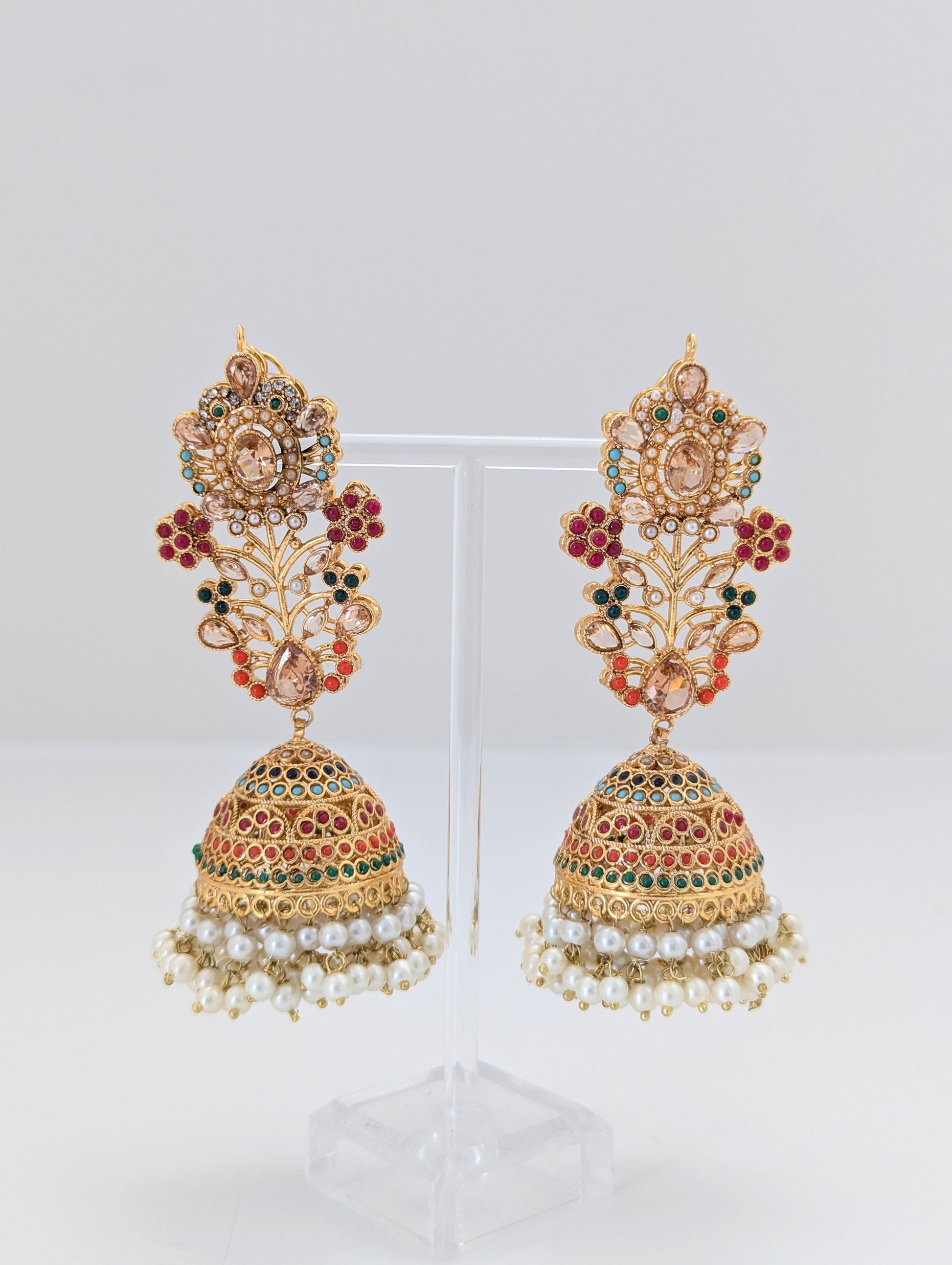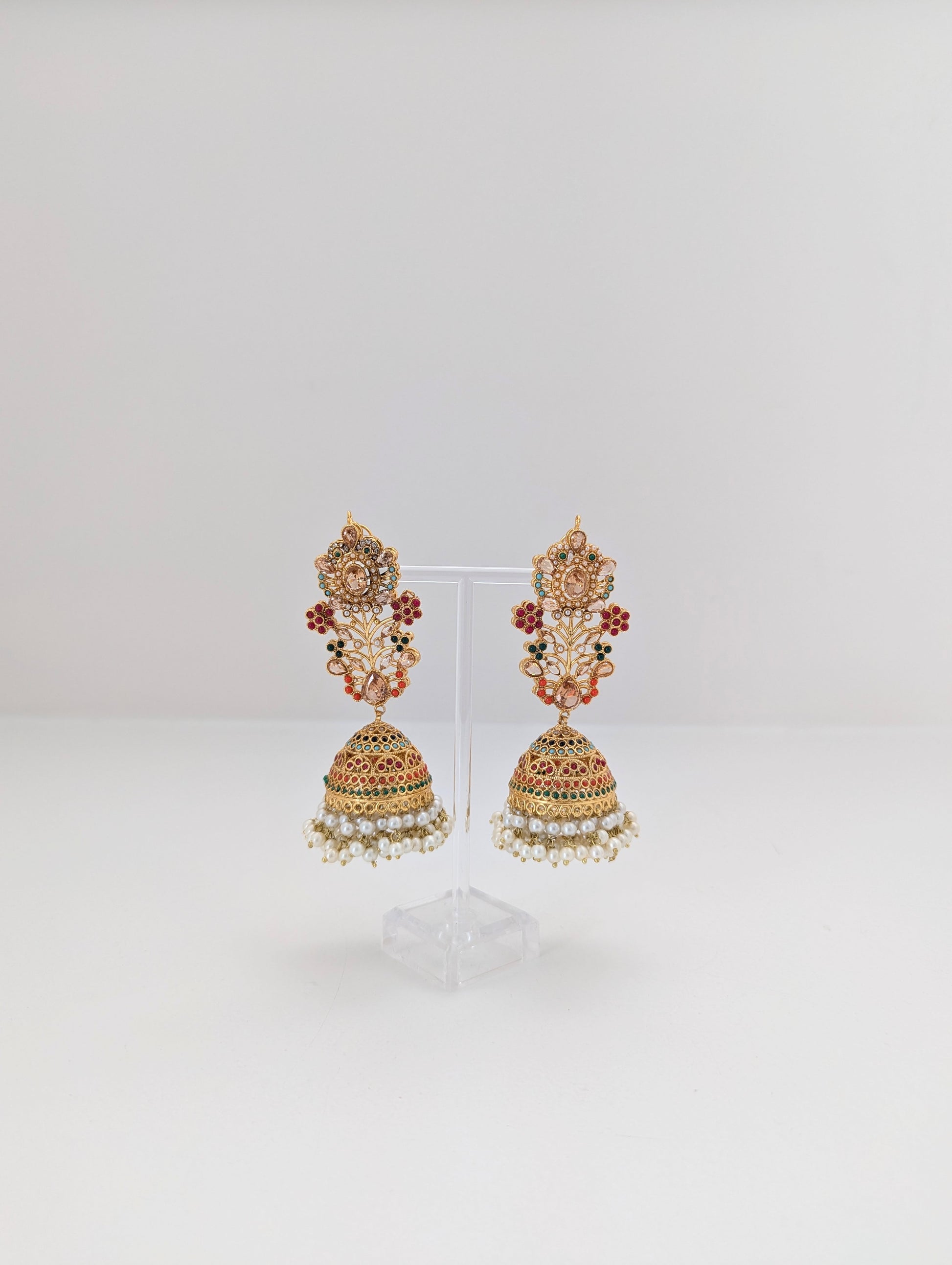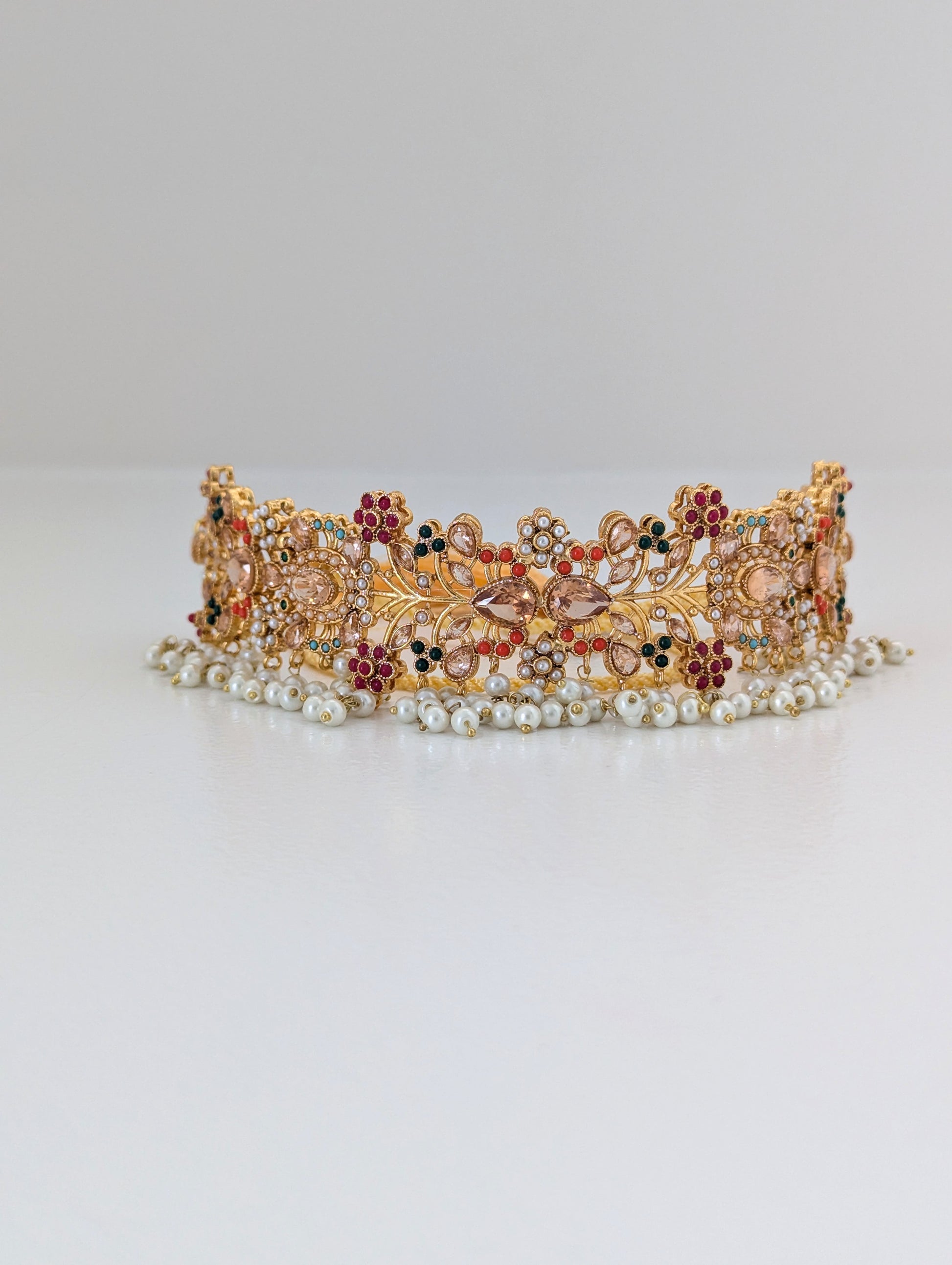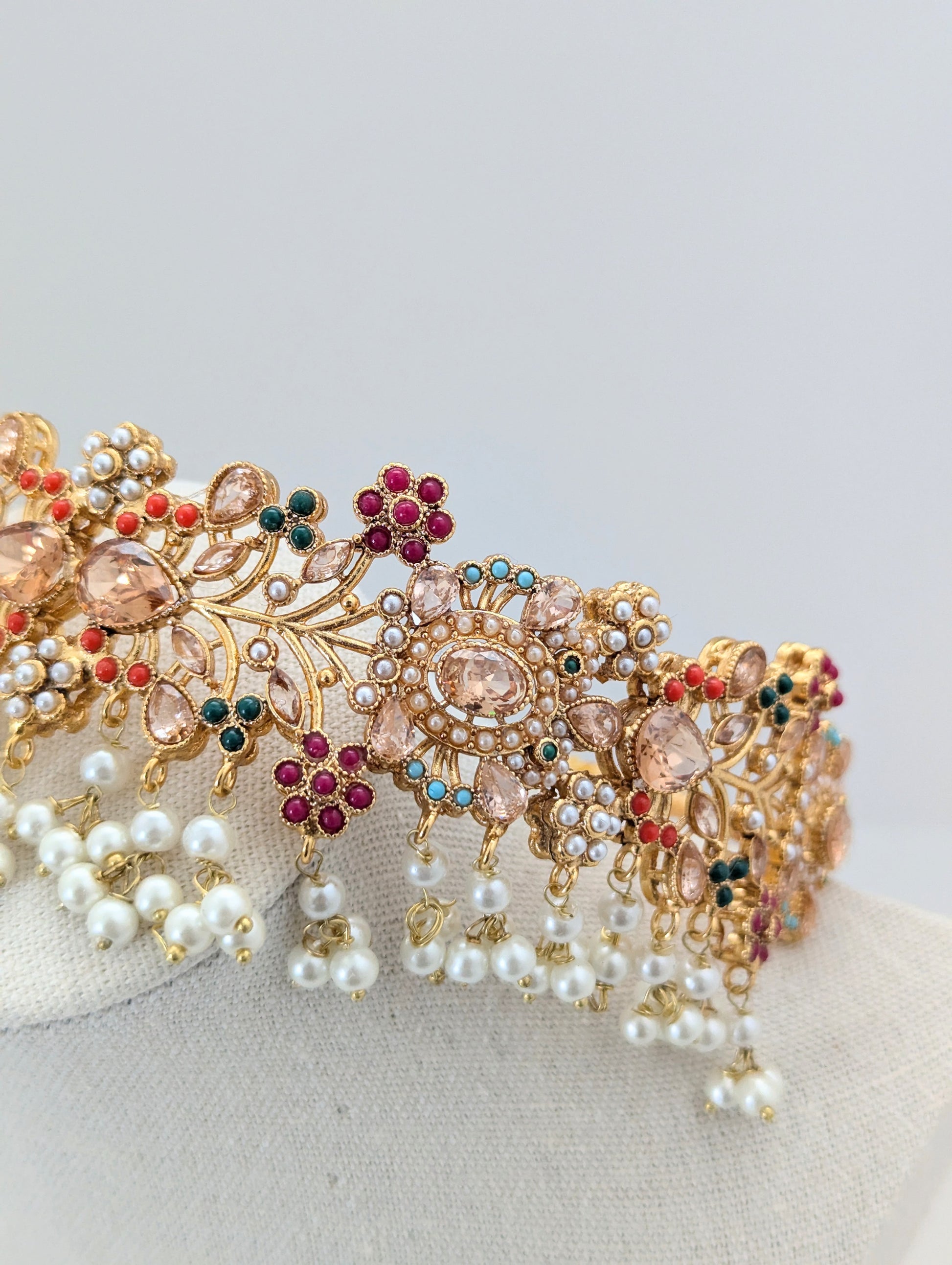 This jewelry set features a vibrant and intricate design with floral motifs, colorful stones in red, green, and white, and delicate pearl embellishments. Crafted with a golden finish, it exudes traditional elegance, making it ideal for festive occasions and celebrations.