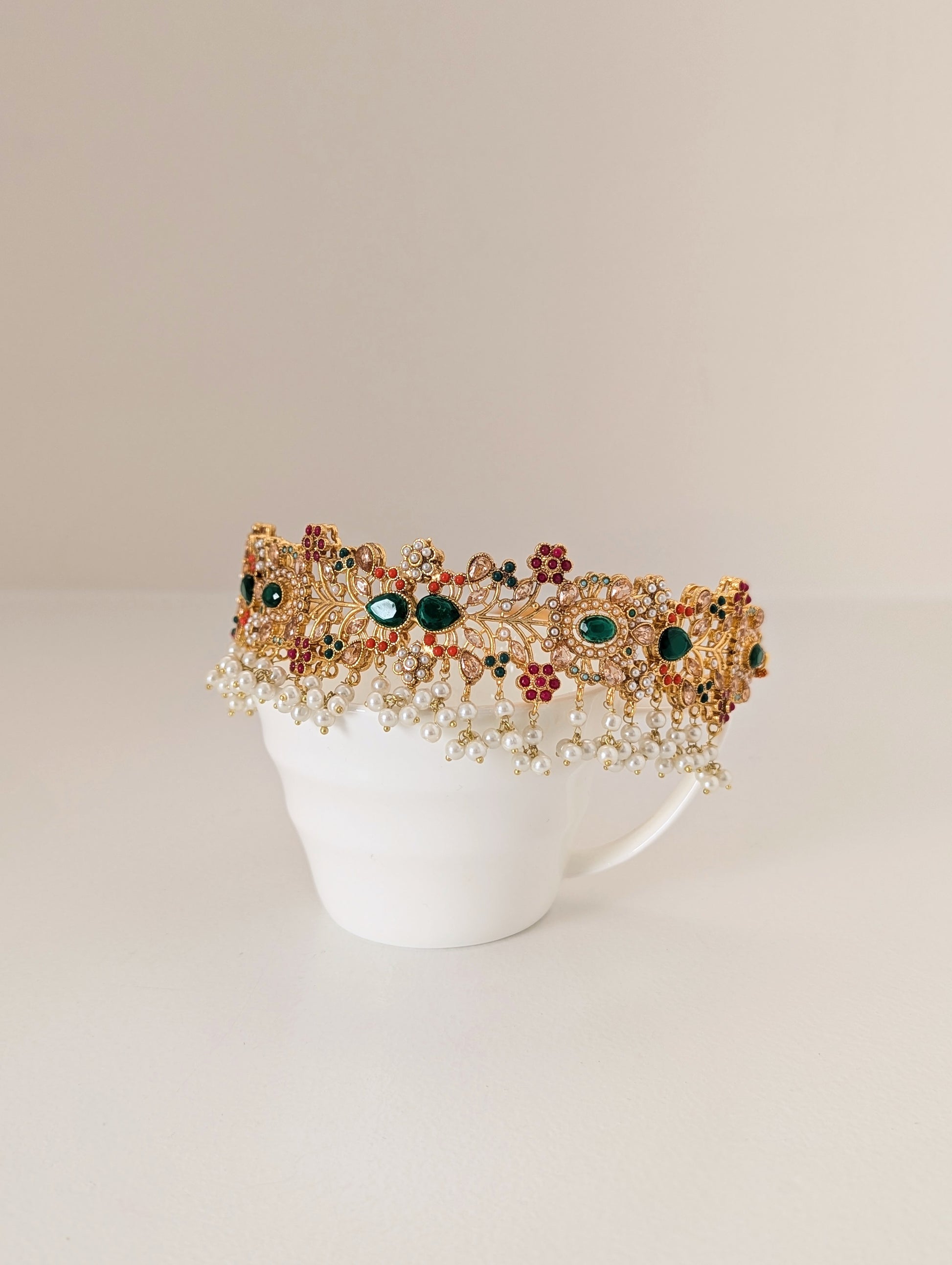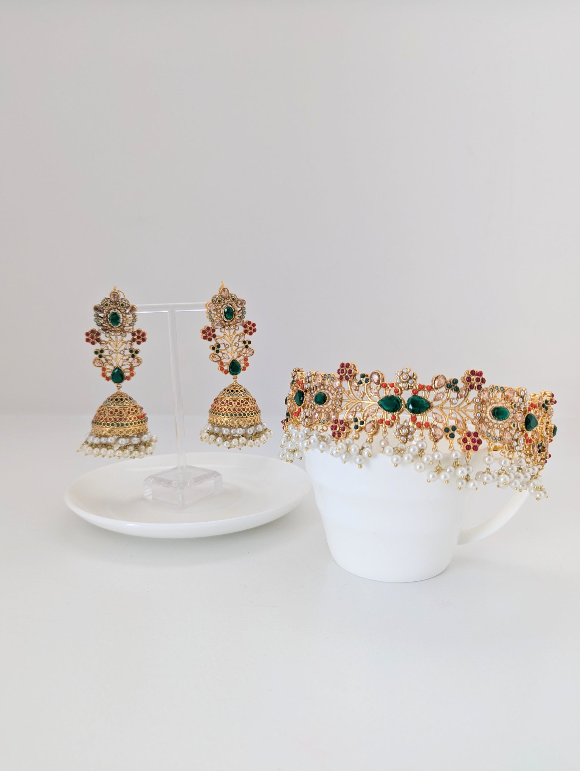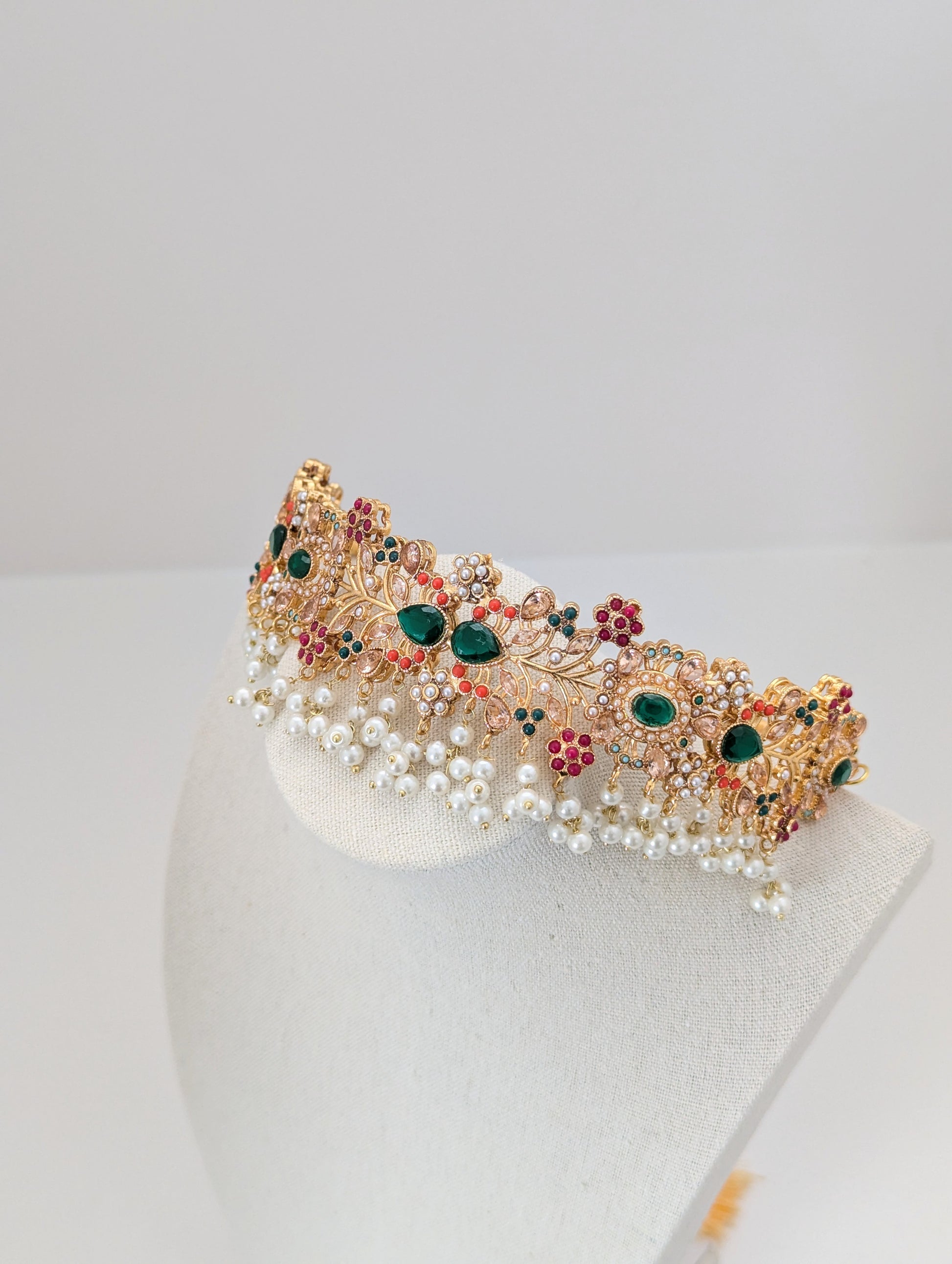 This jewelry set features a vibrant and intricate design with floral motifs, colorful stones in red, green, and white, and delicate pearl embellishments. Crafted with a golden finish, it exudes traditional elegance, making it ideal for festive occasions and celebration
