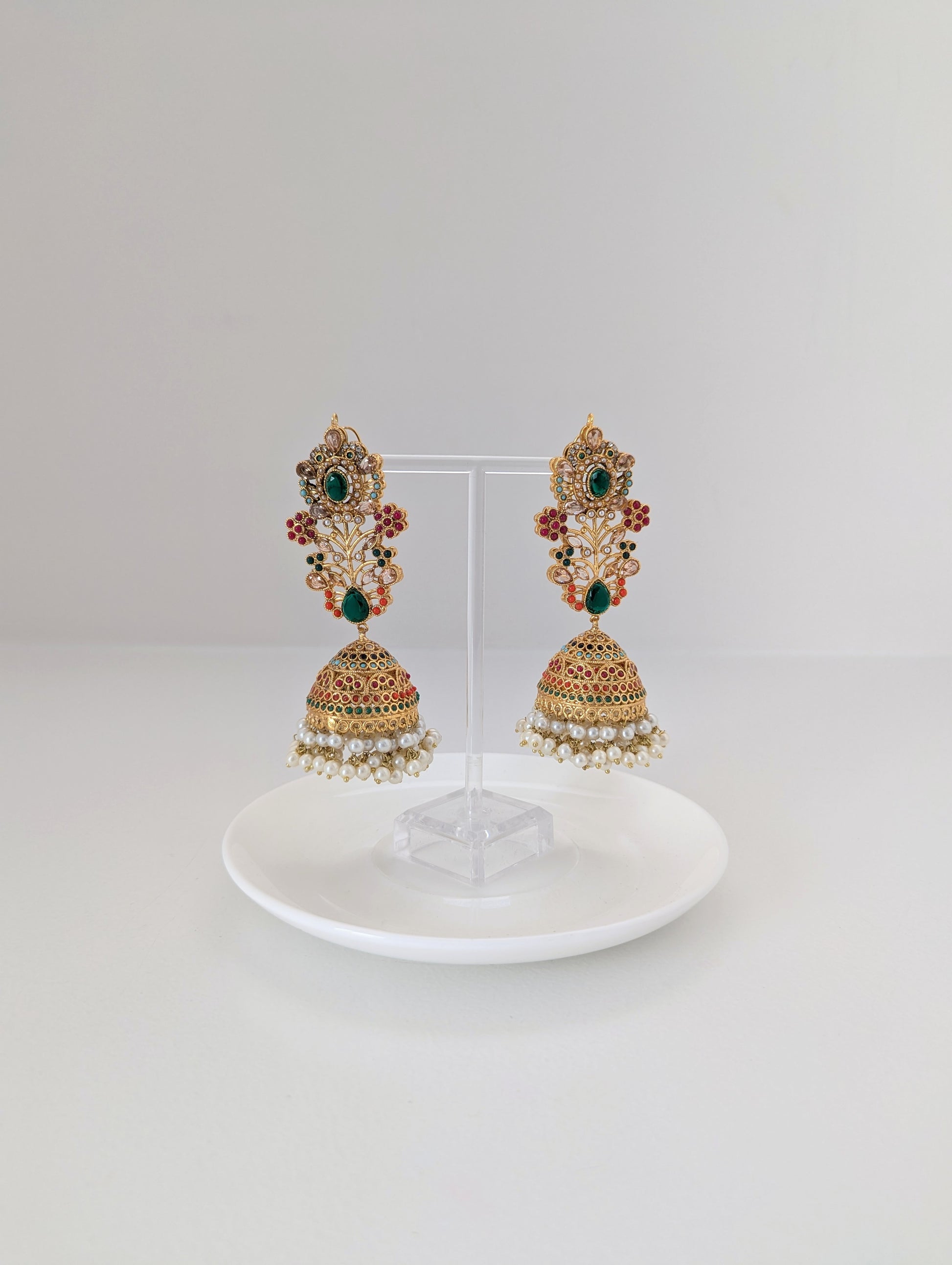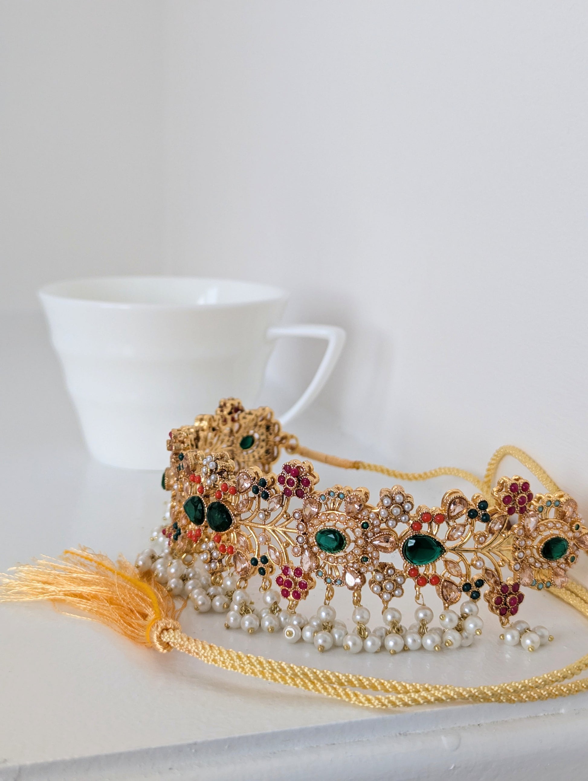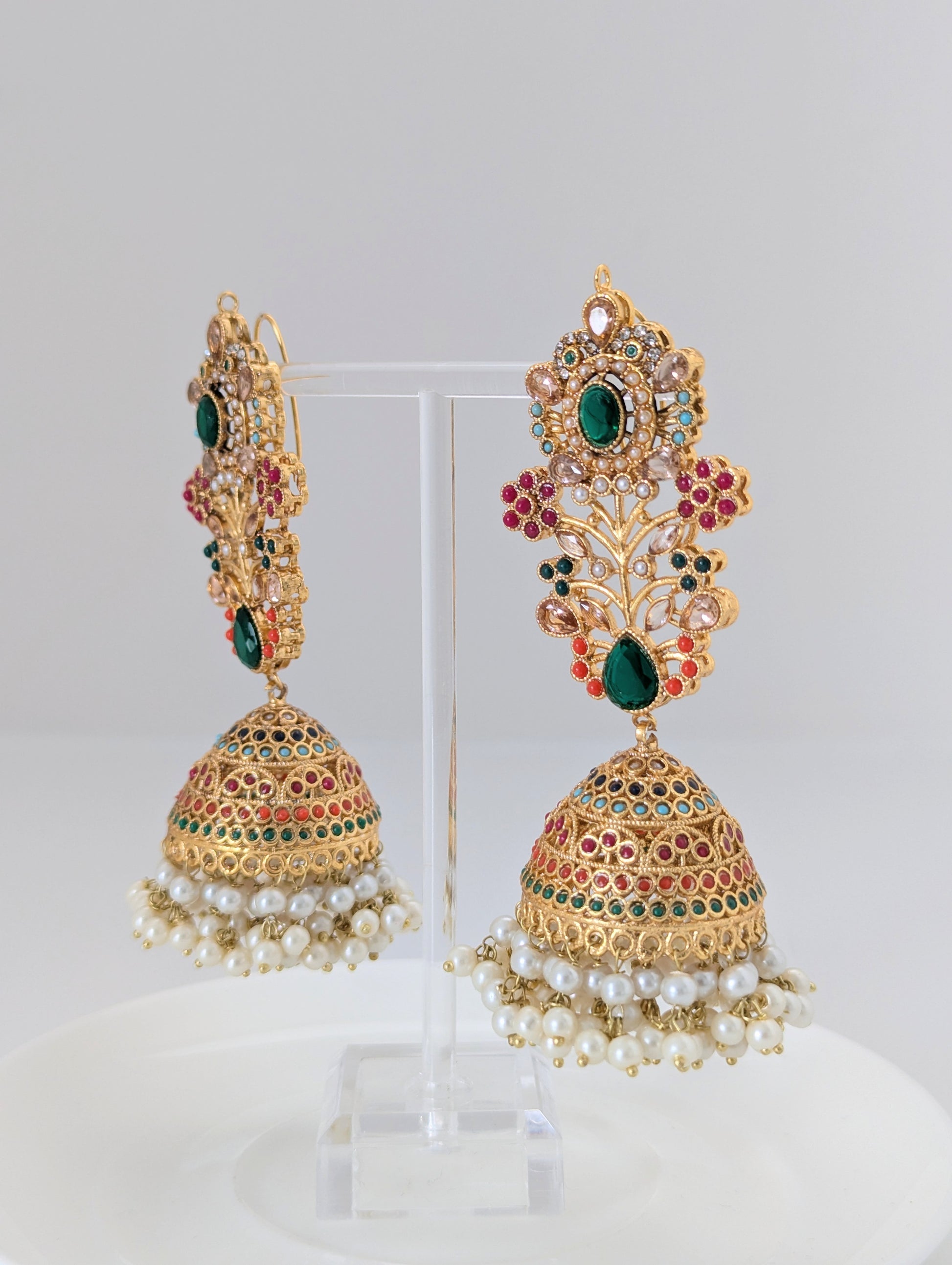 This jewelry set features a vibrant and intricate design with floral motifs, colorful stones in red, green, and white, and delicate pearl embellishments. Crafted with a golden finish, it exudes traditional elegance, making it ideal for festive occasions and celebration