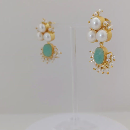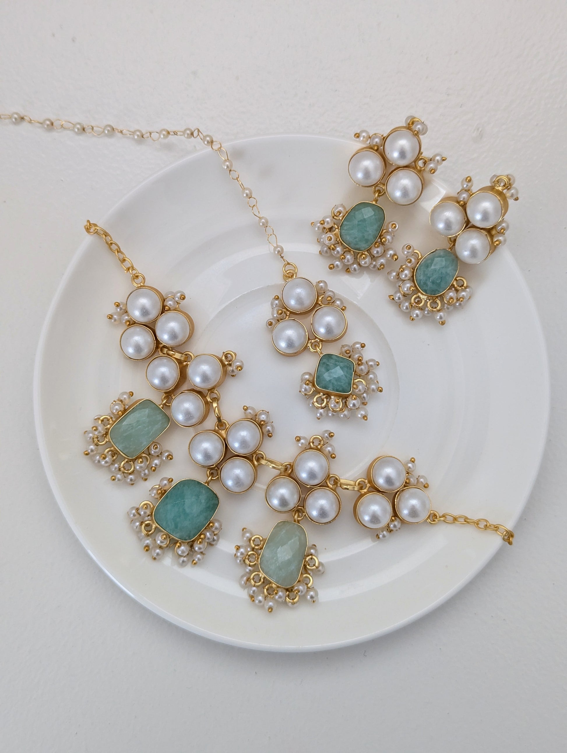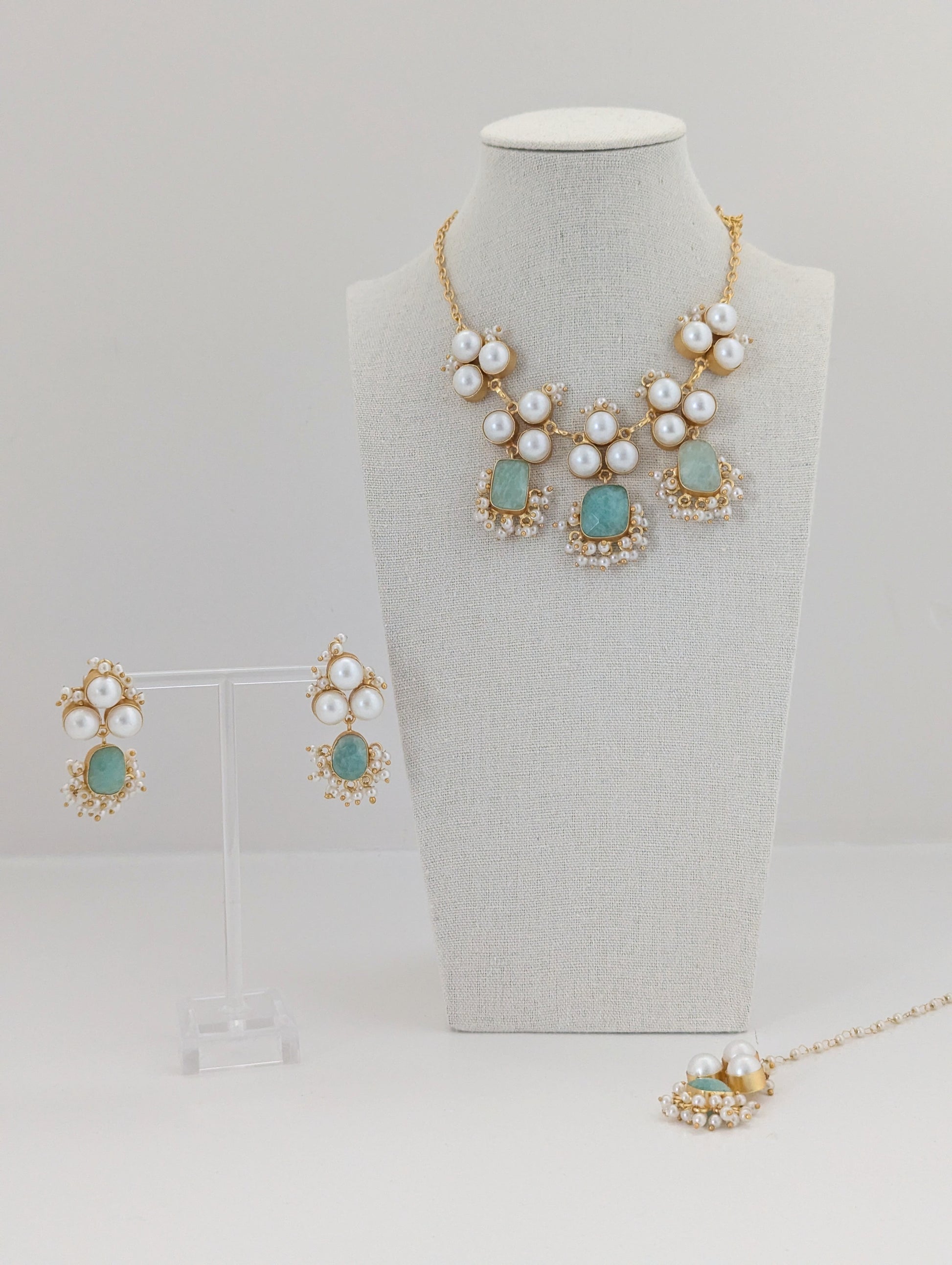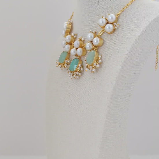This elegant jewelry set features soft blue and mint-green stones set in warm gold tones, beautifully accented with clusters of luminous pearls. The necklace is designed with graceful pearl motifs and gemstone drops, while the matching earrings mirror the same refined detailing for a perfectly coordinated look. Delicate fresh water pearl accents add movement and charm, making this set an ideal choice for weddings, festive celebrations, and elegant evening wear.