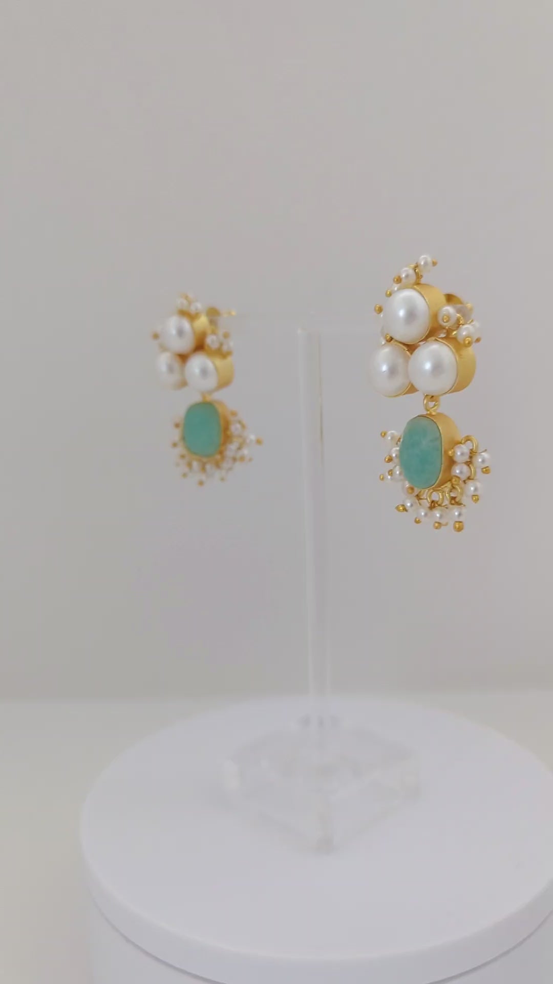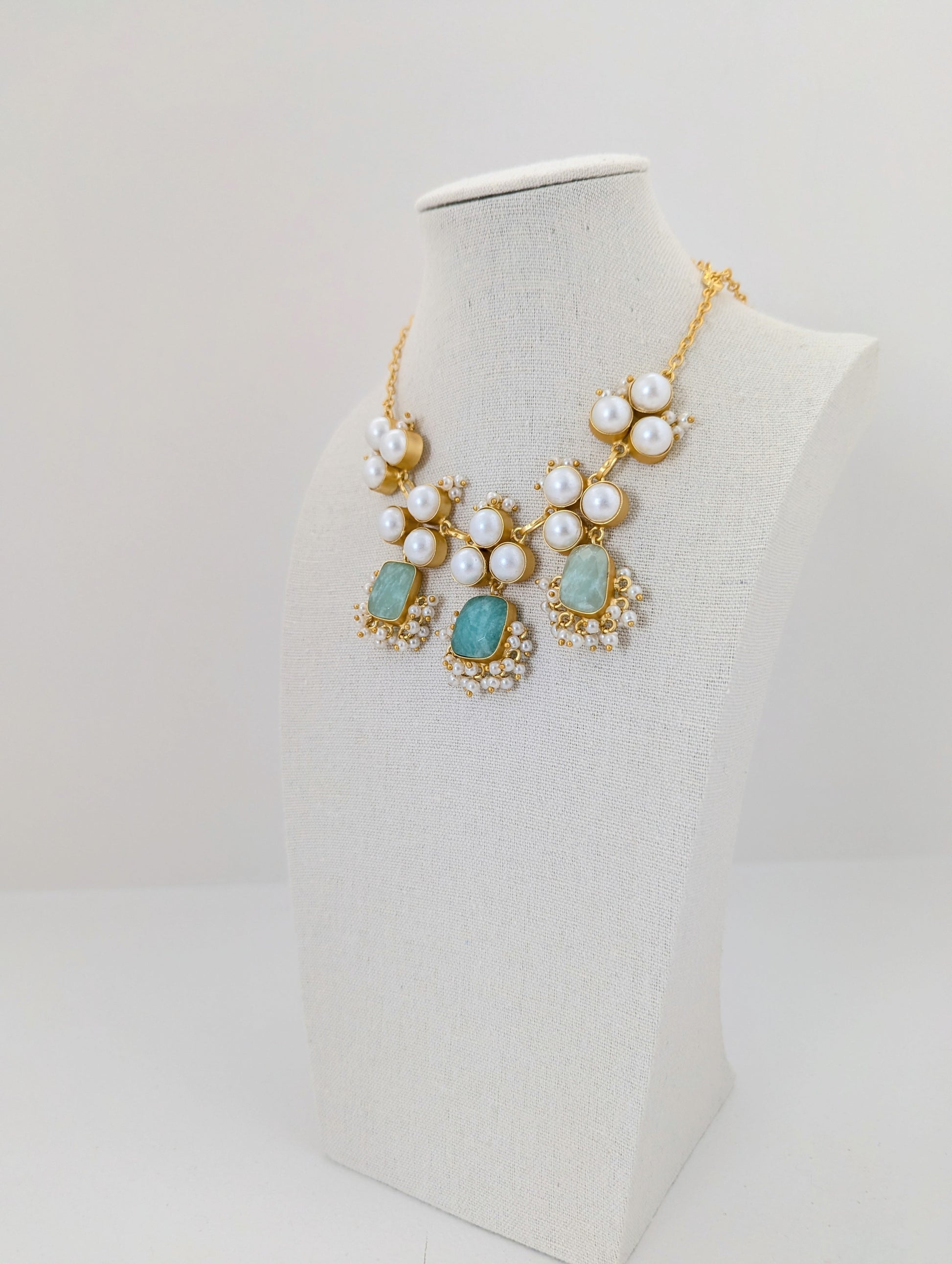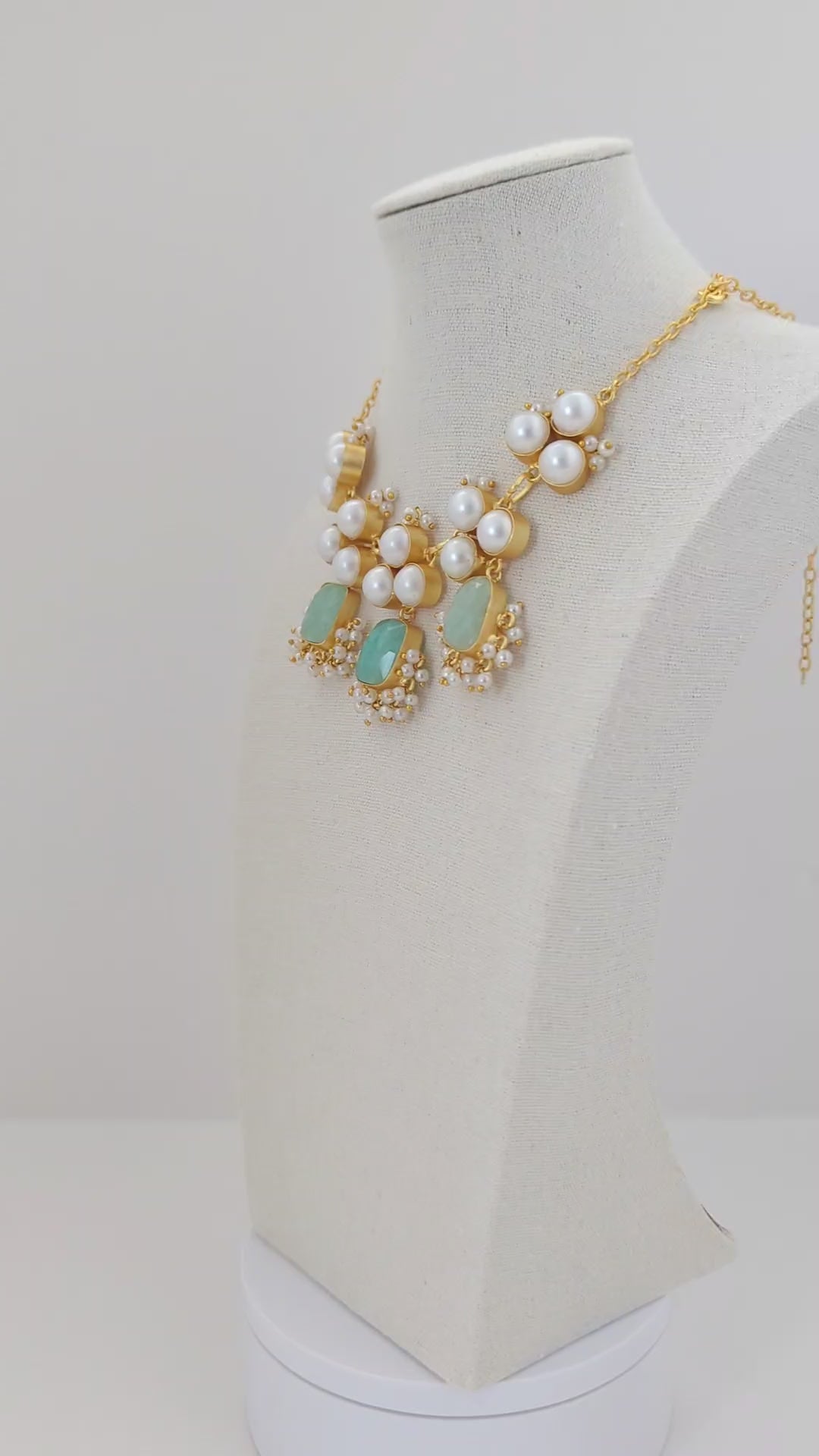 This elegant jewelry set features soft blue and mint-green stones set in warm gold tones, beautifully accented with clusters of luminous pearls. The necklace is designed with graceful pearl motifs and gemstone drops, while the matching earrings mirror the same refined detailing for a perfectly coordinated look. Delicate fresh water pearl accents add movement and charm, making this set an ideal choice for weddings, festive celebrations, and elegant evening wear.