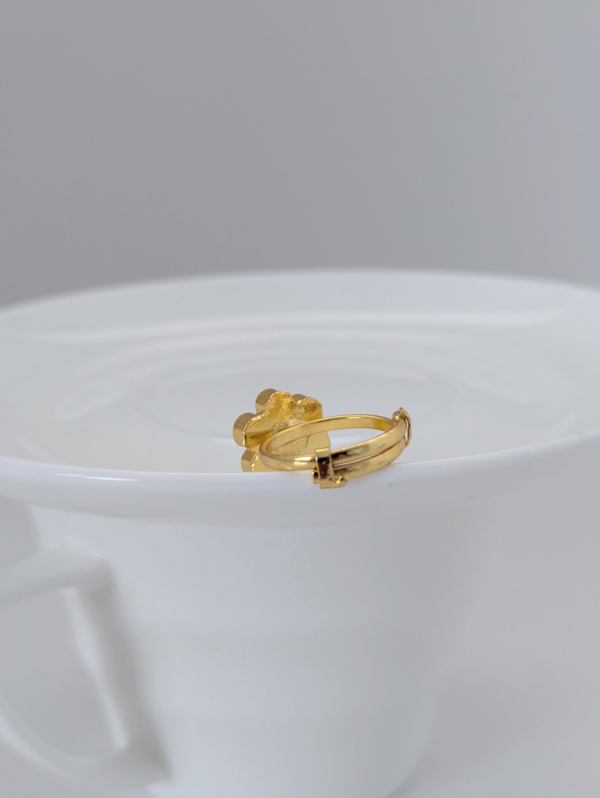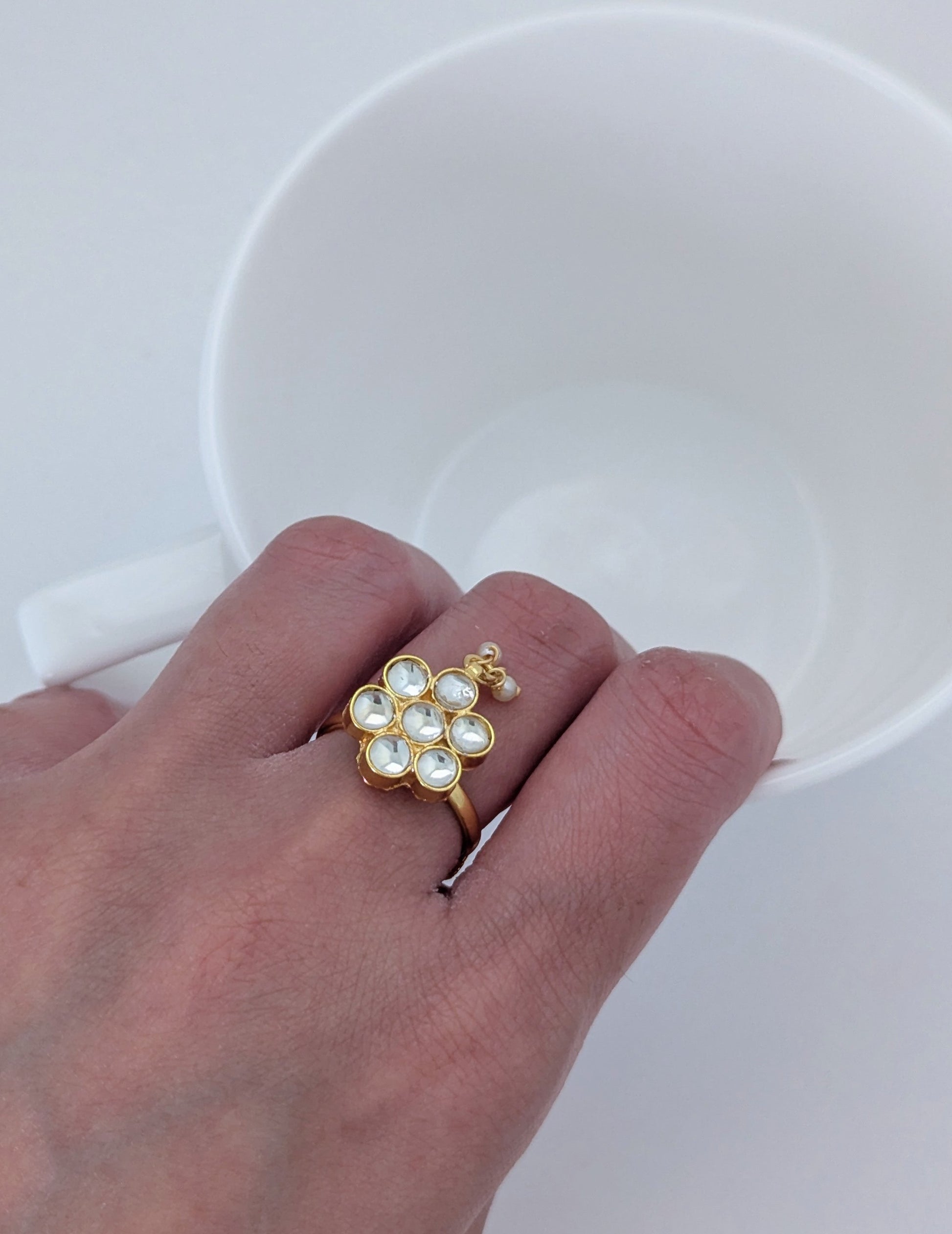 This exquisite Kundan ring is a perfect blend of classic elegance and timeless charm. Designed in a delicate floral pattern, it features high-quality Kundan stones set in a gold-plated base. A small pearl charm adds a touch of grace, enhancing its traditional appeal. The adjustable band ensures a comfortable fit, making it a versatile piece for any occasion, from festive celebrations to everyday elegance.