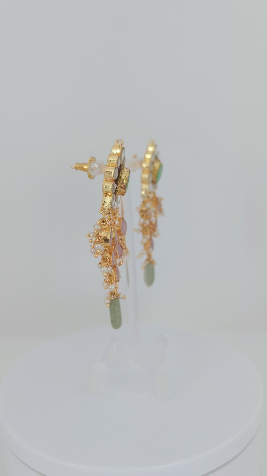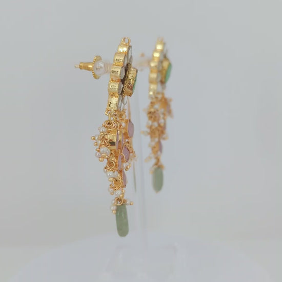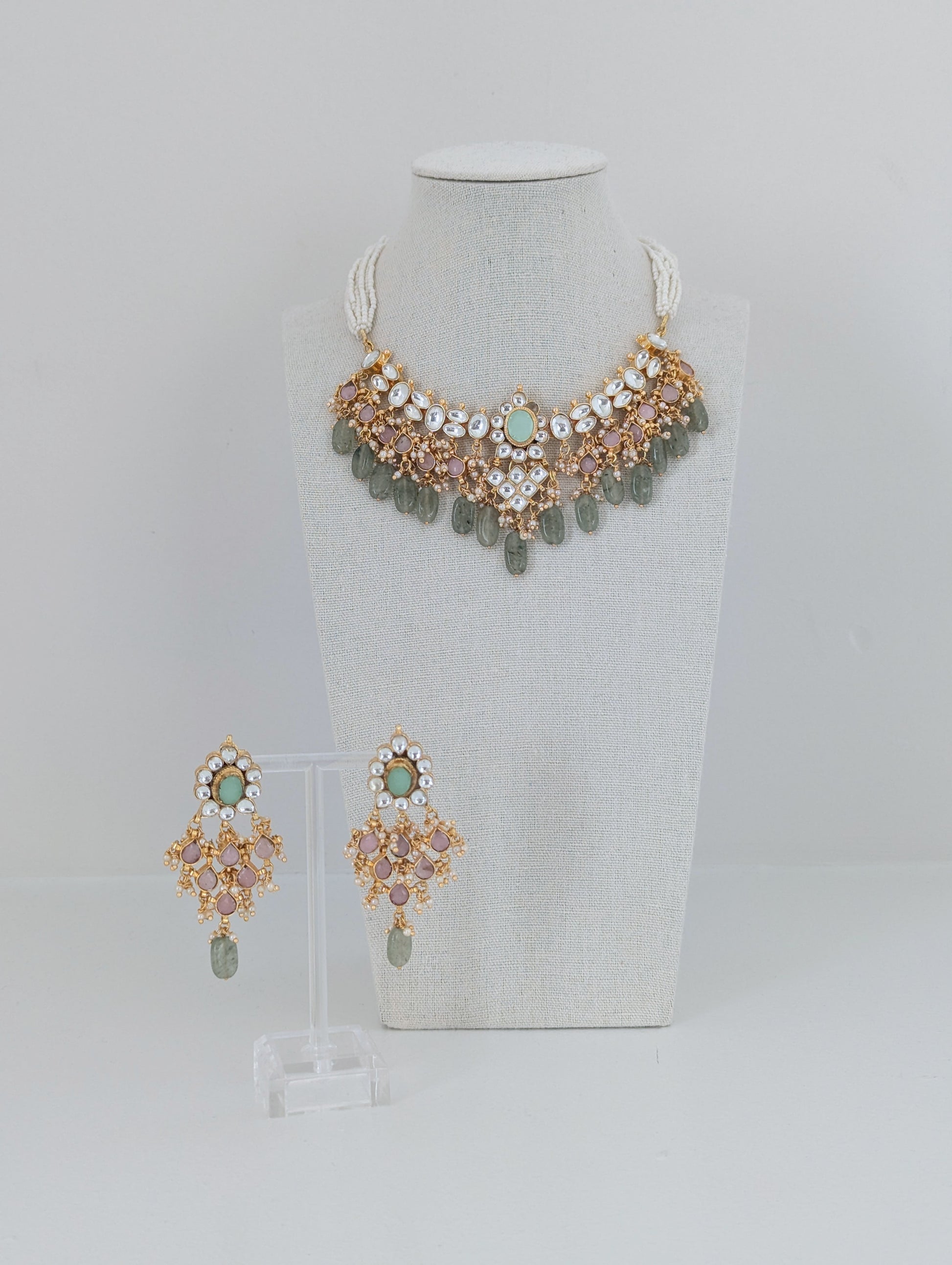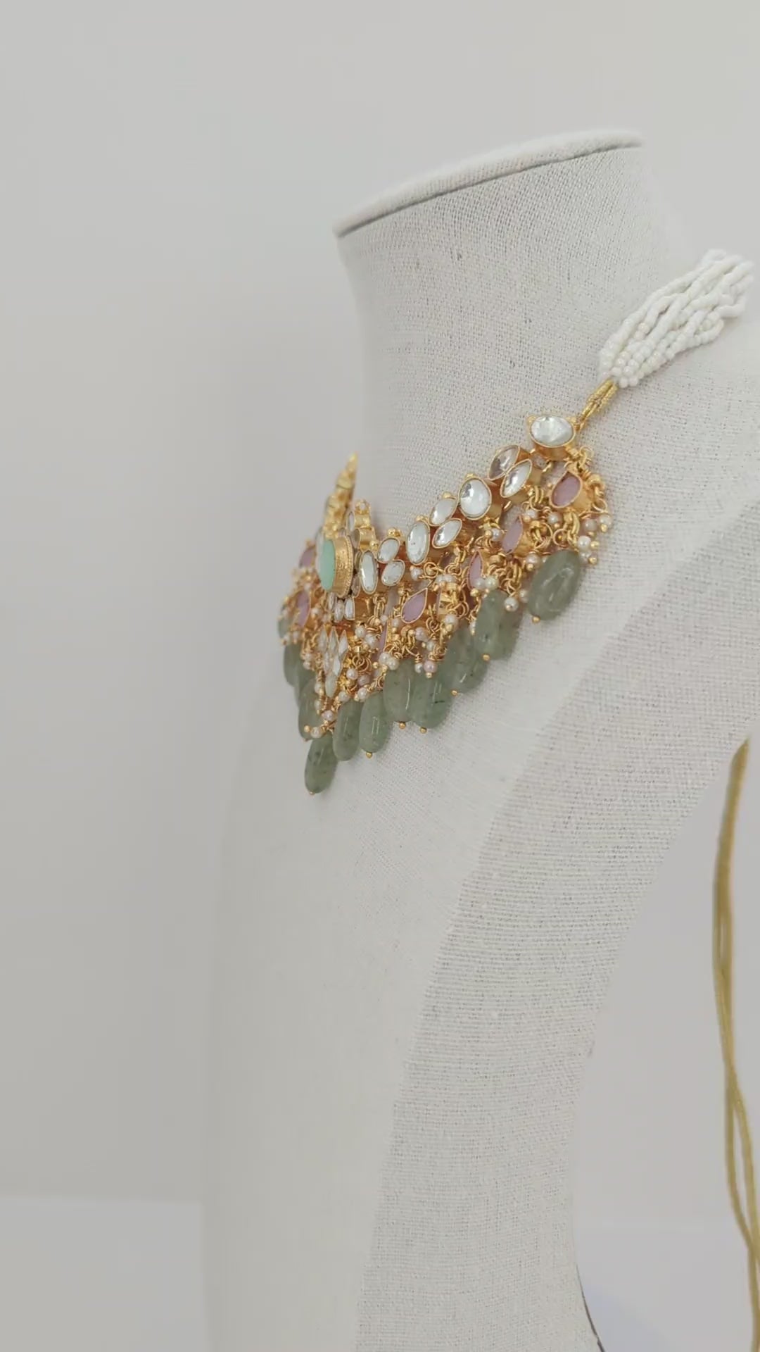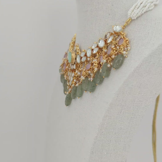 This jewelry set features a graceful choker-style necklace with matching earrings, blending soft pastel tones with traditional detailing. The design highlights mint-green accents surrounded by kundan-style mirrors and delicate pearl clusters. Dangling green beads add movement and richness, while the gold framework ties the look together with timeless elegance. Perfect for adding a refined yet regal touch to festive or formal occasions.
