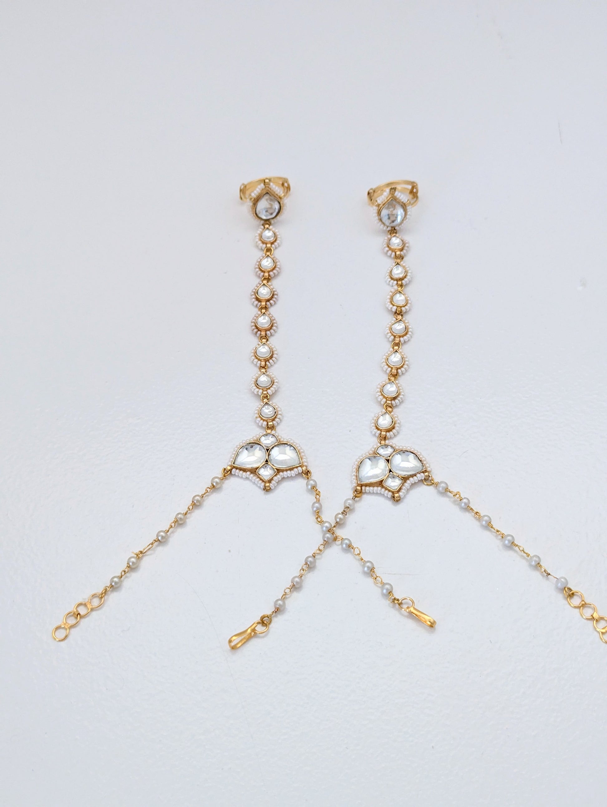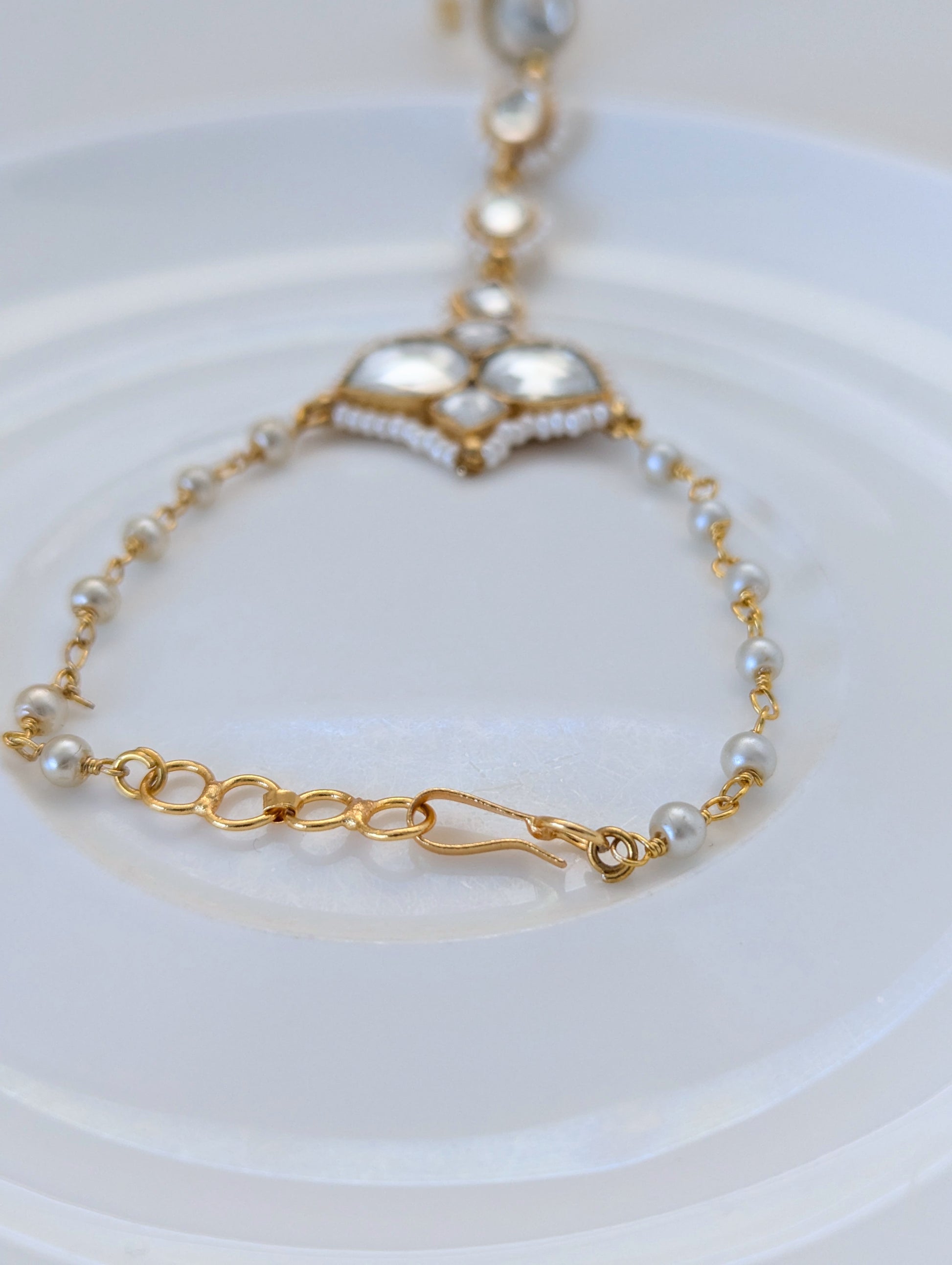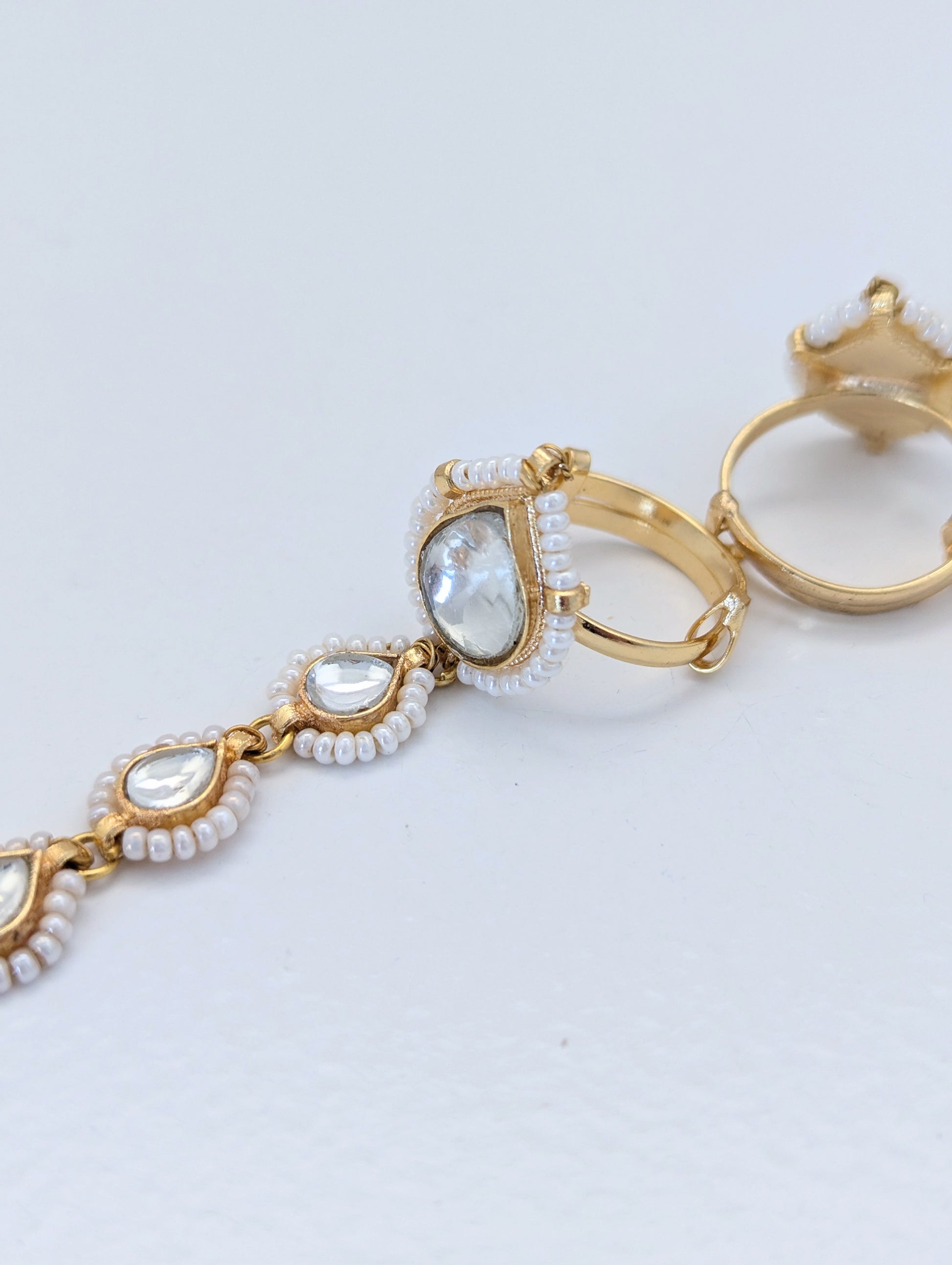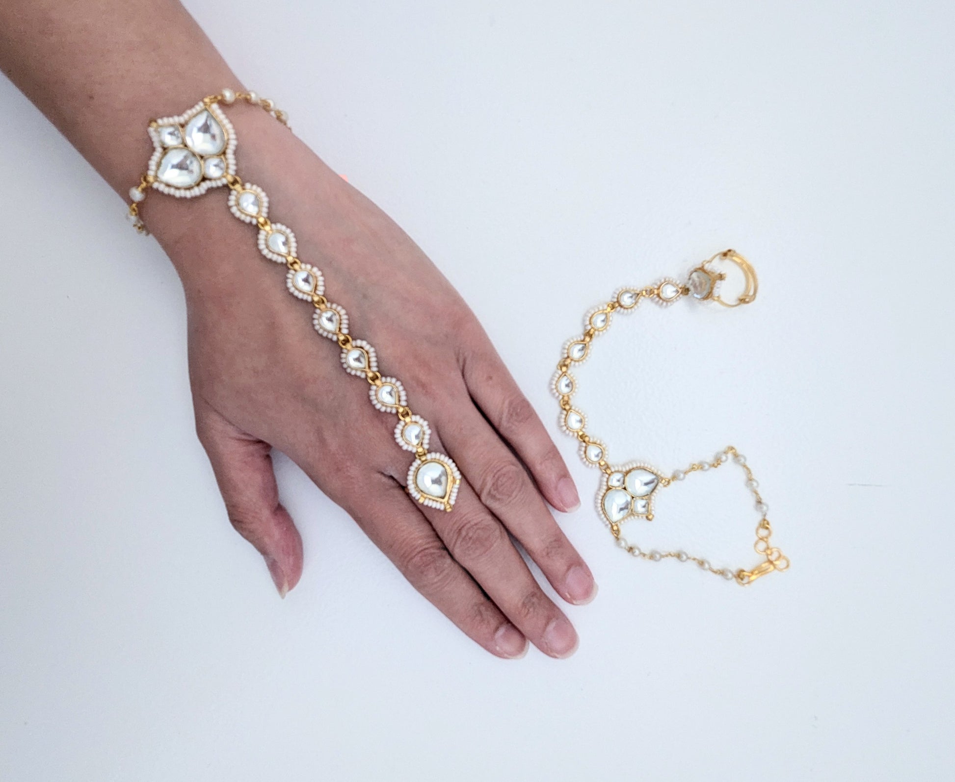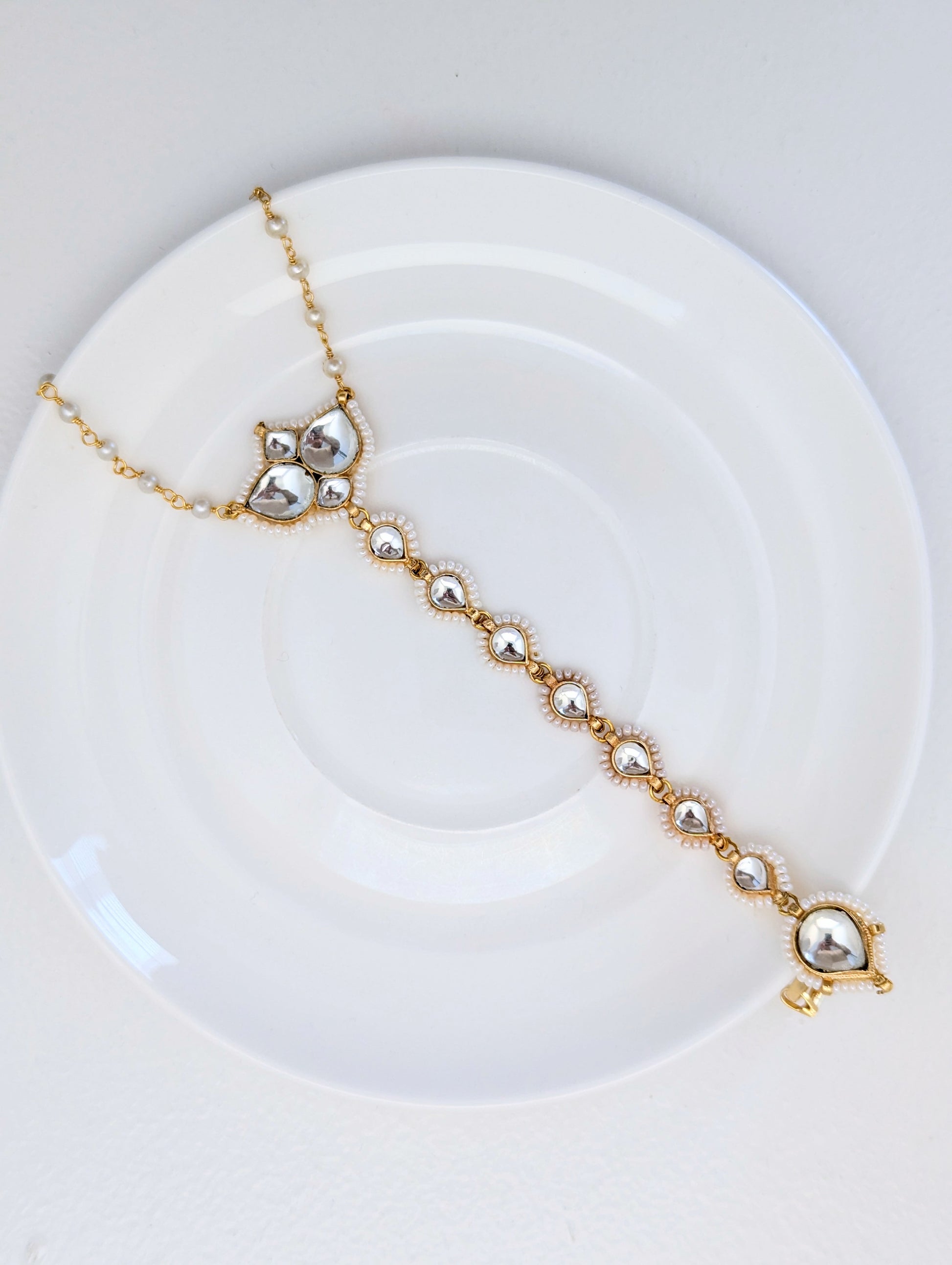 This elegant Pachi Kundan haathphool features a traditional design crafted in gold-tone metal, adorned with uncut mirror-like Kundan stones and delicate pearl detailing. The central hand chain connects to a statement ring with a floral motif, also bordered with fine pearls, creating a regal look. Finished with a pearl-beaded adjustable chain, this piece is perfect for bridal and festive wear, blending timeless craftsmanship with graceful charm.