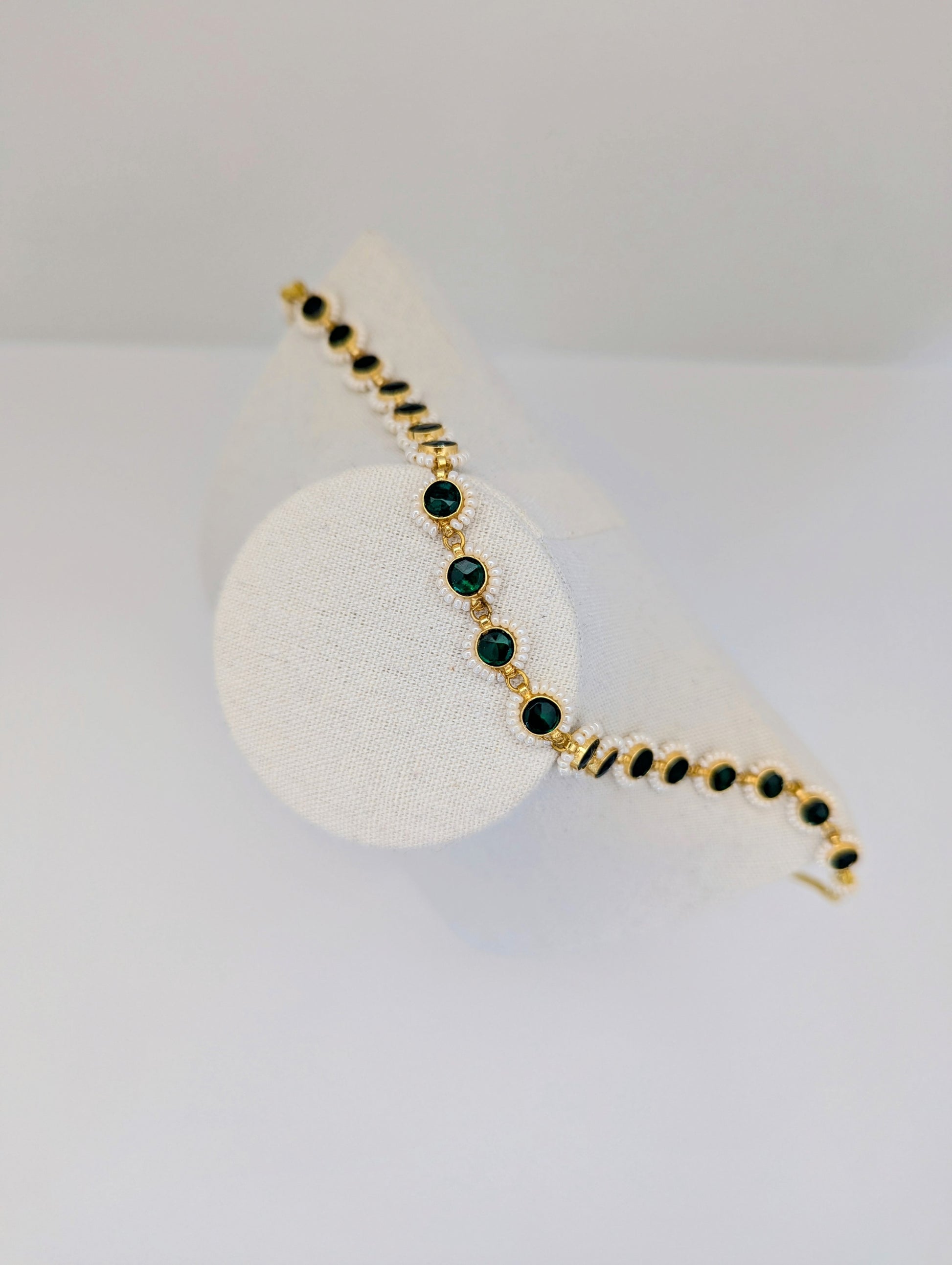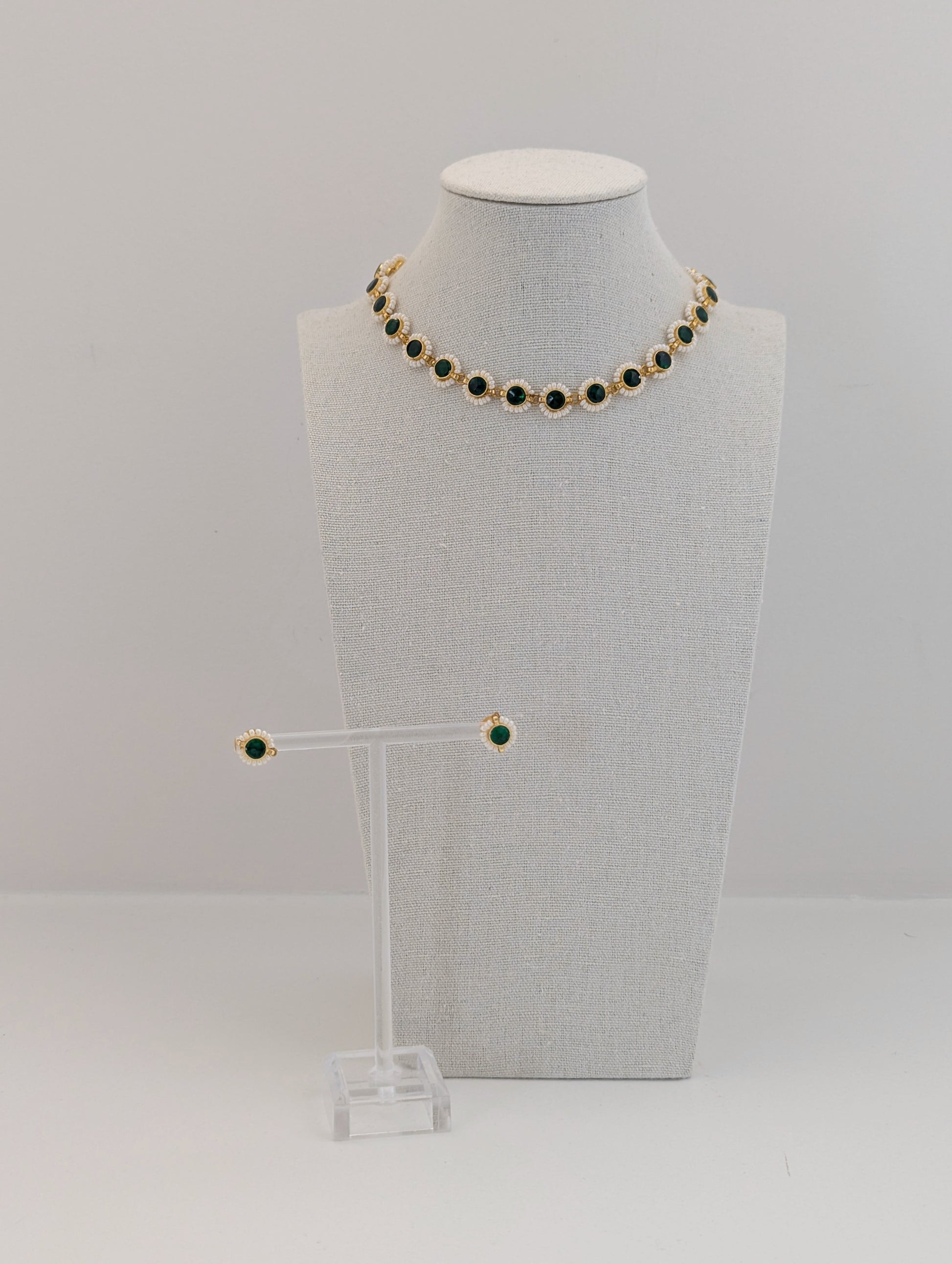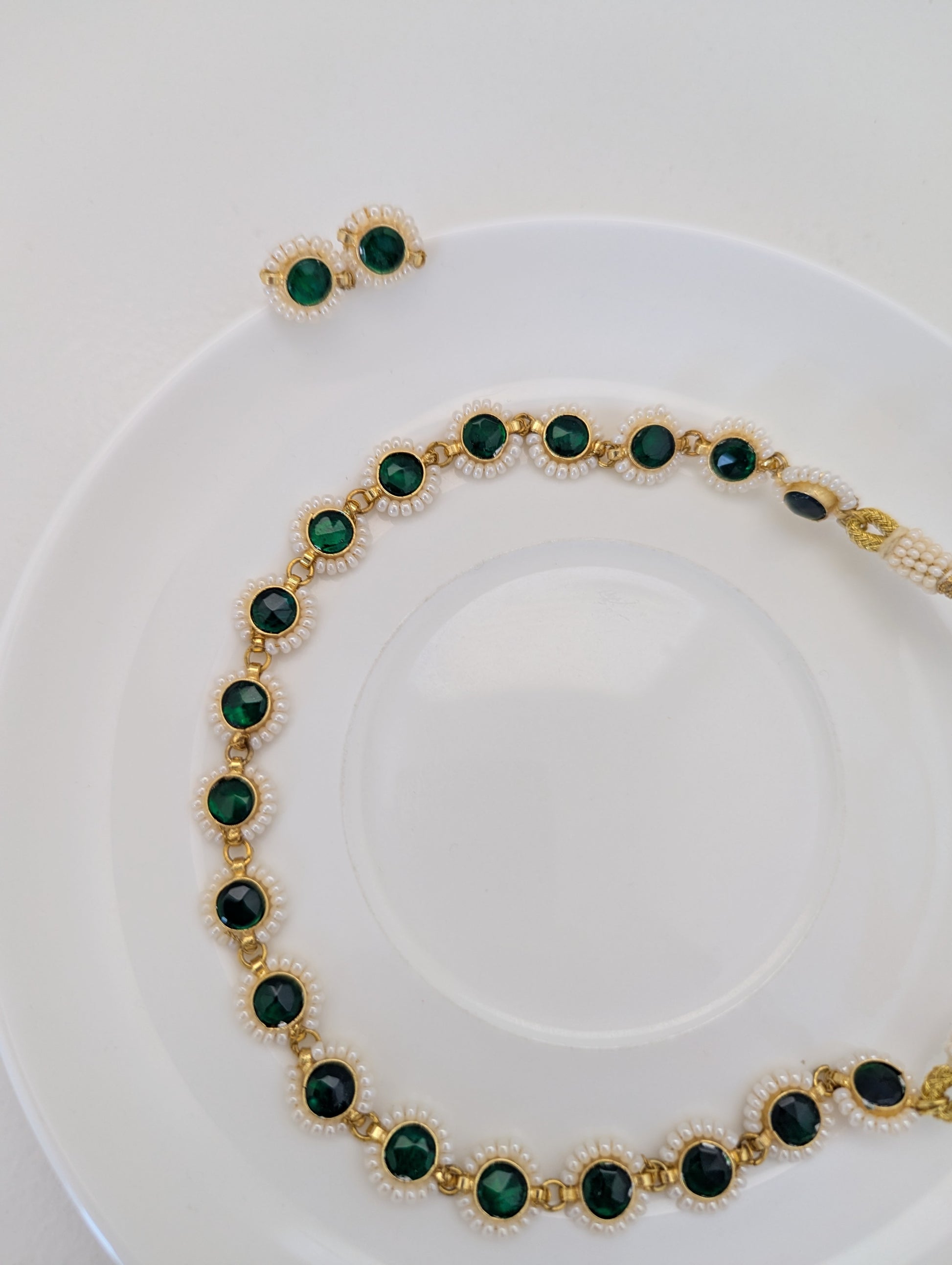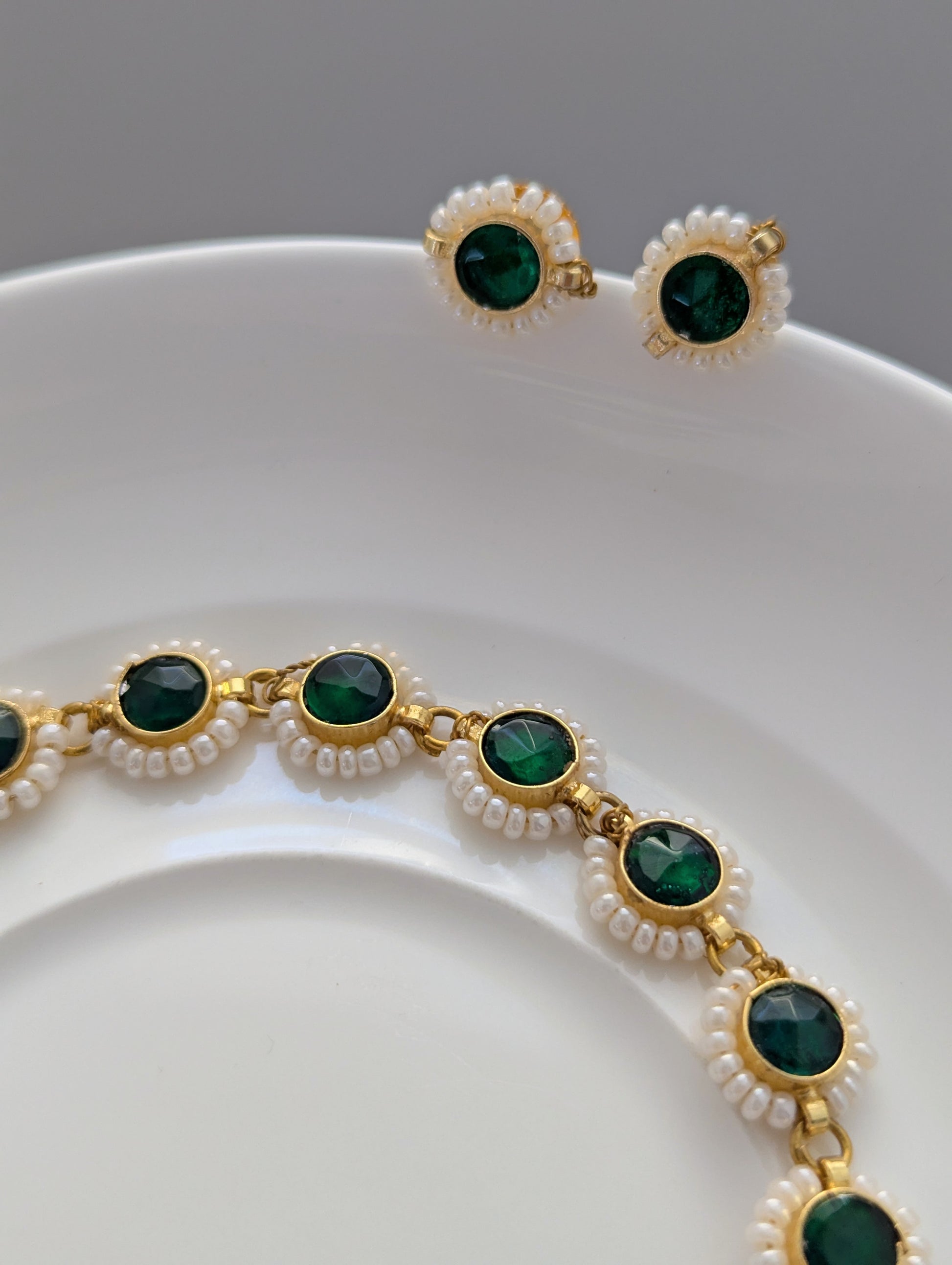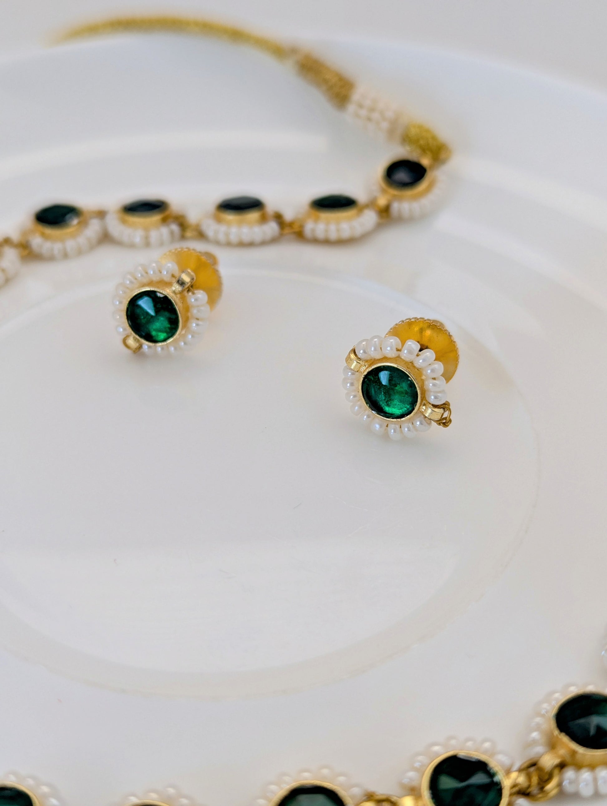 This elegant jewelry set features deep green stones framed in a radiant gold setting, delicately bordered with tiny white pearls for a refined touch. The necklace showcases a continuous design of round green stones linked together, while the matching stud earrings echo the same motif, creating a graceful and timeless look. Perfect for both traditional and modern occasions, this set exudes classic sophistication.