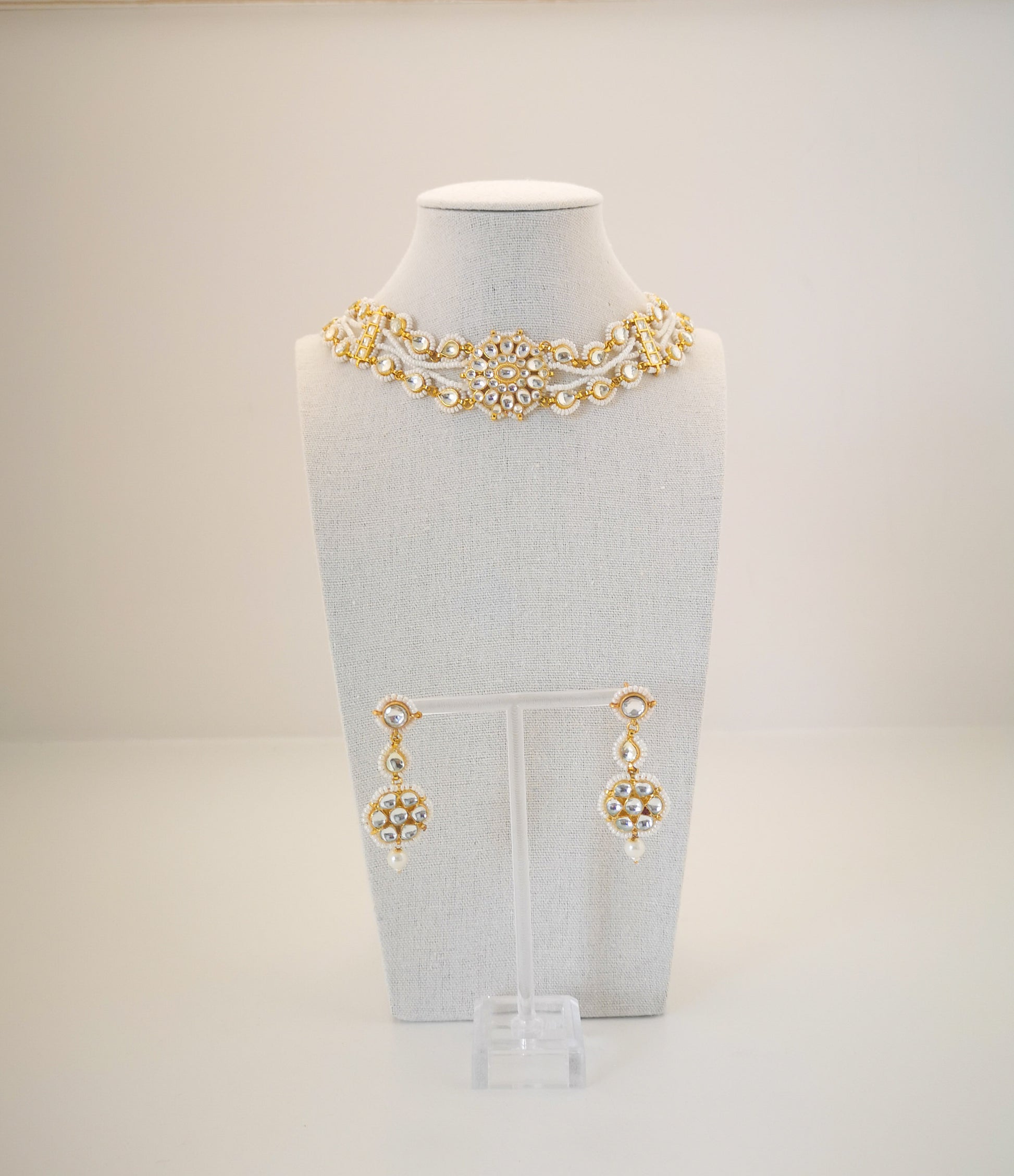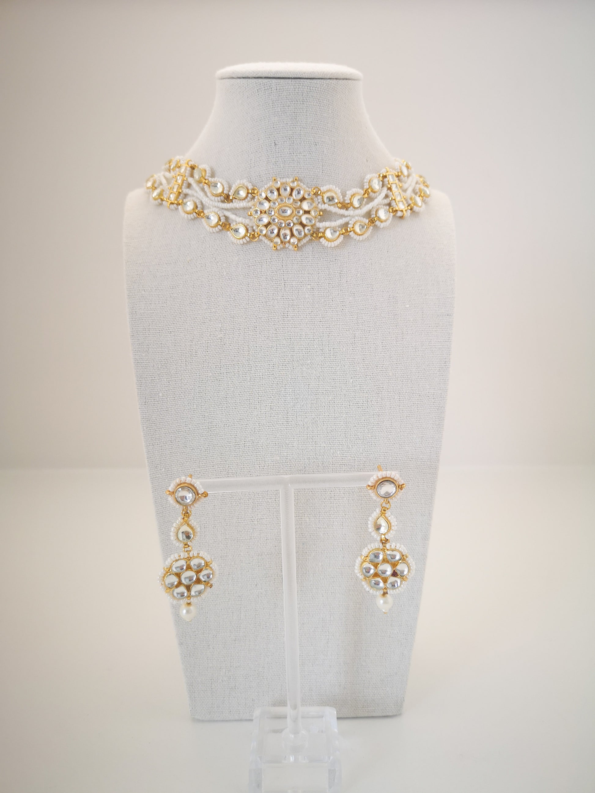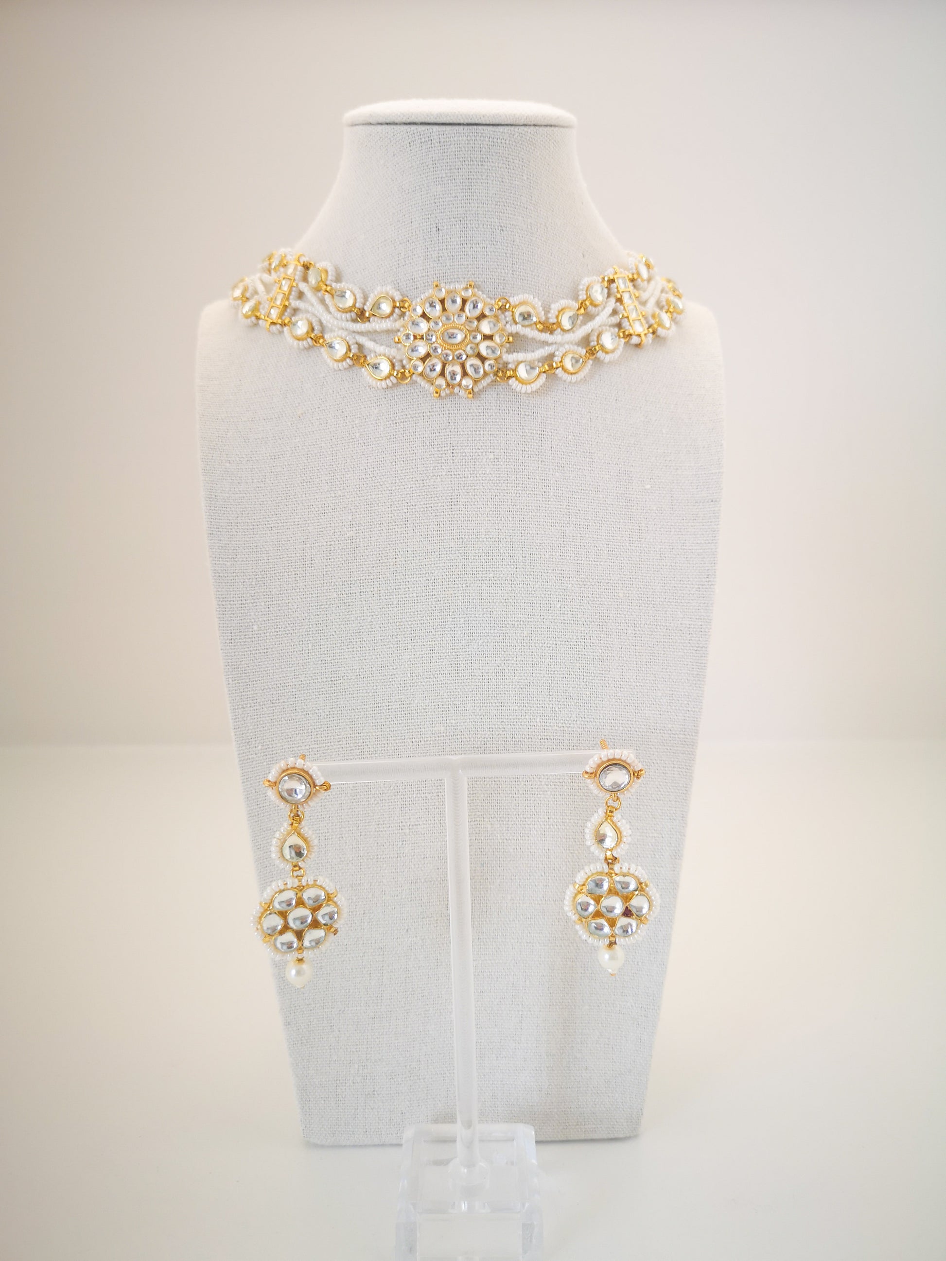 Pachi Kundan Set (earrings and necklace) - Pearls / Beige