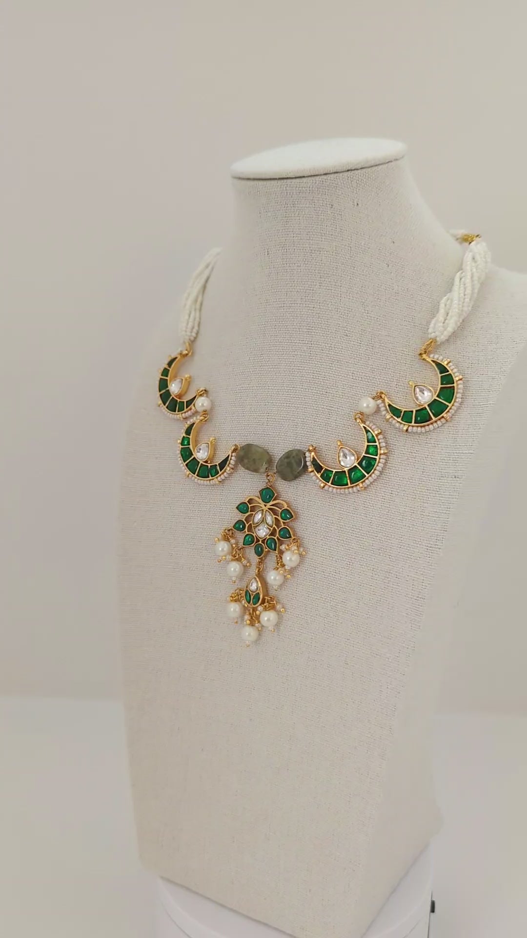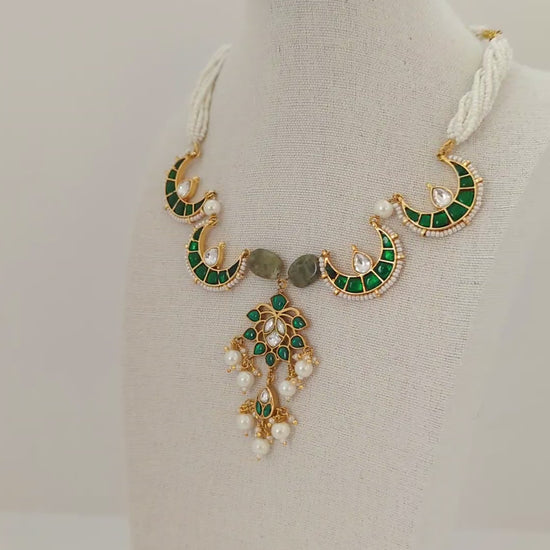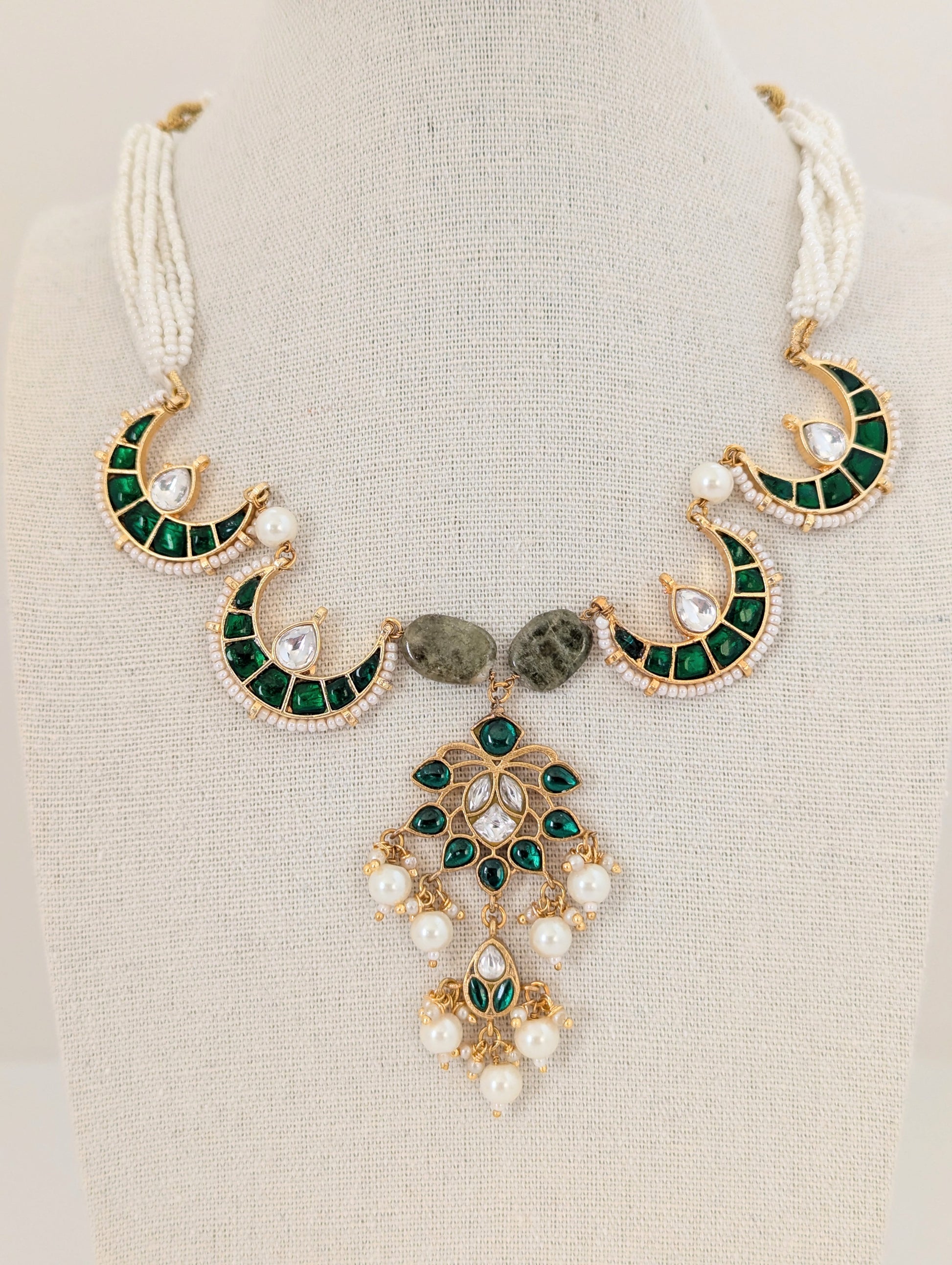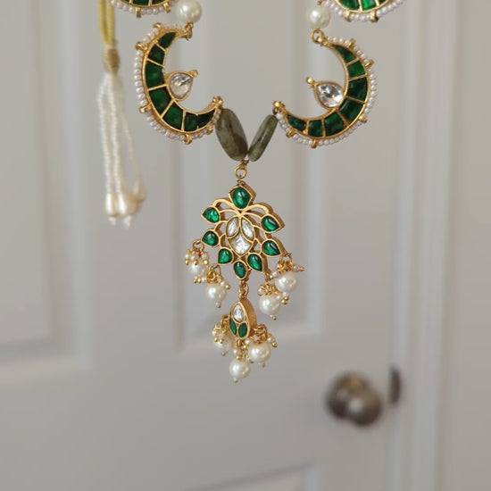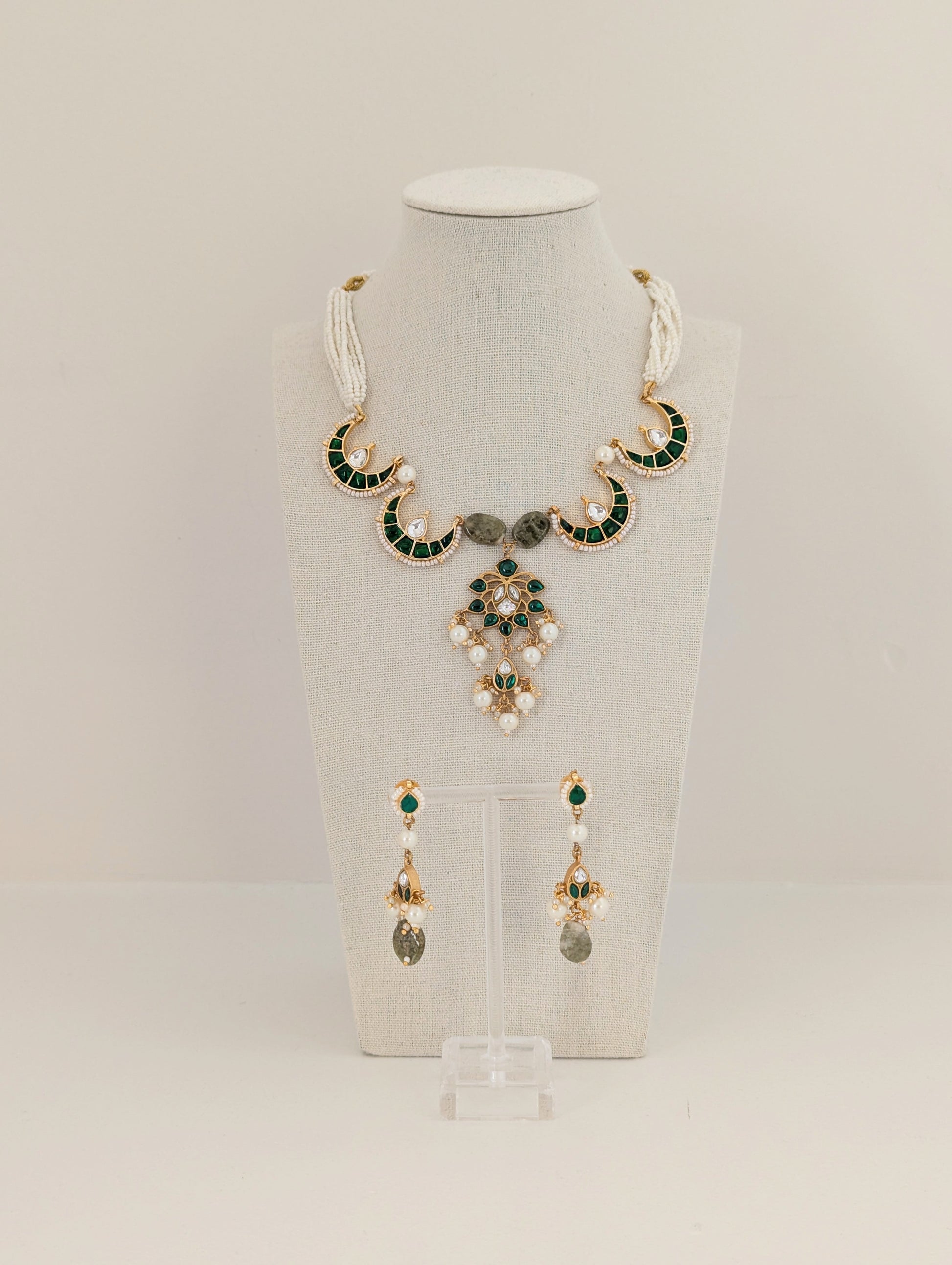 This jewelry set features a regal combination of green stones, pearls, and kundan-style detailing. The necklace is designed with crescent motifs embellished with deep green stones and white accents, finished with a striking pendant adorned with pearls and teardrop stones. It is strung on layered pearl strands, adding an elegant touch. The matching earrings mirror the pendant design with green stone accents, pearls, and natural stone drops, completing the set with a traditional yet timeless charm.