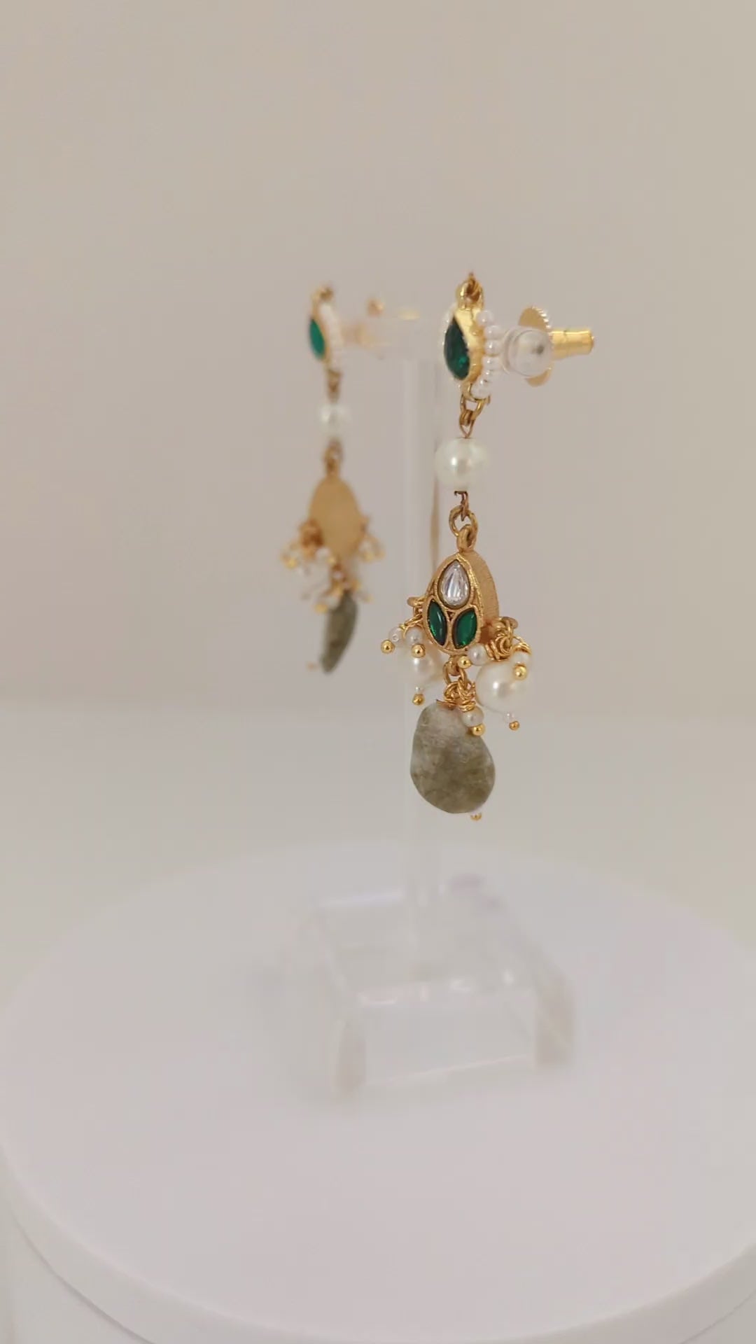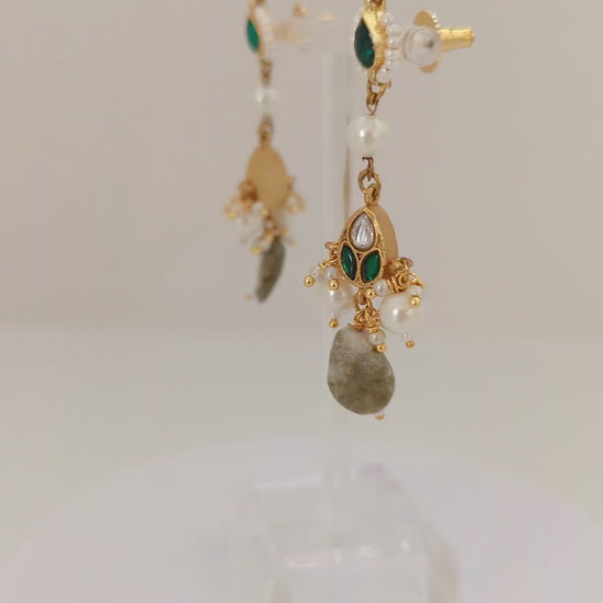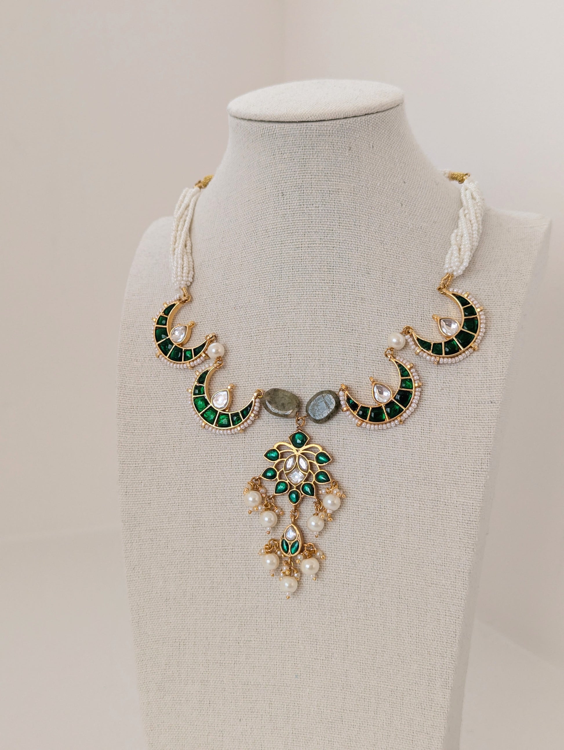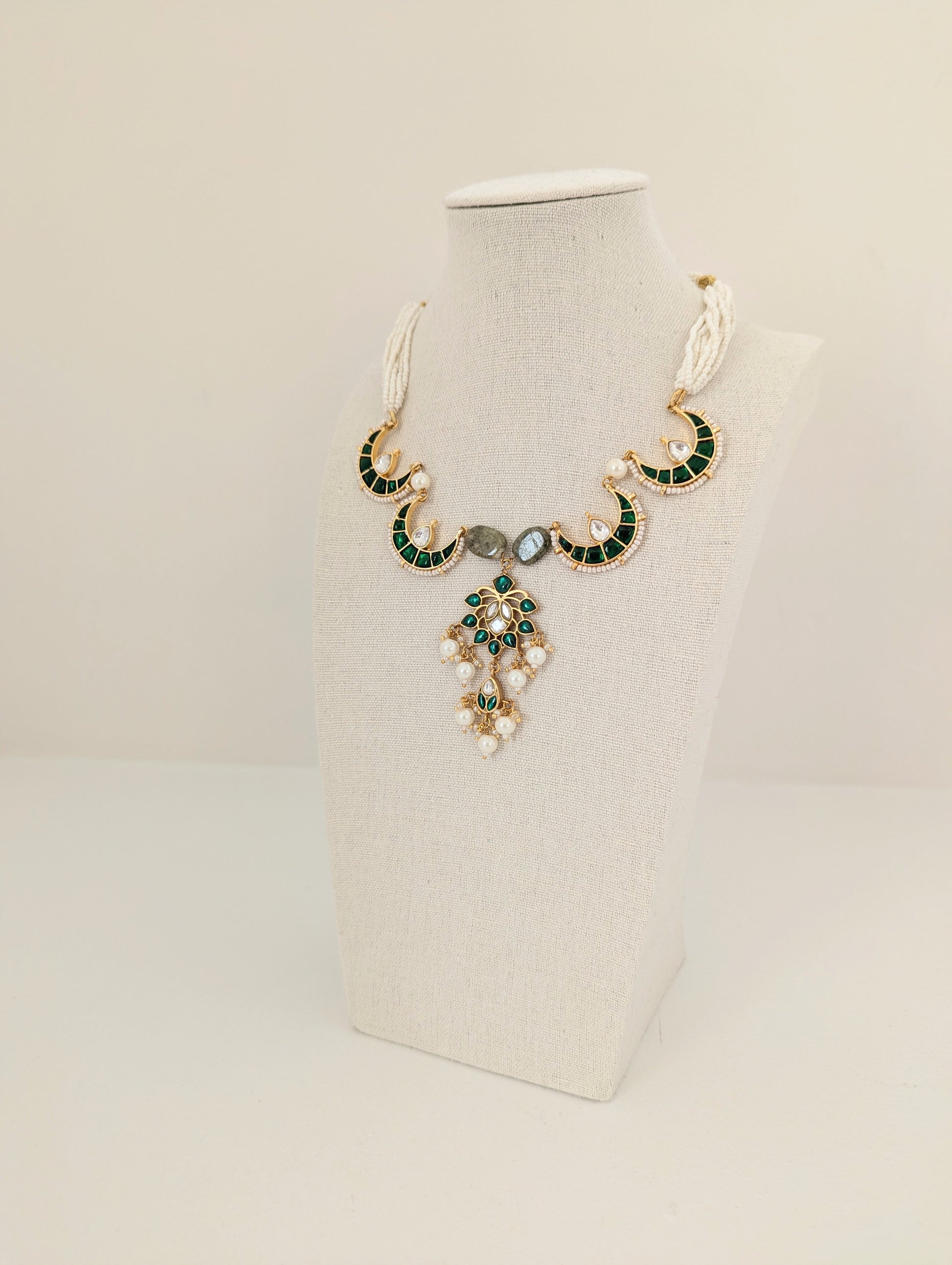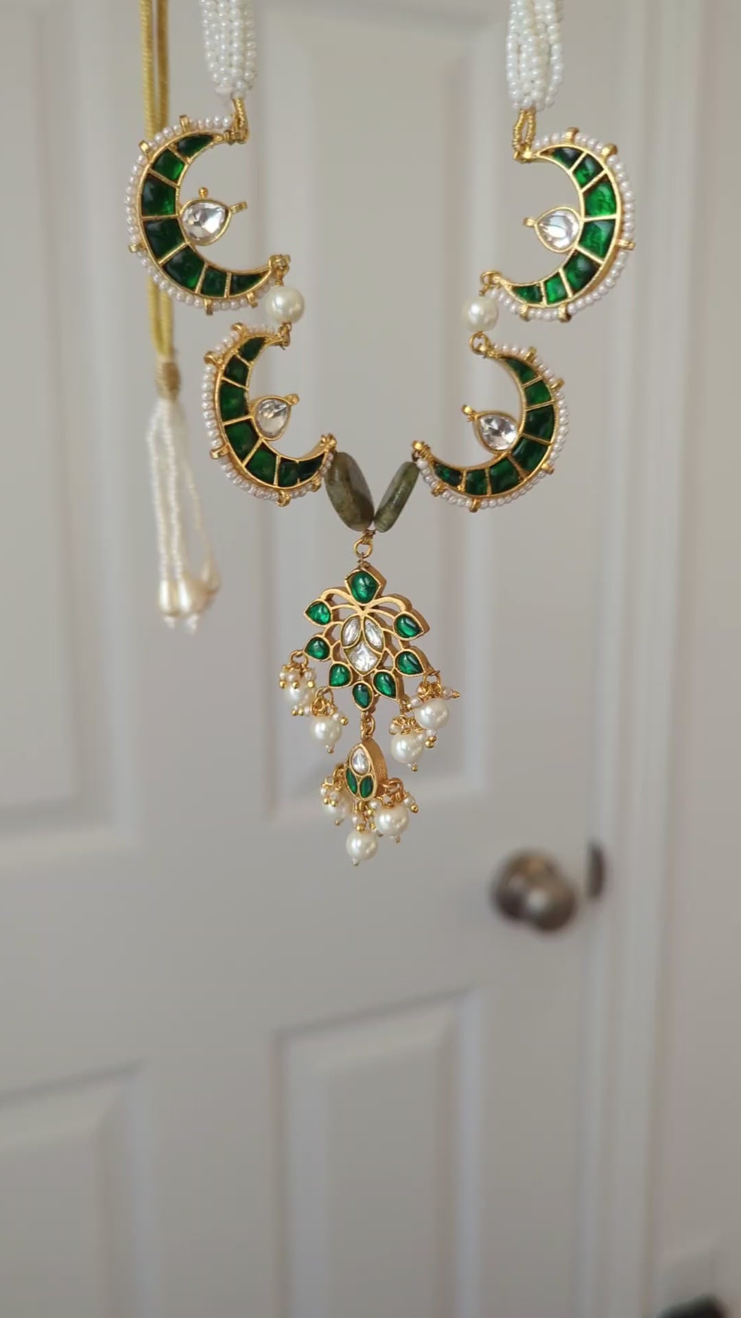This jewelry set features a regal combination of green stones, pearls, and kundan-style detailing. The necklace is designed with crescent motifs embellished with deep green stones and white accents, finished with a striking pendant adorned with pearls and teardrop stones. It is strung on layered pearl strands, adding an elegant touch. The matching earrings mirror the pendant design with green stone accents, pearls, and natural stone drops, completing the set with a traditional yet timeless charm.